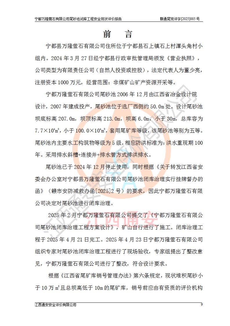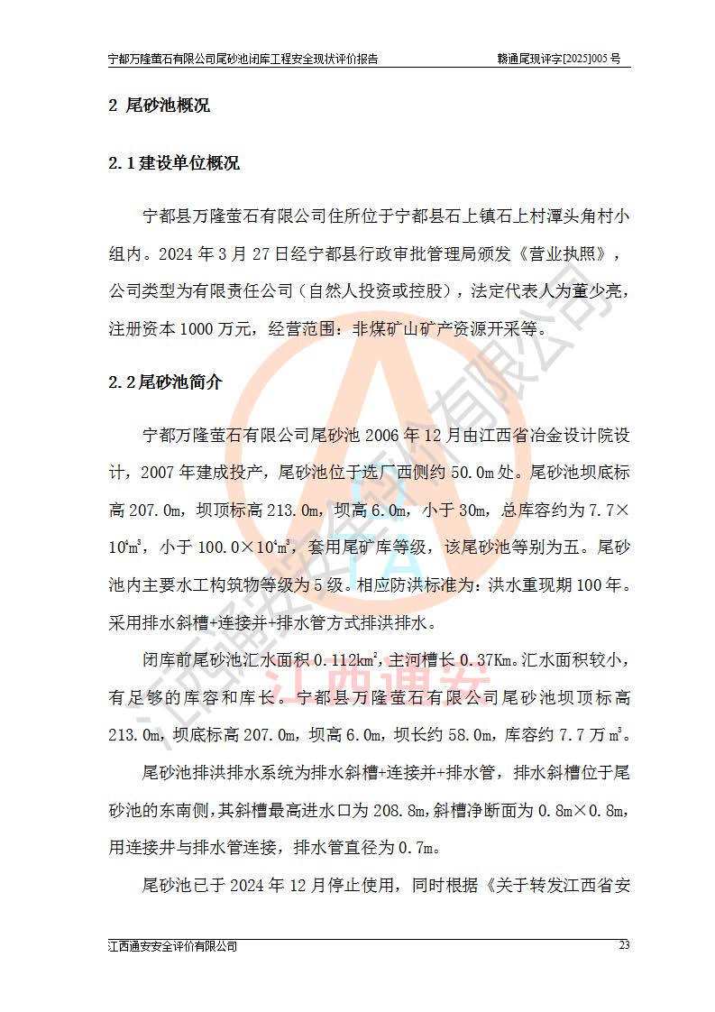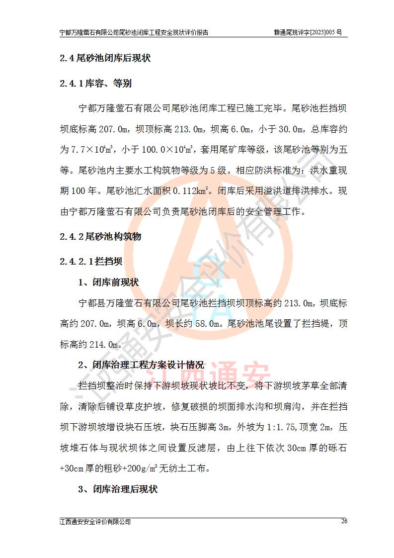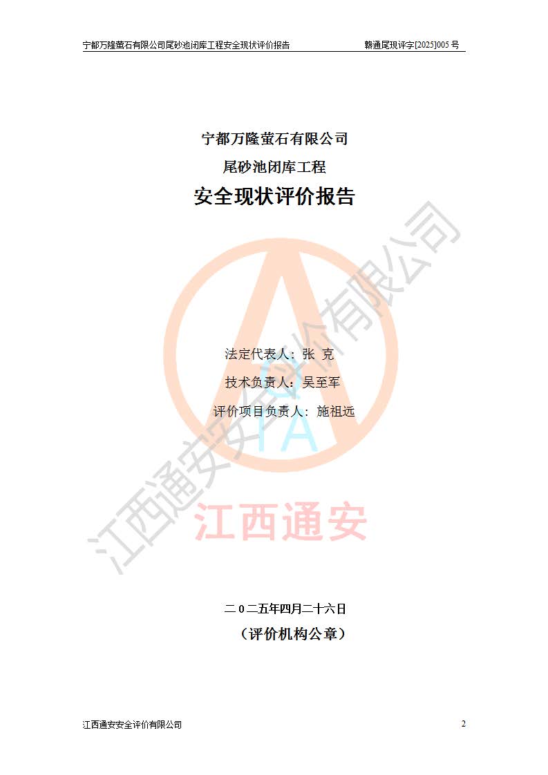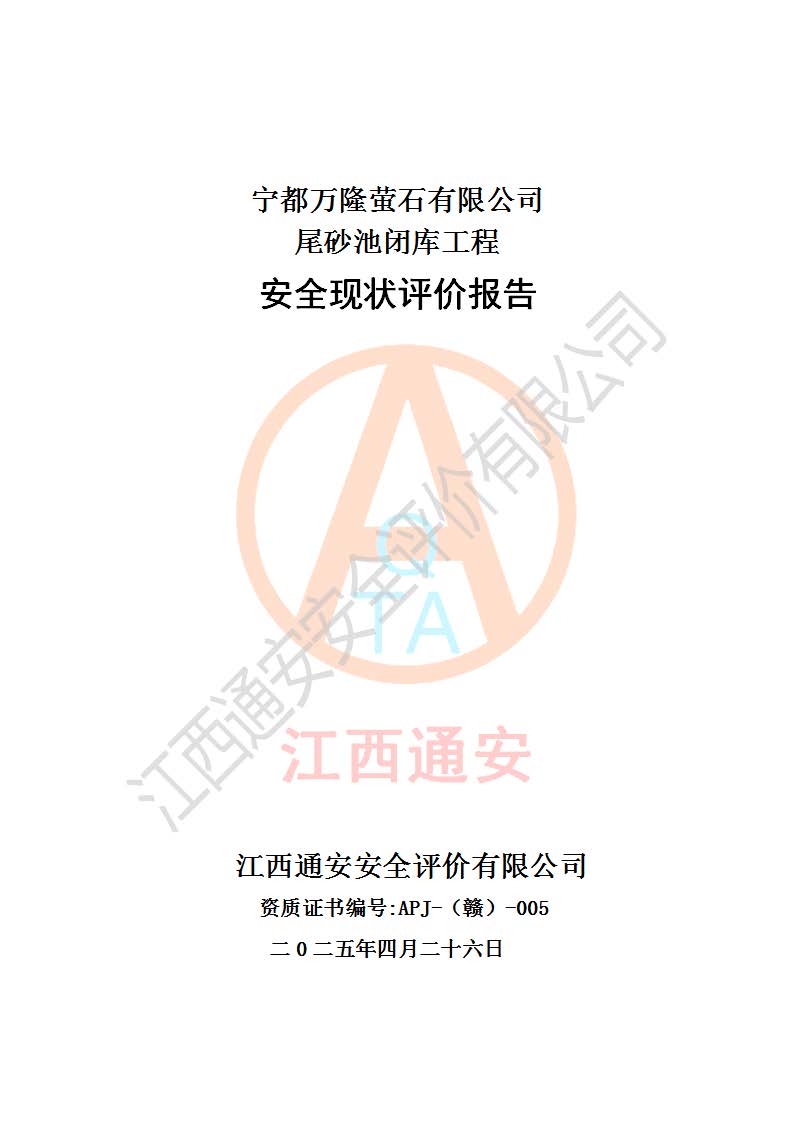 評(píng)價(jià)報(bào)告名稱 | 寧都萬(wàn)隆螢石有限公司尾砂池閉庫(kù)工程安全現(xiàn)狀評(píng)價(jià)報(bào)告 | |||