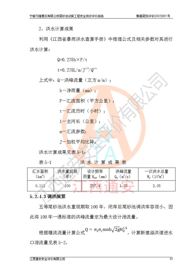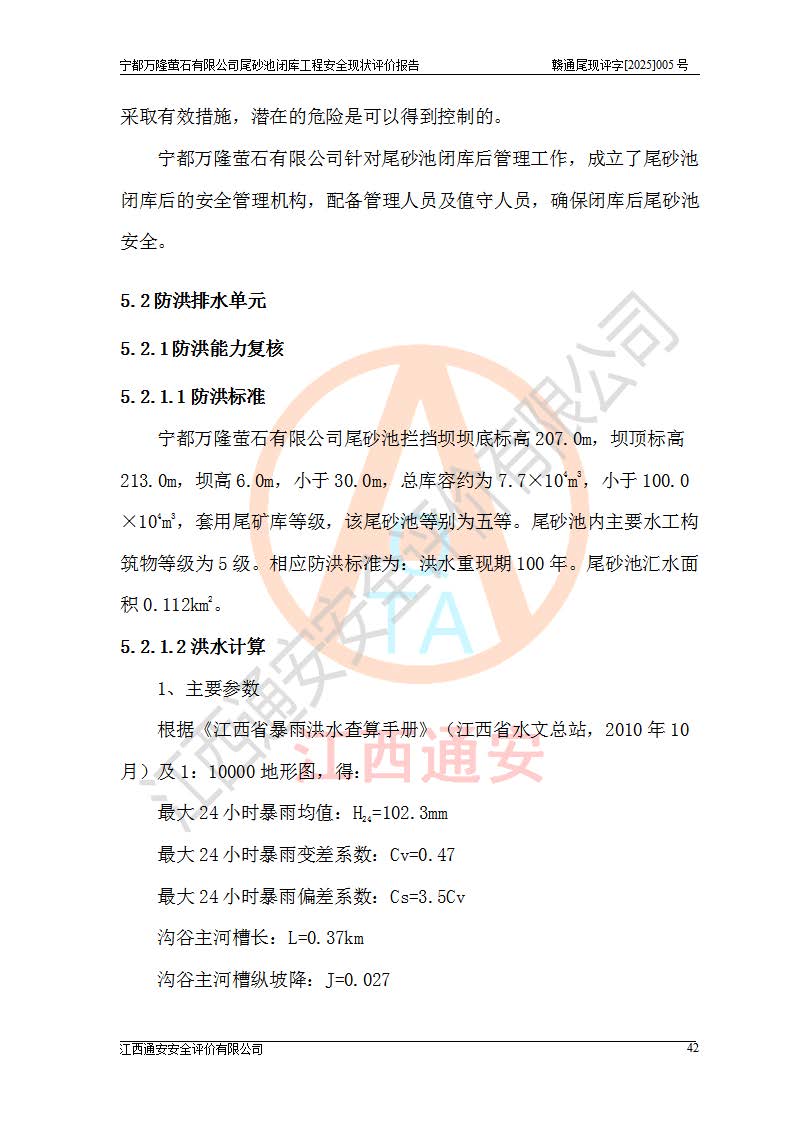 項(xiàng)目簡(jiǎn)介 | 寧都縣萬(wàn)隆螢石有限公司住所位于寧都縣石上鎮(zhèn)石上村潭頭角村小組內(nèi)。2024年3月27日經(jīng)寧都縣行政審批管理局頒發(fā)《營(yíng)業(yè)執(zhí)照》,公司類型為有限責(zé)任公司(自然人投資或控股),法定**人為董少亮,注冊(cè)資本1000萬(wàn)元,經(jīng)營(yíng)范圍:非煤礦山礦產(chǎn)資源開采等。 寧都萬(wàn)隆螢石有限公司尾砂池2006年12月由江西省冶金設(shè)計(jì)院設(shè)計(jì),2007年建成投產(chǎn),尾砂池位于選廠西側(cè)約50.0m處。設(shè)計(jì)尾砂池壩底標(biāo)高207.0m,壩頂標(biāo)高213.0m,壩高6.0m,小于30m,總庫(kù)容為7.7×104m3,小于100.0×104m3,套用尾礦庫(kù)等級(jí),該尾砂池等別為五等。尾砂池內(nèi)主要水工構(gòu)筑物等級(jí)為5級(jí)。相應(yīng)防洪標(biāo)準(zhǔn)為:洪水重現(xiàn)期100年。采用排水斜槽+連接并+排水管方式排洪排水。 尾砂池已于2024年12月停止使用,同時(shí)根據(jù)《關(guān)于轉(zhuǎn)發(fā)江西省安委會(huì)辦公室對(duì)寧都縣萬(wàn)隆螢石有限公司尾砂池閉庫(kù)治理實(shí)行掛牌督辦的函》(贛市安防減救辦函[2025]2號(hào))的要求,寧都萬(wàn)隆螢石有限公司決定對(duì)尾砂池進(jìn)行閉庫(kù)治理。 2025年2月寧都萬(wàn)隆螢石有限公司提交了《寧都萬(wàn)隆螢石有限公司尾砂池閉庫(kù)治理工程方案設(shè)計(jì)》,礦山自行進(jìn)行了施工。閉庫(kù)治理工程于2025年4月21日完工。2025年4月23日寧都萬(wàn)隆螢石有限公司組織專家對(duì)尾砂池閉庫(kù)治理工程進(jìn)行了現(xiàn)場(chǎng)驗(yàn)收,專家組提出了整改意見,寧都萬(wàn)隆螢石有限公司進(jìn)行了整改,符合設(shè)計(jì)要求。 根據(jù)《江西省尾礦庫(kù)銷號(hào)管理辦法》第六條規(guī)定,現(xiàn)狀堆積尾砂小于10萬(wàn)m3且總壩高低于10m的尾礦庫(kù),銷號(hào)前應(yīng)由有資質(zhì)的評(píng)價(jià)機(jī)構(gòu)進(jìn)行安全現(xiàn)狀評(píng)價(jià)。2025年4月,寧都萬(wàn)隆螢石有限公司委托我公司承擔(dān)了寧都萬(wàn)隆螢石有限公司尾砂池閉庫(kù)治理后的安全現(xiàn)狀評(píng)價(jià)工作。 | |||