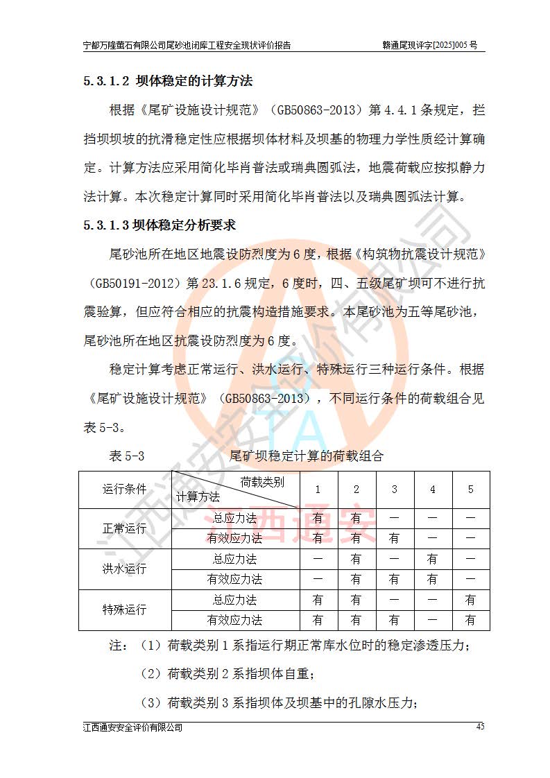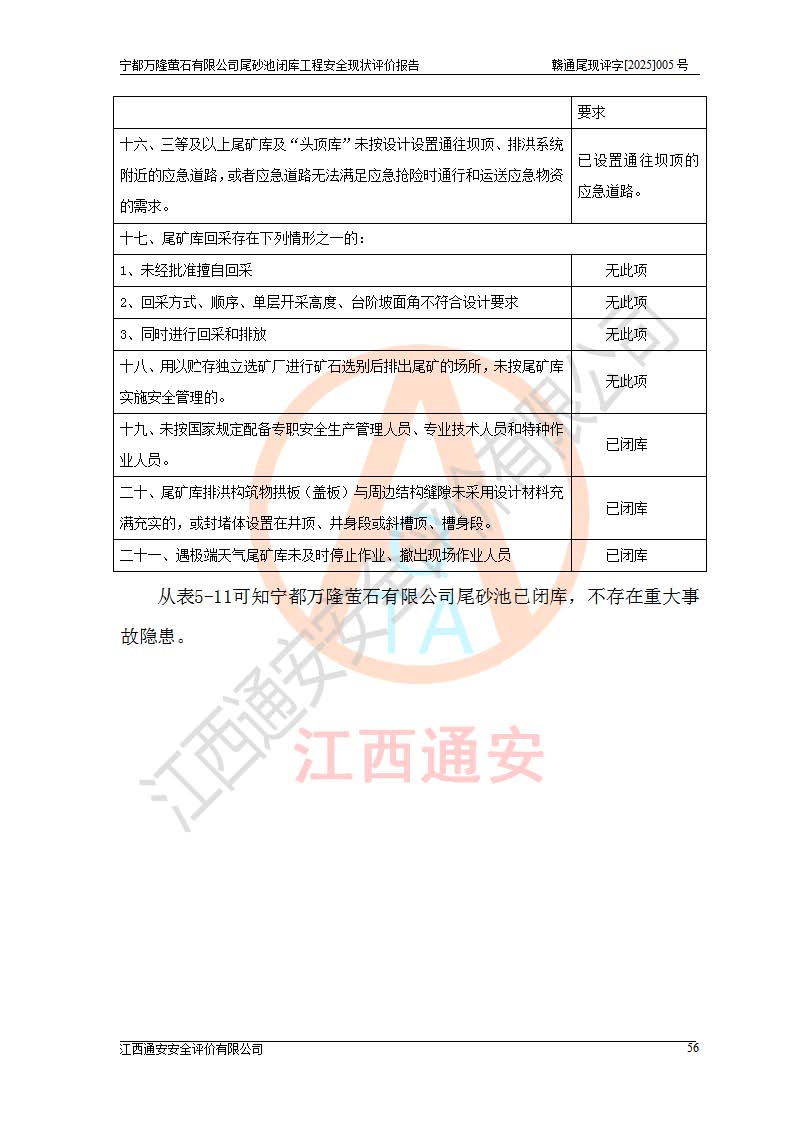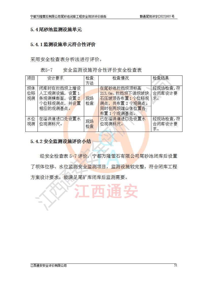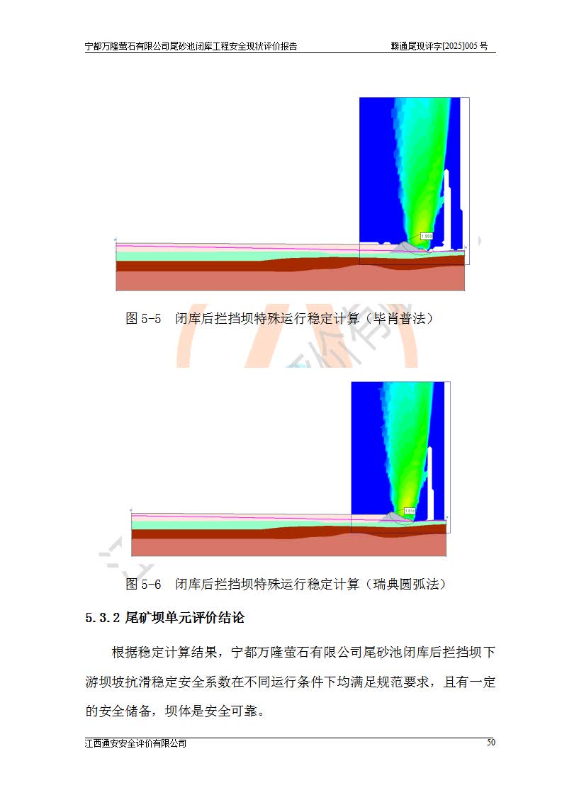 評(píng)價(jià)結(jié)論 | 寧都萬(wàn)隆螢石有限公司尾砂池按《寧都萬(wàn)隆螢石有限公司尾砂池閉庫(kù)治理工程方案設(shè)計(jì)》進(jìn)行建設(shè),閉庫(kù)后尾砂池壩體穩(wěn)定,排洪能力滿足要求,閉庫(kù)后尾砂池對(duì)周邊環(huán)境不存在安全影響,尾砂池閉庫(kù)后符合安全條件。 | |||