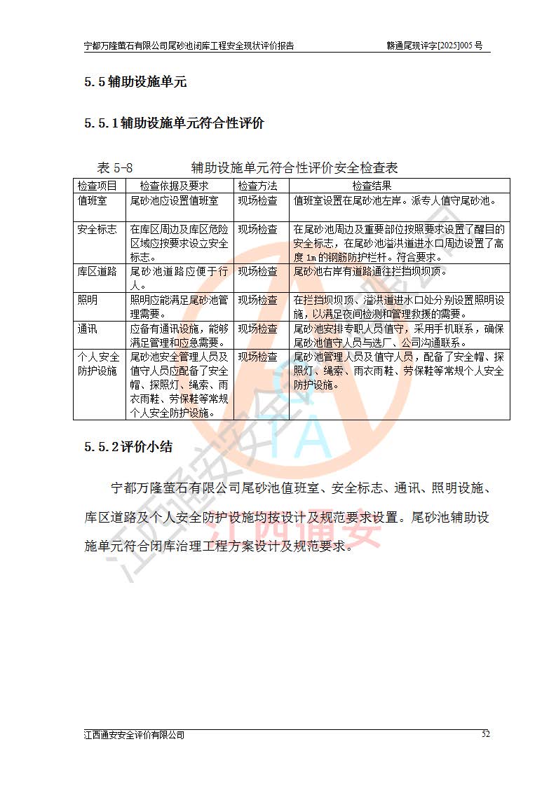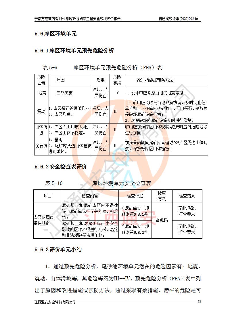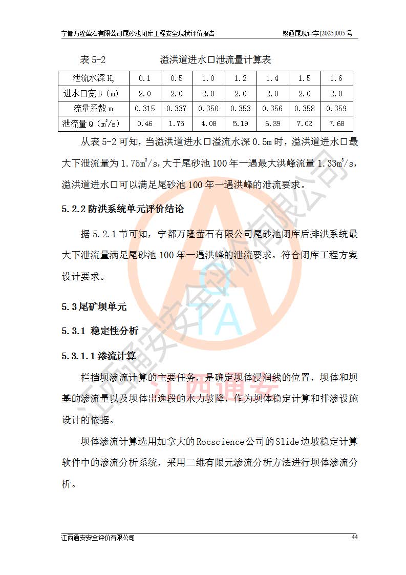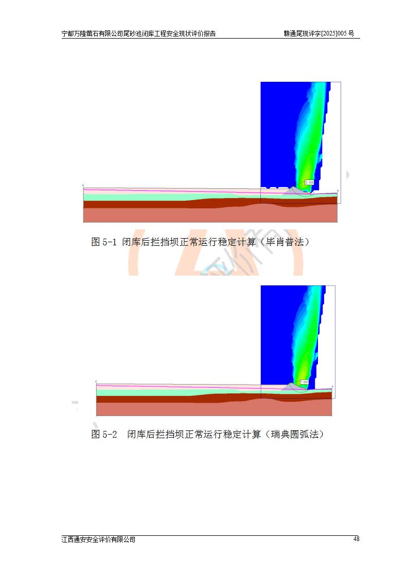 評(píng)價(jià)結(jié)論 | 寧都萬(wàn)隆螢石有限公司尾砂池按《寧都萬(wàn)隆螢石有限公司尾砂池閉庫(kù)治理工程方案設(shè)計(jì)》進(jìn)行建設(shè),閉庫(kù)后尾砂池壩體穩(wěn)定,排洪能力滿足要求,閉庫(kù)后尾砂池對(duì)周邊環(huán)境不存在安全影響,尾砂池閉庫(kù)后符合安全條件。 | |||