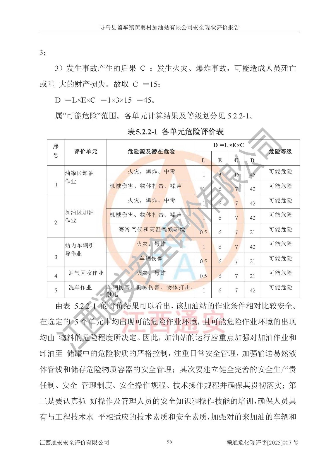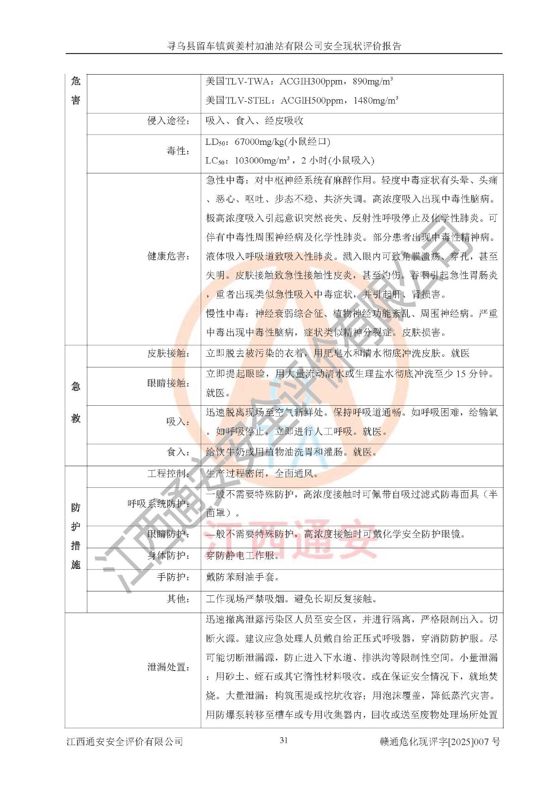 其它 | 1、尋烏縣留車鎮(zhèn)黃姜村加油站有限公司加油站所涉及危險化學品為汽油、柴油,汽油屬于首批重點監(jiān)管的危險化學品和特別管控危險化學品,汽油、柴油的數量不構成危險化學品重大危險源。 2、通過本報告分析,該加油站經營中面臨多種危險因素,如火災、爆炸,電氣傷害、**傷害、噪聲等危險有害因素。而加油站*主要的危險、有害因素是火災、爆炸,對此加油站全體員工**保持**的安全防護意識。 3、加油站公用工程能夠滿足安全經營的基本需要。 4、采用檢查表評價法對加油站的選址、總平面布置及站內設施之間的安全距離、經營設施與設備、工藝方法、物料及產品安全性、電氣儀表和公用工程、建筑與消防、罐區(qū)防靜電、作業(yè)場所、安全管理制度和安全管理機構、重大生產安全事故隱患進行安全評價,整改后能夠符合安全要求。 5、加油站取得了防雷防靜電技術檢測報告,符合安全規(guī)范要求。 6、項目的外部防火距離、平面布置、消防安全設施和措施,能夠滿足**法律、法規(guī)、標準、規(guī)范的要求。其油罐、加油機為正規(guī)專業(yè)單位制造,并經檢測檢驗合格,采用帶有油氣回收的密閉卸油、加油系統(tǒng);設施電氣防爆防護、機械設備的安全保護等方面的安全設施建立**。 7、該項目的作業(yè)條件相對較安全,在選定的5個單元中均出現可能危險作業(yè)環(huán)境,且可能危險作業(yè)環(huán)境的出現均由物料和特殊條件的危險程度所決定。 8、危險度評價汽油儲罐危險等級為II級,屬于中度危險;柴油儲罐危險等級為IIII級,屬于低度危險。油儲罐區(qū)危險度應取較大值,故油儲罐區(qū)危險等級應為II級,屬于中度危險。 9、加油站成立了安全**小組,制定了相應的管理制度,操作規(guī)程和事故應急預案,加油站的安全管理機構工作有力,加油站安全經營管理處于正常有序開展范圍。 10、加油站對現場存在的問題點進行了整改。 尋烏縣留車鎮(zhèn)黃姜村加油站有限公司的安全設施和措施在正常經營過程中能夠滿足安全經營的條件,消防、防雷設施到位且在**期內,對現場存在的問題點進行了整改,安全管理能夠滿足正常安全經營的需要,符合危險化學品經營安全要求。