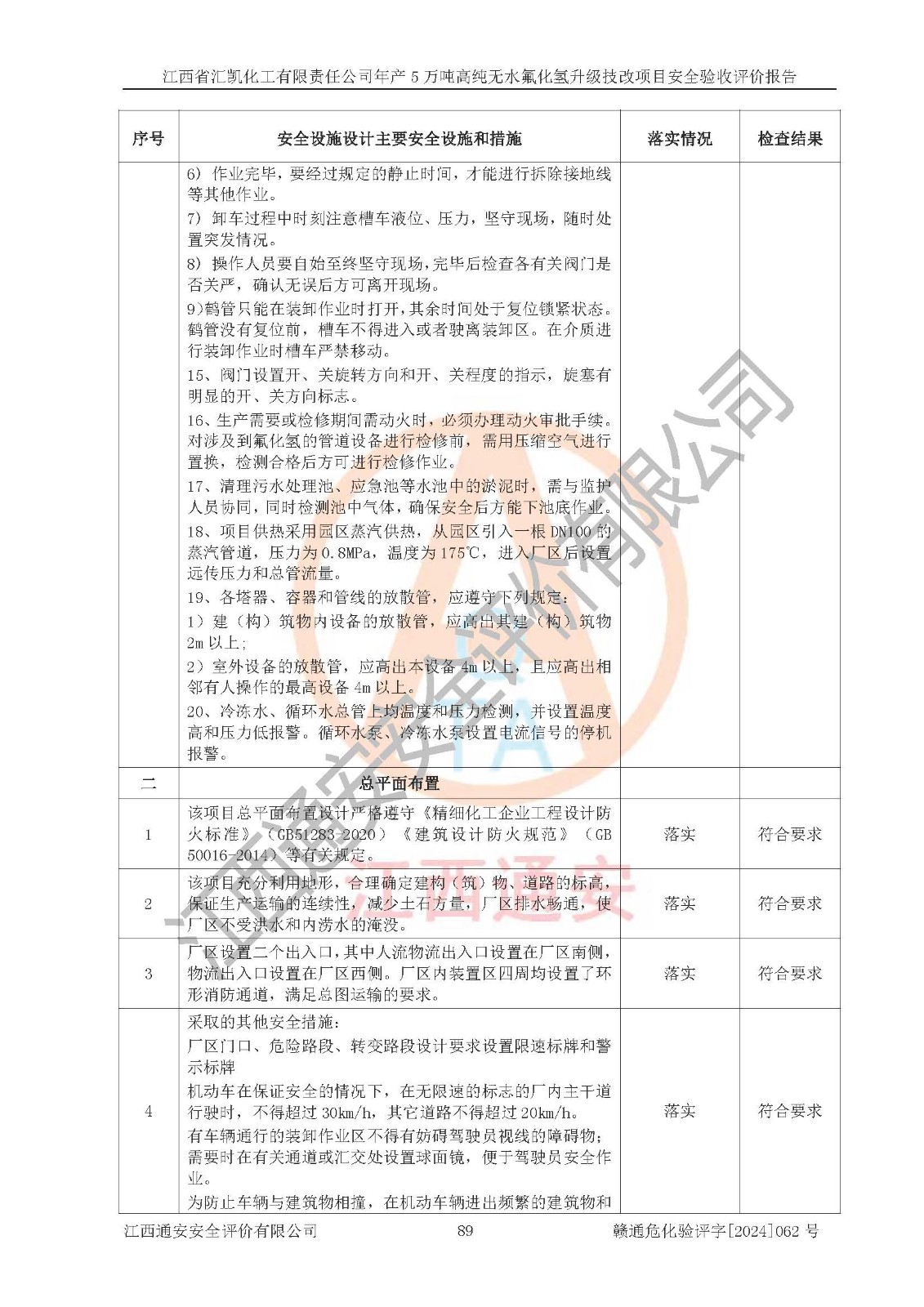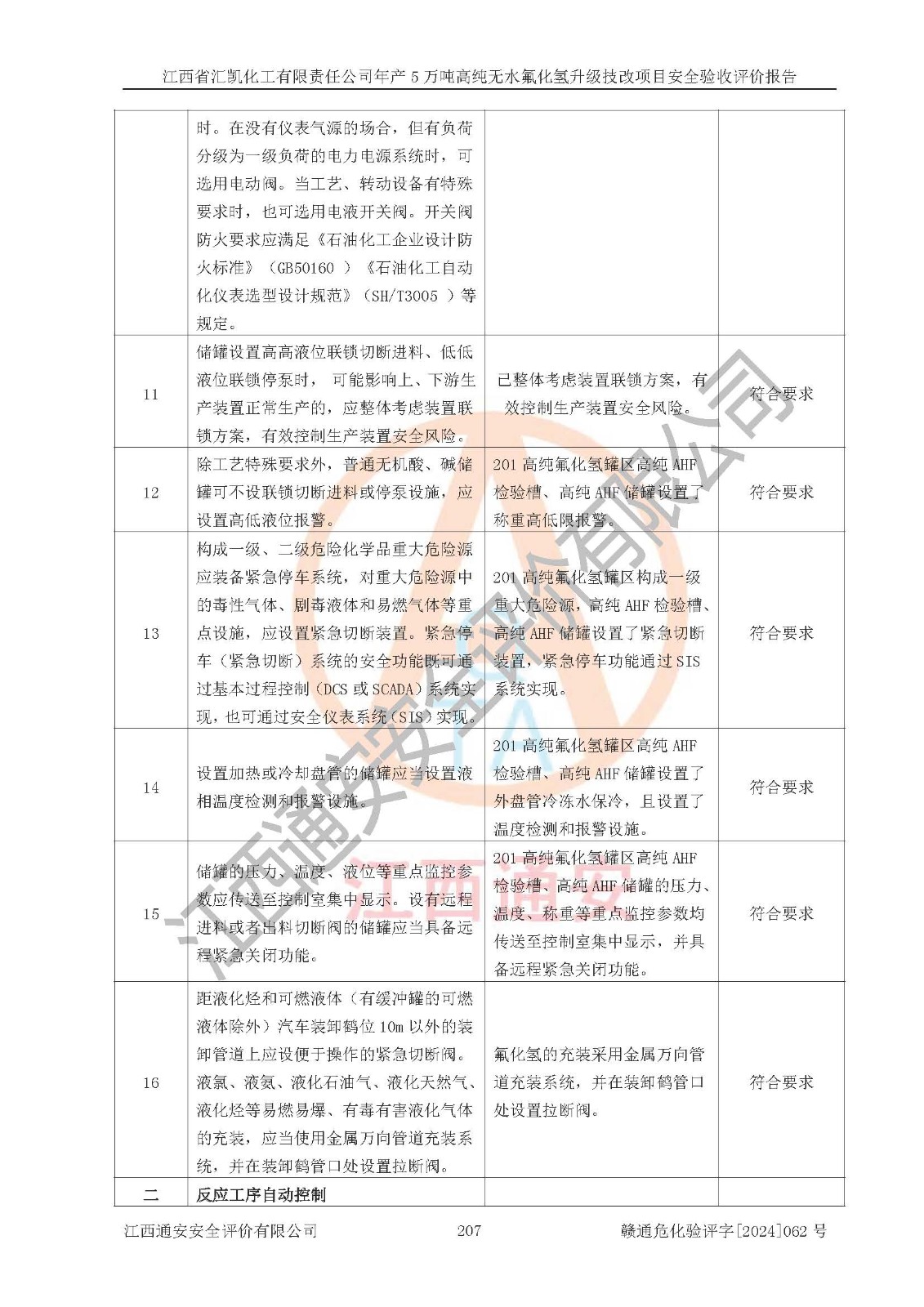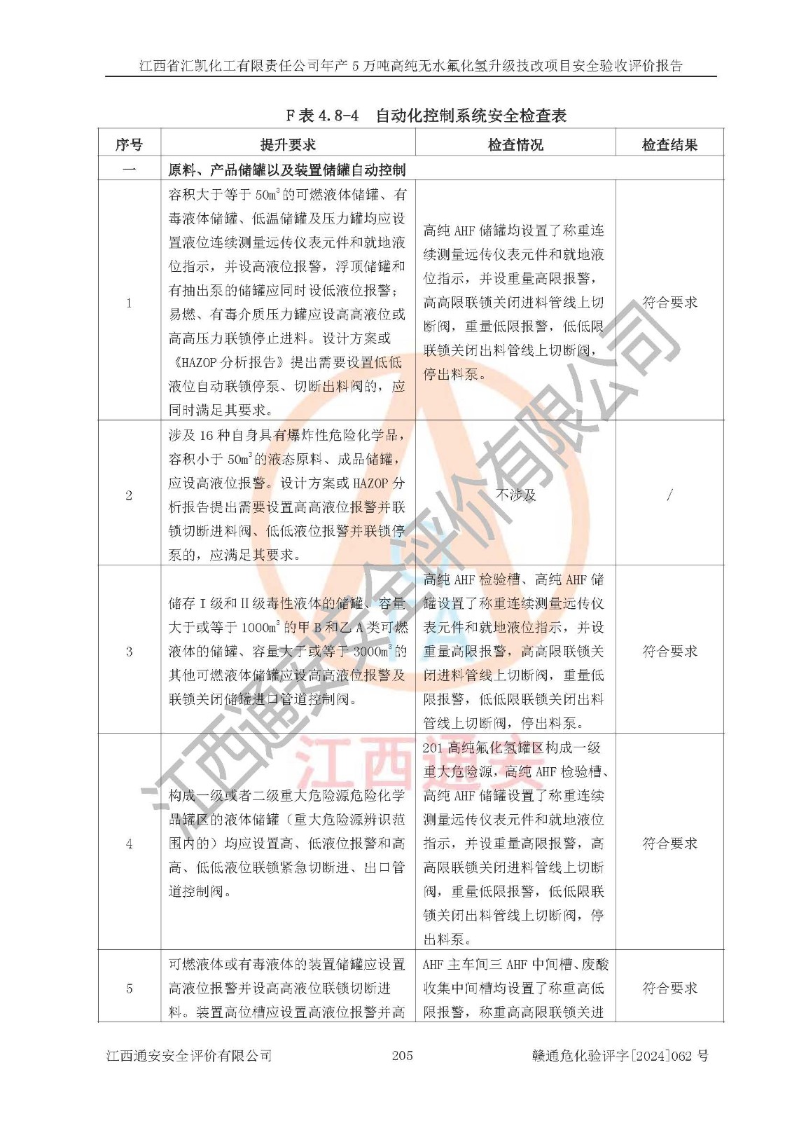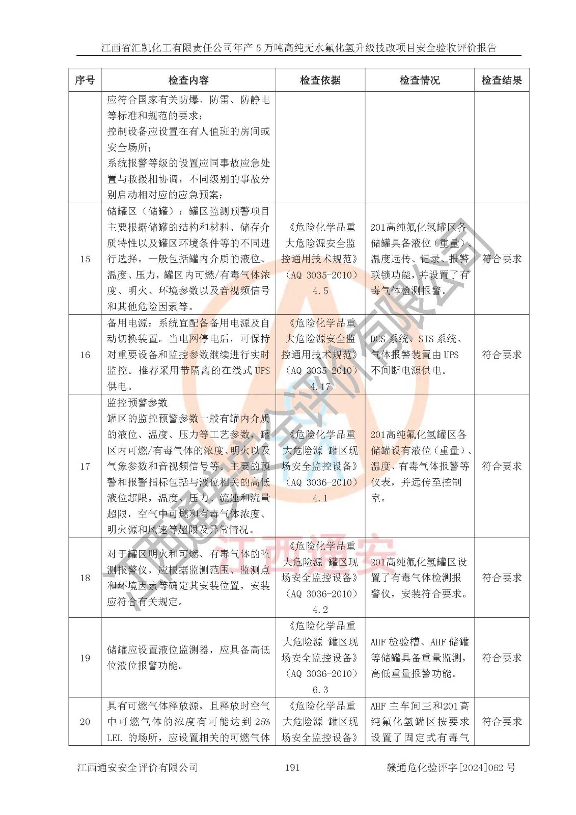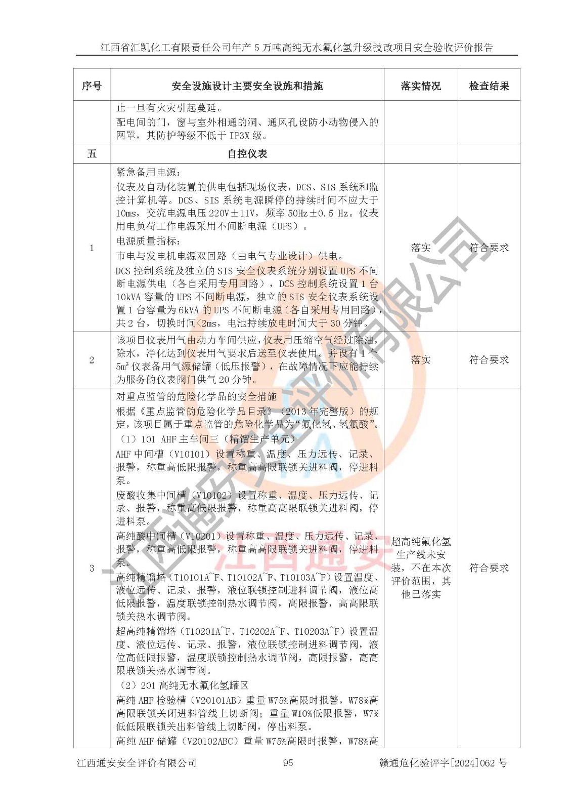 評價結(jié)論 | 江西省匯凱化工有限責(zé)任公司年產(chǎn)5萬噸高純無水氟化氫升級技改項目現(xiàn)場情況與設(shè)計圖紙一致,DCS系統(tǒng)和SIS系統(tǒng)符合設(shè)計要求、運行正常,主要負(fù)責(zé)人、安全管理人員等有關(guān)從業(yè)人員資質(zhì)符合《江西省危險化學(xué)品安全專項整治三年行動實施方案》要求,安全設(shè)施及安全管理符合**及有關(guān)部門關(guān)于安全生產(chǎn)法律、法規(guī)、標(biāo)準(zhǔn)的要求,該項目試生產(chǎn)以來,工藝設(shè)備運行正常,安全設(shè)施和采取的安全技術(shù)措施符合設(shè)計要求并達(dá)到預(yù)期結(jié)果,可以滿足建設(shè)項目安全生產(chǎn)的要求,安全生產(chǎn)管理**,具備了安全設(shè)施竣工驗收條件。 | ||||||