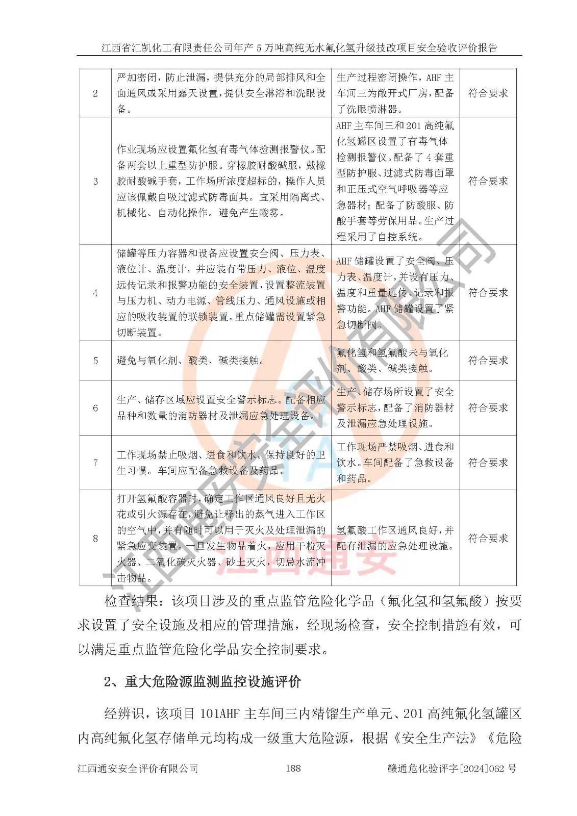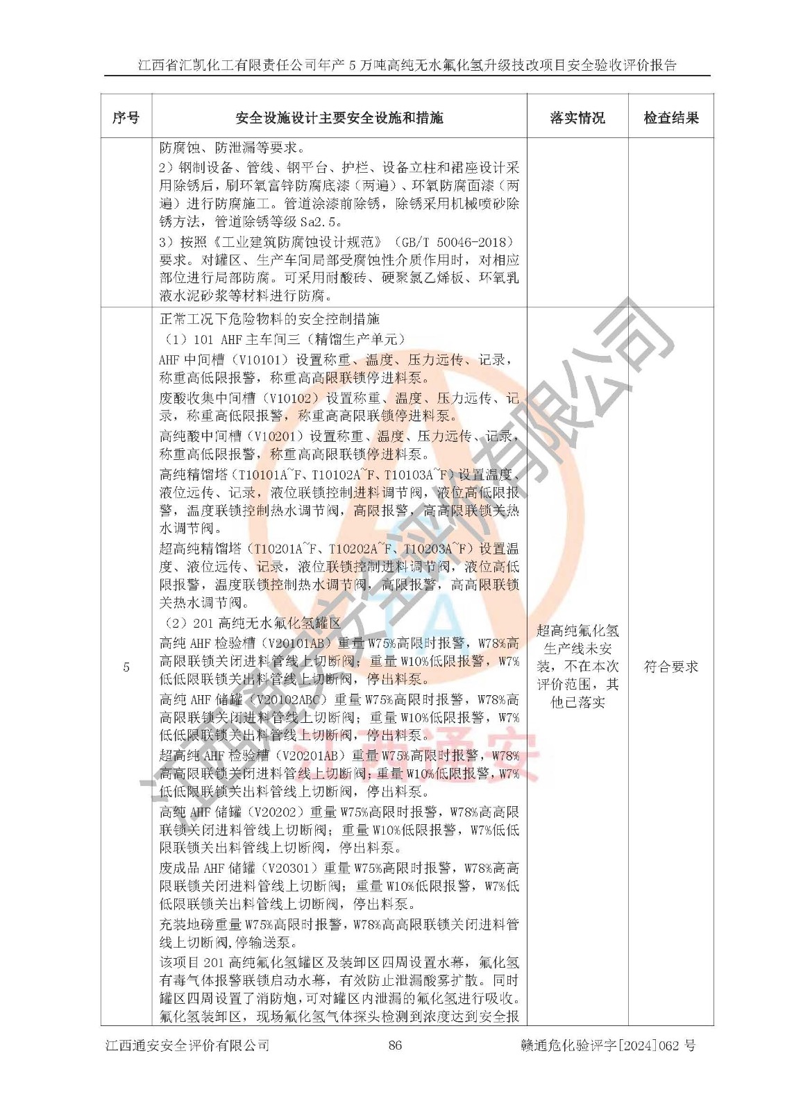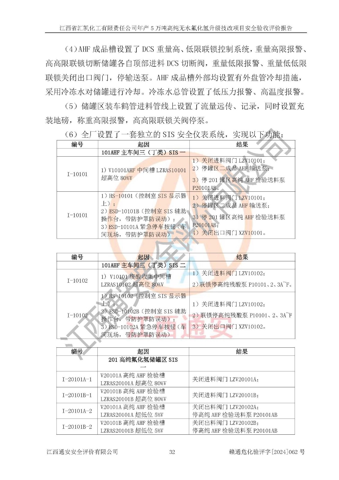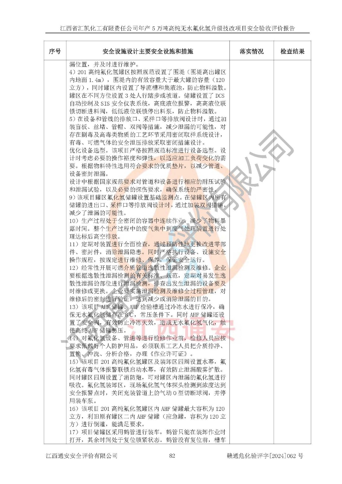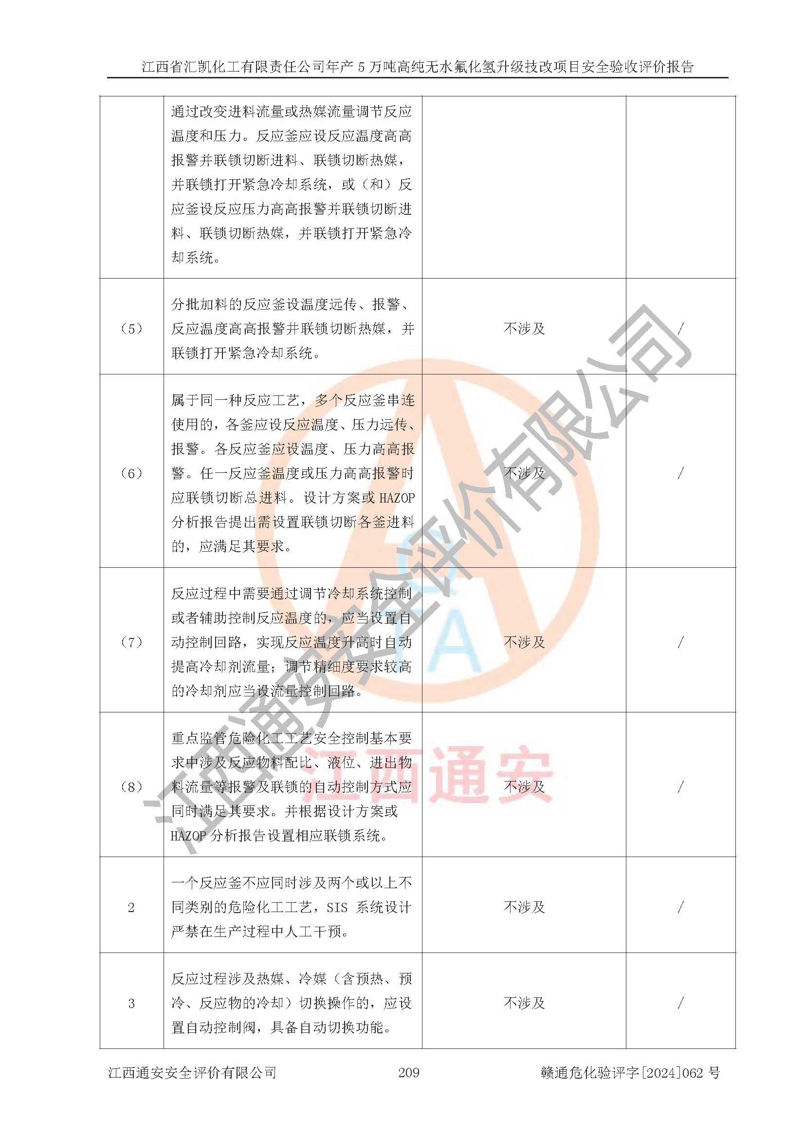 評價結(jié)論 | 江西省匯凱化工有限責(zé)任公司年產(chǎn)5萬噸高純無水氟化氫升級技改項目現(xiàn)場情況與設(shè)計圖紙一致,DCS系統(tǒng)和SIS系統(tǒng)符合設(shè)計要求、運行正常,主要負(fù)責(zé)人、安全管理人員等有關(guān)從業(yè)人員資質(zhì)符合《江西省危險化學(xué)品安全專項整治三年行動實施方案》要求,安全設(shè)施及安全管理符合**及有關(guān)部門關(guān)于安全生產(chǎn)法律、法規(guī)、標(biāo)準(zhǔn)的要求,該項目試生產(chǎn)以來,工藝設(shè)備運行正常,安全設(shè)施和采取的安全技術(shù)措施符合設(shè)計要求并達(dá)到預(yù)期結(jié)果,可以滿足建設(shè)項目安全生產(chǎn)的要求,安全生產(chǎn)管理**,具備了安全設(shè)施竣工驗收條件。 | ||||||