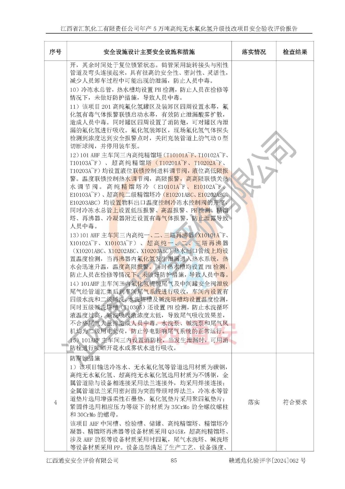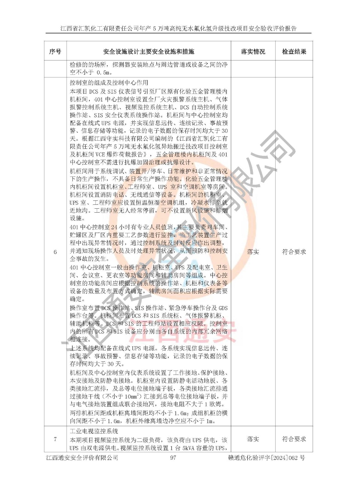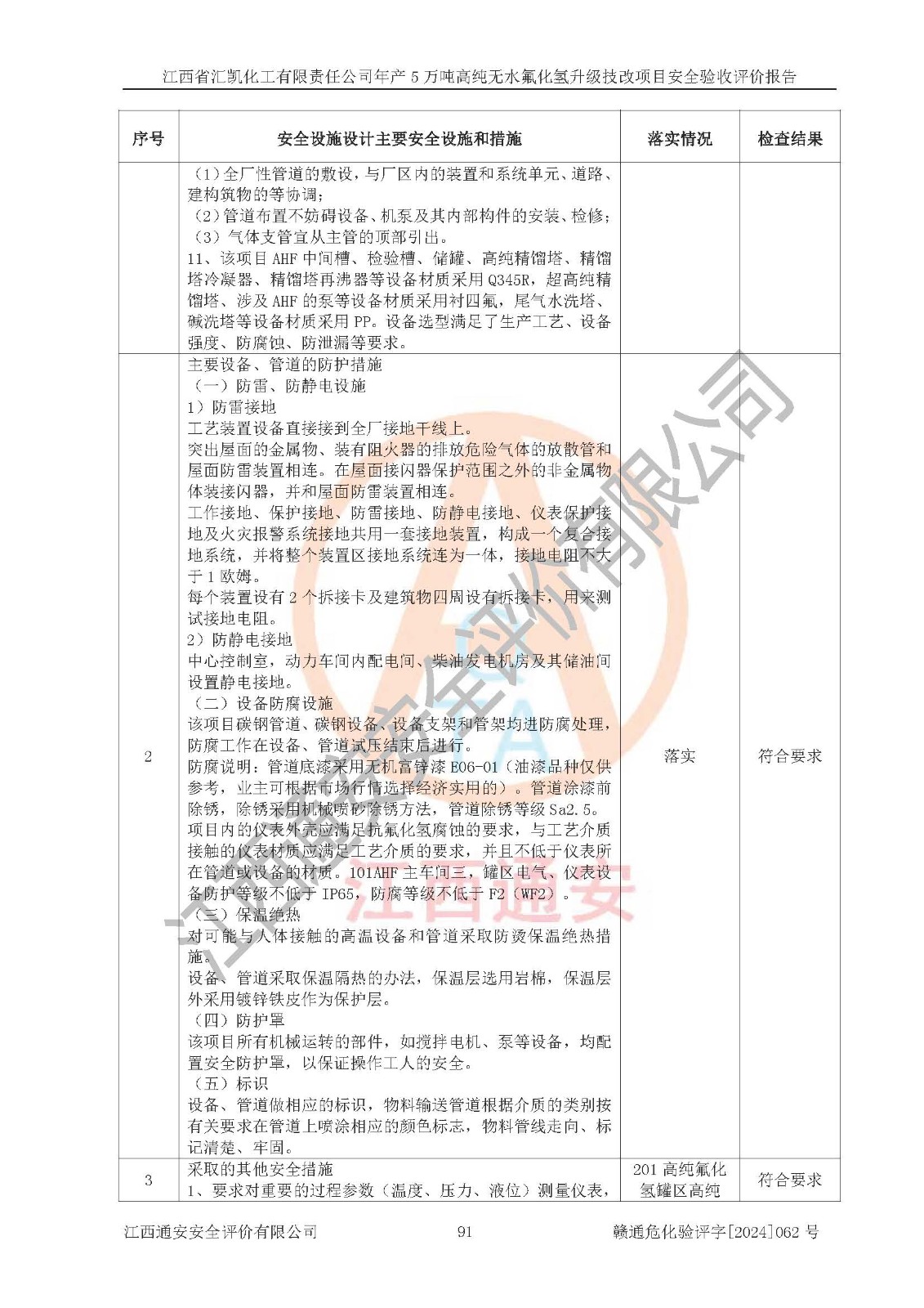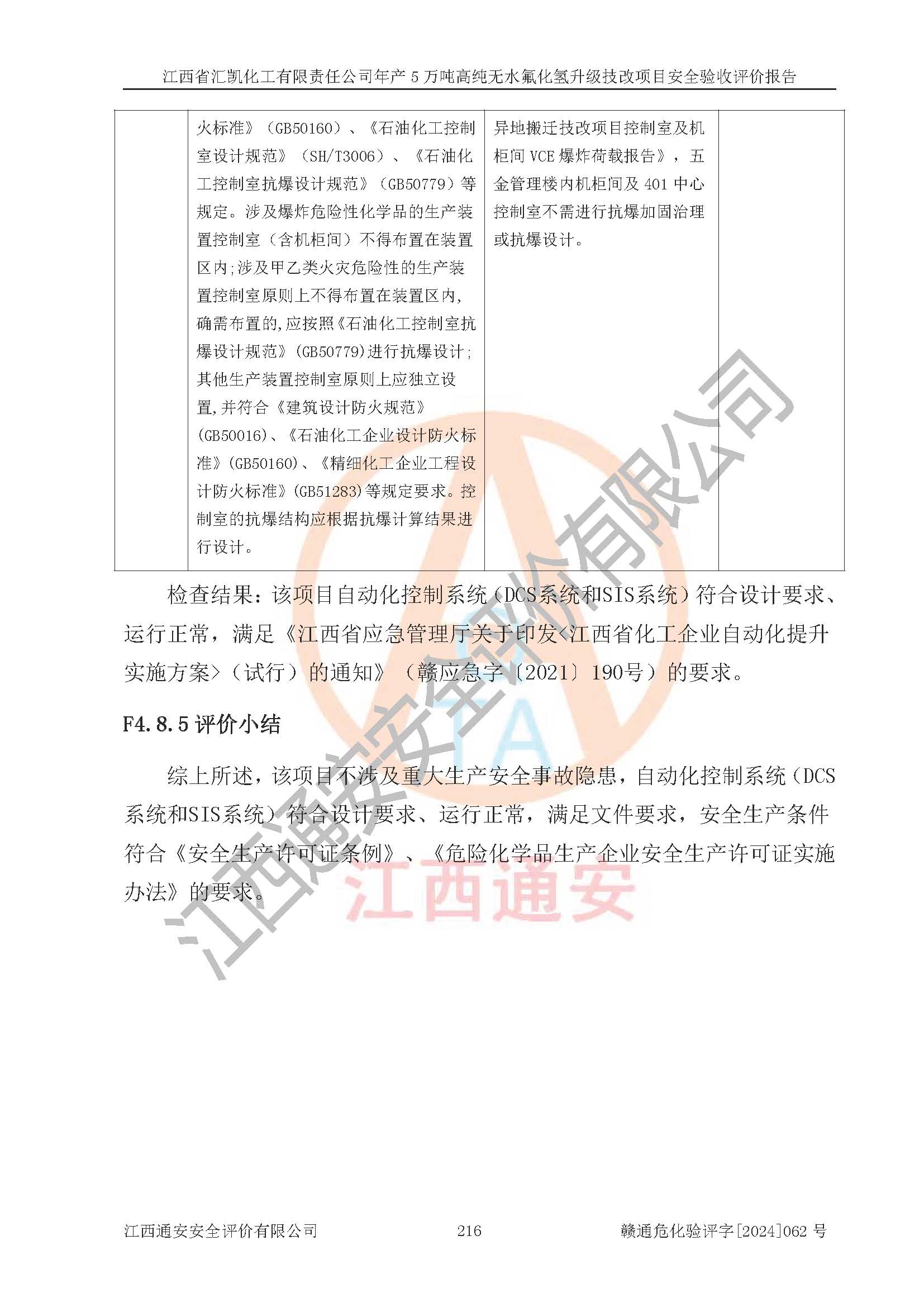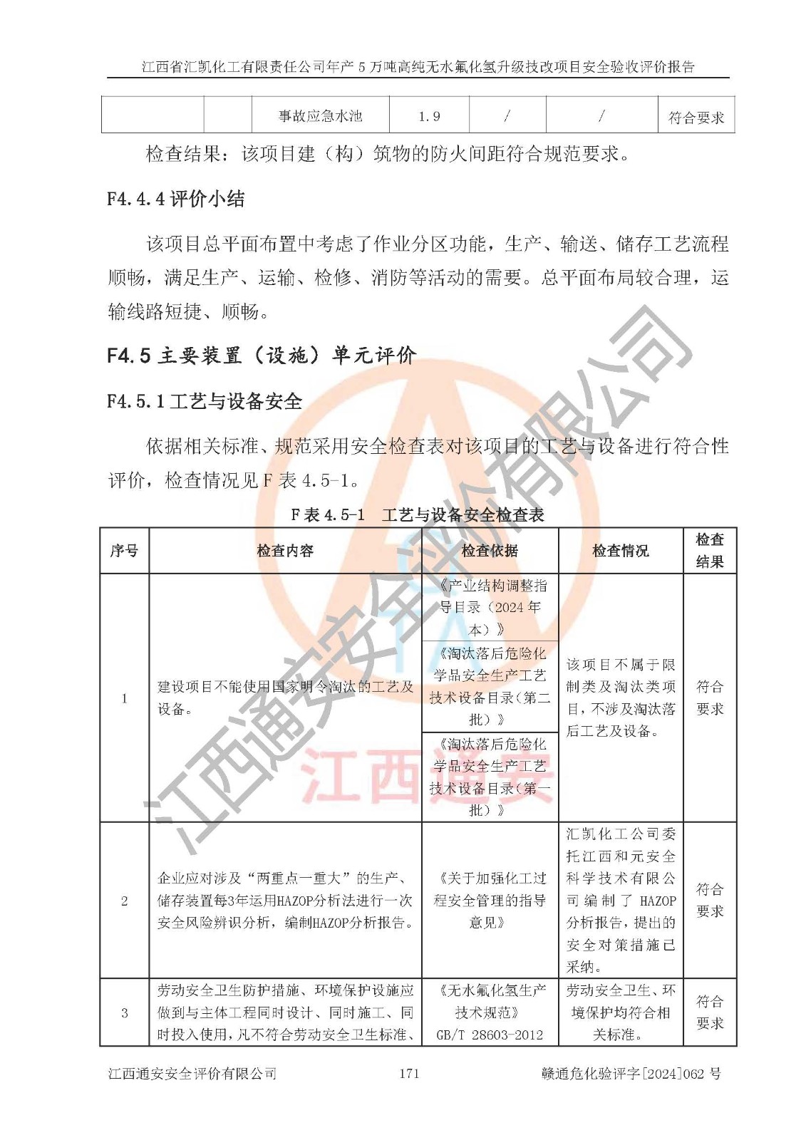 評價結(jié)論 | 江西省匯凱化工有限責(zé)任公司年產(chǎn)5萬噸高純無水氟化氫升級技改項目現(xiàn)場情況與設(shè)計圖紙一致,DCS系統(tǒng)和SIS系統(tǒng)符合設(shè)計要求、運行正常,主要負(fù)責(zé)人、安全管理人員等有關(guān)從業(yè)人員資質(zhì)符合《江西省危險化學(xué)品安全專項整治三年行動實施方案》要求,安全設(shè)施及安全管理符合**及有關(guān)部門關(guān)于安全生產(chǎn)法律、法規(guī)、標(biāo)準(zhǔn)的要求,該項目試生產(chǎn)以來,工藝設(shè)備運行正常,安全設(shè)施和采取的安全技術(shù)措施符合設(shè)計要求并達(dá)到預(yù)期結(jié)果,可以滿足建設(shè)項目安全生產(chǎn)的要求,安全生產(chǎn)管理**,具備了安全設(shè)施竣工驗收條件。 | ||||||