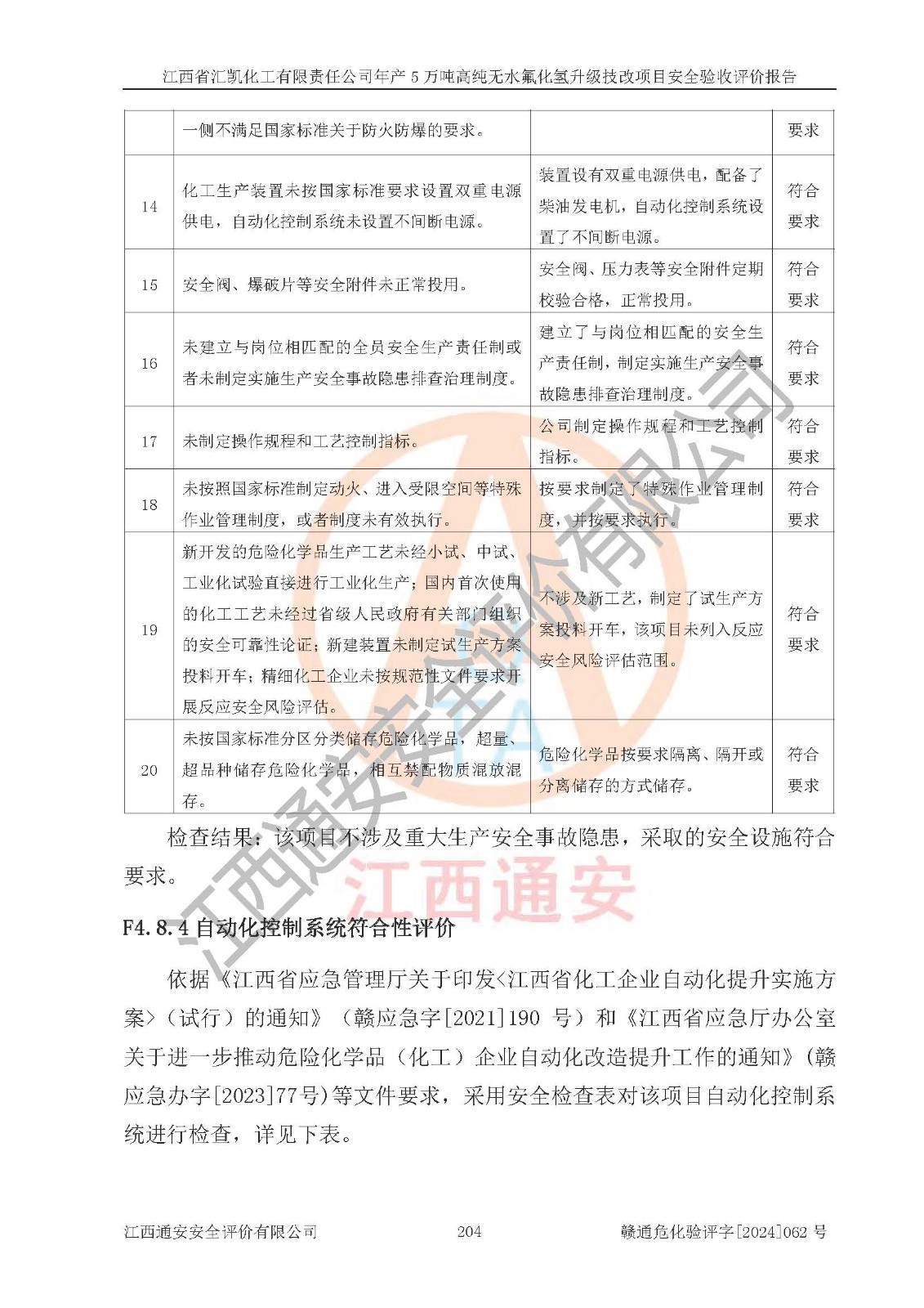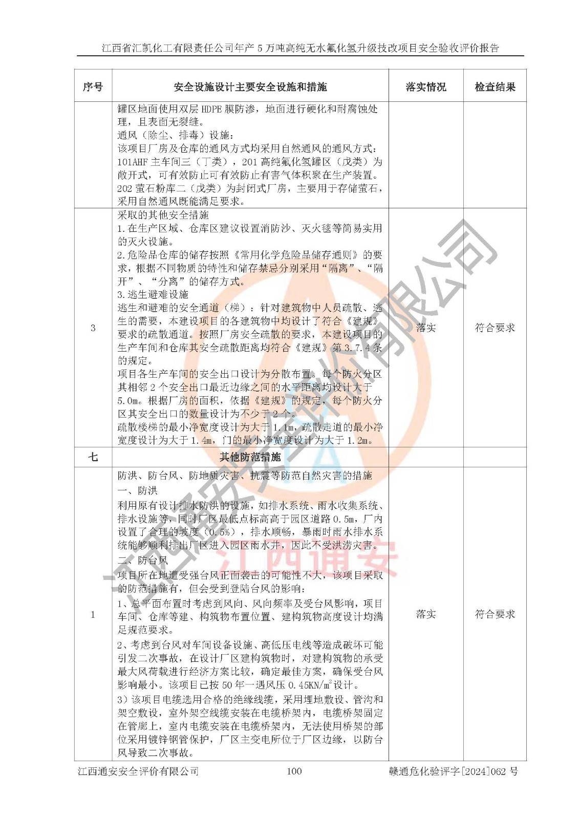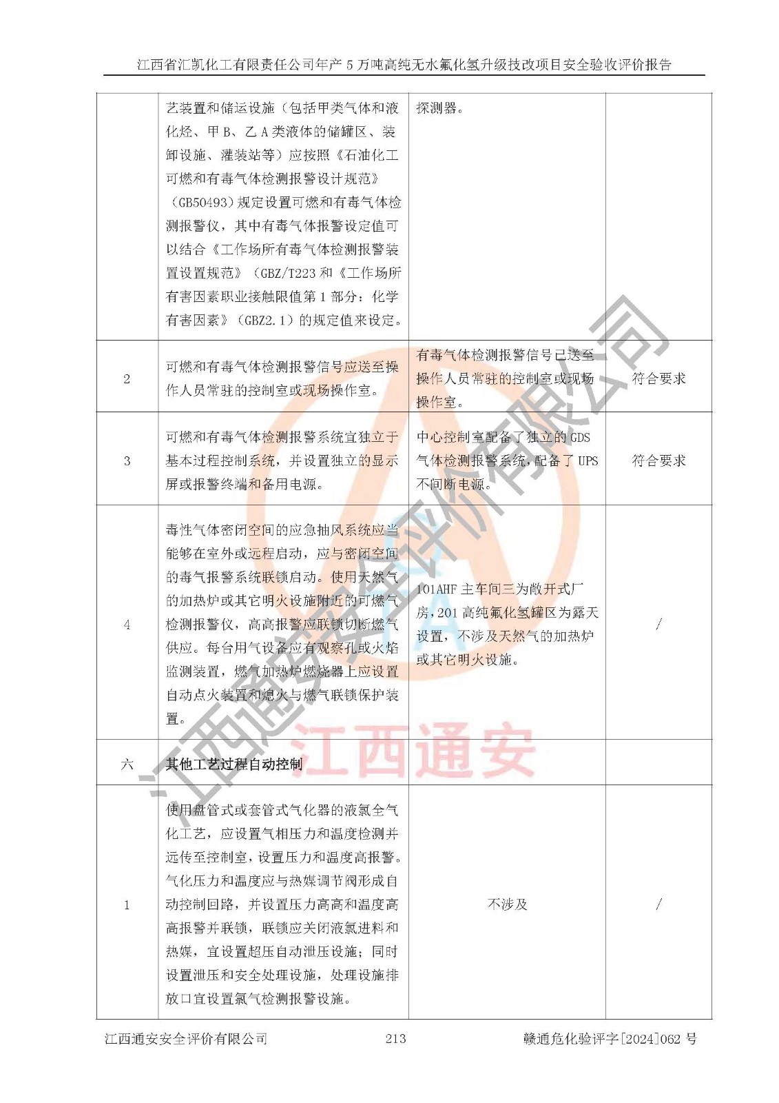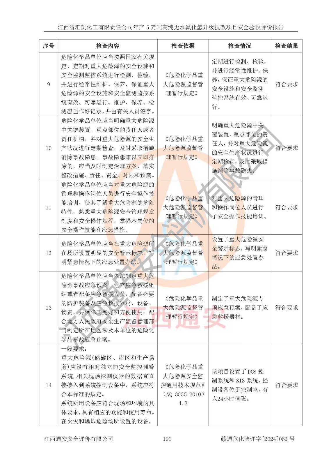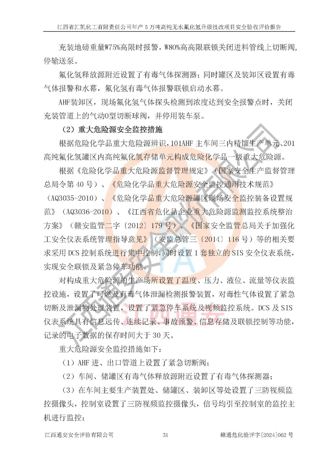 評價結(jié)論 | 江西省匯凱化工有限責(zé)任公司年產(chǎn)5萬噸高純無水氟化氫升級技改項目現(xiàn)場情況與設(shè)計圖紙一致,DCS系統(tǒng)和SIS系統(tǒng)符合設(shè)計要求、運行正常,主要負(fù)責(zé)人、安全管理人員等有關(guān)從業(yè)人員資質(zhì)符合《江西省危險化學(xué)品安全專項整治三年行動實施方案》要求,安全設(shè)施及安全管理符合**及有關(guān)部門關(guān)于安全生產(chǎn)法律、法規(guī)、標(biāo)準(zhǔn)的要求,該項目試生產(chǎn)以來,工藝設(shè)備運行正常,安全設(shè)施和采取的安全技術(shù)措施符合設(shè)計要求并達(dá)到預(yù)期結(jié)果,可以滿足建設(shè)項目安全生產(chǎn)的要求,安全生產(chǎn)管理**,具備了安全設(shè)施竣工驗收條件。 | ||||||