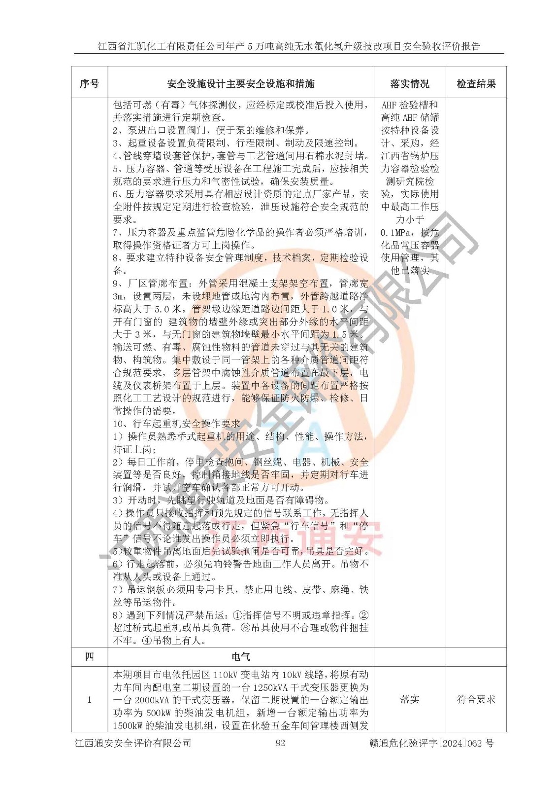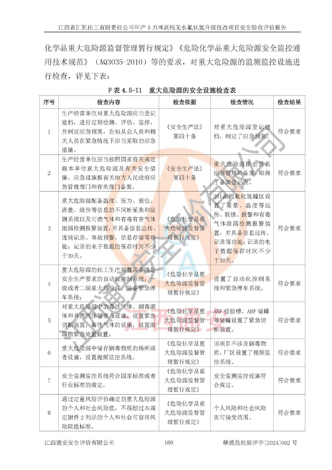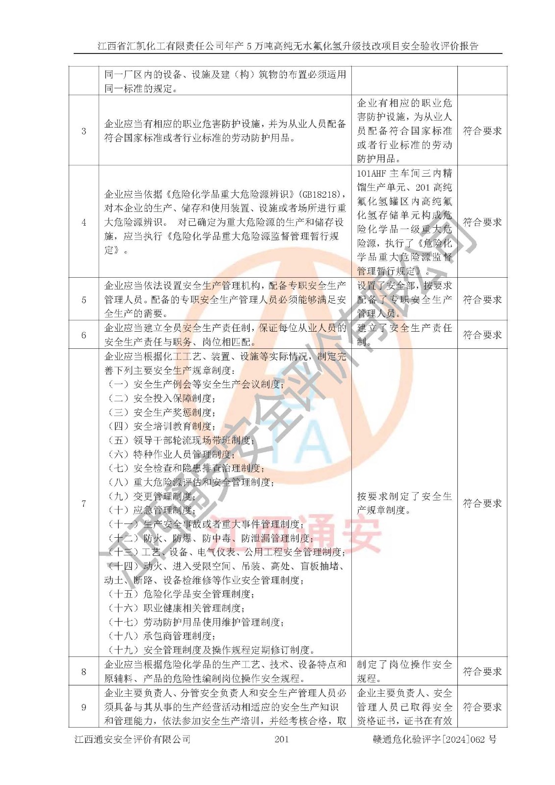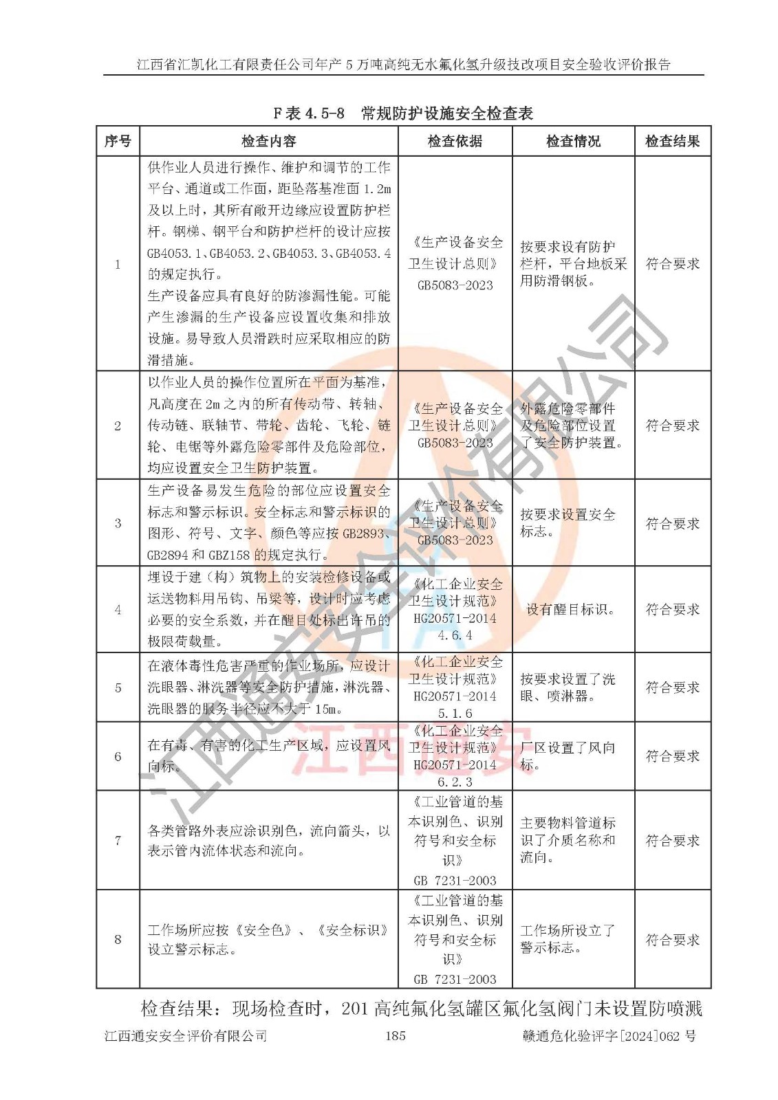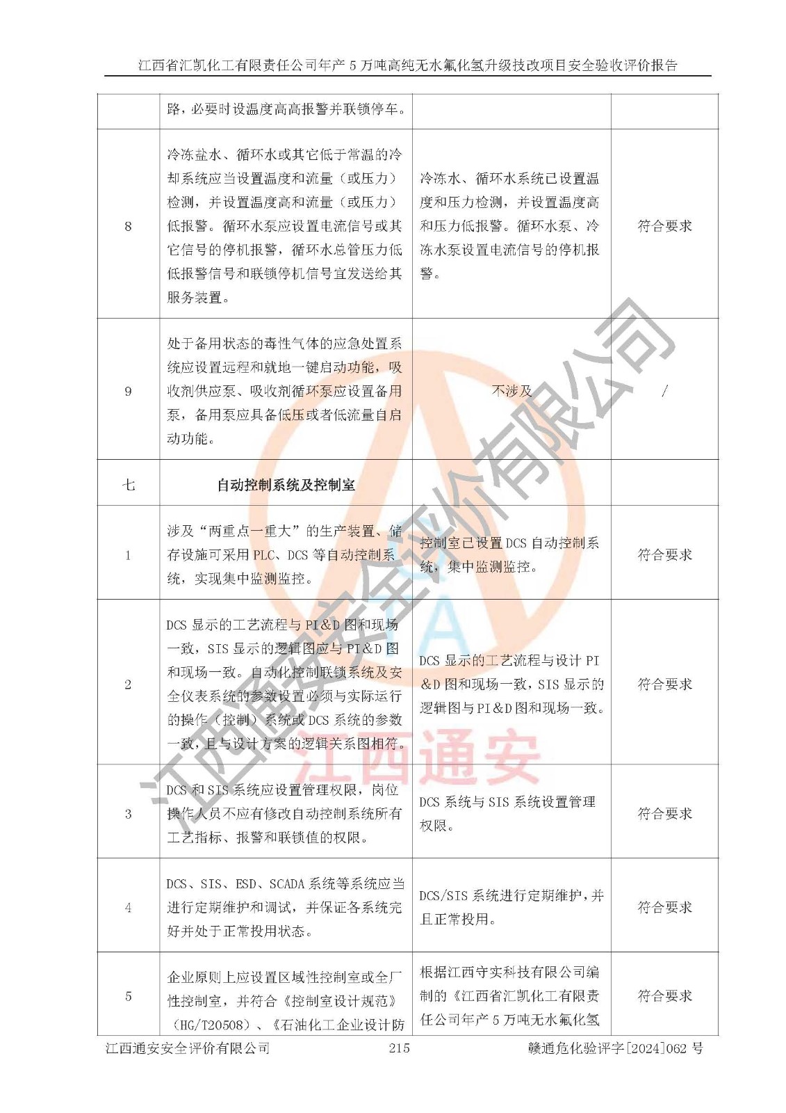 評價結(jié)論 | 江西省匯凱化工有限責(zé)任公司年產(chǎn)5萬噸高純無水氟化氫升級技改項目現(xiàn)場情況與設(shè)計圖紙一致,DCS系統(tǒng)和SIS系統(tǒng)符合設(shè)計要求、運行正常,主要負(fù)責(zé)人、安全管理人員等有關(guān)從業(yè)人員資質(zhì)符合《江西省危險化學(xué)品安全專項整治三年行動實施方案》要求,安全設(shè)施及安全管理符合**及有關(guān)部門關(guān)于安全生產(chǎn)法律、法規(guī)、標(biāo)準(zhǔn)的要求,該項目試生產(chǎn)以來,工藝設(shè)備運行正常,安全設(shè)施和采取的安全技術(shù)措施符合設(shè)計要求并達(dá)到預(yù)期結(jié)果,可以滿足建設(shè)項目安全生產(chǎn)的要求,安全生產(chǎn)管理**,具備了安全設(shè)施竣工驗收條件。 | ||||||