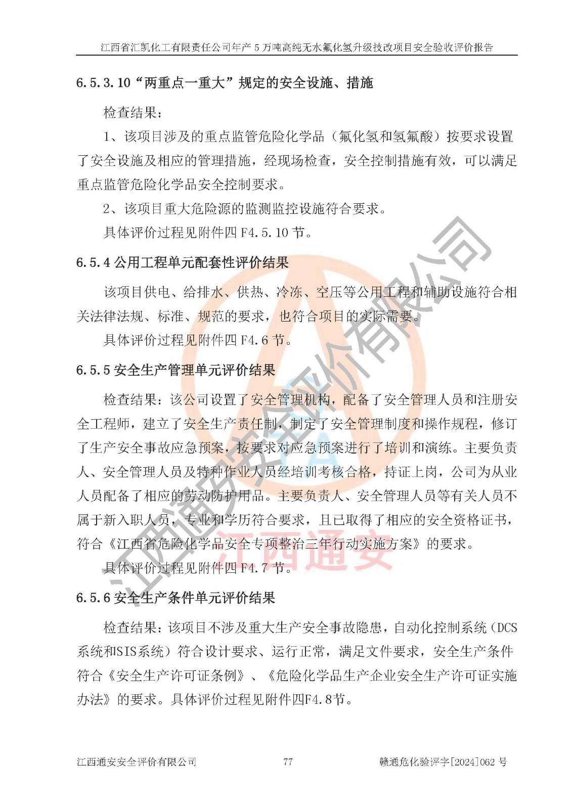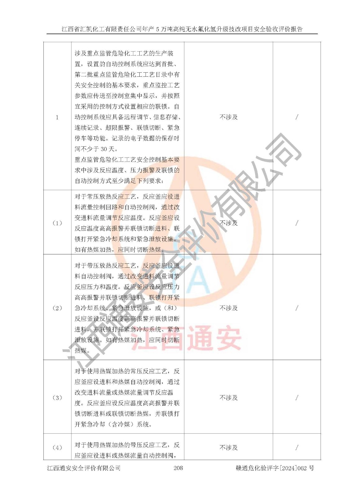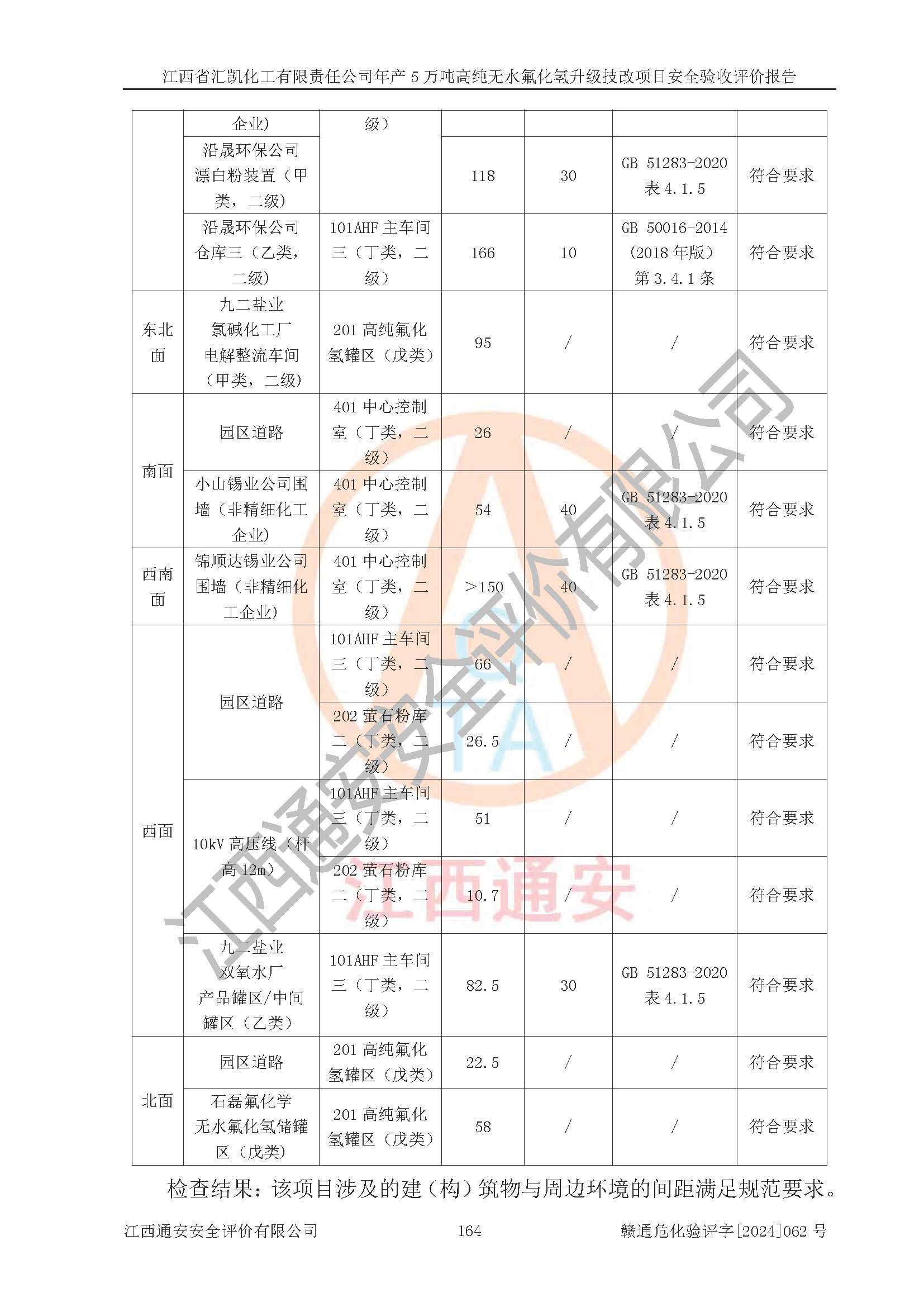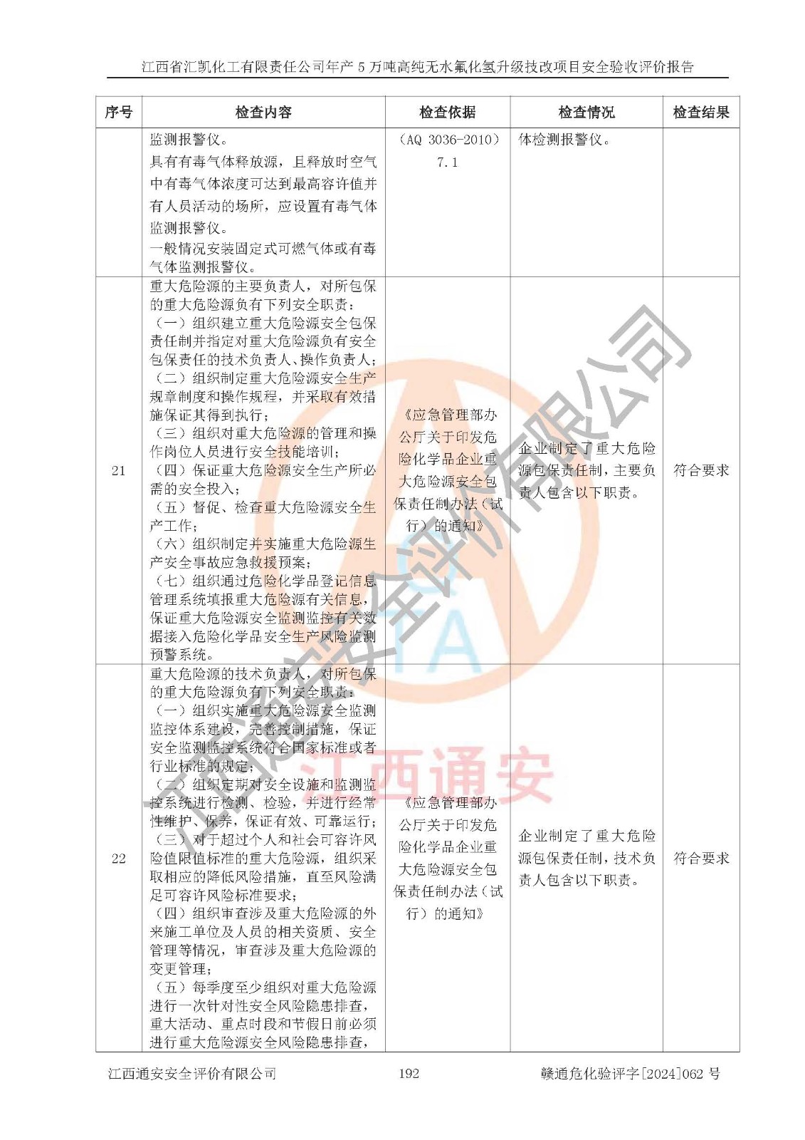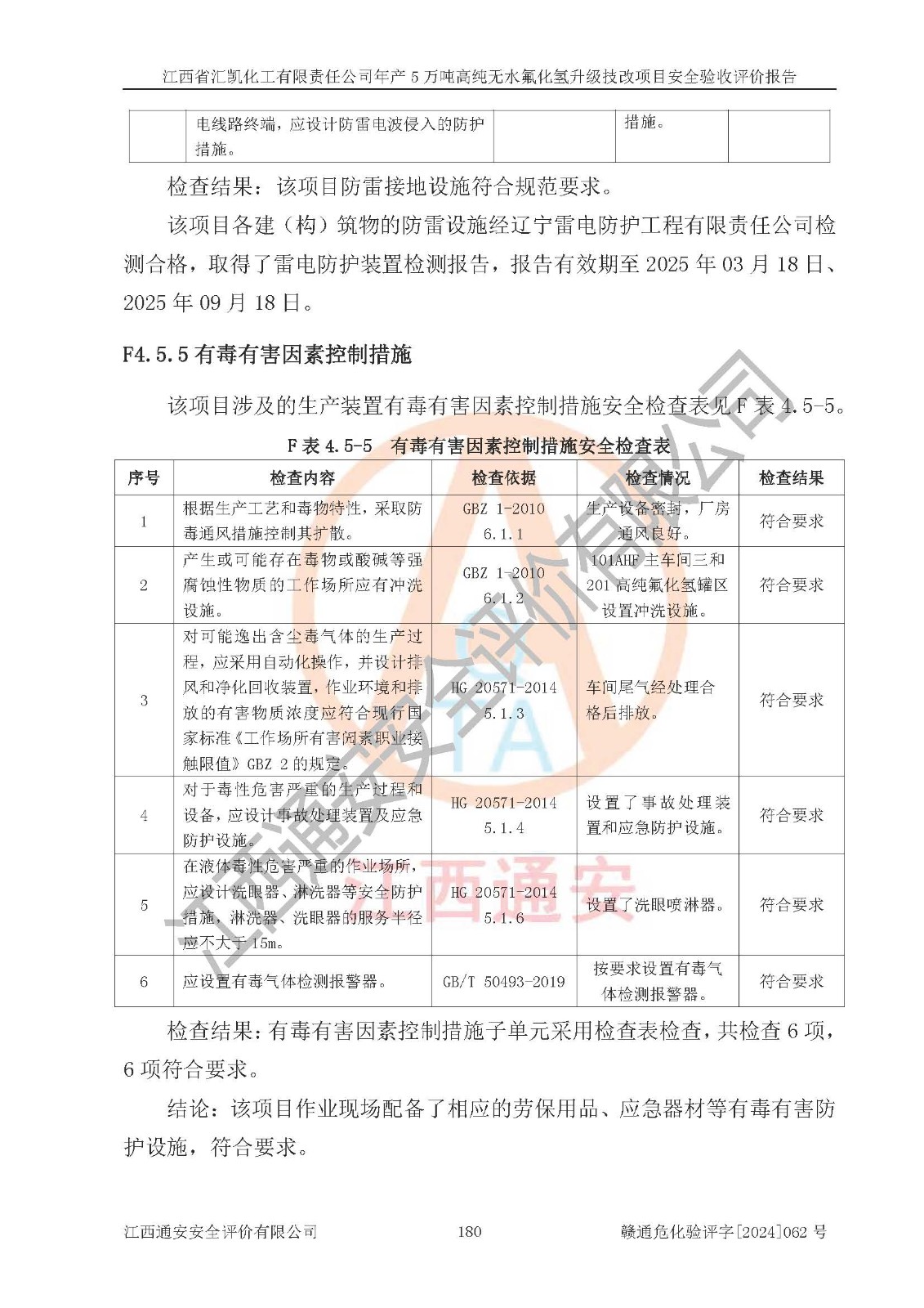 評價結(jié)論 | 江西省匯凱化工有限責(zé)任公司年產(chǎn)5萬噸高純無水氟化氫升級技改項目現(xiàn)場情況與設(shè)計圖紙一致,DCS系統(tǒng)和SIS系統(tǒng)符合設(shè)計要求、運行正常,主要負(fù)責(zé)人、安全管理人員等有關(guān)從業(yè)人員資質(zhì)符合《江西省危險化學(xué)品安全專項整治三年行動實施方案》要求,安全設(shè)施及安全管理符合**及有關(guān)部門關(guān)于安全生產(chǎn)法律、法規(guī)、標(biāo)準(zhǔn)的要求,該項目試生產(chǎn)以來,工藝設(shè)備運行正常,安全設(shè)施和采取的安全技術(shù)措施符合設(shè)計要求并達(dá)到預(yù)期結(jié)果,可以滿足建設(shè)項目安全生產(chǎn)的要求,安全生產(chǎn)管理**,具備了安全設(shè)施竣工驗收條件。 | ||||||