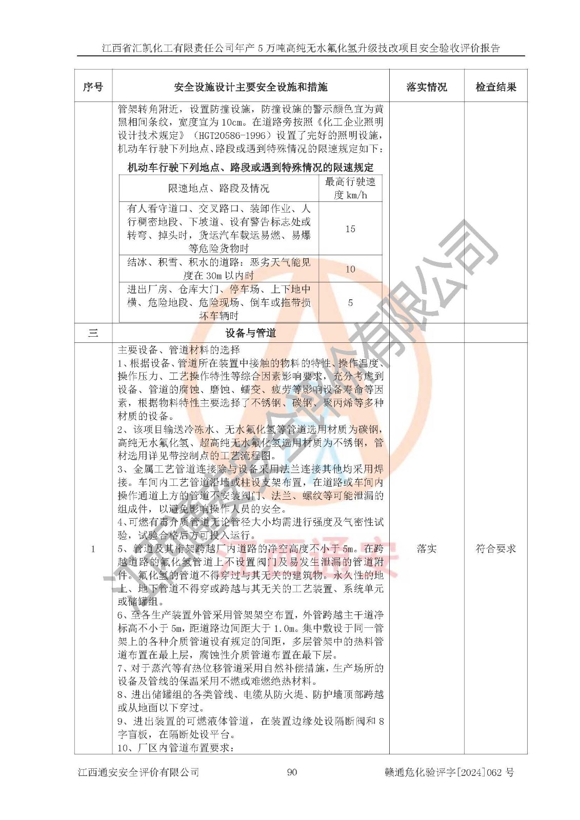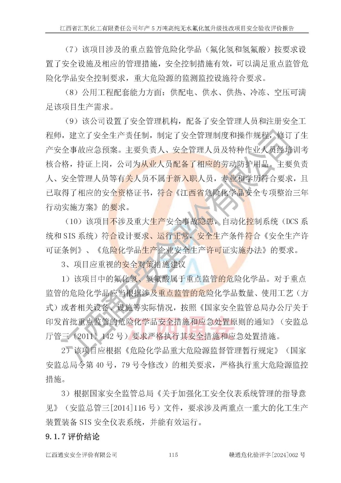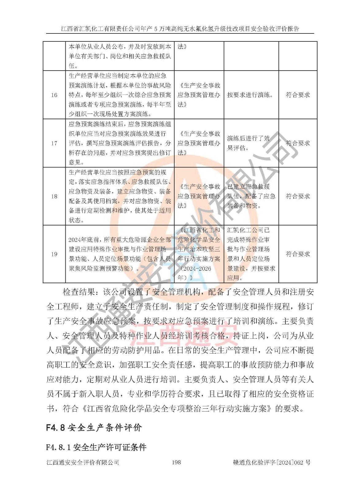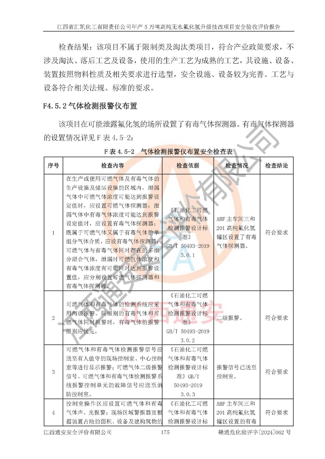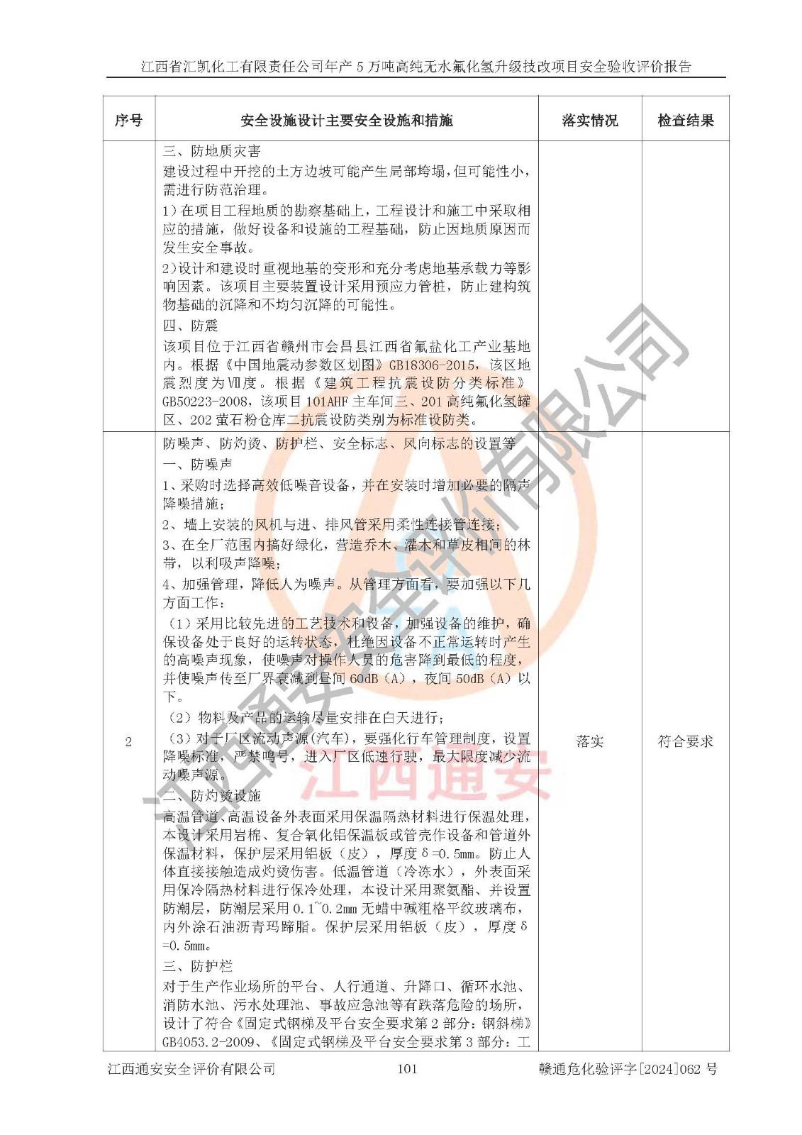評價結(jié)論 | 江西省匯凱化工有限責(zé)任公司年產(chǎn)5萬噸高純無水氟化氫升級技改項目現(xiàn)場情況與設(shè)計圖紙一致,DCS系統(tǒng)和SIS系統(tǒng)符合設(shè)計要求、運行正常,主要負(fù)責(zé)人、安全管理人員等有關(guān)從業(yè)人員資質(zhì)符合《江西省危險化學(xué)品安全專項整治三年行動實施方案》要求,安全設(shè)施及安全管理符合**及有關(guān)部門關(guān)于安全生產(chǎn)法律、法規(guī)、標(biāo)準(zhǔn)的要求,該項目試生產(chǎn)以來,工藝設(shè)備運行正常,安全設(shè)施和采取的安全技術(shù)措施符合設(shè)計要求并達(dá)到預(yù)期結(jié)果,可以滿足建設(shè)項目安全生產(chǎn)的要求,安全生產(chǎn)管理**,具備了安全設(shè)施竣工驗收條件。 | ||||||