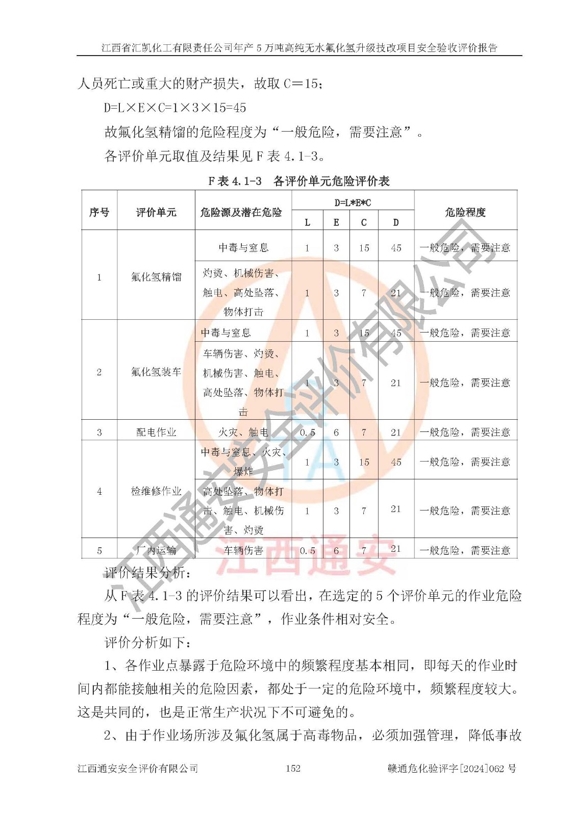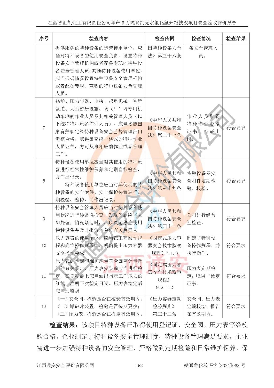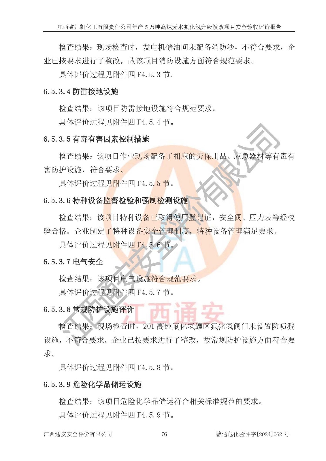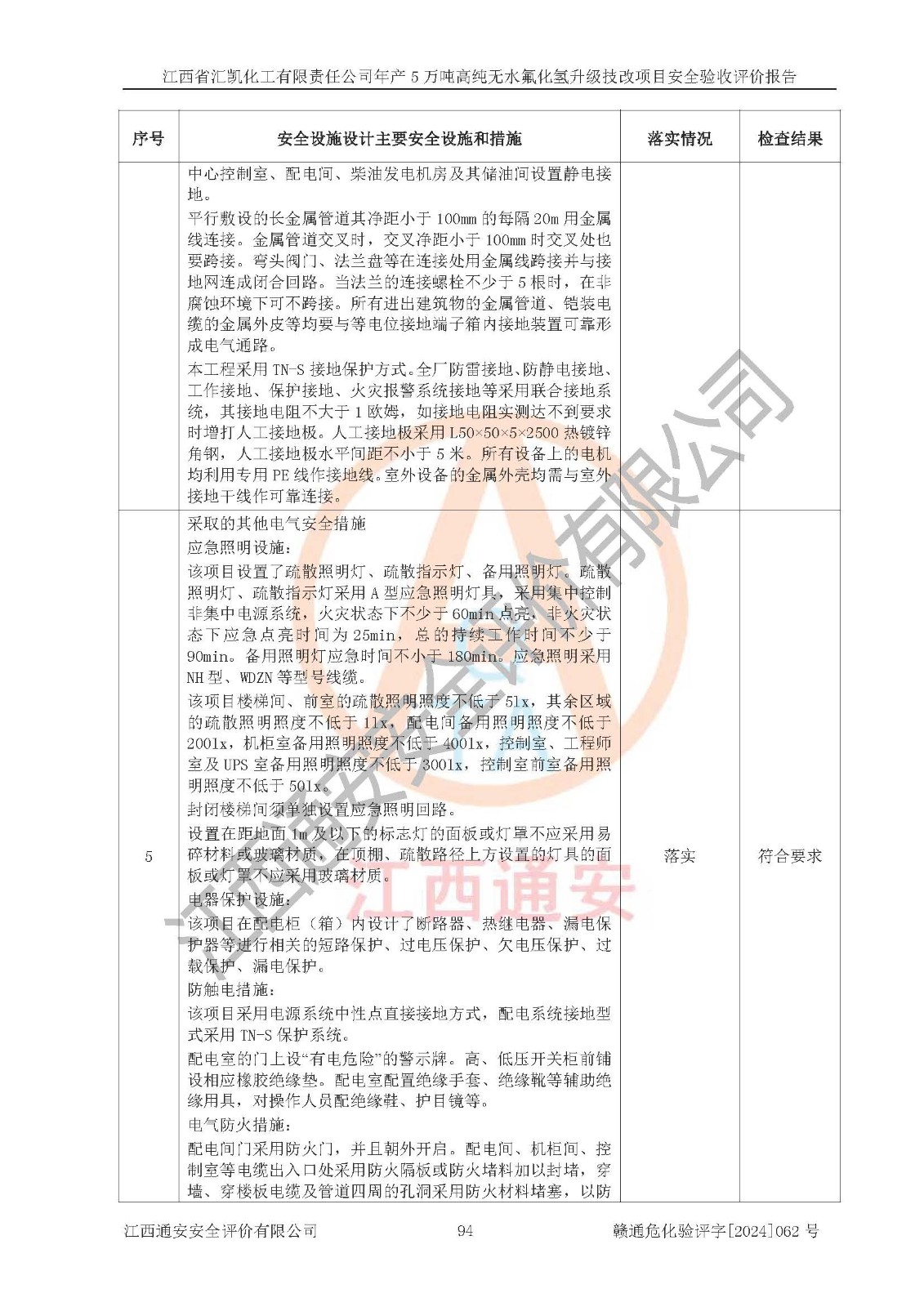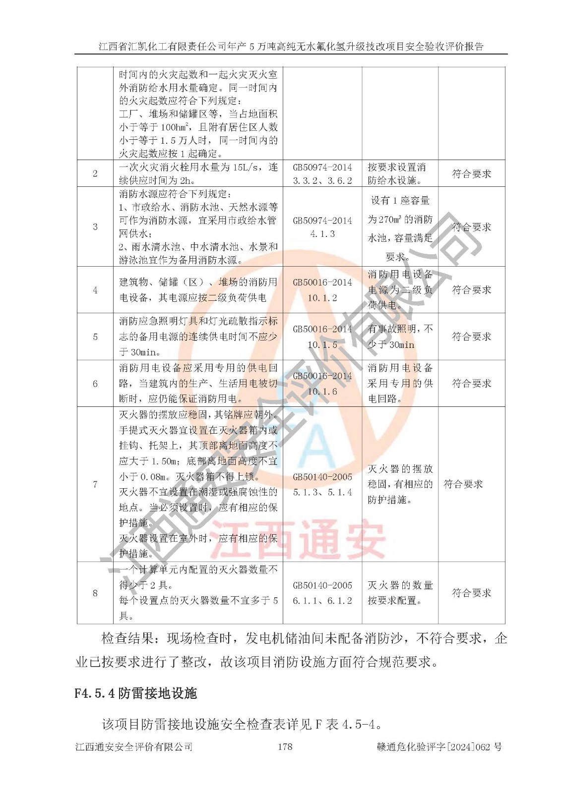 評價結(jié)論 | 江西省匯凱化工有限責(zé)任公司年產(chǎn)5萬噸高純無水氟化氫升級技改項目現(xiàn)場情況與設(shè)計圖紙一致,DCS系統(tǒng)和SIS系統(tǒng)符合設(shè)計要求、運行正常,主要負(fù)責(zé)人、安全管理人員等有關(guān)從業(yè)人員資質(zhì)符合《江西省危險化學(xué)品安全專項整治三年行動實施方案》要求,安全設(shè)施及安全管理符合**及有關(guān)部門關(guān)于安全生產(chǎn)法律、法規(guī)、標(biāo)準(zhǔn)的要求,該項目試生產(chǎn)以來,工藝設(shè)備運行正常,安全設(shè)施和采取的安全技術(shù)措施符合設(shè)計要求并達(dá)到預(yù)期結(jié)果,可以滿足建設(shè)項目安全生產(chǎn)的要求,安全生產(chǎn)管理**,具備了安全設(shè)施竣工驗收條件。 | ||||||