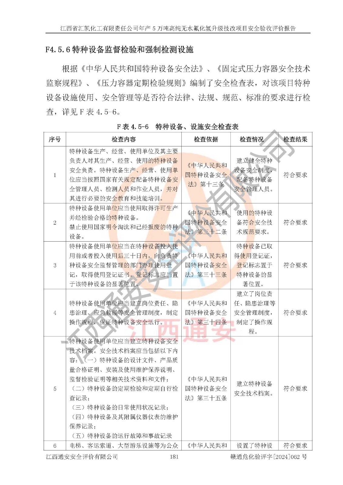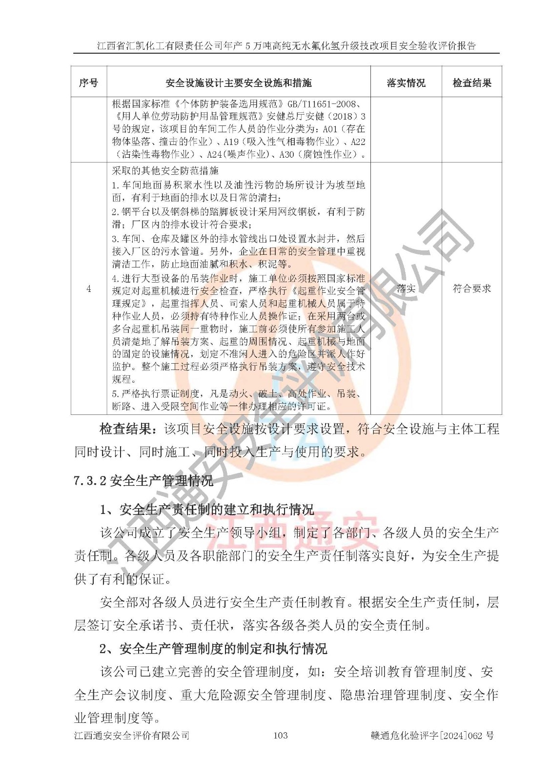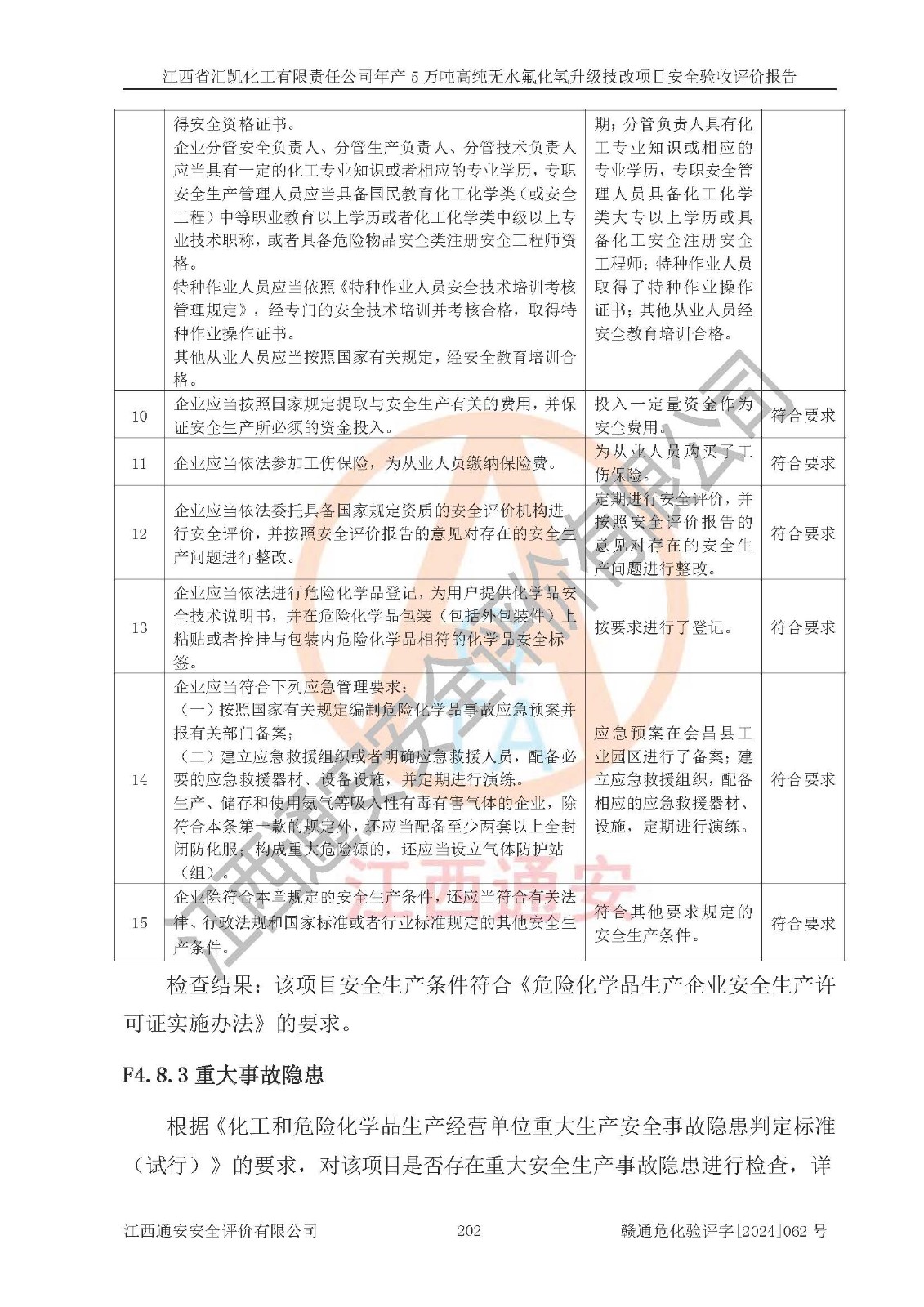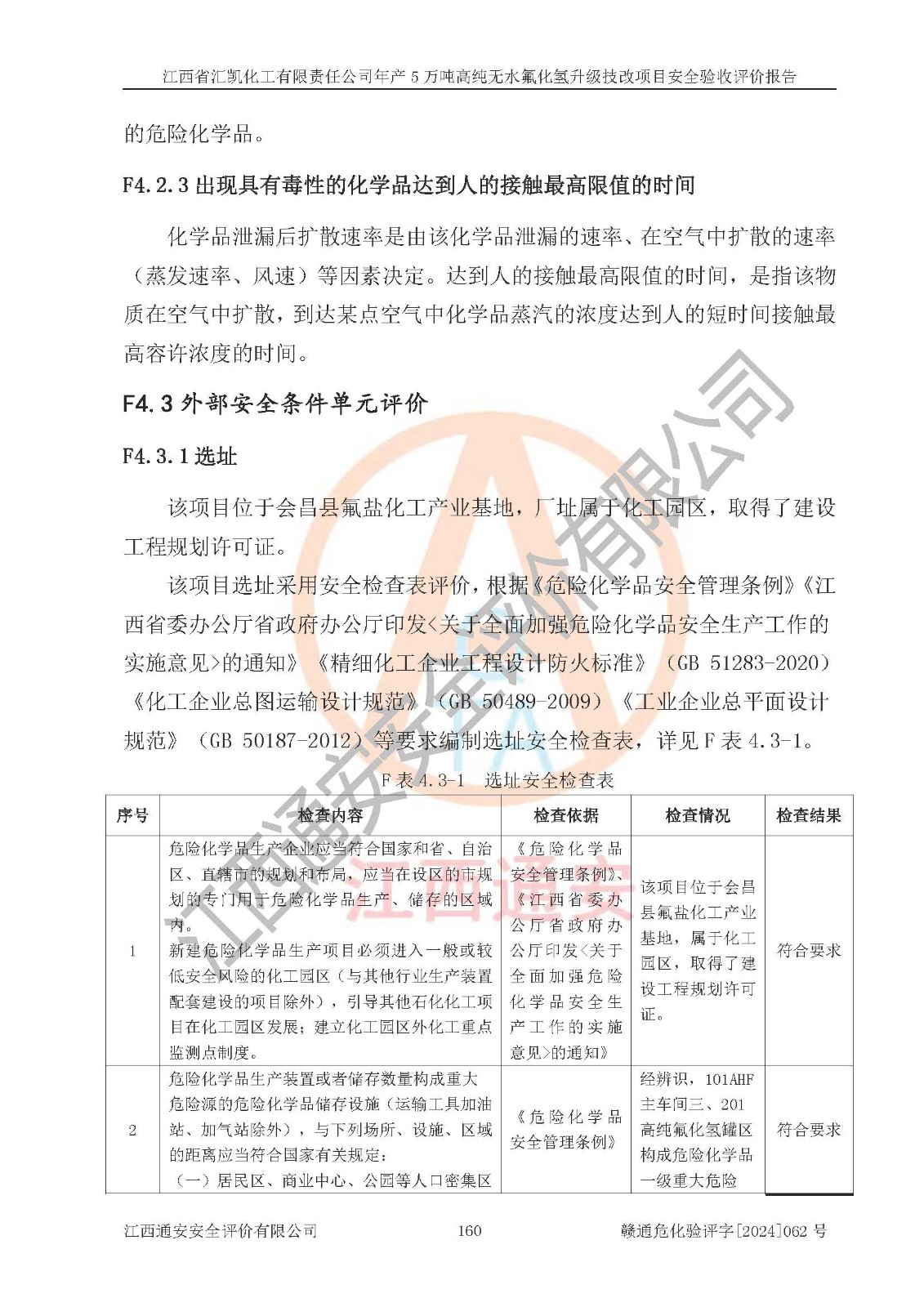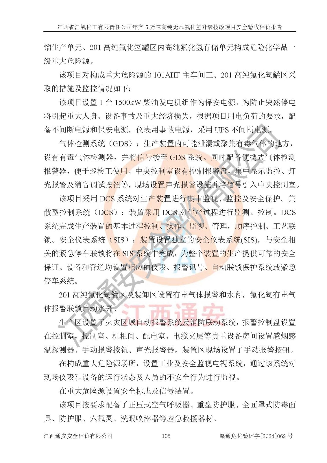 評價結(jié)論 | 江西省匯凱化工有限責(zé)任公司年產(chǎn)5萬噸高純無水氟化氫升級技改項目現(xiàn)場情況與設(shè)計圖紙一致,DCS系統(tǒng)和SIS系統(tǒng)符合設(shè)計要求、運行正常,主要負(fù)責(zé)人、安全管理人員等有關(guān)從業(yè)人員資質(zhì)符合《江西省危險化學(xué)品安全專項整治三年行動實施方案》要求,安全設(shè)施及安全管理符合**及有關(guān)部門關(guān)于安全生產(chǎn)法律、法規(guī)、標(biāo)準(zhǔn)的要求,該項目試生產(chǎn)以來,工藝設(shè)備運行正常,安全設(shè)施和采取的安全技術(shù)措施符合設(shè)計要求并達(dá)到預(yù)期結(jié)果,可以滿足建設(shè)項目安全生產(chǎn)的要求,安全生產(chǎn)管理**,具備了安全設(shè)施竣工驗收條件。 | ||||||