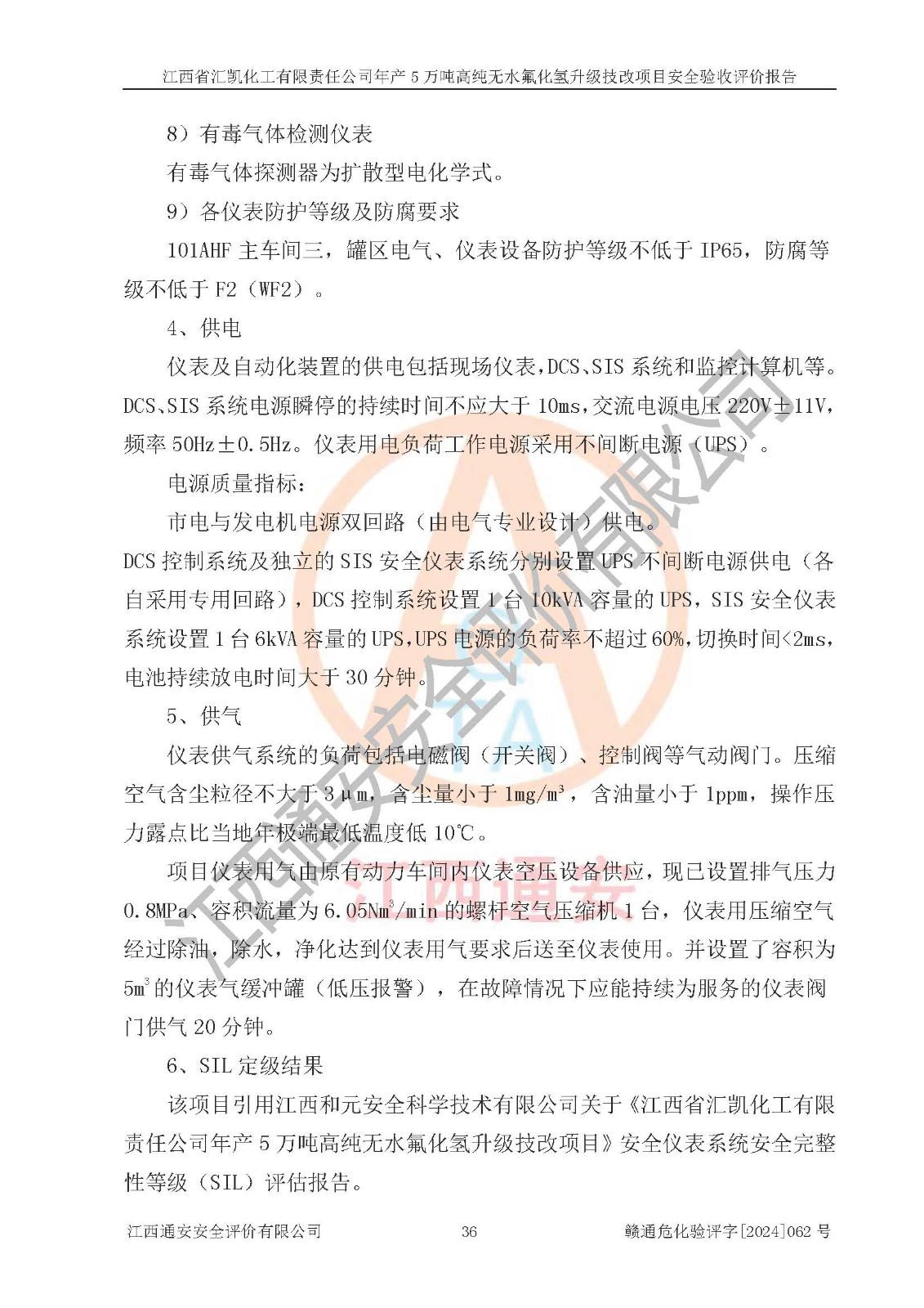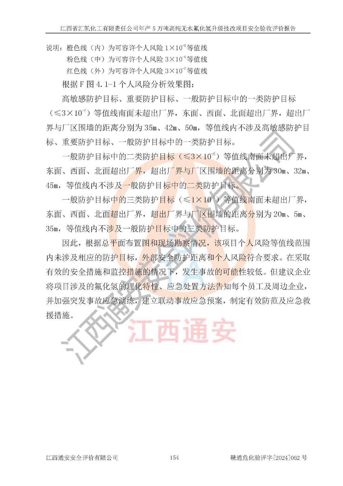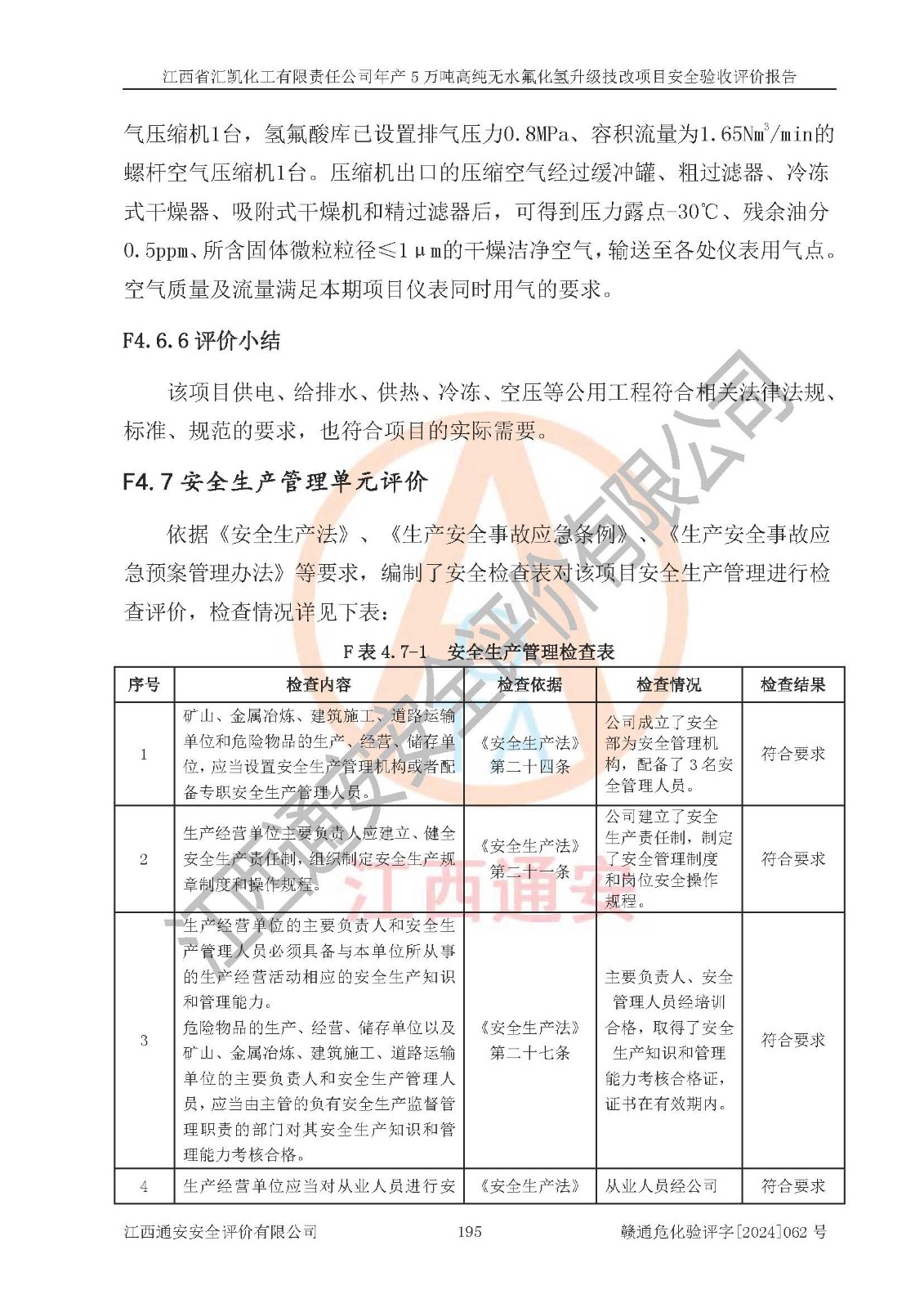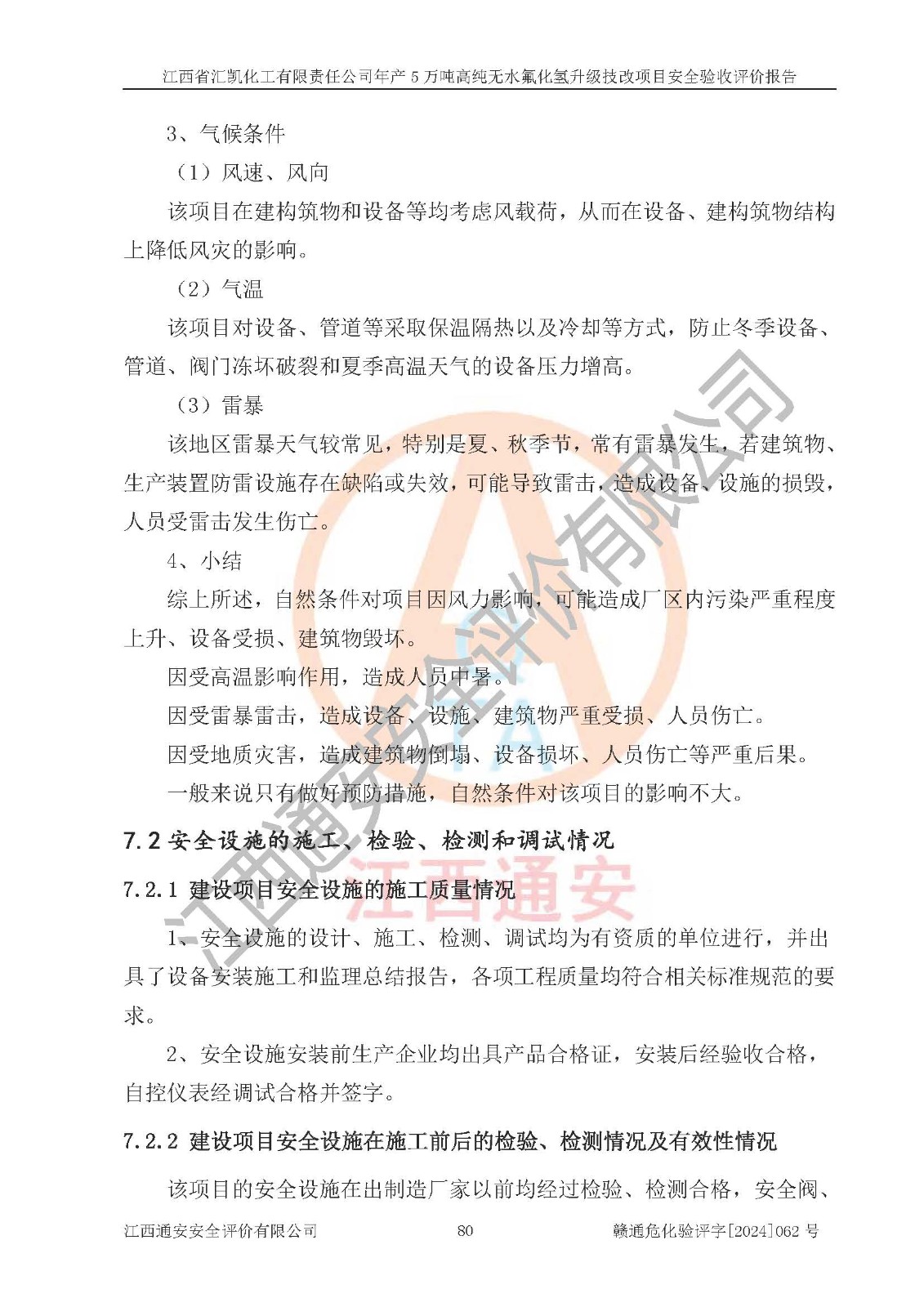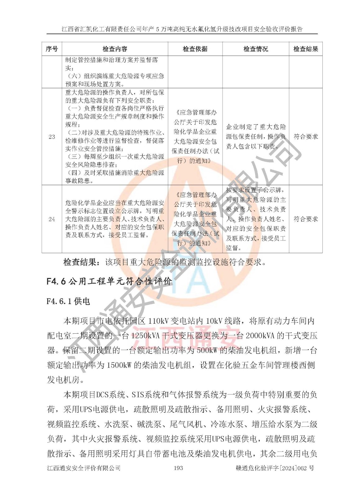 評價結(jié)論 | 江西省匯凱化工有限責(zé)任公司年產(chǎn)5萬噸高純無水氟化氫升級技改項目現(xiàn)場情況與設(shè)計圖紙一致,DCS系統(tǒng)和SIS系統(tǒng)符合設(shè)計要求、運行正常,主要負(fù)責(zé)人、安全管理人員等有關(guān)從業(yè)人員資質(zhì)符合《江西省危險化學(xué)品安全專項整治三年行動實施方案》要求,安全設(shè)施及安全管理符合**及有關(guān)部門關(guān)于安全生產(chǎn)法律、法規(guī)、標(biāo)準(zhǔn)的要求,該項目試生產(chǎn)以來,工藝設(shè)備運行正常,安全設(shè)施和采取的安全技術(shù)措施符合設(shè)計要求并達(dá)到預(yù)期結(jié)果,可以滿足建設(shè)項目安全生產(chǎn)的要求,安全生產(chǎn)管理**,具備了安全設(shè)施竣工驗收條件。 | ||||||