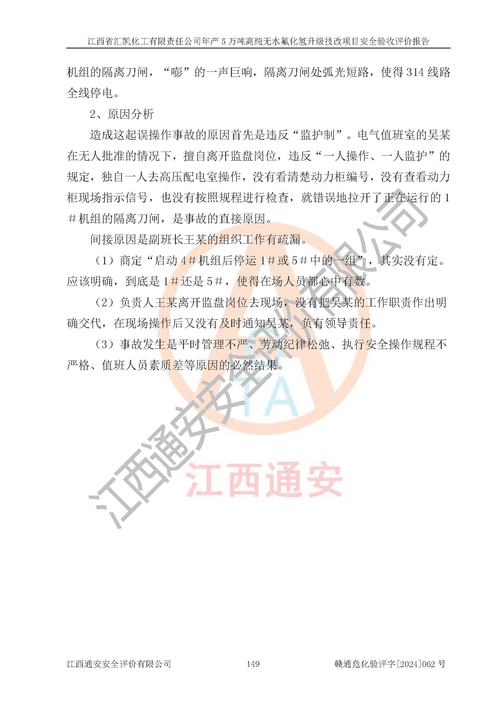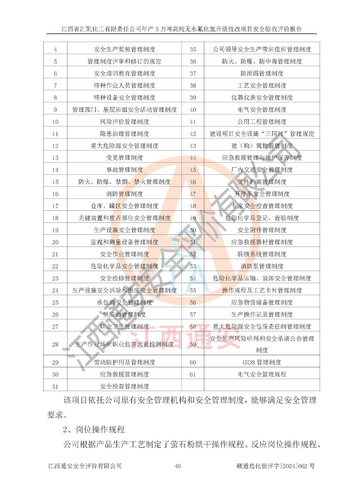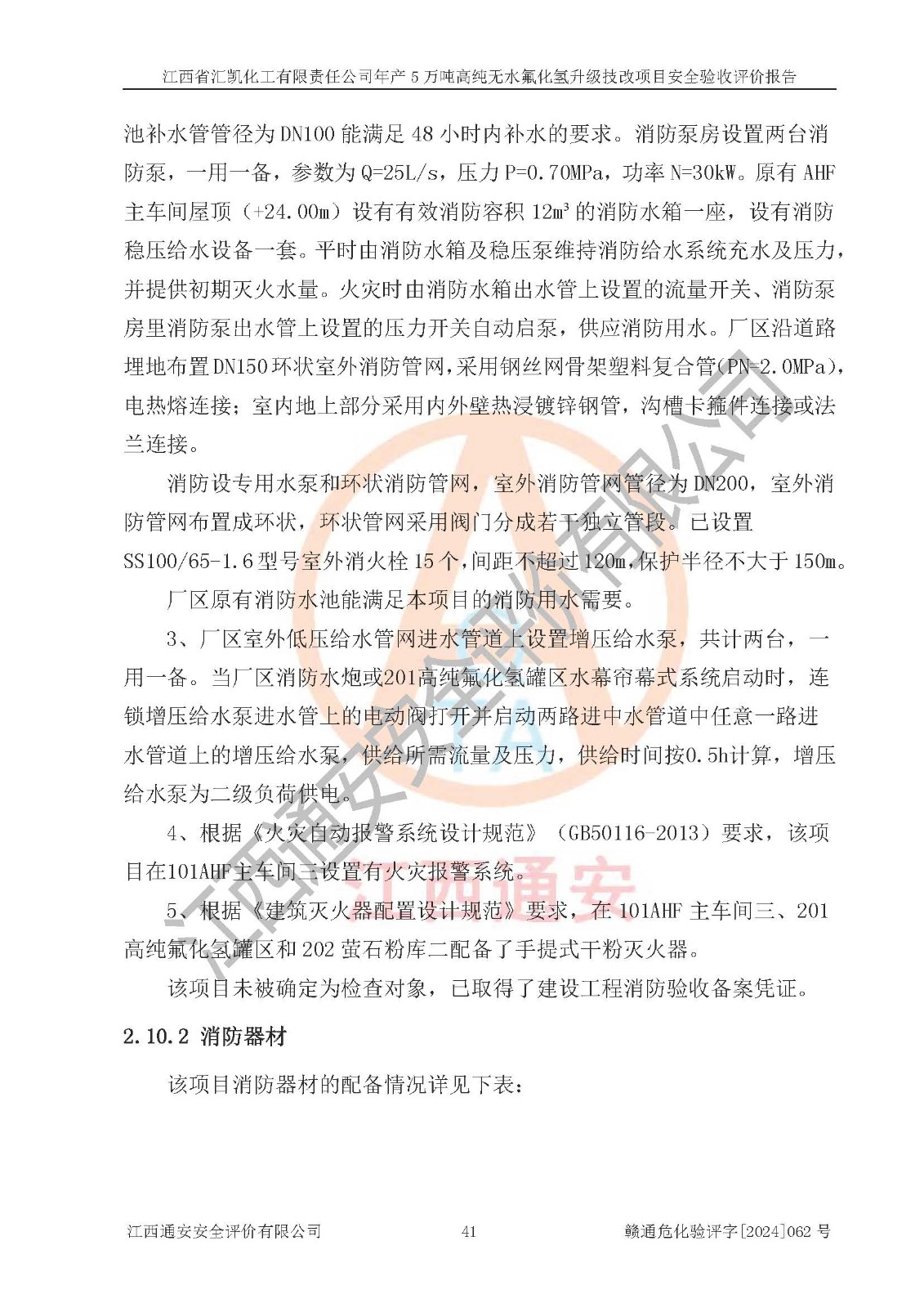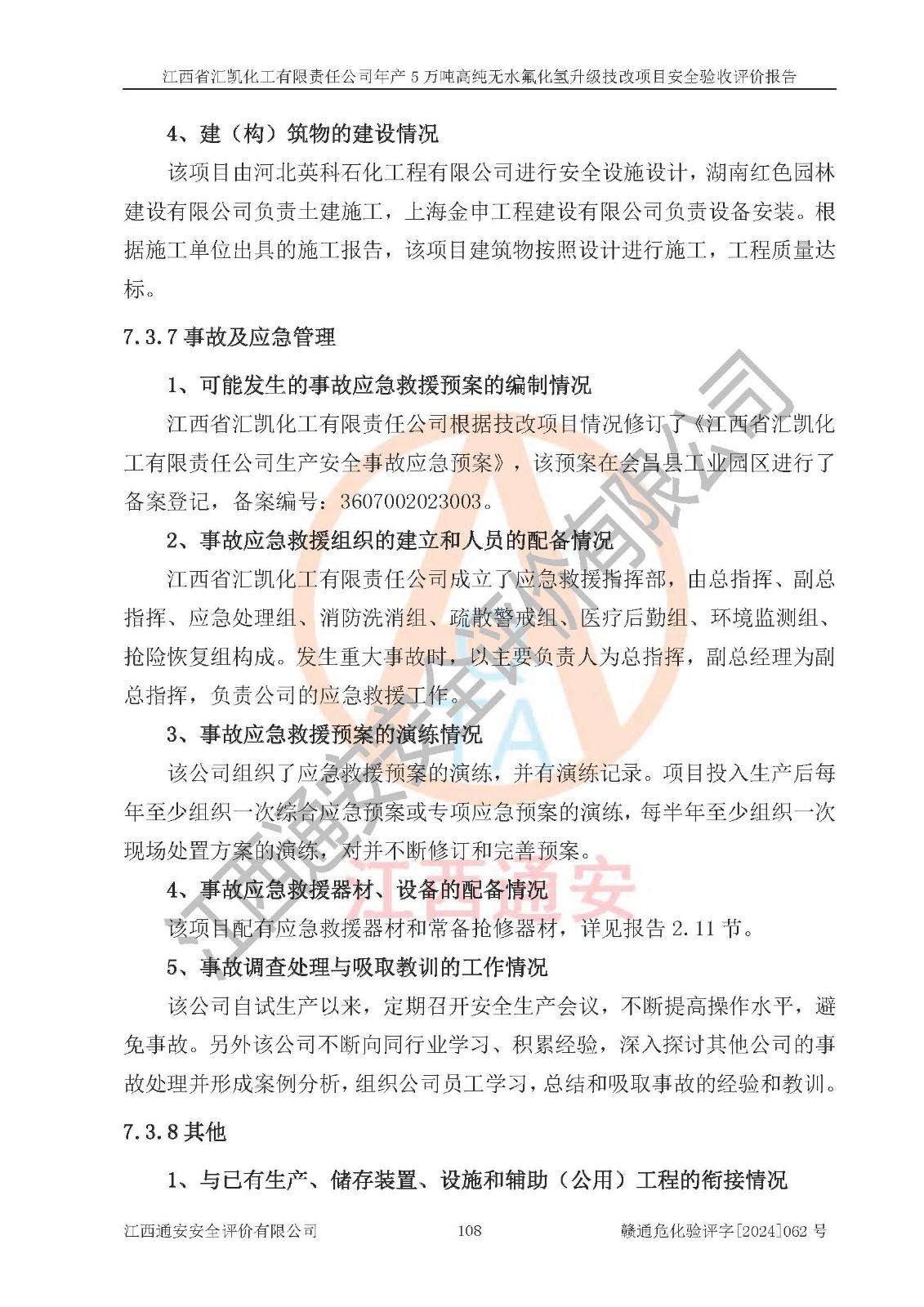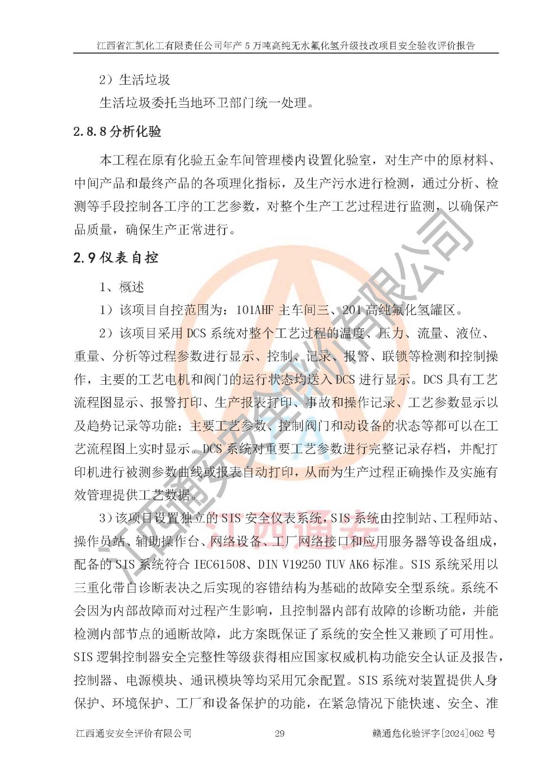 評價結(jié)論 | 江西省匯凱化工有限責(zé)任公司年產(chǎn)5萬噸高純無水氟化氫升級技改項目現(xiàn)場情況與設(shè)計圖紙一致,DCS系統(tǒng)和SIS系統(tǒng)符合設(shè)計要求、運行正常,主要負(fù)責(zé)人、安全管理人員等有關(guān)從業(yè)人員資質(zhì)符合《江西省危險化學(xué)品安全專項整治三年行動實施方案》要求,安全設(shè)施及安全管理符合**及有關(guān)部門關(guān)于安全生產(chǎn)法律、法規(guī)、標(biāo)準(zhǔn)的要求,該項目試生產(chǎn)以來,工藝設(shè)備運行正常,安全設(shè)施和采取的安全技術(shù)措施符合設(shè)計要求并達(dá)到預(yù)期結(jié)果,可以滿足建設(shè)項目安全生產(chǎn)的要求,安全生產(chǎn)管理**,具備了安全設(shè)施竣工驗收條件。 | ||||||