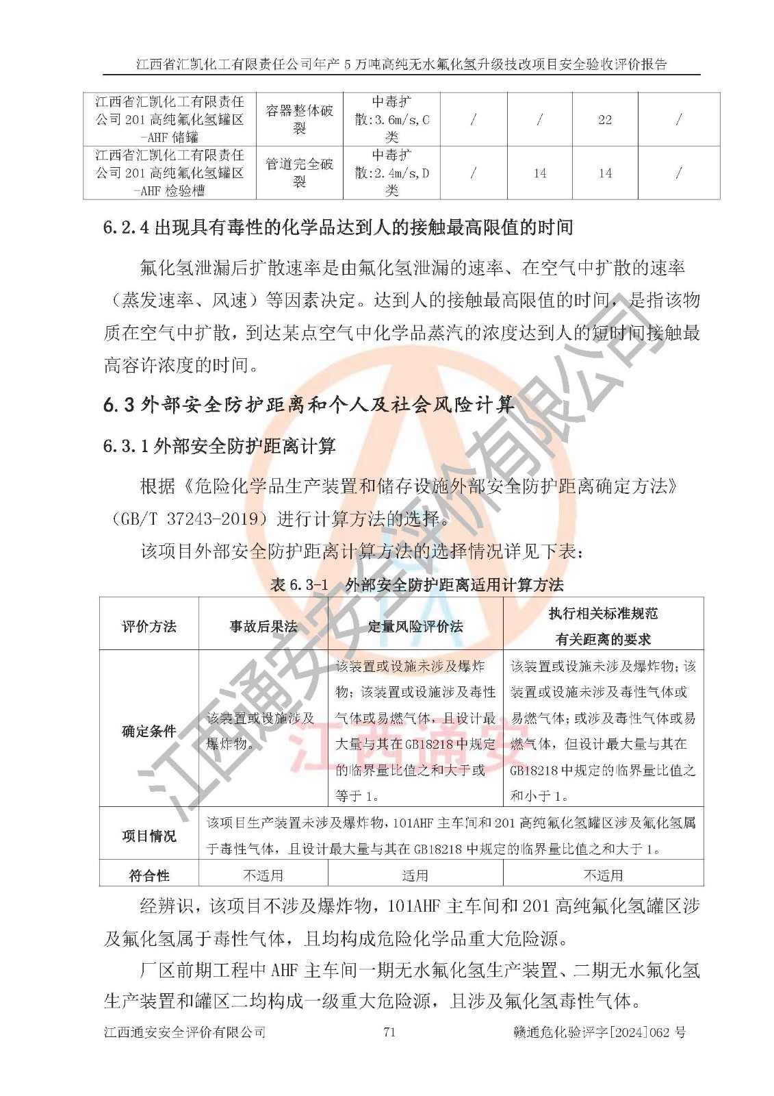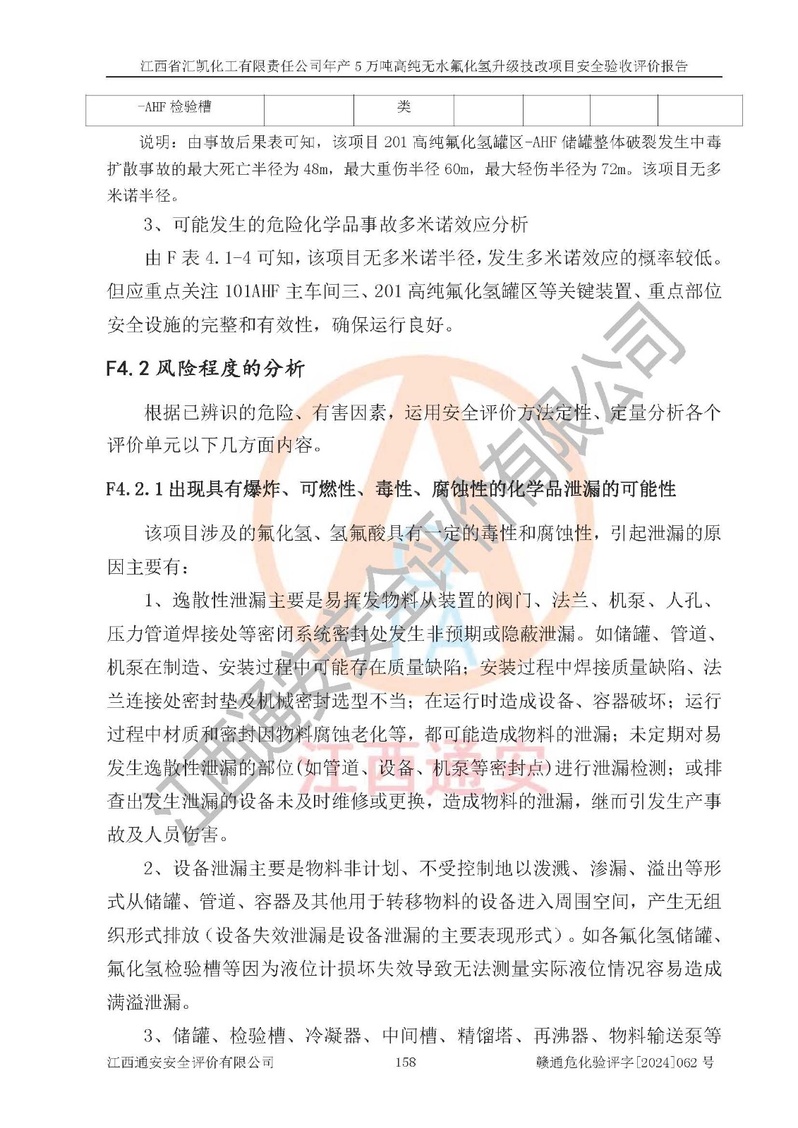 項目簡介 | 江西省匯凱化工有限責(zé)任公司(以下簡稱“匯凱化工”)成立于2017年08月08日,注冊地址位于江西省贛州市會昌縣筠門嶺鎮(zhèn)九二工業(yè)基地,法定**人為張裕生,注冊資本壹億元整,經(jīng)營范圍為危險化學(xué)品生產(chǎn)、化工產(chǎn)品銷售等。 匯凱化工公司2022年11月03日取得了《安全生產(chǎn)許可證》,許可證編號:(贛)WH安許證字[2019]1060號,許可范圍為無水氟化氫(50kt/a)、氫氟酸(1690t/a)、氟硅酸(4468t/a),**期:2022年11月25日至2025年11月24日。 2017年9月21日,會昌縣工信局同意公司在收購鷹鵬化工有限公司原有2萬噸氫氟酸生產(chǎn)線基礎(chǔ)上,建設(shè)“年產(chǎn)2萬噸無水氟化氫異地搬遷技改項目”,并出具《關(guān)于江西省匯凱化工有限責(zé)任公司年產(chǎn)2萬噸無水氟化氫異地搬遷技改項目備案的批復(fù)》(會工信投資字[2017]3號),項目已于2019年9月通過了竣工驗收;2019年依據(jù)工業(yè)和信息化部公告《氟化氫行業(yè)準(zhǔn)入條件》(2011年第6號)規(guī)定“為滿足節(jié)能、**以及安全生產(chǎn)要求,提高氟資源利用率,實現(xiàn)合理的規(guī)模經(jīng)濟(jì),新建生產(chǎn)企業(yè)的氟化氫總規(guī)模不得低于5萬噸/年”;為滿足《氟化氫行業(yè)準(zhǔn)入條件》及企業(yè)未來發(fā)展需要,公司在現(xiàn)有生產(chǎn)線的基礎(chǔ)上進(jìn)行技改,二期于2019年10月建設(shè)年產(chǎn)3萬噸無水氟化氫,2021年9月已竣工驗收,達(dá)到5萬噸/年無水氟化氫的生產(chǎn)規(guī)模,滿足行業(yè)準(zhǔn)入的規(guī)模要求。 匯凱化工公司為了進(jìn)一步提升競爭力,現(xiàn)對原有年產(chǎn)5萬噸無水氟化氫項目進(jìn)行技改,將原產(chǎn)品進(jìn)一步純化,達(dá)到高純無水氟化氫。匯凱化工公司已取得了年產(chǎn)5萬噸高純無水氟化氫升級技改項目備案通知書。 匯凱化工公司委托江西偉燦工程技術(shù)咨詢有限責(zé)任公司編制了年產(chǎn)5萬噸高純無水氟化氫升級技改項目安全預(yù)評價報告,并于2022年4月18日取得了贛州市行政審批局《關(guān)于江西省匯凱化工有限責(zé)任公司年產(chǎn)5萬噸高純無水氟化氫升級技改項目安全條件審查的批復(fù)》{贛市行審證(3)字[2022]131號},委托河北英科石化工程有限公司編制了年產(chǎn)5萬噸高純無水氟化氫升級技改項目安全設(shè)施設(shè)計,并于2022年7月4日取得了贛州市行政審批局《關(guān)于江西省匯凱化工有限責(zé)任公司年產(chǎn)5萬噸高純無水氟化氫升級技改項目安全設(shè)施設(shè)計審查的批復(fù)》{贛市行審證(3)字[2022]253號}。因生產(chǎn)經(jīng)營需要,匯凱化工公司編制了年產(chǎn)5萬噸高純無水氟化氫升級技改項目試生產(chǎn)方案,2024年1月5日組織專家對試生產(chǎn)方案及現(xiàn)場進(jìn)行了評審,經(jīng)整改后取得了會昌縣應(yīng)急管理局出具的試生產(chǎn)方案備案回執(zhí),試生產(chǎn)期限為2024年5月31日至2025年5月30日,目前試生產(chǎn)目標(biāo)任務(wù)基本達(dá)成,擬進(jìn)行項目的安全設(shè)施驗收工作。 江西省匯凱化工有限責(zé)任公司年產(chǎn)5萬噸高純無水氟化氫升級技改項目(以下簡稱“該項目”)主要建設(shè)內(nèi)容為101AHF主車間三高純氟化氫生產(chǎn)線設(shè)備、201高純氟化氫罐區(qū)、201-1裝卸區(qū)、202螢石粉庫二、401中心控制室,生產(chǎn)工藝為通過精餾提純除去原產(chǎn)品氟化氫內(nèi)的鐵、硫酸鹽等雜質(zhì),得到高純無水氟化氫產(chǎn)品(99.999%)。 該項目生產(chǎn)過程中涉及的物料為氟化氫、液堿(氫氧化鈉)和氫氟酸,氟化氫、氫氧化鈉和氫氟酸屬于危險化學(xué)品。經(jīng)辨識,該項目涉及的氟化氫和氫氟酸屬于重點監(jiān)管的危險化學(xué)品和高毒物品,不涉及監(jiān)控化學(xué)品、易制毒化學(xué)品、易制爆危險化學(xué)品、劇毒化學(xué)品和特別管控危險化學(xué)品,不涉及重點監(jiān)管的危險化工工藝。101AHF主車間三內(nèi)精餾生產(chǎn)單元、201高純氟化氫罐區(qū)內(nèi)高純氟化氫存儲單元分別構(gòu)成危險化學(xué)品一級重大危險源。根據(jù)生產(chǎn)工藝特點及物料的理化特性可知,該項目生產(chǎn)過程中主要存在火災(zāi)與爆炸、中毒與窒息、灼燙、觸電、機(jī)械傷害等危險因素。 | ||||||