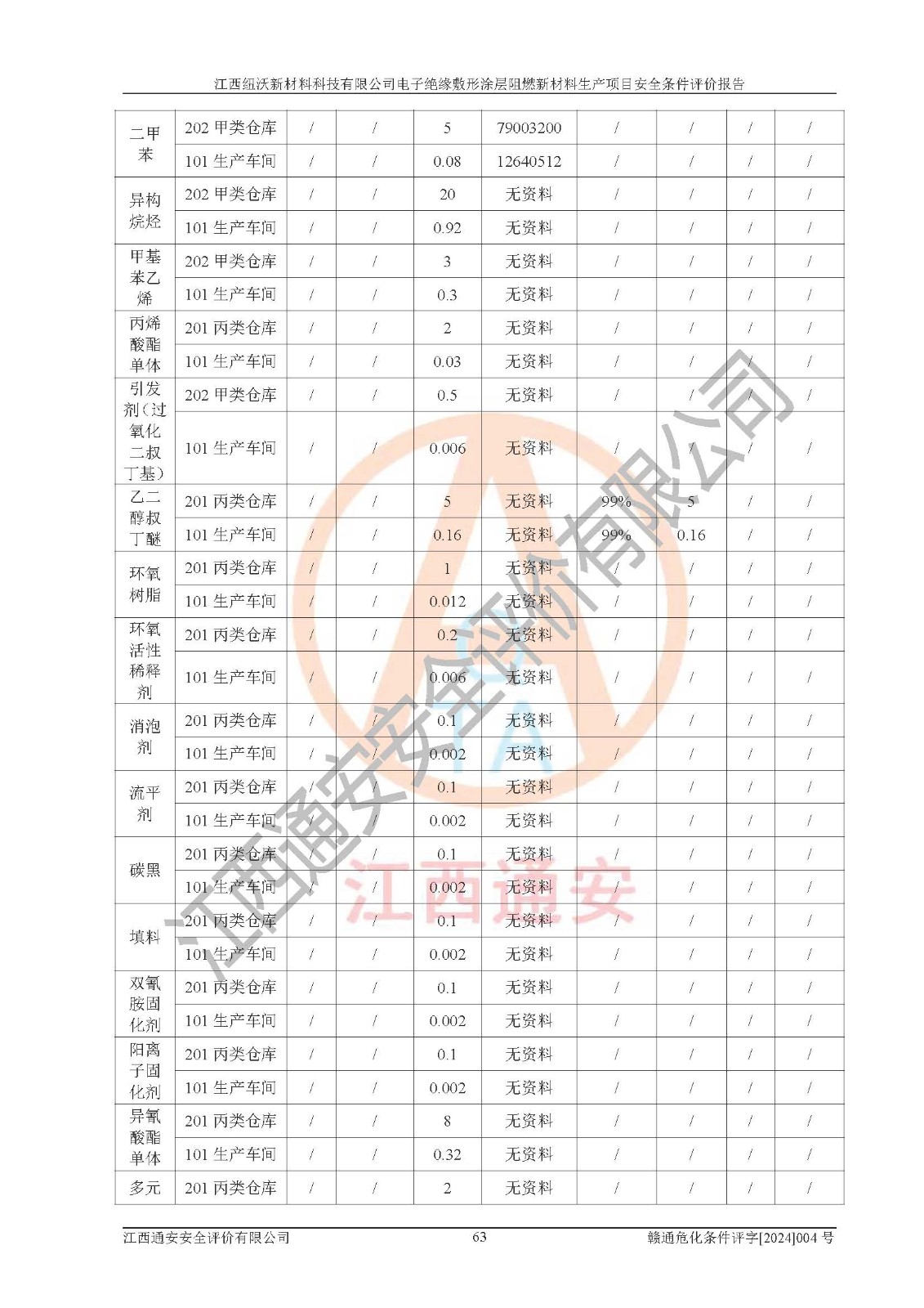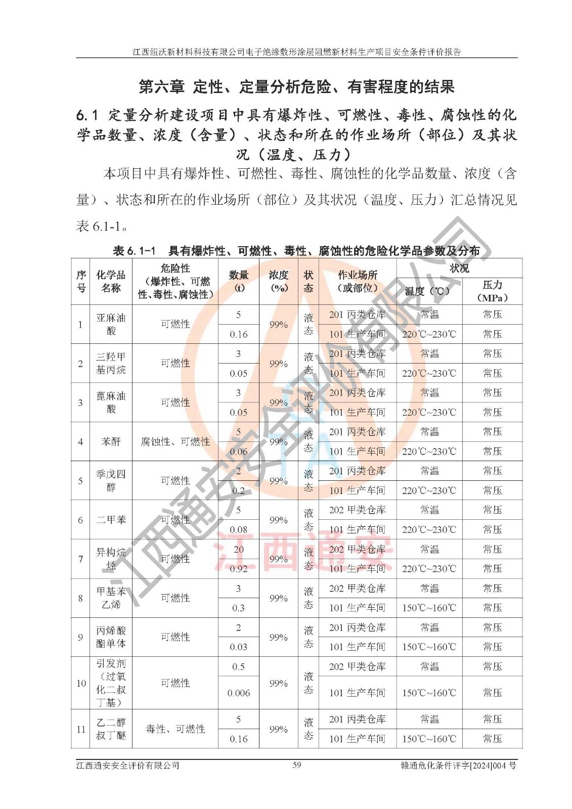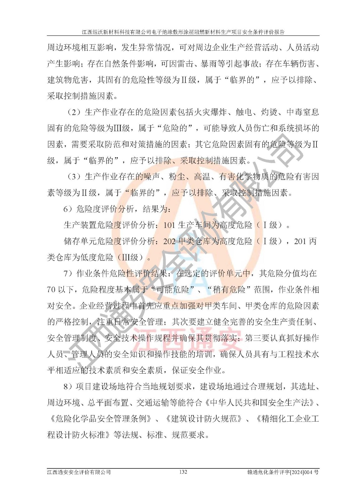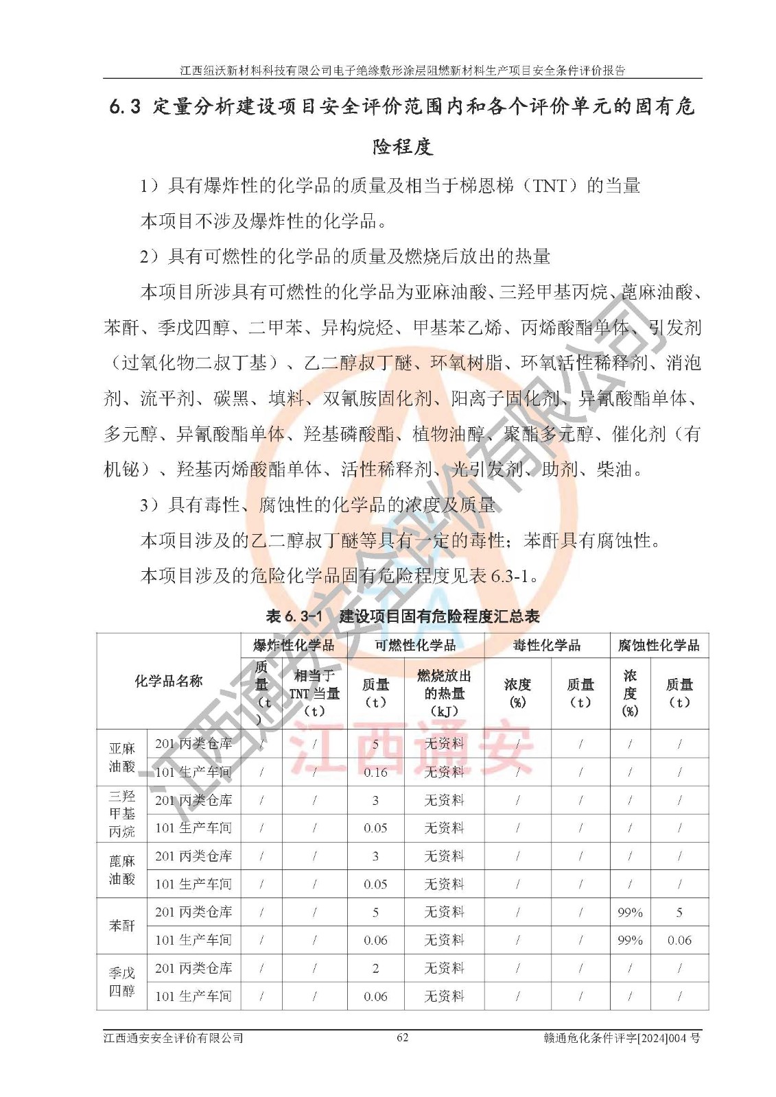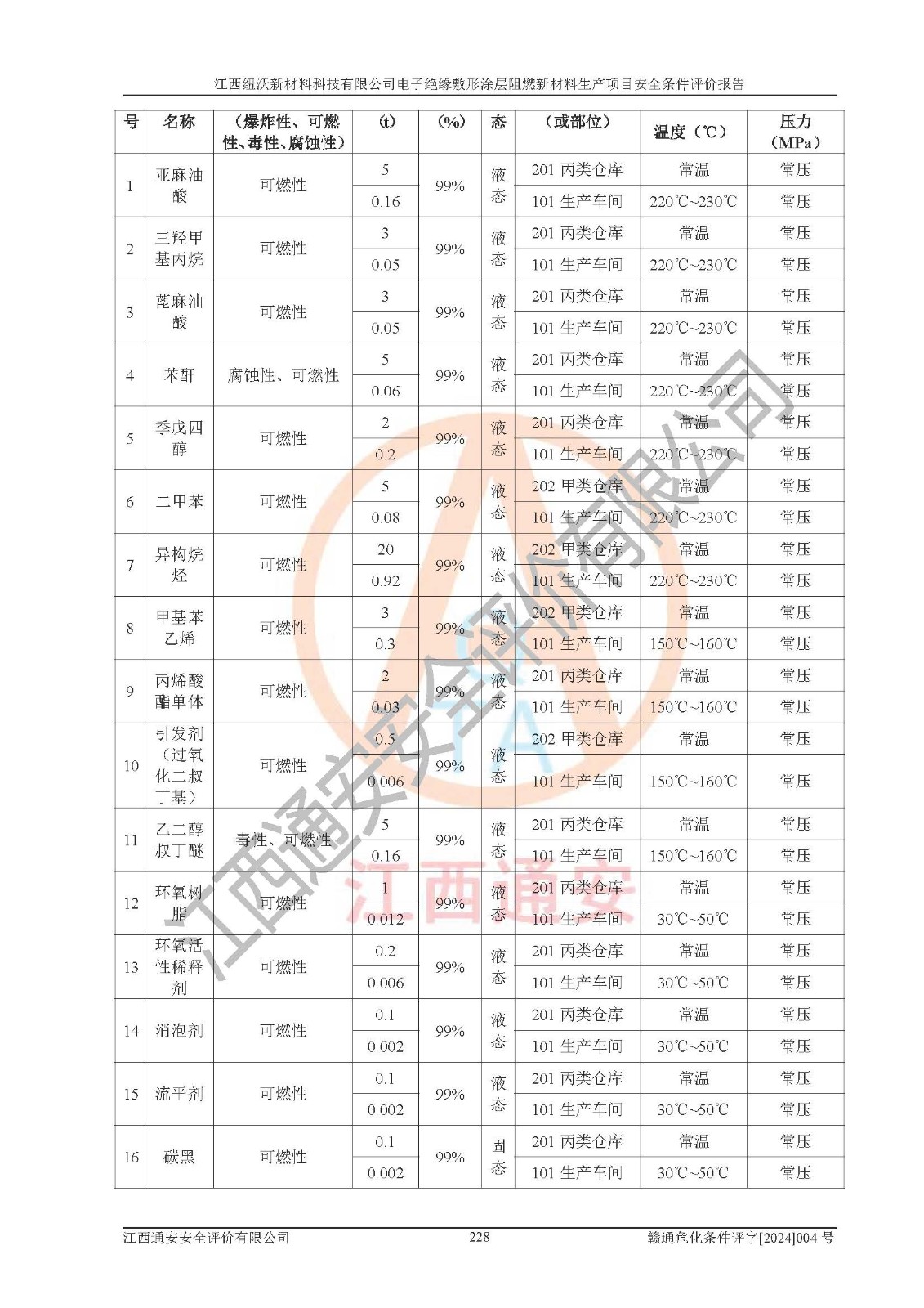 1)本項(xiàng)目依法取得了《江西省企業(yè)投資項(xiàng)目備案通知書》、《建設(shè)用地規(guī)劃許可證》,符合地方產(chǎn)業(yè)發(fā)展規(guī)劃的要求。 2)根據(jù)《**安全監(jiān)管總局關(guān)于公布首批重點(diǎn)監(jiān)管的危險(xiǎn)化工工藝目錄的通知》(安監(jiān)總管三[2009]116號)和《**安全監(jiān)管總局關(guān)于公布第二批重點(diǎn)監(jiān)管危險(xiǎn)化工工藝目錄和調(diào)整首批重點(diǎn)監(jiān)管危險(xiǎn)化工工藝中部分典型工藝的通知》(安監(jiān)總管三[2013]3號),該項(xiàng)目未涉及重點(diǎn)監(jiān)管危險(xiǎn)化工工藝。 3)根據(jù)《危險(xiǎn)化學(xué)品重大危險(xiǎn)源辨識》(GB18218-2018),該項(xiàng)目未構(gòu)成危險(xiǎn)化學(xué)品重大危險(xiǎn)源。 4)項(xiàng)目存在的主要危險(xiǎn)因素有:火災(zāi)爆炸、容器爆炸、中毒窒息、灼燙、觸電、**傷害、機(jī)械傷害、高處墜落、物體打擊、淹溺等,存在的主要危害因素有:噪聲與振動、高溫、有害化學(xué)物質(zhì)等;引起事故的原因有人的不安全行為、物的不安全狀態(tài)、管理缺陷和環(huán)境不良。其中*主要的危險(xiǎn)有害因素是火災(zāi)爆炸。 5)采用預(yù)先危險(xiǎn)性分析法評價(jià),結(jié)果為: (1)通過預(yù)先危險(xiǎn)(PHA)分析可知,項(xiàng)目廠址及總體布局單元存在周邊環(huán)境相互影響,發(fā)生異常情況,可對周邊企業(yè)生產(chǎn)經(jīng)營活動、人員活動產(chǎn)生影響;存在自然條件影響,可因雷擊、暴雨等引起事故;存在**傷害、建筑物危害,其固有的危險(xiǎn)性等級為Ⅱ級,屬于“臨界的”,應(yīng)予以排除、采取控制措施因素。 (2)生產(chǎn)作業(yè)存在的危險(xiǎn)因素包括火災(zāi)爆炸、觸電、灼燙、中毒窒息固有的危險(xiǎn)等級為Ⅲ級,屬于“危險(xiǎn)的”,可能導(dǎo)致人員傷亡和系統(tǒng)損壞的因素,需要采取防范和對策措施的因素;其它危險(xiǎn)因素固有的危險(xiǎn)等級為Ⅱ級,屬于“臨界的”,應(yīng)予以排除、采取控制措施因素。 (3)生產(chǎn)作業(yè)存在的噪聲、粉塵、高溫、有害化學(xué)物質(zhì)的危險(xiǎn)有害因素等級為Ⅱ級,屬于“臨界的”,應(yīng)予以排除、采取控制措施因素。 6)危險(xiǎn)度評價(jià)分析,結(jié)果為: 生產(chǎn)裝置危險(xiǎn)度評價(jià)分析:101生產(chǎn)車間為**危險(xiǎn)(Ⅰ級)。 儲存單元危險(xiǎn)度評價(jià)分析:202甲類倉庫為**危險(xiǎn)(Ⅰ級),201丙類倉庫為低度危險(xiǎn)(Ⅲ級)。 7)作業(yè)條件危險(xiǎn)性評價(jià)結(jié)果:在選定的評價(jià)單元中,其危險(xiǎn)分值均在70以下,危險(xiǎn)程度基本屬于“可能危險(xiǎn)”、“稍有危險(xiǎn)”范圍,作業(yè)條件相對安全。企業(yè)經(jīng)營過程中首先應(yīng)重點(diǎn)加強(qiáng)對甲類車間、甲類倉庫的危險(xiǎn)因素的嚴(yán)格控制,注重日常安全管理;其次要建立健全完善的安全生產(chǎn)責(zé)任制、安全管理制度、安全技術(shù)操作規(guī)程并**其貫徹落實(shí);第三要認(rèn)真抓好操作人員、管理人員的安全知識和操作技能的培訓(xùn),**人員具有與工程技術(shù)水平相適應(yīng)的技術(shù)素質(zhì)和安全素質(zhì),**安全作業(yè)。 8)項(xiàng)目建設(shè)場地符合當(dāng)?shù)匾?guī)劃要求,建設(shè)場地通過合理規(guī)劃,其選址、周邊環(huán)境、總平面布置、交通運(yùn)輸?shù)饶芊稀吨腥A人民共和國安全生產(chǎn)法》、《危險(xiǎn)化學(xué)品安全管理?xiàng)l例》、《建筑設(shè)計(jì)防火規(guī)范》、《精細(xì)化工企業(yè)工程設(shè)計(jì)防火標(biāo)準(zhǔn)》等法規(guī)、標(biāo)準(zhǔn)、規(guī)范要求。 廠址地區(qū)地震活動相對較弱,災(zāi)害性天氣出現(xiàn)頻率稍高,自然災(zāi)害對項(xiàng)目建設(shè)具有**影響,通過采取相應(yīng)的防護(hù)措施,自然條件適宜建設(shè)。 9)建設(shè)項(xiàng)目符合**產(chǎn)業(yè)政策的要求;選擇工藝為現(xiàn)行成熟工藝,其安全可靠性可得到**。 10)本報(bào)告已根據(jù)有關(guān)安全生產(chǎn)法律、法規(guī)、規(guī)章和**標(biāo)準(zhǔn)、行業(yè)標(biāo)準(zhǔn),并嚴(yán)格執(zhí)行省委辦公廳省**辦公廳《關(guān)于全面加強(qiáng)危險(xiǎn)化學(xué)品安全生產(chǎn)工作的實(shí)施意見》(贛辦發(fā)[2020]32號)及鄱陽湖生態(tài)經(jīng)濟(jì)區(qū)、長江經(jīng)濟(jì)帶、“五河一湖”相關(guān)政策規(guī)定,客觀、公正、科學(xué)地進(jìn)行安全評價(jià),項(xiàng)目符合《江西省應(yīng)急管理廳關(guān)于印發(fā)《江西省危險(xiǎn)化學(xué)品建設(shè)項(xiàng)目安全監(jiān)督管理實(shí)施細(xì)則》(試行)的通知》(贛應(yīng)急字[2021]100號)的要求。 11)本報(bào)告結(jié)合工藝特征,提出應(yīng)采取的對應(yīng)的自動化控制系統(tǒng)及自動化實(shí)施方案,滿足《江西省應(yīng)急管理廳關(guān)于印發(fā)《江西省化工企業(yè)自動化提升實(shí)施方案》(試行)的通知》(贛應(yīng)急字[2021]190號)的要求。 綜上所述:江西紐沃新材料科技有限公司電子*緣敷形涂層阻燃新材料生產(chǎn)項(xiàng)目的產(chǎn)業(yè)政策、安全條件、廠址、總體布局、主要技術(shù)和工藝、裝置、設(shè)施、配套和輔助工程、安全管理等均滿足安全生產(chǎn)相關(guān)法
