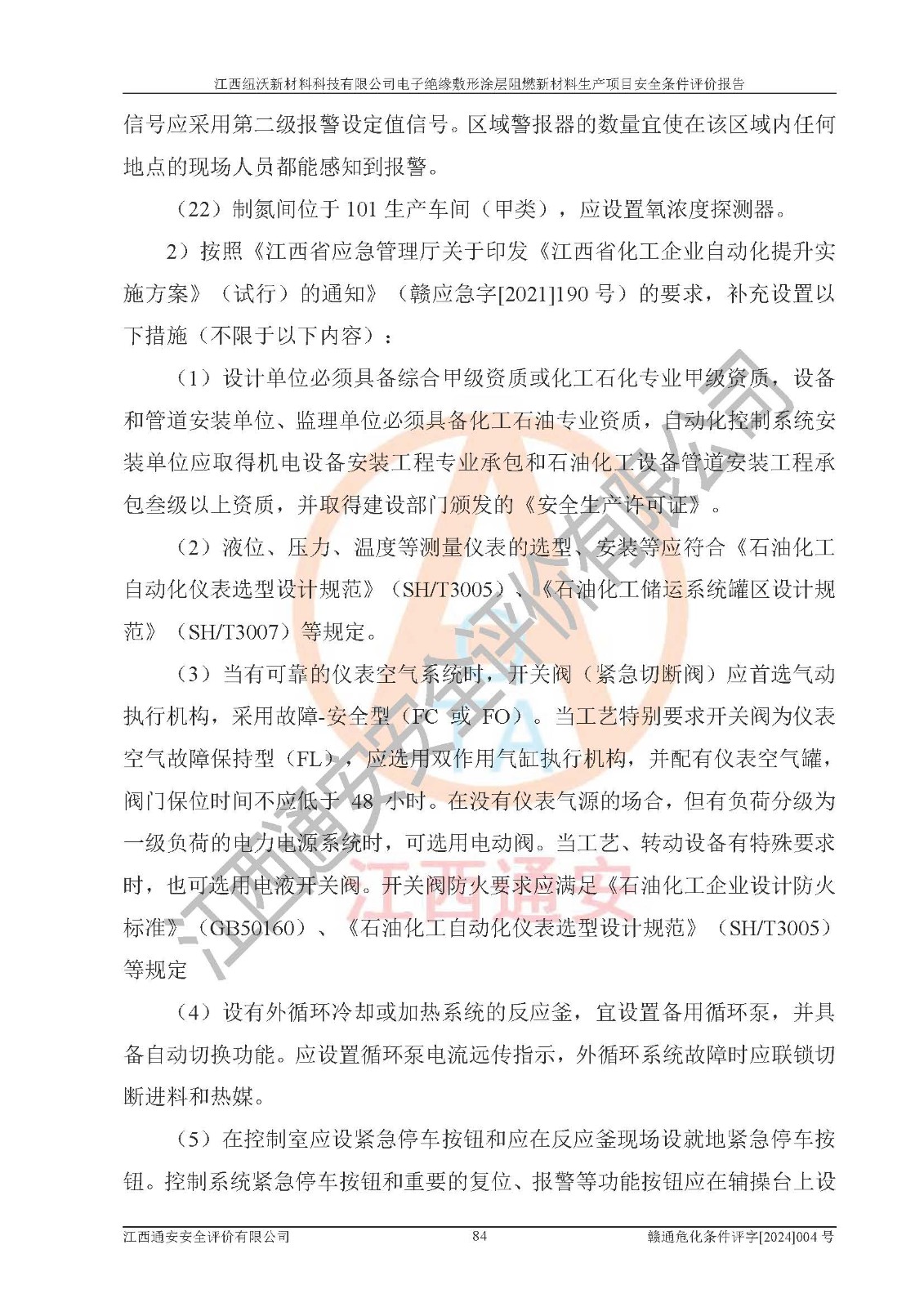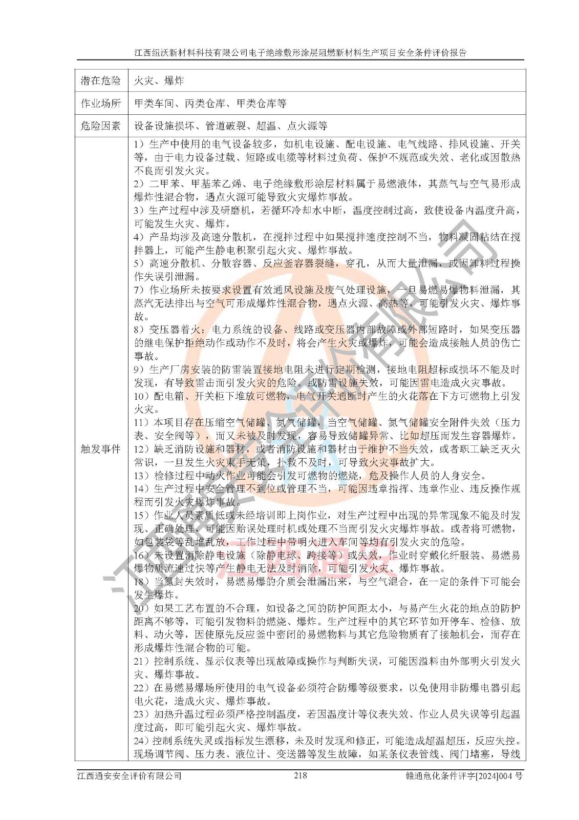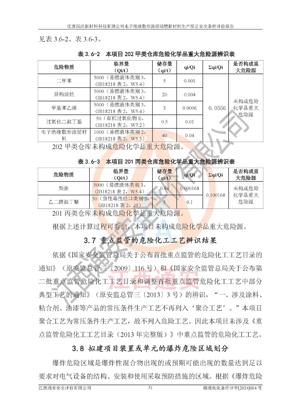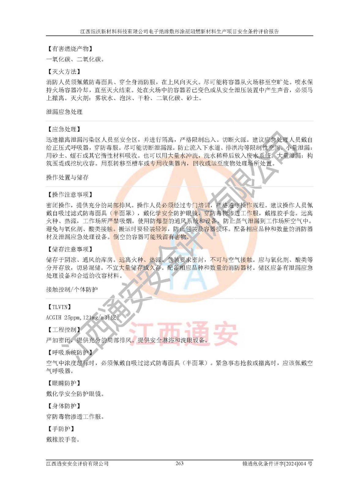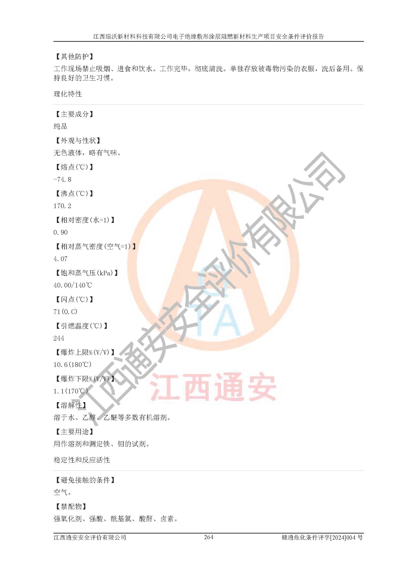 1)本項(xiàng)目依法取得了《江西省企業(yè)投資項(xiàng)目備案通知書》、《建設(shè)用地規(guī)劃許可證》,符合地方產(chǎn)業(yè)發(fā)展規(guī)劃的要求。 2)根據(jù)《**安全監(jiān)管總局關(guān)于公布首批重點(diǎn)監(jiān)管的危險(xiǎn)化工工藝目錄的通知》(安監(jiān)總管三[2009]116號)和《**安全監(jiān)管總局關(guān)于公布第二批重點(diǎn)監(jiān)管危險(xiǎn)化工工藝目錄和調(diào)整首批重點(diǎn)監(jiān)管危險(xiǎn)化工工藝中部分典型工藝的通知》(安監(jiān)總管三[2013]3號),該項(xiàng)目未涉及重點(diǎn)監(jiān)管危險(xiǎn)化工工藝。 3)根據(jù)《危險(xiǎn)化學(xué)品重大危險(xiǎn)源辨識》(GB18218-2018),該項(xiàng)目未構(gòu)成危險(xiǎn)化學(xué)品重大危險(xiǎn)源。 4)項(xiàng)目存在的主要危險(xiǎn)因素有:火災(zāi)爆炸、容器爆炸、中毒窒息、灼燙、觸電、**傷害、機(jī)械傷害、高處墜落、物體打擊、淹溺等,存在的主要危害因素有:噪聲與振動、高溫、有害化學(xué)物質(zhì)等;引起事故的原因有人的不安全行為、物的不安全狀態(tài)、管理缺陷和環(huán)境不良。其中*主要的危險(xiǎn)有害因素是火災(zāi)爆炸。 5)采用預(yù)先危險(xiǎn)性分析法評價(jià),結(jié)果為: (1)通過預(yù)先危險(xiǎn)(PHA)分析可知,項(xiàng)目廠址及總體布局單元存在周邊環(huán)境相互影響,發(fā)生異常情況,可對周邊企業(yè)生產(chǎn)經(jīng)營活動、人員活動產(chǎn)生影響;存在自然條件影響,可因雷擊、暴雨等引起事故;存在**傷害、建筑物危害,其固有的危險(xiǎn)性等級為Ⅱ級,屬于“臨界的”,應(yīng)予以排除、采取控制措施因素。 (2)生產(chǎn)作業(yè)存在的危險(xiǎn)因素包括火災(zāi)爆炸、觸電、灼燙、中毒窒息固有的危險(xiǎn)等級為Ⅲ級,屬于“危險(xiǎn)的”,可能導(dǎo)致人員傷亡和系統(tǒng)損壞的因素,需要采取防范和對策措施的因素;其它危險(xiǎn)因素固有的危險(xiǎn)等級為Ⅱ級,屬于“臨界的”,應(yīng)予以排除、采取控制措施因素。 (3)生產(chǎn)作業(yè)存在的噪聲、粉塵、高溫、有害化學(xué)物質(zhì)的危險(xiǎn)有害因素等級為Ⅱ級,屬于“臨界的”,應(yīng)予以排除、采取控制措施因素。 6)危險(xiǎn)度評價(jià)分析,結(jié)果為: 生產(chǎn)裝置危險(xiǎn)度評價(jià)分析:101生產(chǎn)車間為**危險(xiǎn)(Ⅰ級)。 儲存單元危險(xiǎn)度評價(jià)分析:202甲類倉庫為**危險(xiǎn)(Ⅰ級),201丙類倉庫為低度危險(xiǎn)(Ⅲ級)。 7)作業(yè)條件危險(xiǎn)性評價(jià)結(jié)果:在選定的評價(jià)單元中,其危險(xiǎn)分值均在70以下,危險(xiǎn)程度基本屬于“可能危險(xiǎn)”、“稍有危險(xiǎn)”范圍,作業(yè)條件相對安全。企業(yè)經(jīng)營過程中首先應(yīng)重點(diǎn)加強(qiáng)對甲類車間、甲類倉庫的危險(xiǎn)因素的嚴(yán)格控制,注重日常安全管理;其次要建立健全完善的安全生產(chǎn)責(zé)任制、安全管理制度、安全技術(shù)操作規(guī)程并**其貫徹落實(shí);第三要認(rèn)真抓好操作人員、管理人員的安全知識和操作技能的培訓(xùn),**人員具有與工程技術(shù)水平相適應(yīng)的技術(shù)素質(zhì)和安全素質(zhì),**安全作業(yè)。 8)項(xiàng)目建設(shè)場地符合當(dāng)?shù)匾?guī)劃要求,建設(shè)場地通過合理規(guī)劃,其選址、周邊環(huán)境、總平面布置、交通運(yùn)輸?shù)饶芊稀吨腥A人民共和國安全生產(chǎn)法》、《危險(xiǎn)化學(xué)品安全管理?xiàng)l例》、《建筑設(shè)計(jì)防火規(guī)范》、《精細(xì)化工企業(yè)工程設(shè)計(jì)防火標(biāo)準(zhǔn)》等法規(guī)、標(biāo)準(zhǔn)、規(guī)范要求。 廠址地區(qū)地震活動相對較弱,災(zāi)害性天氣出現(xiàn)頻率稍高,自然災(zāi)害對項(xiàng)目建設(shè)具有**影響,通過采取相應(yīng)的防護(hù)措施,自然條件適宜建設(shè)。 9)建設(shè)項(xiàng)目符合**產(chǎn)業(yè)政策的要求;選擇工藝為現(xiàn)行成熟工藝,其安全可靠性可得到**。 10)本報(bào)告已根據(jù)有關(guān)安全生產(chǎn)法律、法規(guī)、規(guī)章和**標(biāo)準(zhǔn)、行業(yè)標(biāo)準(zhǔn),并嚴(yán)格執(zhí)行省委辦公廳省**辦公廳《關(guān)于全面加強(qiáng)危險(xiǎn)化學(xué)品安全生產(chǎn)工作的實(shí)施意見》(贛辦發(fā)[2020]32號)及鄱陽湖生態(tài)經(jīng)濟(jì)區(qū)、長江經(jīng)濟(jì)帶、“五河一湖”相關(guān)政策規(guī)定,客觀、公正、科學(xué)地進(jìn)行安全評價(jià),項(xiàng)目符合《江西省應(yīng)急管理廳關(guān)于印發(fā)《江西省危險(xiǎn)化學(xué)品建設(shè)項(xiàng)目安全監(jiān)督管理實(shí)施細(xì)則》(試行)的通知》(贛應(yīng)急字[2021]100號)的要求。 11)本報(bào)告結(jié)合工藝特征,提出應(yīng)采取的對應(yīng)的自動化控制系統(tǒng)及自動化實(shí)施方案,滿足《江西省應(yīng)急管理廳關(guān)于印發(fā)《江西省化工企業(yè)自動化提升實(shí)施方案》(試行)的通知》(贛應(yīng)急字[2021]190號)的要求。 綜上所述:江西紐沃新材料科技有限公司電子*緣敷形涂層阻燃新材料生產(chǎn)項(xiàng)目的產(chǎn)業(yè)政策、安全條件、廠址、總體布局、主要技術(shù)和工藝、裝置、設(shè)施、配套和輔助工程、安全管理等均滿足安全生產(chǎn)相關(guān)法