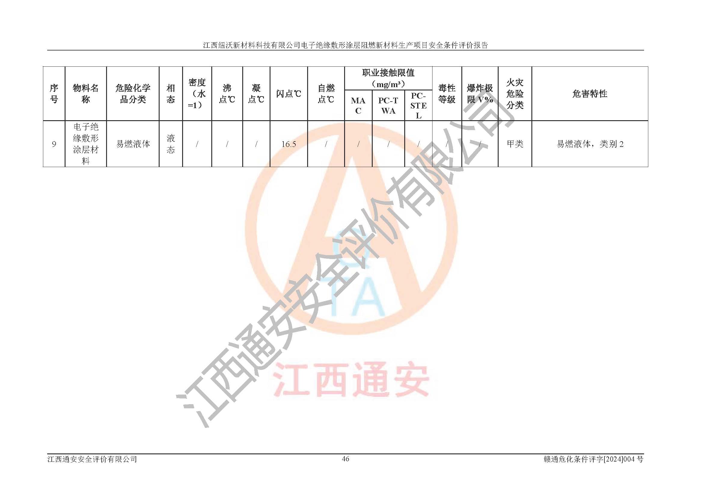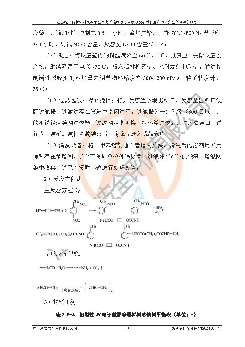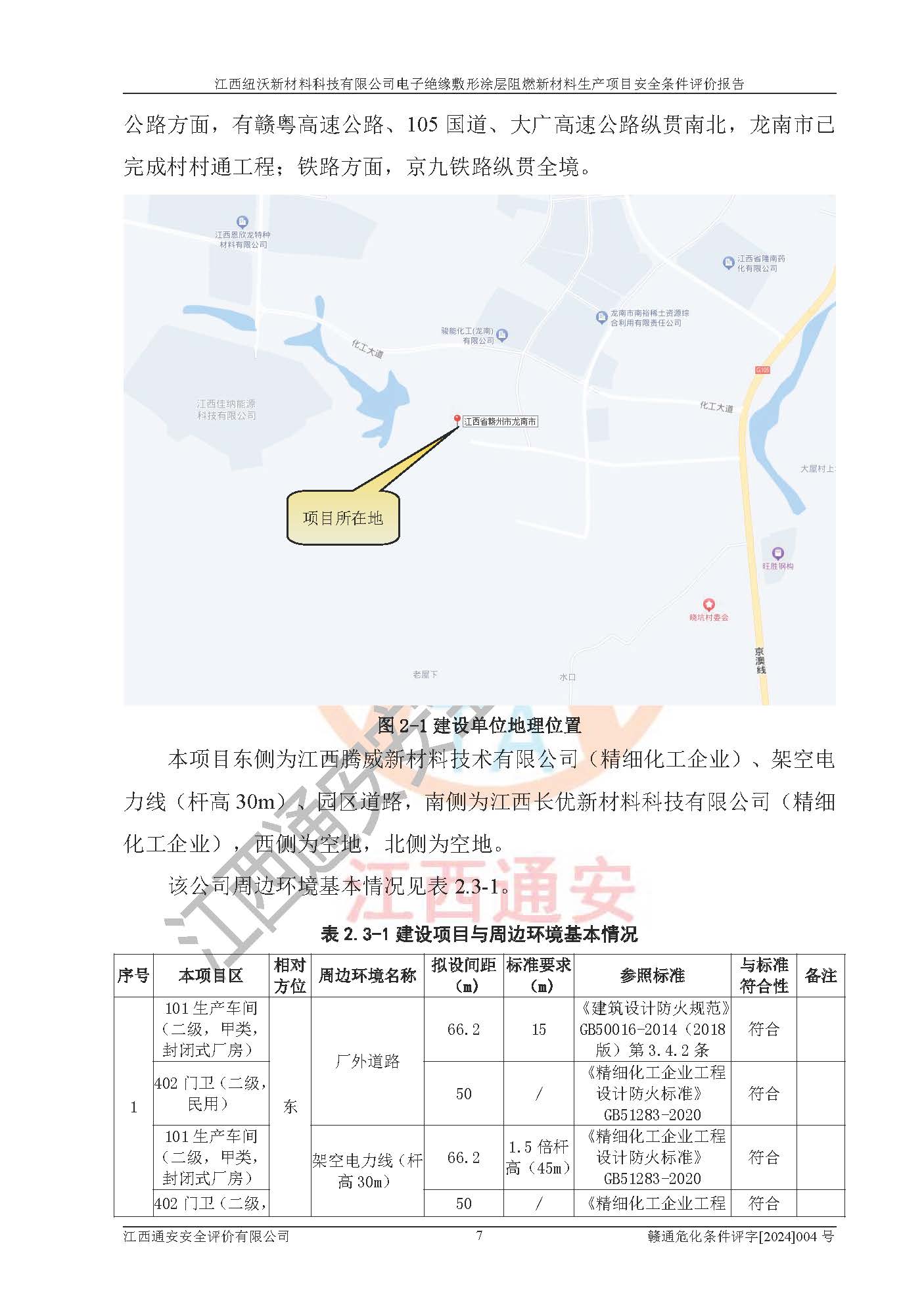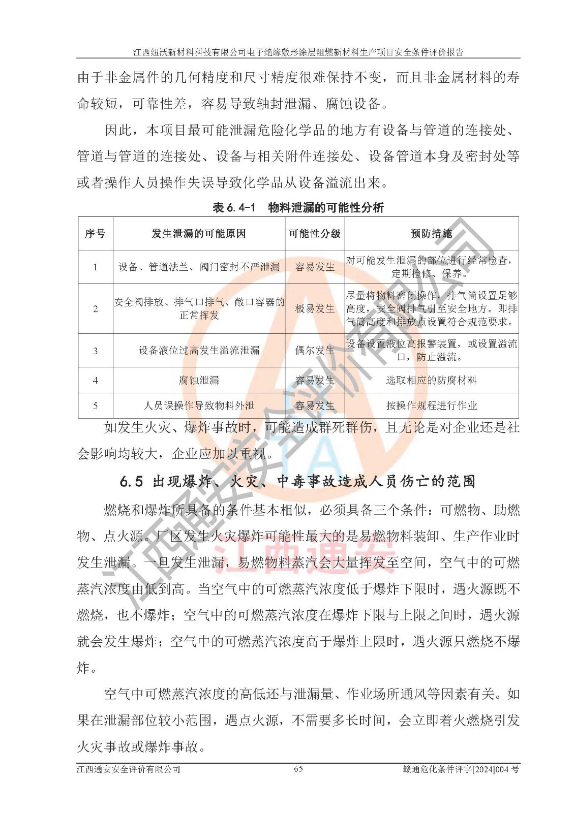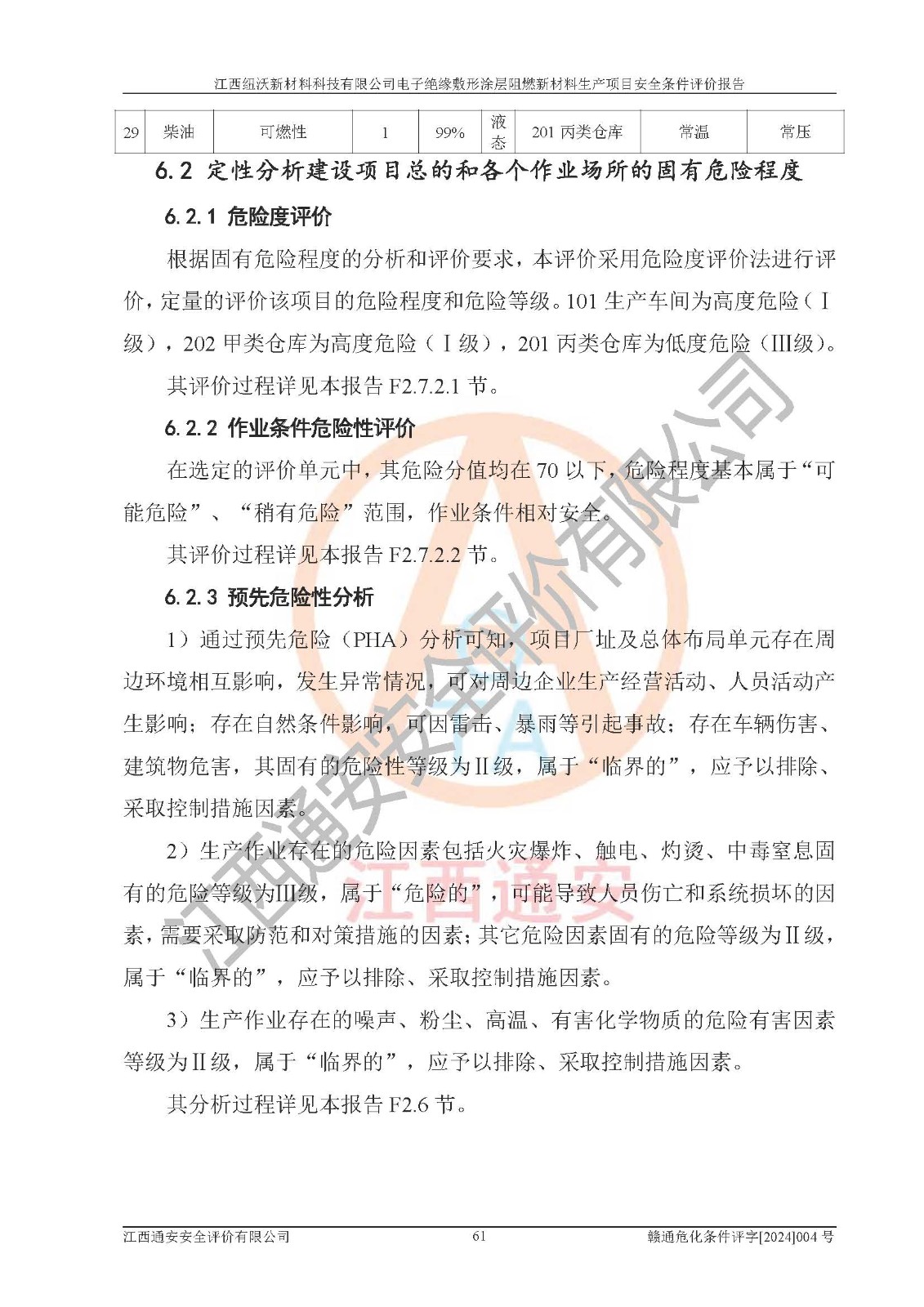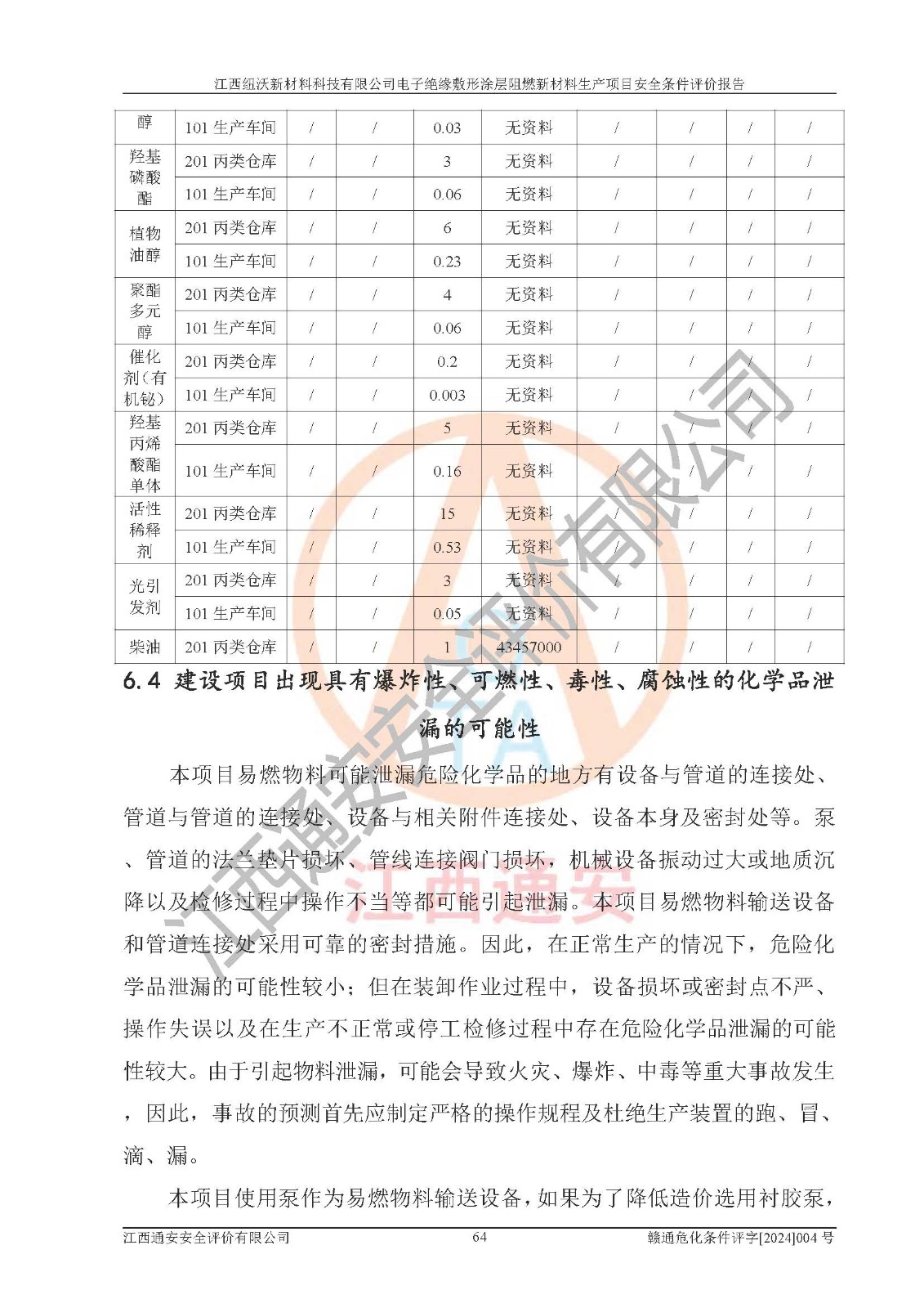 1)本項(xiàng)目依法取得了《江西省企業(yè)投資項(xiàng)目備案通知書》、《建設(shè)用地規(guī)劃許可證》,符合地方產(chǎn)業(yè)發(fā)展規(guī)劃的要求。 2)根據(jù)《**安全監(jiān)管總局關(guān)于公布首批重點(diǎn)監(jiān)管的危險(xiǎn)化工工藝目錄的通知》(安監(jiān)總管三[2009]116號)和《**安全監(jiān)管總局關(guān)于公布第二批重點(diǎn)監(jiān)管危險(xiǎn)化工工藝目錄和調(diào)整首批重點(diǎn)監(jiān)管危險(xiǎn)化工工藝中部分典型工藝的通知》(安監(jiān)總管三[2013]3號),該項(xiàng)目未涉及重點(diǎn)監(jiān)管危險(xiǎn)化工工藝。 3)根據(jù)《危險(xiǎn)化學(xué)品重大危險(xiǎn)源辨識》(GB18218-2018),該項(xiàng)目未構(gòu)成危險(xiǎn)化學(xué)品重大危險(xiǎn)源。 4)項(xiàng)目存在的主要危險(xiǎn)因素有:火災(zāi)爆炸、容器爆炸、中毒窒息、灼燙、觸電、**傷害、機(jī)械傷害、高處墜落、物體打擊、淹溺等,存在的主要危害因素有:噪聲與振動、高溫、有害化學(xué)物質(zhì)等;引起事故的原因有人的不安全行為、物的不安全狀態(tài)、管理缺陷和環(huán)境不良。其中*主要的危險(xiǎn)有害因素是火災(zāi)爆炸。 5)采用預(yù)先危險(xiǎn)性分析法評價(jià),結(jié)果為: (1)通過預(yù)先危險(xiǎn)(PHA)分析可知,項(xiàng)目廠址及總體布局單元存在周邊環(huán)境相互影響,發(fā)生異常情況,可對周邊企業(yè)生產(chǎn)經(jīng)營活動、人員活動產(chǎn)生影響;存在自然條件影響,可因雷擊、暴雨等引起事故;存在**傷害、建筑物危害,其固有的危險(xiǎn)性等級為Ⅱ級,屬于“臨界的”,應(yīng)予以排除、采取控制措施因素。 (2)生產(chǎn)作業(yè)存在的危險(xiǎn)因素包括火災(zāi)爆炸、觸電、灼燙、中毒窒息固有的危險(xiǎn)等級為Ⅲ級,屬于“危險(xiǎn)的”,可能導(dǎo)致人員傷亡和系統(tǒng)損壞的因素,需要采取防范和對策措施的因素;其它危險(xiǎn)因素固有的危險(xiǎn)等級為Ⅱ級,屬于“臨界的”,應(yīng)予以排除、采取控制措施因素。 (3)生產(chǎn)作業(yè)存在的噪聲、粉塵、高溫、有害化學(xué)物質(zhì)的危險(xiǎn)有害因素等級為Ⅱ級,屬于“臨界的”,應(yīng)予以排除、采取控制措施因素。 6)危險(xiǎn)度評價(jià)分析,結(jié)果為: 生產(chǎn)裝置危險(xiǎn)度評價(jià)分析:101生產(chǎn)車間為**危險(xiǎn)(Ⅰ級)。 儲存單元危險(xiǎn)度評價(jià)分析:202甲類倉庫為**危險(xiǎn)(Ⅰ級),201丙類倉庫為低度危險(xiǎn)(Ⅲ級)。 7)作業(yè)條件危險(xiǎn)性評價(jià)結(jié)果:在選定的評價(jià)單元中,其危險(xiǎn)分值均在70以下,危險(xiǎn)程度基本屬于“可能危險(xiǎn)”、“稍有危險(xiǎn)”范圍,作業(yè)條件相對安全。企業(yè)經(jīng)營過程中首先應(yīng)重點(diǎn)加強(qiáng)對甲類車間、甲類倉庫的危險(xiǎn)因素的嚴(yán)格控制,注重日常安全管理;其次要建立健全完善的安全生產(chǎn)責(zé)任制、安全管理制度、安全技術(shù)操作規(guī)程并**其貫徹落實(shí);第三要認(rèn)真抓好操作人員、管理人員的安全知識和操作技能的培訓(xùn),**人員具有與工程技術(shù)水平相適應(yīng)的技術(shù)素質(zhì)和安全素質(zhì),**安全作業(yè)。 8)項(xiàng)目建設(shè)場地符合當(dāng)?shù)匾?guī)劃要求,建設(shè)場地通過合理規(guī)劃,其選址、周邊環(huán)境、總平面布置、交通運(yùn)輸?shù)饶芊稀吨腥A人民共和國安全生產(chǎn)法》、《危險(xiǎn)化學(xué)品安全管理?xiàng)l例》、《建筑設(shè)計(jì)防火規(guī)范》、《精細(xì)化工企業(yè)工程設(shè)計(jì)防火標(biāo)準(zhǔn)》等法規(guī)、標(biāo)準(zhǔn)、規(guī)范要求。 廠址地區(qū)地震活動相對較弱,災(zāi)害性天氣出現(xiàn)頻率稍高,自然災(zāi)害對項(xiàng)目建設(shè)具有**影響,通過采取相應(yīng)的防護(hù)措施,自然條件適宜建設(shè)。 9)建設(shè)項(xiàng)目符合**產(chǎn)業(yè)政策的要求;選擇工藝為現(xiàn)行成熟工藝,其安全可靠性可得到**。 10)本報(bào)告已根據(jù)有關(guān)安全生產(chǎn)法律、法規(guī)、規(guī)章和**標(biāo)準(zhǔn)、行業(yè)標(biāo)準(zhǔn),并嚴(yán)格執(zhí)行省委辦公廳省**辦公廳《關(guān)于全面加強(qiáng)危險(xiǎn)化學(xué)品安全生產(chǎn)工作的實(shí)施意見》(贛辦發(fā)[2020]32號)及鄱陽湖生態(tài)經(jīng)濟(jì)區(qū)、長江經(jīng)濟(jì)帶、“五河一湖”相關(guān)政策規(guī)定,客觀、公正、科學(xué)地進(jìn)行安全評價(jià),項(xiàng)目符合《江西省應(yīng)急管理廳關(guān)于印發(fā)《江西省危險(xiǎn)化學(xué)品建設(shè)項(xiàng)目安全監(jiān)督管理實(shí)施細(xì)則》(試行)的通知》(贛應(yīng)急字[2021]100號)的要求。 11)本報(bào)告結(jié)合工藝特征,提出應(yīng)采取的對應(yīng)的自動化控制系統(tǒng)及自動化實(shí)施方案,滿足《江西省應(yīng)急管理廳關(guān)于印發(fā)《江西省化工企業(yè)自動化提升實(shí)施方案》(試行)的通知》(贛應(yīng)急字[2021]190號)的要求。 綜上所述:江西紐沃新材料科技有限公司電子*緣敷形涂層阻燃新材料生產(chǎn)項(xiàng)目的產(chǎn)業(yè)政策、安全條件、廠址、總體布局、主要技術(shù)和工藝、裝置、設(shè)施、配套和輔助工程、安全管理等均滿足安全生產(chǎn)相關(guān)法
