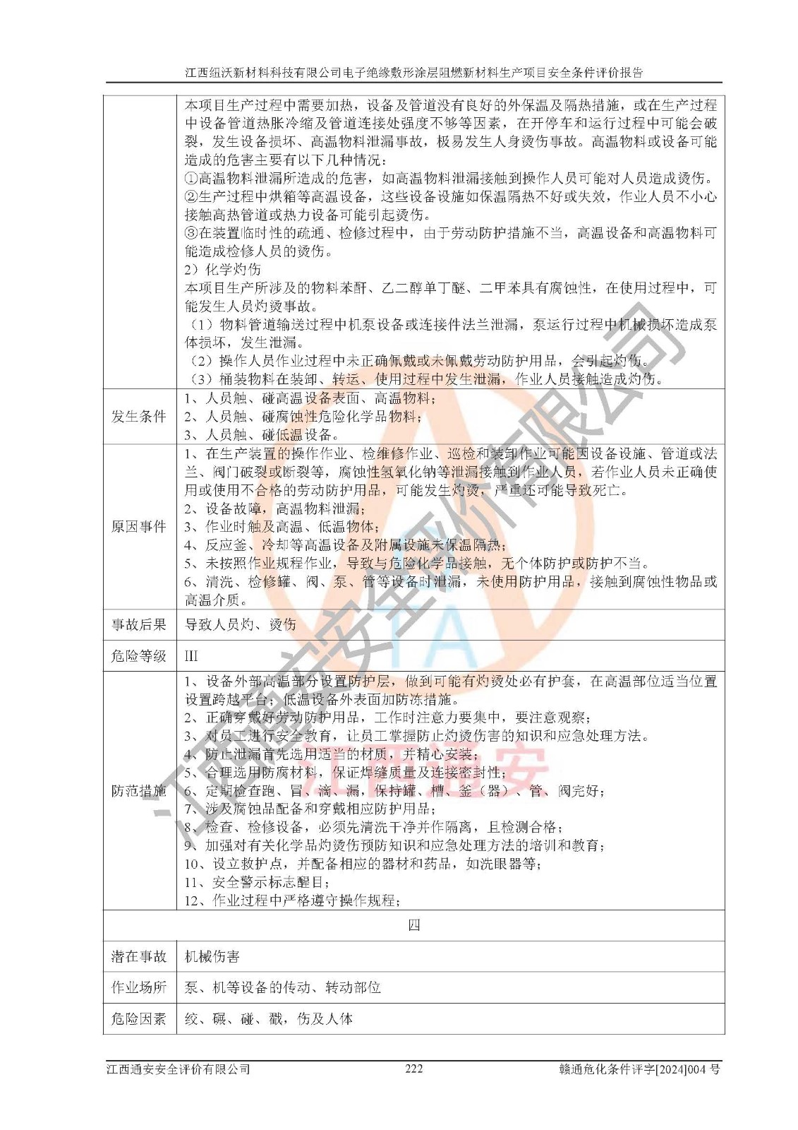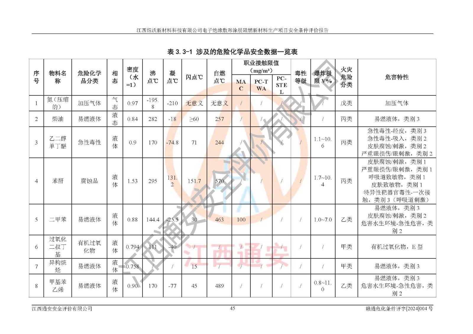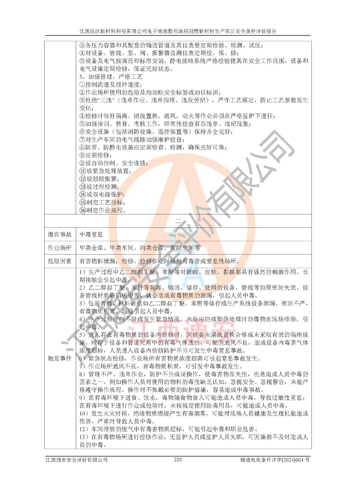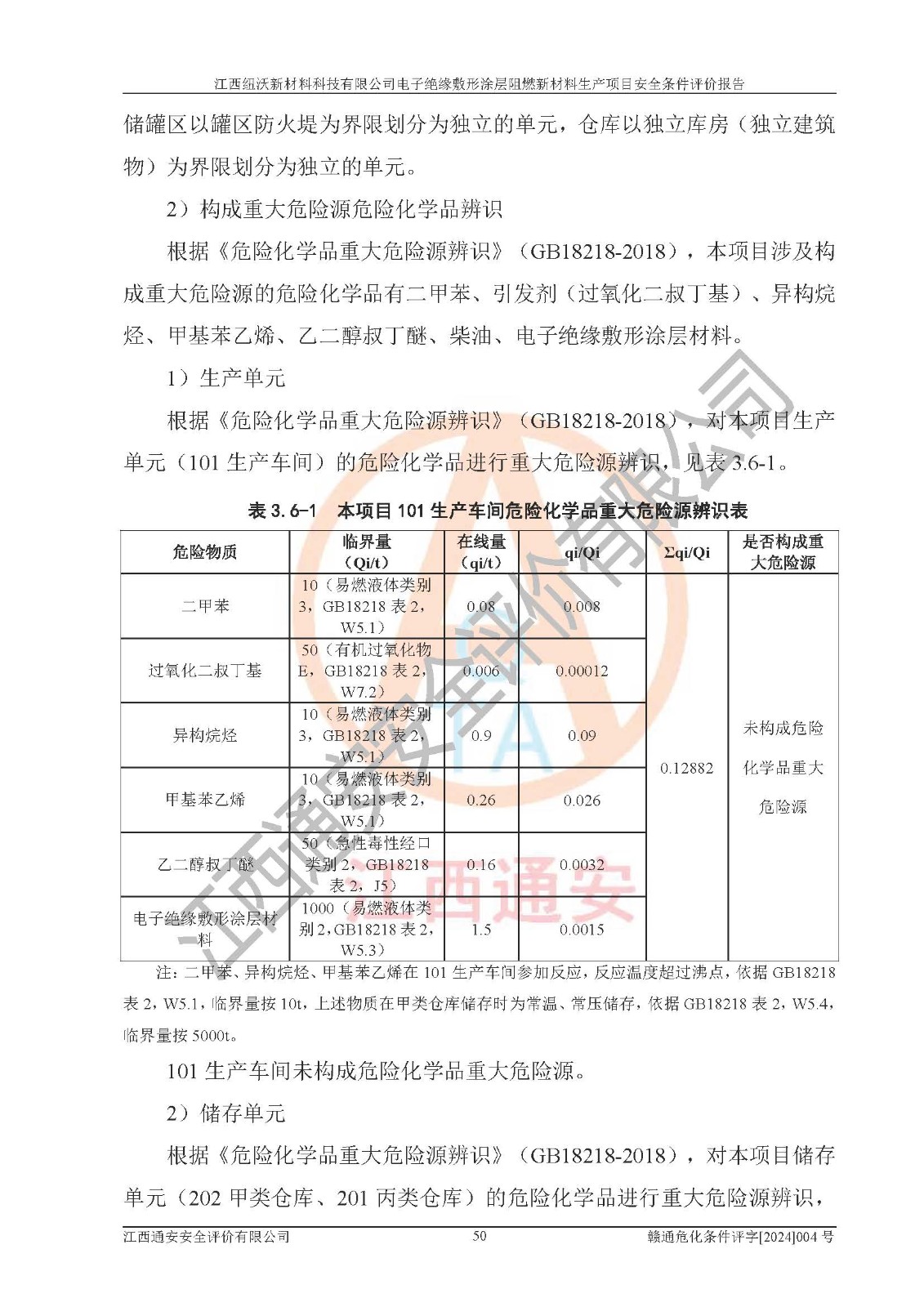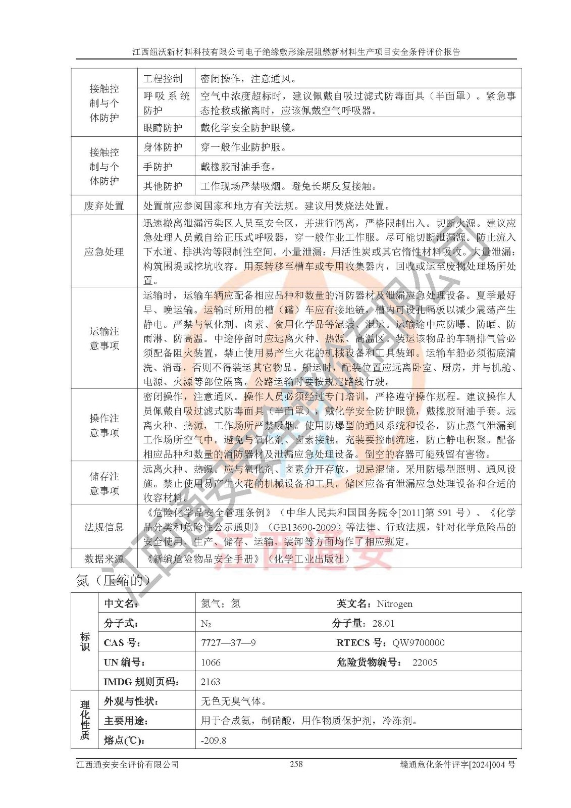 1)本項(xiàng)目依法取得了《江西省企業(yè)投資項(xiàng)目備案通知書》、《建設(shè)用地規(guī)劃許可證》,符合地方產(chǎn)業(yè)發(fā)展規(guī)劃的要求。 2)根據(jù)《**安全監(jiān)管總局關(guān)于公布首批重點(diǎn)監(jiān)管的危險(xiǎn)化工工藝目錄的通知》(安監(jiān)總管三[2009]116號)和《**安全監(jiān)管總局關(guān)于公布第二批重點(diǎn)監(jiān)管危險(xiǎn)化工工藝目錄和調(diào)整首批重點(diǎn)監(jiān)管危險(xiǎn)化工工藝中部分典型工藝的通知》(安監(jiān)總管三[2013]3號),該項(xiàng)目未涉及重點(diǎn)監(jiān)管危險(xiǎn)化工工藝。 3)根據(jù)《危險(xiǎn)化學(xué)品重大危險(xiǎn)源辨識》(GB18218-2018),該項(xiàng)目未構(gòu)成危險(xiǎn)化學(xué)品重大危險(xiǎn)源。 4)項(xiàng)目存在的主要危險(xiǎn)因素有:火災(zāi)爆炸、容器爆炸、中毒窒息、灼燙、觸電、**傷害、機(jī)械傷害、高處墜落、物體打擊、淹溺等,存在的主要危害因素有:噪聲與振動、高溫、有害化學(xué)物質(zhì)等;引起事故的原因有人的不安全行為、物的不安全狀態(tài)、管理缺陷和環(huán)境不良。其中*主要的危險(xiǎn)有害因素是火災(zāi)爆炸。 5)采用預(yù)先危險(xiǎn)性分析法評價(jià),結(jié)果為: (1)通過預(yù)先危險(xiǎn)(PHA)分析可知,項(xiàng)目廠址及總體布局單元存在周邊環(huán)境相互影響,發(fā)生異常情況,可對周邊企業(yè)生產(chǎn)經(jīng)營活動、人員活動產(chǎn)生影響;存在自然條件影響,可因雷擊、暴雨等引起事故;存在**傷害、建筑物危害,其固有的危險(xiǎn)性等級為Ⅱ級,屬于“臨界的”,應(yīng)予以排除、采取控制措施因素。 (2)生產(chǎn)作業(yè)存在的危險(xiǎn)因素包括火災(zāi)爆炸、觸電、灼燙、中毒窒息固有的危險(xiǎn)等級為Ⅲ級,屬于“危險(xiǎn)的”,可能導(dǎo)致人員傷亡和系統(tǒng)損壞的因素,需要采取防范和對策措施的因素;其它危險(xiǎn)因素固有的危險(xiǎn)等級為Ⅱ級,屬于“臨界的”,應(yīng)予以排除、采取控制措施因素。 (3)生產(chǎn)作業(yè)存在的噪聲、粉塵、高溫、有害化學(xué)物質(zhì)的危險(xiǎn)有害因素等級為Ⅱ級,屬于“臨界的”,應(yīng)予以排除、采取控制措施因素。 6)危險(xiǎn)度評價(jià)分析,結(jié)果為: 生產(chǎn)裝置危險(xiǎn)度評價(jià)分析:101生產(chǎn)車間為**危險(xiǎn)(Ⅰ級)。 儲存單元危險(xiǎn)度評價(jià)分析:202甲類倉庫為**危險(xiǎn)(Ⅰ級),201丙類倉庫為低度危險(xiǎn)(Ⅲ級)。 7)作業(yè)條件危險(xiǎn)性評價(jià)結(jié)果:在選定的評價(jià)單元中,其危險(xiǎn)分值均在70以下,危險(xiǎn)程度基本屬于“可能危險(xiǎn)”、“稍有危險(xiǎn)”范圍,作業(yè)條件相對安全。企業(yè)經(jīng)營過程中首先應(yīng)重點(diǎn)加強(qiáng)對甲類車間、甲類倉庫的危險(xiǎn)因素的嚴(yán)格控制,注重日常安全管理;其次要建立健全完善的安全生產(chǎn)責(zé)任制、安全管理制度、安全技術(shù)操作規(guī)程并**其貫徹落實(shí);第三要認(rèn)真抓好操作人員、管理人員的安全知識和操作技能的培訓(xùn),**人員具有與工程技術(shù)水平相適應(yīng)的技術(shù)素質(zhì)和安全素質(zhì),**安全作業(yè)。 8)項(xiàng)目建設(shè)場地符合當(dāng)?shù)匾?guī)劃要求,建設(shè)場地通過合理規(guī)劃,其選址、周邊環(huán)境、總平面布置、交通運(yùn)輸?shù)饶芊稀吨腥A人民共和國安全生產(chǎn)法》、《危險(xiǎn)化學(xué)品安全管理?xiàng)l例》、《建筑設(shè)計(jì)防火規(guī)范》、《精細(xì)化工企業(yè)工程設(shè)計(jì)防火標(biāo)準(zhǔn)》等法規(guī)、標(biāo)準(zhǔn)、規(guī)范要求。 廠址地區(qū)地震活動相對較弱,災(zāi)害性天氣出現(xiàn)頻率稍高,自然災(zāi)害對項(xiàng)目建設(shè)具有**影響,通過采取相應(yīng)的防護(hù)措施,自然條件適宜建設(shè)。 9)建設(shè)項(xiàng)目符合**產(chǎn)業(yè)政策的要求;選擇工藝為現(xiàn)行成熟工藝,其安全可靠性可得到**。 10)本報(bào)告已根據(jù)有關(guān)安全生產(chǎn)法律、法規(guī)、規(guī)章和**標(biāo)準(zhǔn)、行業(yè)標(biāo)準(zhǔn),并嚴(yán)格執(zhí)行省委辦公廳省**辦公廳《關(guān)于全面加強(qiáng)危險(xiǎn)化學(xué)品安全生產(chǎn)工作的實(shí)施意見》(贛辦發(fā)[2020]32號)及鄱陽湖生態(tài)經(jīng)濟(jì)區(qū)、長江經(jīng)濟(jì)帶、“五河一湖”相關(guān)政策規(guī)定,客觀、公正、科學(xué)地進(jìn)行安全評價(jià),項(xiàng)目符合《江西省應(yīng)急管理廳關(guān)于印發(fā)《江西省危險(xiǎn)化學(xué)品建設(shè)項(xiàng)目安全監(jiān)督管理實(shí)施細(xì)則》(試行)的通知》(贛應(yīng)急字[2021]100號)的要求。 11)本報(bào)告結(jié)合工藝特征,提出應(yīng)采取的對應(yīng)的自動化控制系統(tǒng)及自動化實(shí)施方案,滿足《江西省應(yīng)急管理廳關(guān)于印發(fā)《江西省化工企業(yè)自動化提升實(shí)施方案》(試行)的通知》(贛應(yīng)急字[2021]190號)的要求。 綜上所述:江西紐沃新材料科技有限公司電子*緣敷形涂層阻燃新材料生產(chǎn)項(xiàng)目的產(chǎn)業(yè)政策、安全條件、廠址、總體布局、主要技術(shù)和工藝、裝置、設(shè)施、配套和輔助工程、安全管理等均滿足安全生產(chǎn)相關(guān)法