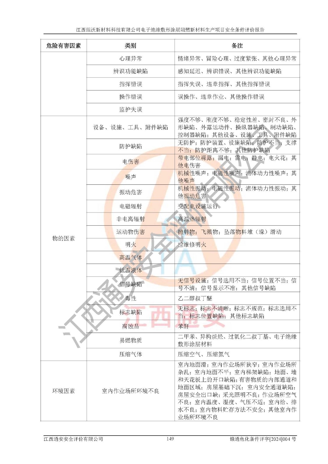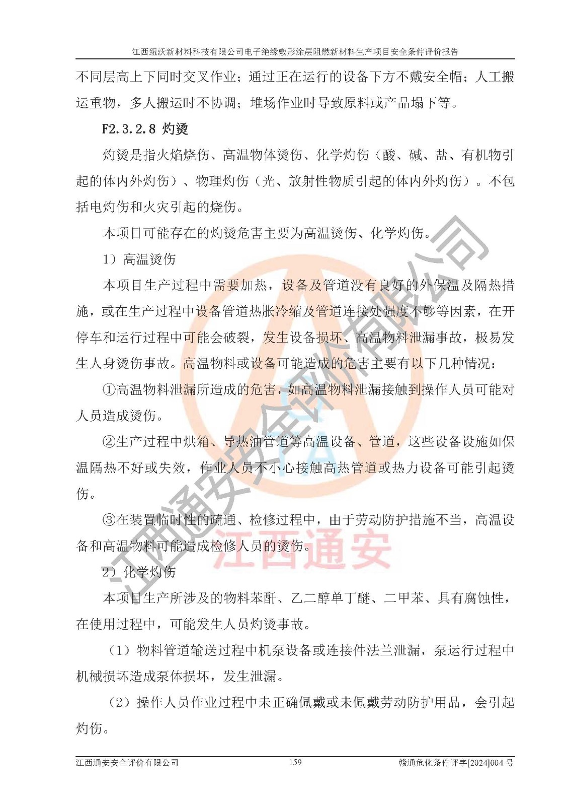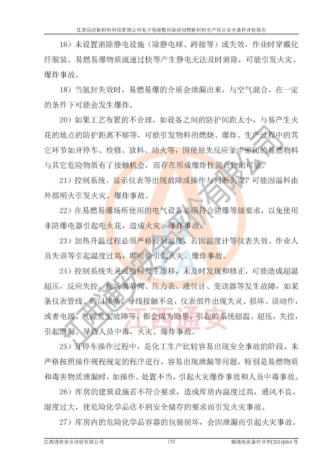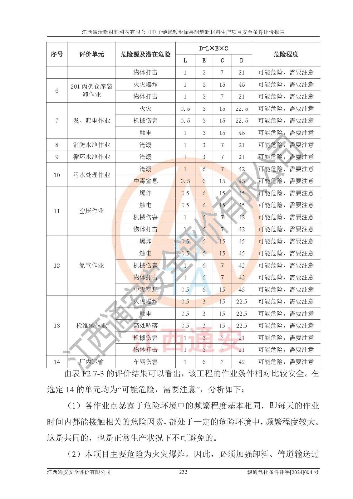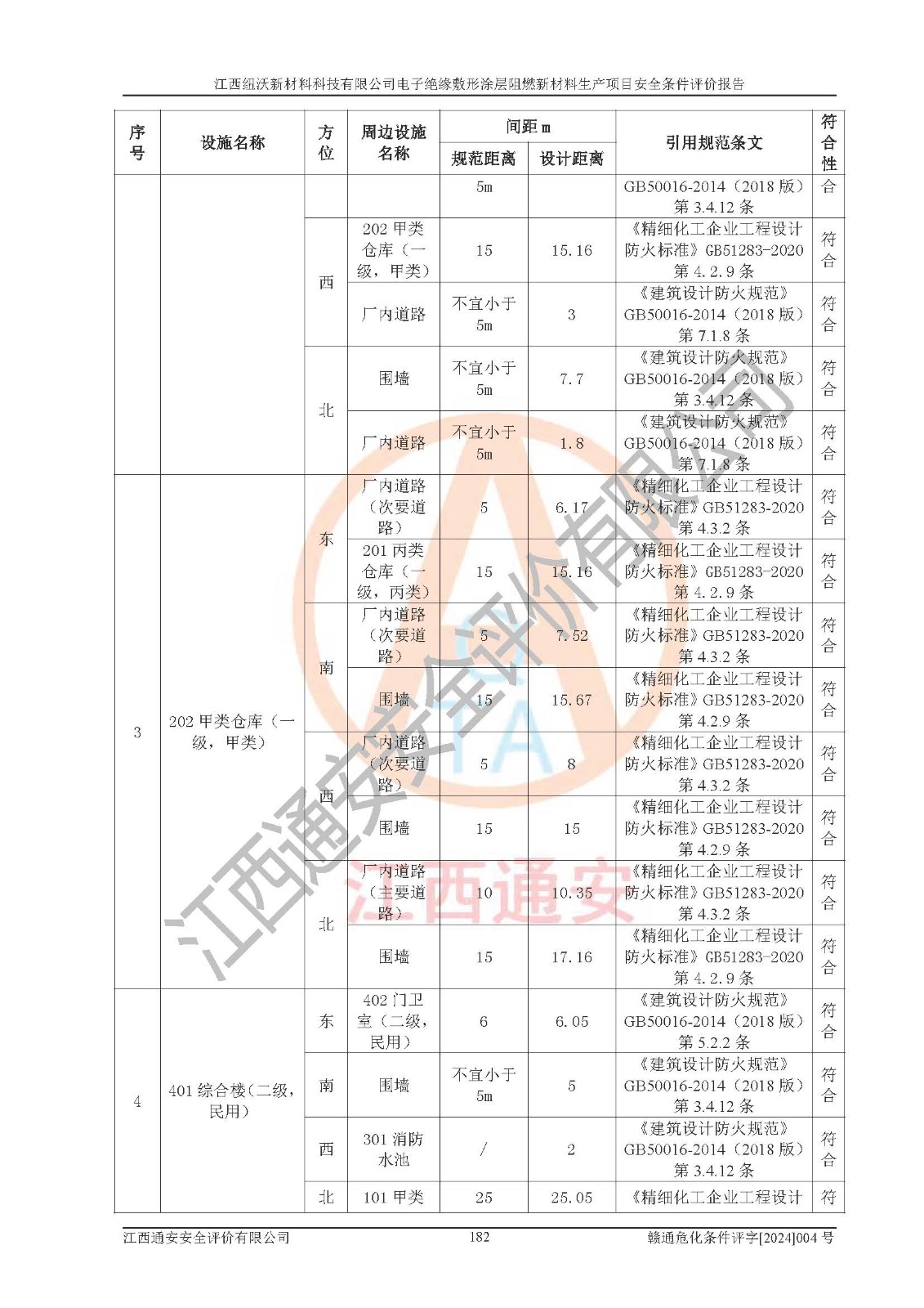 1)本項(xiàng)目依法取得了《江西省企業(yè)投資項(xiàng)目備案通知書》、《建設(shè)用地規(guī)劃許可證》,符合地方產(chǎn)業(yè)發(fā)展規(guī)劃的要求。 2)根據(jù)《**安全監(jiān)管總局關(guān)于公布首批重點(diǎn)監(jiān)管的危險(xiǎn)化工工藝目錄的通知》(安監(jiān)總管三[2009]116號)和《**安全監(jiān)管總局關(guān)于公布第二批重點(diǎn)監(jiān)管危險(xiǎn)化工工藝目錄和調(diào)整首批重點(diǎn)監(jiān)管危險(xiǎn)化工工藝中部分典型工藝的通知》(安監(jiān)總管三[2013]3號),該項(xiàng)目未涉及重點(diǎn)監(jiān)管危險(xiǎn)化工工藝。 3)根據(jù)《危險(xiǎn)化學(xué)品重大危險(xiǎn)源辨識》(GB18218-2018),該項(xiàng)目未構(gòu)成危險(xiǎn)化學(xué)品重大危險(xiǎn)源。 4)項(xiàng)目存在的主要危險(xiǎn)因素有:火災(zāi)爆炸、容器爆炸、中毒窒息、灼燙、觸電、**傷害、機(jī)械傷害、高處墜落、物體打擊、淹溺等,存在的主要危害因素有:噪聲與振動、高溫、有害化學(xué)物質(zhì)等;引起事故的原因有人的不安全行為、物的不安全狀態(tài)、管理缺陷和環(huán)境不良。其中*主要的危險(xiǎn)有害因素是火災(zāi)爆炸。 5)采用預(yù)先危險(xiǎn)性分析法評價(jià),結(jié)果為: (1)通過預(yù)先危險(xiǎn)(PHA)分析可知,項(xiàng)目廠址及總體布局單元存在周邊環(huán)境相互影響,發(fā)生異常情況,可對周邊企業(yè)生產(chǎn)經(jīng)營活動、人員活動產(chǎn)生影響;存在自然條件影響,可因雷擊、暴雨等引起事故;存在**傷害、建筑物危害,其固有的危險(xiǎn)性等級為Ⅱ級,屬于“臨界的”,應(yīng)予以排除、采取控制措施因素。 (2)生產(chǎn)作業(yè)存在的危險(xiǎn)因素包括火災(zāi)爆炸、觸電、灼燙、中毒窒息固有的危險(xiǎn)等級為Ⅲ級,屬于“危險(xiǎn)的”,可能導(dǎo)致人員傷亡和系統(tǒng)損壞的因素,需要采取防范和對策措施的因素;其它危險(xiǎn)因素固有的危險(xiǎn)等級為Ⅱ級,屬于“臨界的”,應(yīng)予以排除、采取控制措施因素。 (3)生產(chǎn)作業(yè)存在的噪聲、粉塵、高溫、有害化學(xué)物質(zhì)的危險(xiǎn)有害因素等級為Ⅱ級,屬于“臨界的”,應(yīng)予以排除、采取控制措施因素。 6)危險(xiǎn)度評價(jià)分析,結(jié)果為: 生產(chǎn)裝置危險(xiǎn)度評價(jià)分析:101生產(chǎn)車間為**危險(xiǎn)(Ⅰ級)。 儲存單元危險(xiǎn)度評價(jià)分析:202甲類倉庫為**危險(xiǎn)(Ⅰ級),201丙類倉庫為低度危險(xiǎn)(Ⅲ級)。 7)作業(yè)條件危險(xiǎn)性評價(jià)結(jié)果:在選定的評價(jià)單元中,其危險(xiǎn)分值均在70以下,危險(xiǎn)程度基本屬于“可能危險(xiǎn)”、“稍有危險(xiǎn)”范圍,作業(yè)條件相對安全。企業(yè)經(jīng)營過程中首先應(yīng)重點(diǎn)加強(qiáng)對甲類車間、甲類倉庫的危險(xiǎn)因素的嚴(yán)格控制,注重日常安全管理;其次要建立健全完善的安全生產(chǎn)責(zé)任制、安全管理制度、安全技術(shù)操作規(guī)程并**其貫徹落實(shí);第三要認(rèn)真抓好操作人員、管理人員的安全知識和操作技能的培訓(xùn),**人員具有與工程技術(shù)水平相適應(yīng)的技術(shù)素質(zhì)和安全素質(zhì),**安全作業(yè)。 8)項(xiàng)目建設(shè)場地符合當(dāng)?shù)匾?guī)劃要求,建設(shè)場地通過合理規(guī)劃,其選址、周邊環(huán)境、總平面布置、交通運(yùn)輸?shù)饶芊稀吨腥A人民共和國安全生產(chǎn)法》、《危險(xiǎn)化學(xué)品安全管理?xiàng)l例》、《建筑設(shè)計(jì)防火規(guī)范》、《精細(xì)化工企業(yè)工程設(shè)計(jì)防火標(biāo)準(zhǔn)》等法規(guī)、標(biāo)準(zhǔn)、規(guī)范要求。 廠址地區(qū)地震活動相對較弱,災(zāi)害性天氣出現(xiàn)頻率稍高,自然災(zāi)害對項(xiàng)目建設(shè)具有**影響,通過采取相應(yīng)的防護(hù)措施,自然條件適宜建設(shè)。 9)建設(shè)項(xiàng)目符合**產(chǎn)業(yè)政策的要求;選擇工藝為現(xiàn)行成熟工藝,其安全可靠性可得到**。 10)本報(bào)告已根據(jù)有關(guān)安全生產(chǎn)法律、法規(guī)、規(guī)章和**標(biāo)準(zhǔn)、行業(yè)標(biāo)準(zhǔn),并嚴(yán)格執(zhí)行省委辦公廳省**辦公廳《關(guān)于全面加強(qiáng)危險(xiǎn)化學(xué)品安全生產(chǎn)工作的實(shí)施意見》(贛辦發(fā)[2020]32號)及鄱陽湖生態(tài)經(jīng)濟(jì)區(qū)、長江經(jīng)濟(jì)帶、“五河一湖”相關(guān)政策規(guī)定,客觀、公正、科學(xué)地進(jìn)行安全評價(jià),項(xiàng)目符合《江西省應(yīng)急管理廳關(guān)于印發(fā)《江西省危險(xiǎn)化學(xué)品建設(shè)項(xiàng)目安全監(jiān)督管理實(shí)施細(xì)則》(試行)的通知》(贛應(yīng)急字[2021]100號)的要求。 11)本報(bào)告結(jié)合工藝特征,提出應(yīng)采取的對應(yīng)的自動化控制系統(tǒng)及自動化實(shí)施方案,滿足《江西省應(yīng)急管理廳關(guān)于印發(fā)《江西省化工企業(yè)自動化提升實(shí)施方案》(試行)的通知》(贛應(yīng)急字[2021]190號)的要求。 綜上所述:江西紐沃新材料科技有限公司電子*緣敷形涂層阻燃新材料生產(chǎn)項(xiàng)目的產(chǎn)業(yè)政策、安全條件、廠址、總體布局、主要技術(shù)和工藝、裝置、設(shè)施、配套和輔助工程、安全管理等均滿足安全生產(chǎn)相關(guān)法