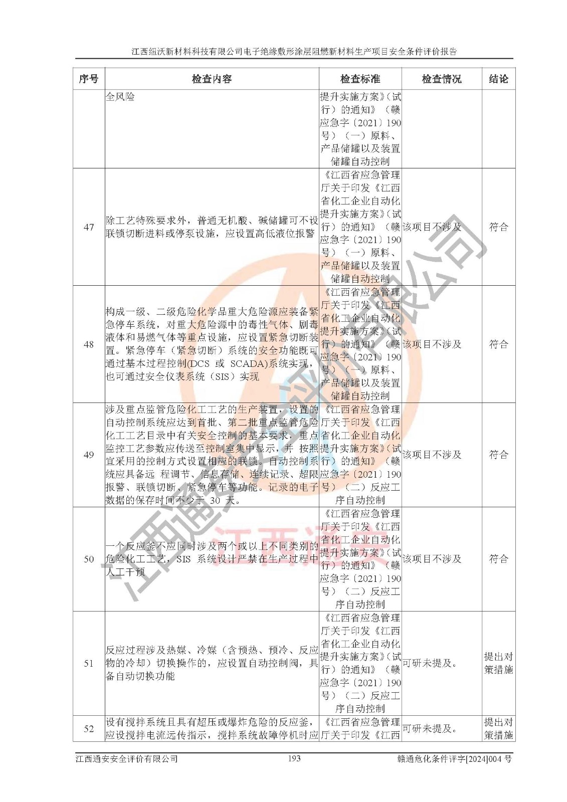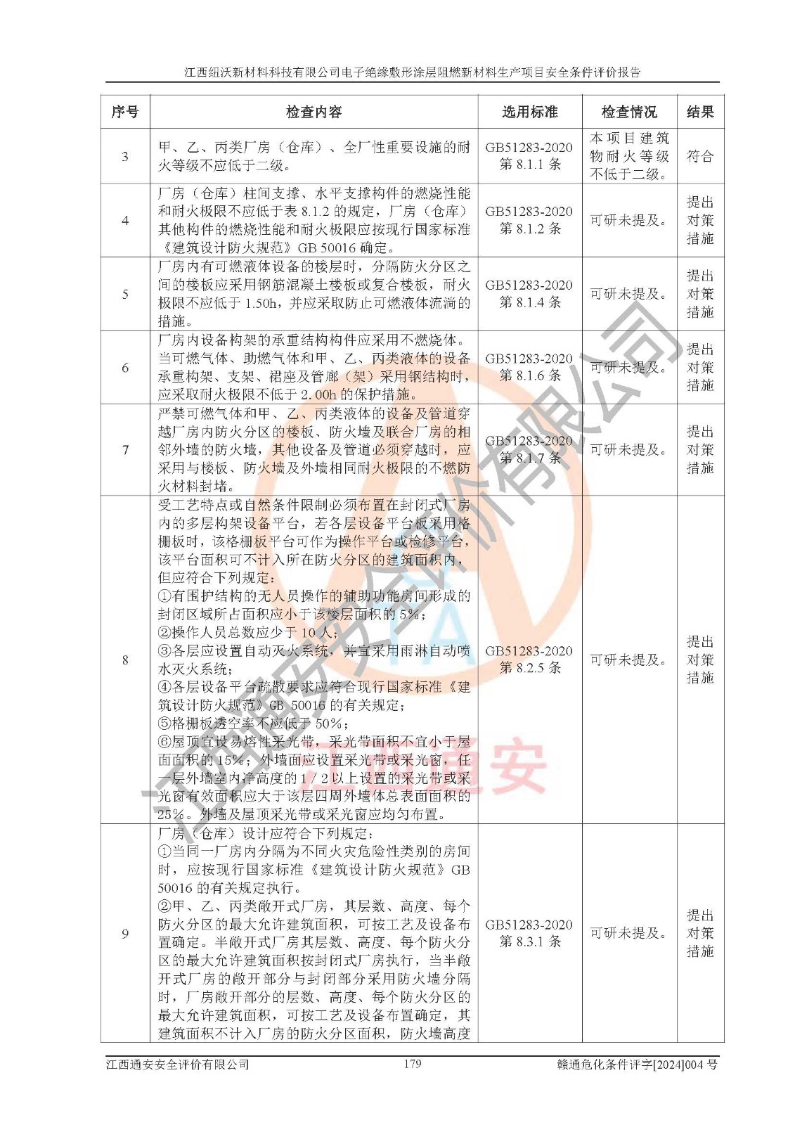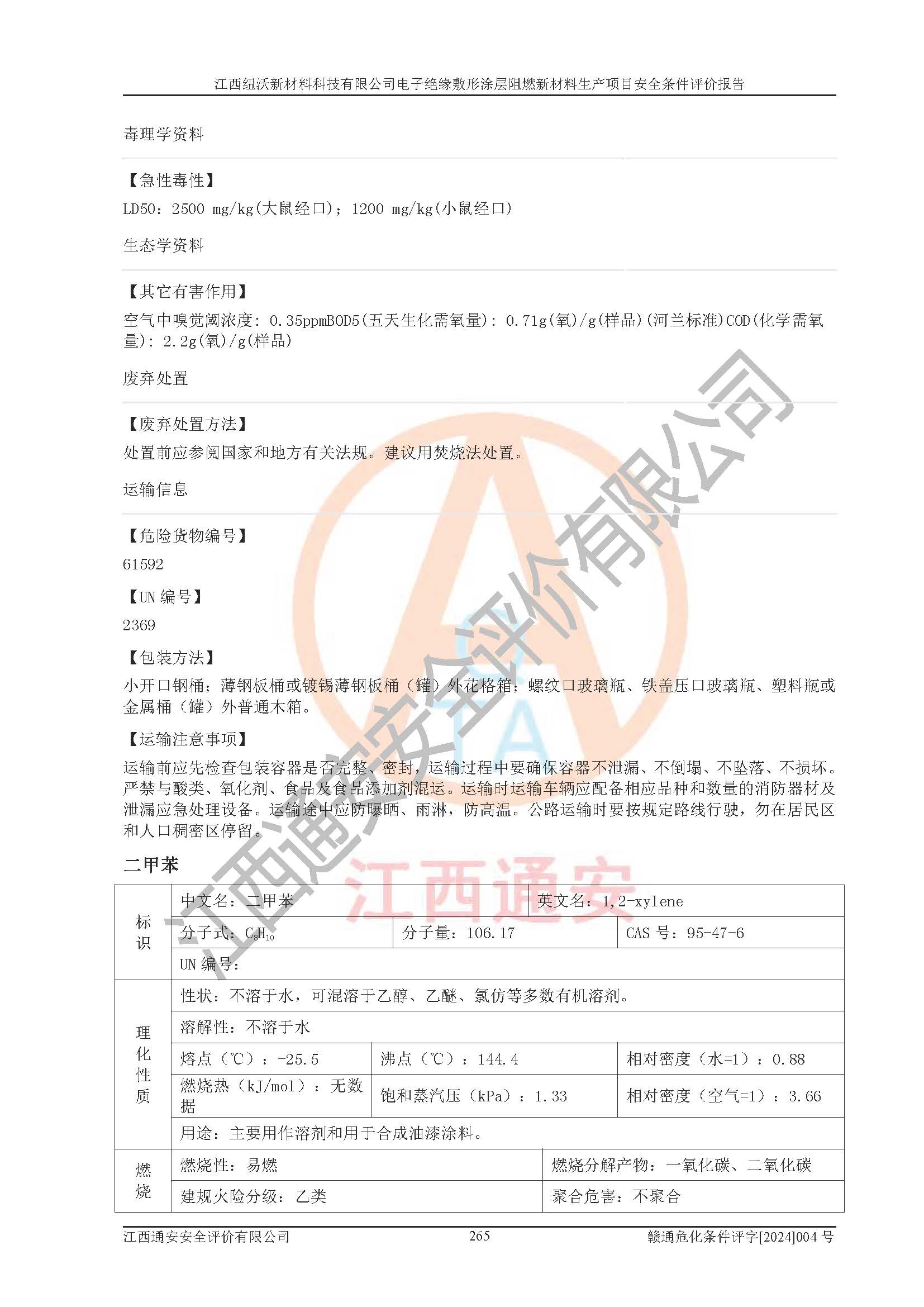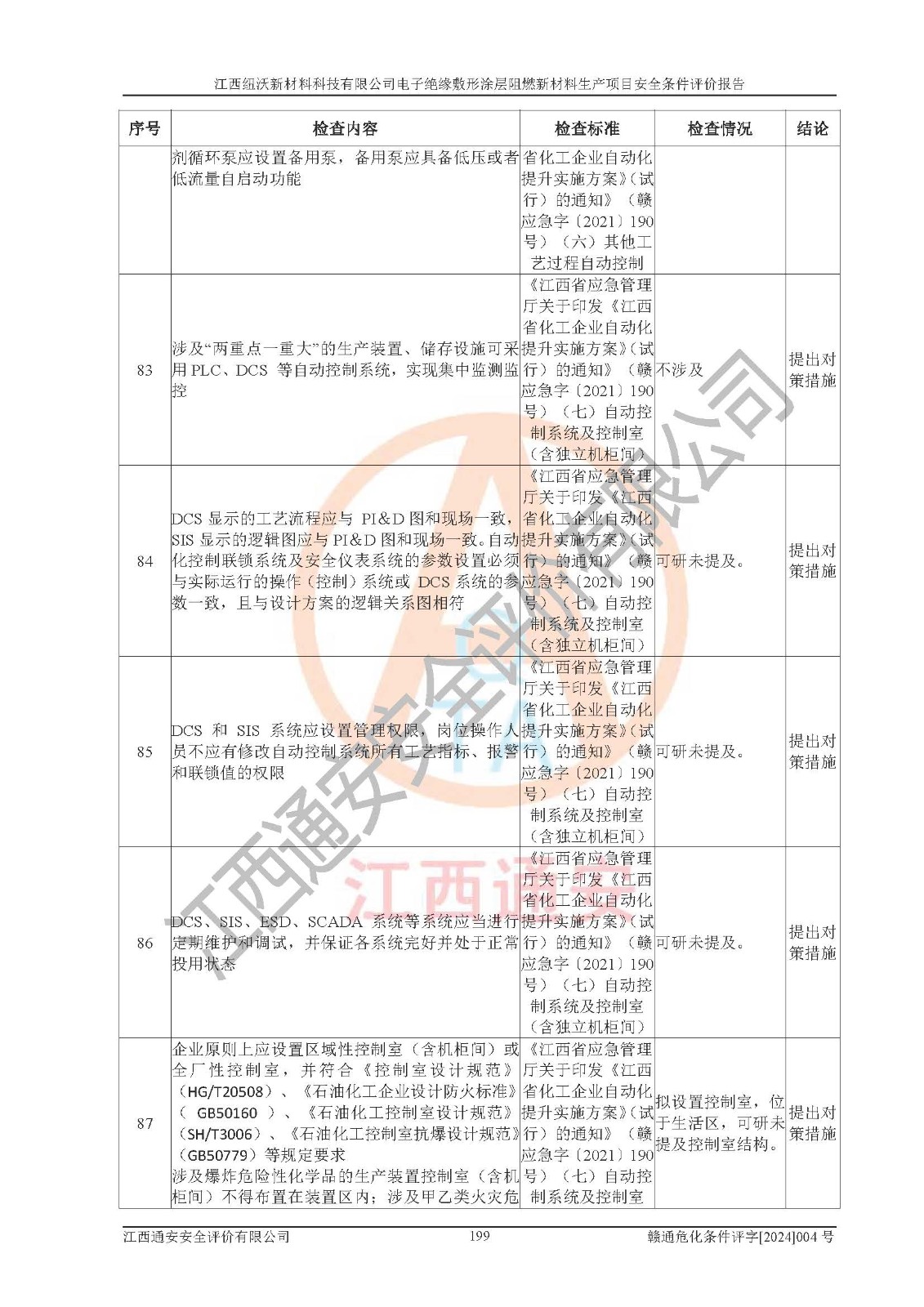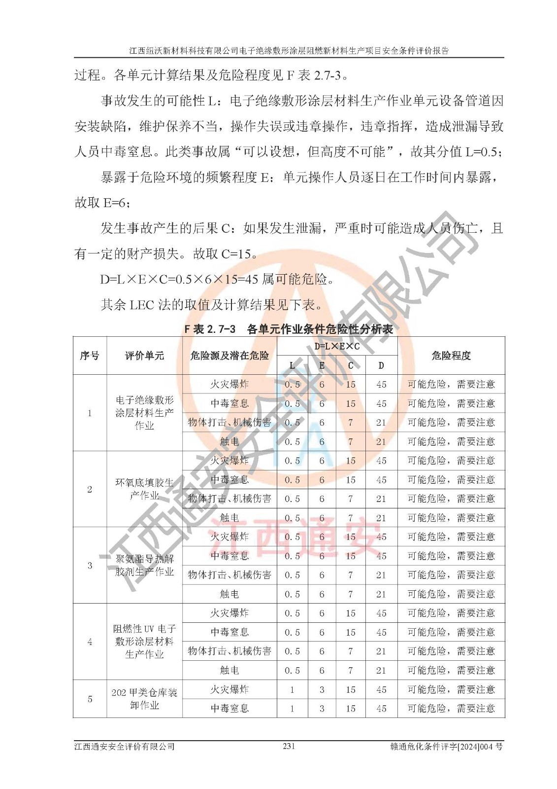 1)本項(xiàng)目依法取得了《江西省企業(yè)投資項(xiàng)目備案通知書》、《建設(shè)用地規(guī)劃許可證》,符合地方產(chǎn)業(yè)發(fā)展規(guī)劃的要求。 2)根據(jù)《**安全監(jiān)管總局關(guān)于公布首批重點(diǎn)監(jiān)管的危險(xiǎn)化工工藝目錄的通知》(安監(jiān)總管三[2009]116號)和《**安全監(jiān)管總局關(guān)于公布第二批重點(diǎn)監(jiān)管危險(xiǎn)化工工藝目錄和調(diào)整首批重點(diǎn)監(jiān)管危險(xiǎn)化工工藝中部分典型工藝的通知》(安監(jiān)總管三[2013]3號),該項(xiàng)目未涉及重點(diǎn)監(jiān)管危險(xiǎn)化工工藝。 3)根據(jù)《危險(xiǎn)化學(xué)品重大危險(xiǎn)源辨識》(GB18218-2018),該項(xiàng)目未構(gòu)成危險(xiǎn)化學(xué)品重大危險(xiǎn)源。 4)項(xiàng)目存在的主要危險(xiǎn)因素有:火災(zāi)爆炸、容器爆炸、中毒窒息、灼燙、觸電、**傷害、機(jī)械傷害、高處墜落、物體打擊、淹溺等,存在的主要危害因素有:噪聲與振動、高溫、有害化學(xué)物質(zhì)等;引起事故的原因有人的不安全行為、物的不安全狀態(tài)、管理缺陷和環(huán)境不良。其中*主要的危險(xiǎn)有害因素是火災(zāi)爆炸。 5)采用預(yù)先危險(xiǎn)性分析法評價(jià),結(jié)果為: (1)通過預(yù)先危險(xiǎn)(PHA)分析可知,項(xiàng)目廠址及總體布局單元存在周邊環(huán)境相互影響,發(fā)生異常情況,可對周邊企業(yè)生產(chǎn)經(jīng)營活動、人員活動產(chǎn)生影響;存在自然條件影響,可因雷擊、暴雨等引起事故;存在**傷害、建筑物危害,其固有的危險(xiǎn)性等級為Ⅱ級,屬于“臨界的”,應(yīng)予以排除、采取控制措施因素。 (2)生產(chǎn)作業(yè)存在的危險(xiǎn)因素包括火災(zāi)爆炸、觸電、灼燙、中毒窒息固有的危險(xiǎn)等級為Ⅲ級,屬于“危險(xiǎn)的”,可能導(dǎo)致人員傷亡和系統(tǒng)損壞的因素,需要采取防范和對策措施的因素;其它危險(xiǎn)因素固有的危險(xiǎn)等級為Ⅱ級,屬于“臨界的”,應(yīng)予以排除、采取控制措施因素。 (3)生產(chǎn)作業(yè)存在的噪聲、粉塵、高溫、有害化學(xué)物質(zhì)的危險(xiǎn)有害因素等級為Ⅱ級,屬于“臨界的”,應(yīng)予以排除、采取控制措施因素。 6)危險(xiǎn)度評價(jià)分析,結(jié)果為: 生產(chǎn)裝置危險(xiǎn)度評價(jià)分析:101生產(chǎn)車間為**危險(xiǎn)(Ⅰ級)。 儲存單元危險(xiǎn)度評價(jià)分析:202甲類倉庫為**危險(xiǎn)(Ⅰ級),201丙類倉庫為低度危險(xiǎn)(Ⅲ級)。 7)作業(yè)條件危險(xiǎn)性評價(jià)結(jié)果:在選定的評價(jià)單元中,其危險(xiǎn)分值均在70以下,危險(xiǎn)程度基本屬于“可能危險(xiǎn)”、“稍有危險(xiǎn)”范圍,作業(yè)條件相對安全。企業(yè)經(jīng)營過程中首先應(yīng)重點(diǎn)加強(qiáng)對甲類車間、甲類倉庫的危險(xiǎn)因素的嚴(yán)格控制,注重日常安全管理;其次要建立健全完善的安全生產(chǎn)責(zé)任制、安全管理制度、安全技術(shù)操作規(guī)程并**其貫徹落實(shí);第三要認(rèn)真抓好操作人員、管理人員的安全知識和操作技能的培訓(xùn),**人員具有與工程技術(shù)水平相適應(yīng)的技術(shù)素質(zhì)和安全素質(zhì),**安全作業(yè)。 8)項(xiàng)目建設(shè)場地符合當(dāng)?shù)匾?guī)劃要求,建設(shè)場地通過合理規(guī)劃,其選址、周邊環(huán)境、總平面布置、交通運(yùn)輸?shù)饶芊稀吨腥A人民共和國安全生產(chǎn)法》、《危險(xiǎn)化學(xué)品安全管理?xiàng)l例》、《建筑設(shè)計(jì)防火規(guī)范》、《精細(xì)化工企業(yè)工程設(shè)計(jì)防火標(biāo)準(zhǔn)》等法規(guī)、標(biāo)準(zhǔn)、規(guī)范要求。 廠址地區(qū)地震活動相對較弱,災(zāi)害性天氣出現(xiàn)頻率稍高,自然災(zāi)害對項(xiàng)目建設(shè)具有**影響,通過采取相應(yīng)的防護(hù)措施,自然條件適宜建設(shè)。 9)建設(shè)項(xiàng)目符合**產(chǎn)業(yè)政策的要求;選擇工藝為現(xiàn)行成熟工藝,其安全可靠性可得到**。 10)本報(bào)告已根據(jù)有關(guān)安全生產(chǎn)法律、法規(guī)、規(guī)章和**標(biāo)準(zhǔn)、行業(yè)標(biāo)準(zhǔn),并嚴(yán)格執(zhí)行省委辦公廳省**辦公廳《關(guān)于全面加強(qiáng)危險(xiǎn)化學(xué)品安全生產(chǎn)工作的實(shí)施意見》(贛辦發(fā)[2020]32號)及鄱陽湖生態(tài)經(jīng)濟(jì)區(qū)、長江經(jīng)濟(jì)帶、“五河一湖”相關(guān)政策規(guī)定,客觀、公正、科學(xué)地進(jìn)行安全評價(jià),項(xiàng)目符合《江西省應(yīng)急管理廳關(guān)于印發(fā)《江西省危險(xiǎn)化學(xué)品建設(shè)項(xiàng)目安全監(jiān)督管理實(shí)施細(xì)則》(試行)的通知》(贛應(yīng)急字[2021]100號)的要求。 11)本報(bào)告結(jié)合工藝特征,提出應(yīng)采取的對應(yīng)的自動化控制系統(tǒng)及自動化實(shí)施方案,滿足《江西省應(yīng)急管理廳關(guān)于印發(fā)《江西省化工企業(yè)自動化提升實(shí)施方案》(試行)的通知》(贛應(yīng)急字[2021]190號)的要求。 綜上所述:江西紐沃新材料科技有限公司電子*緣敷形涂層阻燃新材料生產(chǎn)項(xiàng)目的產(chǎn)業(yè)政策、安全條件、廠址、總體布局、主要技術(shù)和工藝、裝置、設(shè)施、配套和輔助工程、安全管理等均滿足安全生產(chǎn)相關(guān)法