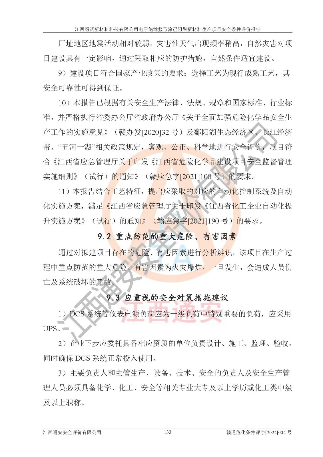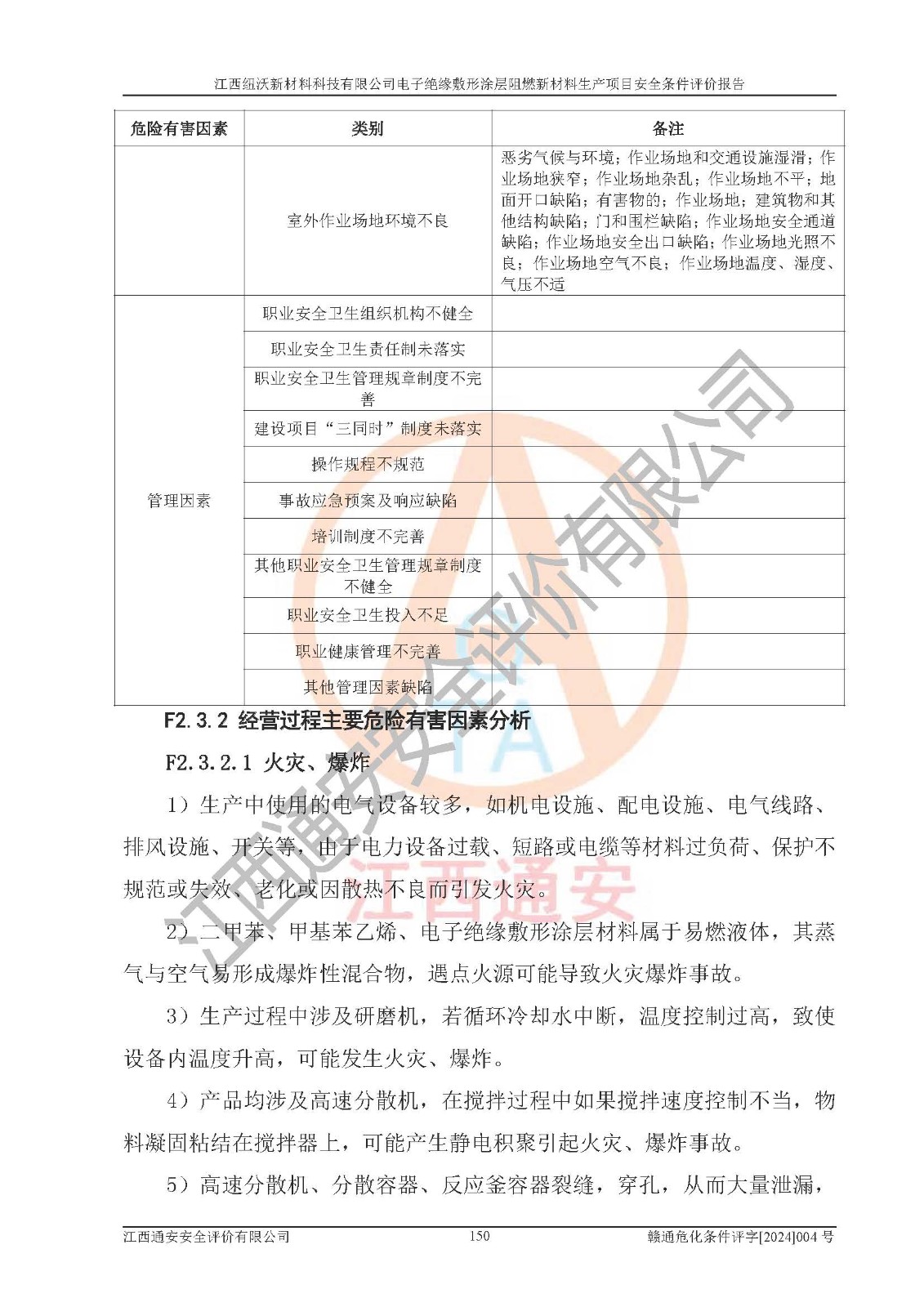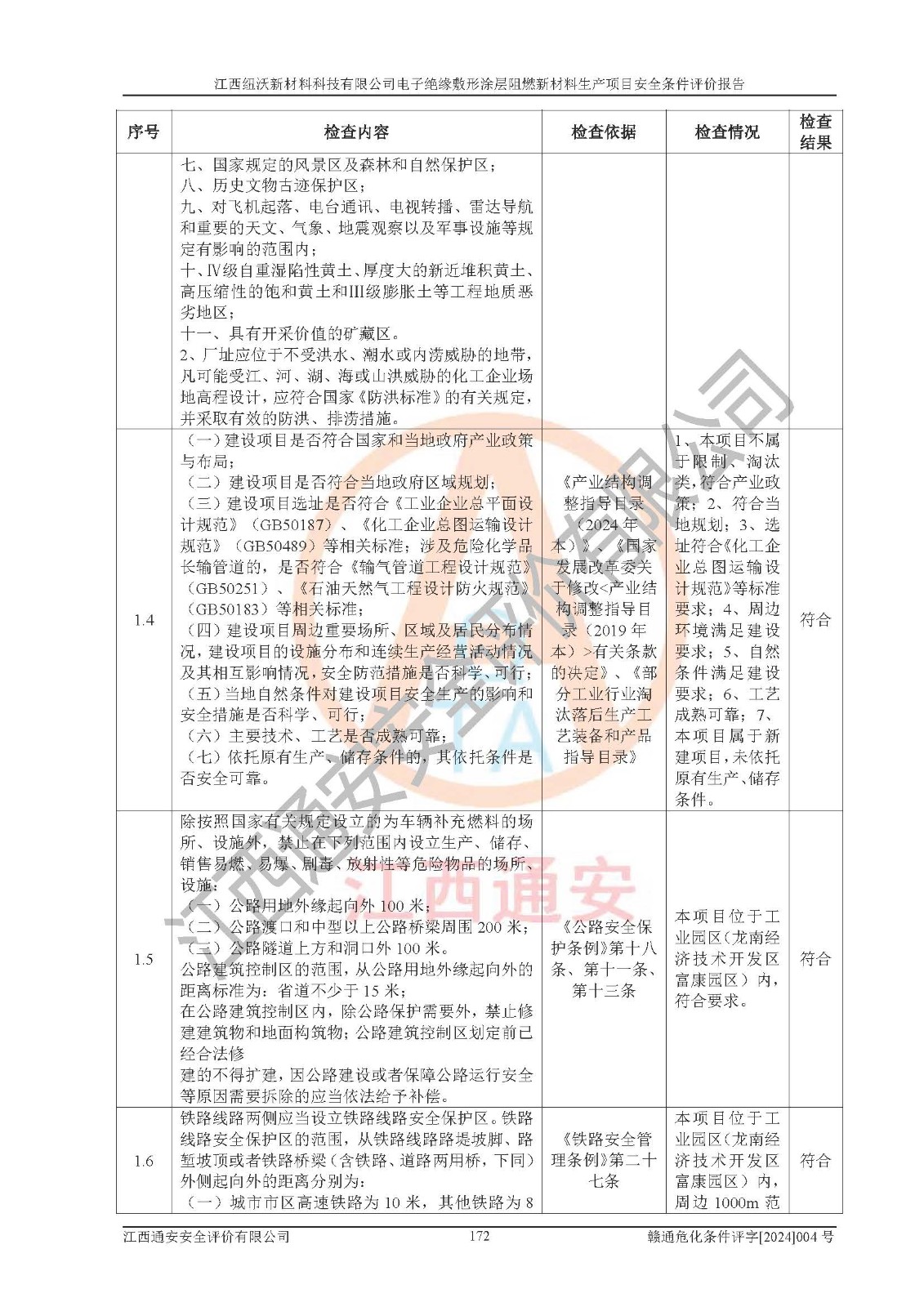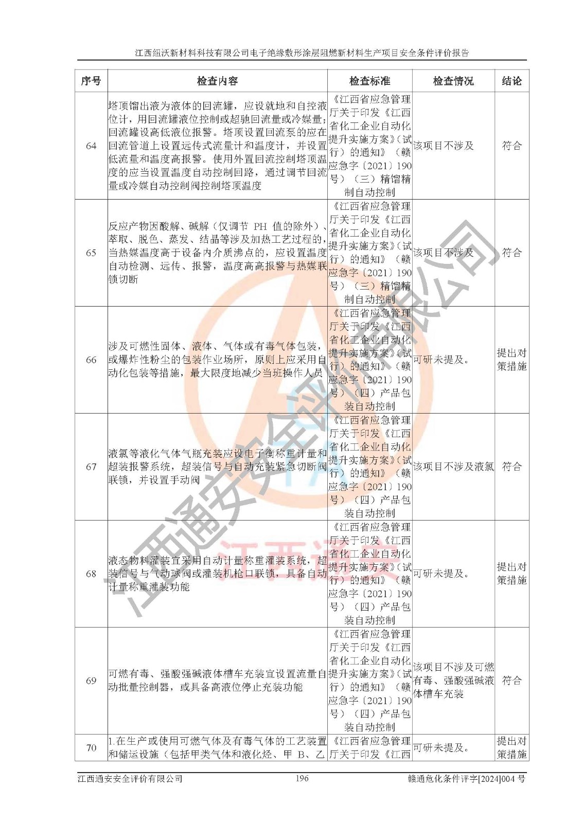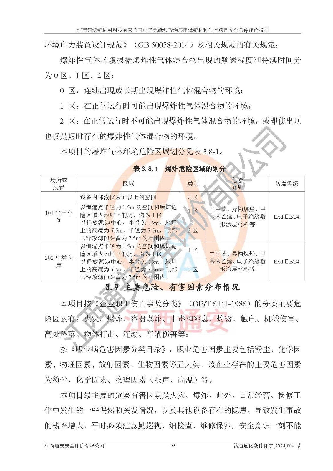 1)本項(xiàng)目依法取得了《江西省企業(yè)投資項(xiàng)目備案通知書》、《建設(shè)用地規(guī)劃許可證》,符合地方產(chǎn)業(yè)發(fā)展規(guī)劃的要求。 2)根據(jù)《**安全監(jiān)管總局關(guān)于公布首批重點(diǎn)監(jiān)管的危險(xiǎn)化工工藝目錄的通知》(安監(jiān)總管三[2009]116號)和《**安全監(jiān)管總局關(guān)于公布第二批重點(diǎn)監(jiān)管危險(xiǎn)化工工藝目錄和調(diào)整首批重點(diǎn)監(jiān)管危險(xiǎn)化工工藝中部分典型工藝的通知》(安監(jiān)總管三[2013]3號),該項(xiàng)目未涉及重點(diǎn)監(jiān)管危險(xiǎn)化工工藝。 3)根據(jù)《危險(xiǎn)化學(xué)品重大危險(xiǎn)源辨識》(GB18218-2018),該項(xiàng)目未構(gòu)成危險(xiǎn)化學(xué)品重大危險(xiǎn)源。 4)項(xiàng)目存在的主要危險(xiǎn)因素有:火災(zāi)爆炸、容器爆炸、中毒窒息、灼燙、觸電、**傷害、機(jī)械傷害、高處墜落、物體打擊、淹溺等,存在的主要危害因素有:噪聲與振動、高溫、有害化學(xué)物質(zhì)等;引起事故的原因有人的不安全行為、物的不安全狀態(tài)、管理缺陷和環(huán)境不良。其中*主要的危險(xiǎn)有害因素是火災(zāi)爆炸。 5)采用預(yù)先危險(xiǎn)性分析法評價(jià),結(jié)果為: (1)通過預(yù)先危險(xiǎn)(PHA)分析可知,項(xiàng)目廠址及總體布局單元存在周邊環(huán)境相互影響,發(fā)生異常情況,可對周邊企業(yè)生產(chǎn)經(jīng)營活動、人員活動產(chǎn)生影響;存在自然條件影響,可因雷擊、暴雨等引起事故;存在**傷害、建筑物危害,其固有的危險(xiǎn)性等級為Ⅱ級,屬于“臨界的”,應(yīng)予以排除、采取控制措施因素。 (2)生產(chǎn)作業(yè)存在的危險(xiǎn)因素包括火災(zāi)爆炸、觸電、灼燙、中毒窒息固有的危險(xiǎn)等級為Ⅲ級,屬于“危險(xiǎn)的”,可能導(dǎo)致人員傷亡和系統(tǒng)損壞的因素,需要采取防范和對策措施的因素;其它危險(xiǎn)因素固有的危險(xiǎn)等級為Ⅱ級,屬于“臨界的”,應(yīng)予以排除、采取控制措施因素。 (3)生產(chǎn)作業(yè)存在的噪聲、粉塵、高溫、有害化學(xué)物質(zhì)的危險(xiǎn)有害因素等級為Ⅱ級,屬于“臨界的”,應(yīng)予以排除、采取控制措施因素。 6)危險(xiǎn)度評價(jià)分析,結(jié)果為: 生產(chǎn)裝置危險(xiǎn)度評價(jià)分析:101生產(chǎn)車間為**危險(xiǎn)(Ⅰ級)。 儲存單元危險(xiǎn)度評價(jià)分析:202甲類倉庫為**危險(xiǎn)(Ⅰ級),201丙類倉庫為低度危險(xiǎn)(Ⅲ級)。 7)作業(yè)條件危險(xiǎn)性評價(jià)結(jié)果:在選定的評價(jià)單元中,其危險(xiǎn)分值均在70以下,危險(xiǎn)程度基本屬于“可能危險(xiǎn)”、“稍有危險(xiǎn)”范圍,作業(yè)條件相對安全。企業(yè)經(jīng)營過程中首先應(yīng)重點(diǎn)加強(qiáng)對甲類車間、甲類倉庫的危險(xiǎn)因素的嚴(yán)格控制,注重日常安全管理;其次要建立健全完善的安全生產(chǎn)責(zé)任制、安全管理制度、安全技術(shù)操作規(guī)程并**其貫徹落實(shí);第三要認(rèn)真抓好操作人員、管理人員的安全知識和操作技能的培訓(xùn),**人員具有與工程技術(shù)水平相適應(yīng)的技術(shù)素質(zhì)和安全素質(zhì),**安全作業(yè)。 8)項(xiàng)目建設(shè)場地符合當(dāng)?shù)匾?guī)劃要求,建設(shè)場地通過合理規(guī)劃,其選址、周邊環(huán)境、總平面布置、交通運(yùn)輸?shù)饶芊稀吨腥A人民共和國安全生產(chǎn)法》、《危險(xiǎn)化學(xué)品安全管理?xiàng)l例》、《建筑設(shè)計(jì)防火規(guī)范》、《精細(xì)化工企業(yè)工程設(shè)計(jì)防火標(biāo)準(zhǔn)》等法規(guī)、標(biāo)準(zhǔn)、規(guī)范要求。 廠址地區(qū)地震活動相對較弱,災(zāi)害性天氣出現(xiàn)頻率稍高,自然災(zāi)害對項(xiàng)目建設(shè)具有**影響,通過采取相應(yīng)的防護(hù)措施,自然條件適宜建設(shè)。 9)建設(shè)項(xiàng)目符合**產(chǎn)業(yè)政策的要求;選擇工藝為現(xiàn)行成熟工藝,其安全可靠性可得到**。 10)本報(bào)告已根據(jù)有關(guān)安全生產(chǎn)法律、法規(guī)、規(guī)章和**標(biāo)準(zhǔn)、行業(yè)標(biāo)準(zhǔn),并嚴(yán)格執(zhí)行省委辦公廳省**辦公廳《關(guān)于全面加強(qiáng)危險(xiǎn)化學(xué)品安全生產(chǎn)工作的實(shí)施意見》(贛辦發(fā)[2020]32號)及鄱陽湖生態(tài)經(jīng)濟(jì)區(qū)、長江經(jīng)濟(jì)帶、“五河一湖”相關(guān)政策規(guī)定,客觀、公正、科學(xué)地進(jìn)行安全評價(jià),項(xiàng)目符合《江西省應(yīng)急管理廳關(guān)于印發(fā)《江西省危險(xiǎn)化學(xué)品建設(shè)項(xiàng)目安全監(jiān)督管理實(shí)施細(xì)則》(試行)的通知》(贛應(yīng)急字[2021]100號)的要求。 11)本報(bào)告結(jié)合工藝特征,提出應(yīng)采取的對應(yīng)的自動化控制系統(tǒng)及自動化實(shí)施方案,滿足《江西省應(yīng)急管理廳關(guān)于印發(fā)《江西省化工企業(yè)自動化提升實(shí)施方案》(試行)的通知》(贛應(yīng)急字[2021]190號)的要求。 綜上所述:江西紐沃新材料科技有限公司電子*緣敷形涂層阻燃新材料生產(chǎn)項(xiàng)目的產(chǎn)業(yè)政策、安全條件、廠址、總體布局、主要技術(shù)和工藝、裝置、設(shè)施、配套和輔助工程、安全管理等均滿足安全生產(chǎn)相關(guān)法