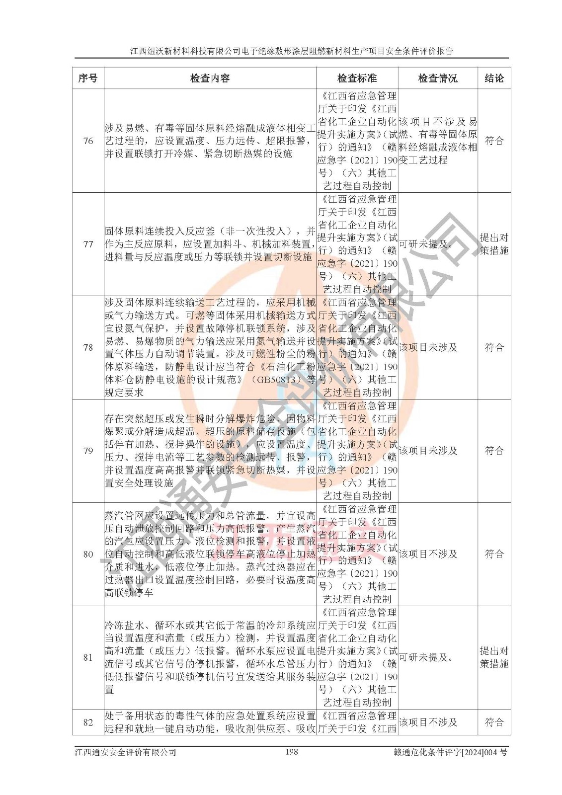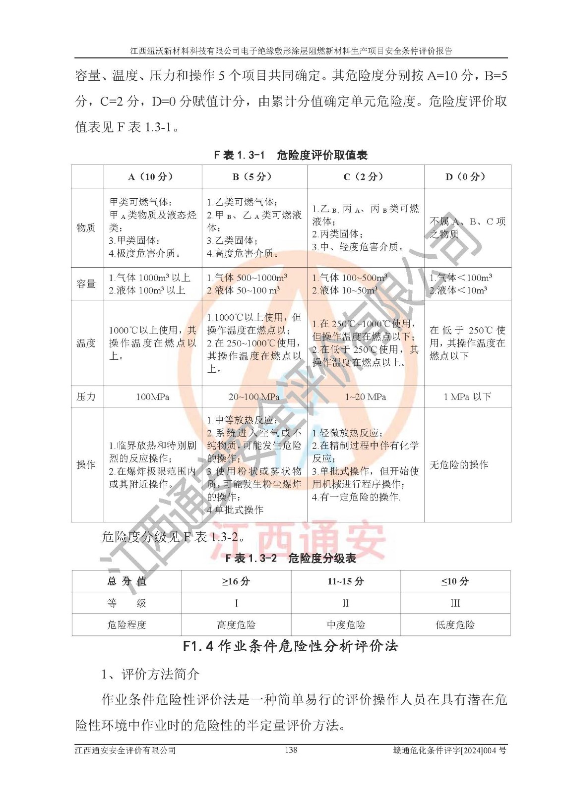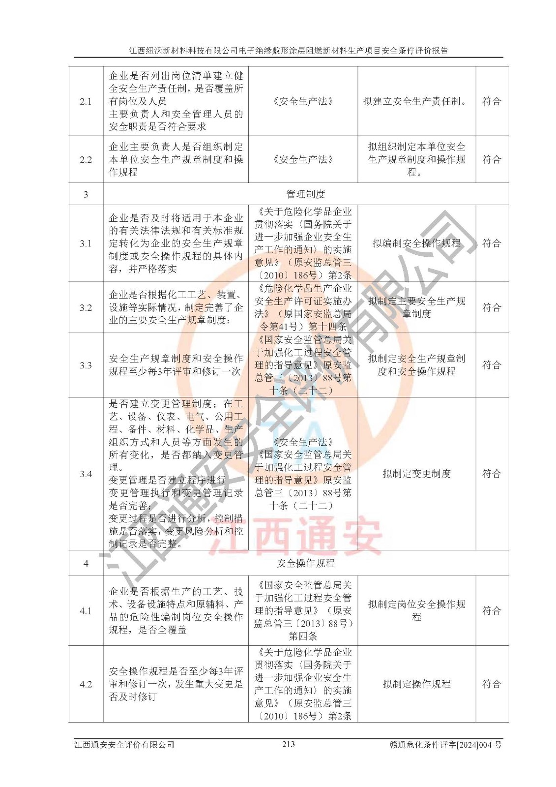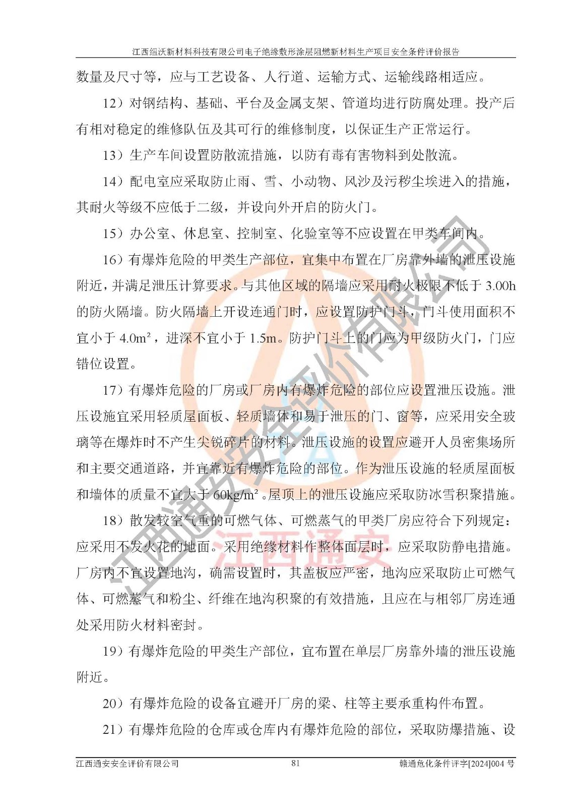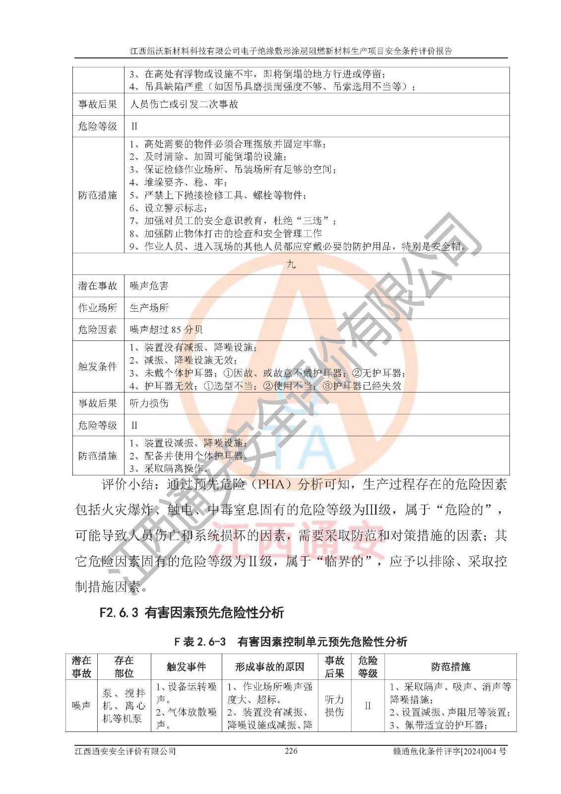 1)本項(xiàng)目依法取得了《江西省企業(yè)投資項(xiàng)目備案通知書》、《建設(shè)用地規(guī)劃許可證》,符合地方產(chǎn)業(yè)發(fā)展規(guī)劃的要求。 2)根據(jù)《**安全監(jiān)管總局關(guān)于公布首批重點(diǎn)監(jiān)管的危險(xiǎn)化工工藝目錄的通知》(安監(jiān)總管三[2009]116號)和《**安全監(jiān)管總局關(guān)于公布第二批重點(diǎn)監(jiān)管危險(xiǎn)化工工藝目錄和調(diào)整首批重點(diǎn)監(jiān)管危險(xiǎn)化工工藝中部分典型工藝的通知》(安監(jiān)總管三[2013]3號),該項(xiàng)目未涉及重點(diǎn)監(jiān)管危險(xiǎn)化工工藝。 3)根據(jù)《危險(xiǎn)化學(xué)品重大危險(xiǎn)源辨識》(GB18218-2018),該項(xiàng)目未構(gòu)成危險(xiǎn)化學(xué)品重大危險(xiǎn)源。 4)項(xiàng)目存在的主要危險(xiǎn)因素有:火災(zāi)爆炸、容器爆炸、中毒窒息、灼燙、觸電、**傷害、機(jī)械傷害、高處墜落、物體打擊、淹溺等,存在的主要危害因素有:噪聲與振動、高溫、有害化學(xué)物質(zhì)等;引起事故的原因有人的不安全行為、物的不安全狀態(tài)、管理缺陷和環(huán)境不良。其中*主要的危險(xiǎn)有害因素是火災(zāi)爆炸。 5)采用預(yù)先危險(xiǎn)性分析法評價(jià),結(jié)果為: (1)通過預(yù)先危險(xiǎn)(PHA)分析可知,項(xiàng)目廠址及總體布局單元存在周邊環(huán)境相互影響,發(fā)生異常情況,可對周邊企業(yè)生產(chǎn)經(jīng)營活動、人員活動產(chǎn)生影響;存在自然條件影響,可因雷擊、暴雨等引起事故;存在**傷害、建筑物危害,其固有的危險(xiǎn)性等級為Ⅱ級,屬于“臨界的”,應(yīng)予以排除、采取控制措施因素。 (2)生產(chǎn)作業(yè)存在的危險(xiǎn)因素包括火災(zāi)爆炸、觸電、灼燙、中毒窒息固有的危險(xiǎn)等級為Ⅲ級,屬于“危險(xiǎn)的”,可能導(dǎo)致人員傷亡和系統(tǒng)損壞的因素,需要采取防范和對策措施的因素;其它危險(xiǎn)因素固有的危險(xiǎn)等級為Ⅱ級,屬于“臨界的”,應(yīng)予以排除、采取控制措施因素。 (3)生產(chǎn)作業(yè)存在的噪聲、粉塵、高溫、有害化學(xué)物質(zhì)的危險(xiǎn)有害因素等級為Ⅱ級,屬于“臨界的”,應(yīng)予以排除、采取控制措施因素。 6)危險(xiǎn)度評價(jià)分析,結(jié)果為: 生產(chǎn)裝置危險(xiǎn)度評價(jià)分析:101生產(chǎn)車間為**危險(xiǎn)(Ⅰ級)。 儲存單元危險(xiǎn)度評價(jià)分析:202甲類倉庫為**危險(xiǎn)(Ⅰ級),201丙類倉庫為低度危險(xiǎn)(Ⅲ級)。 7)作業(yè)條件危險(xiǎn)性評價(jià)結(jié)果:在選定的評價(jià)單元中,其危險(xiǎn)分值均在70以下,危險(xiǎn)程度基本屬于“可能危險(xiǎn)”、“稍有危險(xiǎn)”范圍,作業(yè)條件相對安全。企業(yè)經(jīng)營過程中首先應(yīng)重點(diǎn)加強(qiáng)對甲類車間、甲類倉庫的危險(xiǎn)因素的嚴(yán)格控制,注重日常安全管理;其次要建立健全完善的安全生產(chǎn)責(zé)任制、安全管理制度、安全技術(shù)操作規(guī)程并**其貫徹落實(shí);第三要認(rèn)真抓好操作人員、管理人員的安全知識和操作技能的培訓(xùn),**人員具有與工程技術(shù)水平相適應(yīng)的技術(shù)素質(zhì)和安全素質(zhì),**安全作業(yè)。 8)項(xiàng)目建設(shè)場地符合當(dāng)?shù)匾?guī)劃要求,建設(shè)場地通過合理規(guī)劃,其選址、周邊環(huán)境、總平面布置、交通運(yùn)輸?shù)饶芊稀吨腥A人民共和國安全生產(chǎn)法》、《危險(xiǎn)化學(xué)品安全管理?xiàng)l例》、《建筑設(shè)計(jì)防火規(guī)范》、《精細(xì)化工企業(yè)工程設(shè)計(jì)防火標(biāo)準(zhǔn)》等法規(guī)、標(biāo)準(zhǔn)、規(guī)范要求。 廠址地區(qū)地震活動相對較弱,災(zāi)害性天氣出現(xiàn)頻率稍高,自然災(zāi)害對項(xiàng)目建設(shè)具有**影響,通過采取相應(yīng)的防護(hù)措施,自然條件適宜建設(shè)。 9)建設(shè)項(xiàng)目符合**產(chǎn)業(yè)政策的要求;選擇工藝為現(xiàn)行成熟工藝,其安全可靠性可得到**。 10)本報(bào)告已根據(jù)有關(guān)安全生產(chǎn)法律、法規(guī)、規(guī)章和**標(biāo)準(zhǔn)、行業(yè)標(biāo)準(zhǔn),并嚴(yán)格執(zhí)行省委辦公廳省**辦公廳《關(guān)于全面加強(qiáng)危險(xiǎn)化學(xué)品安全生產(chǎn)工作的實(shí)施意見》(贛辦發(fā)[2020]32號)及鄱陽湖生態(tài)經(jīng)濟(jì)區(qū)、長江經(jīng)濟(jì)帶、“五河一湖”相關(guān)政策規(guī)定,客觀、公正、科學(xué)地進(jìn)行安全評價(jià),項(xiàng)目符合《江西省應(yīng)急管理廳關(guān)于印發(fā)《江西省危險(xiǎn)化學(xué)品建設(shè)項(xiàng)目安全監(jiān)督管理實(shí)施細(xì)則》(試行)的通知》(贛應(yīng)急字[2021]100號)的要求。 11)本報(bào)告結(jié)合工藝特征,提出應(yīng)采取的對應(yīng)的自動化控制系統(tǒng)及自動化實(shí)施方案,滿足《江西省應(yīng)急管理廳關(guān)于印發(fā)《江西省化工企業(yè)自動化提升實(shí)施方案》(試行)的通知》(贛應(yīng)急字[2021]190號)的要求。 綜上所述:江西紐沃新材料科技有限公司電子*緣敷形涂層阻燃新材料生產(chǎn)項(xiàng)目的產(chǎn)業(yè)政策、安全條件、廠址、總體布局、主要技術(shù)和工藝、裝置、設(shè)施、配套和輔助工程、安全管理等均滿足安全生產(chǎn)相關(guān)法