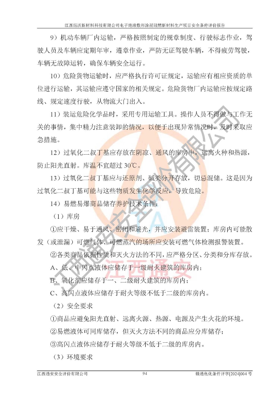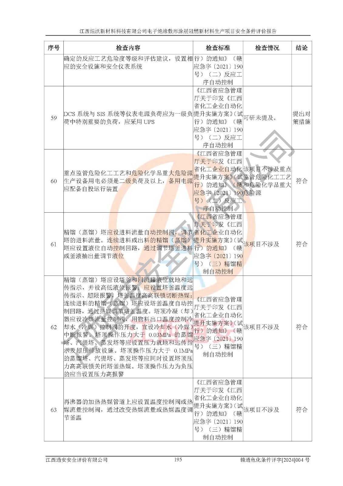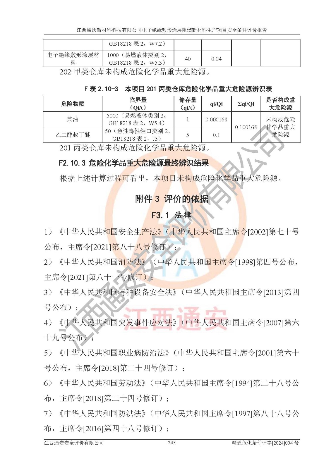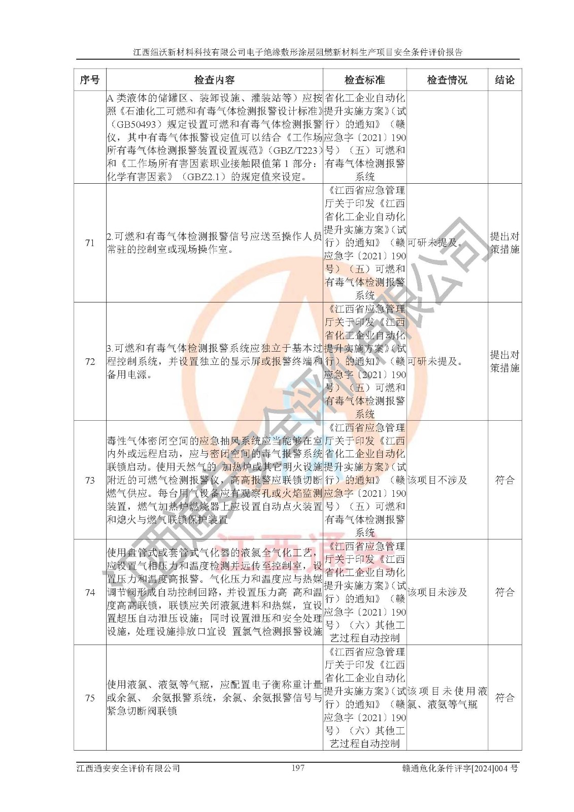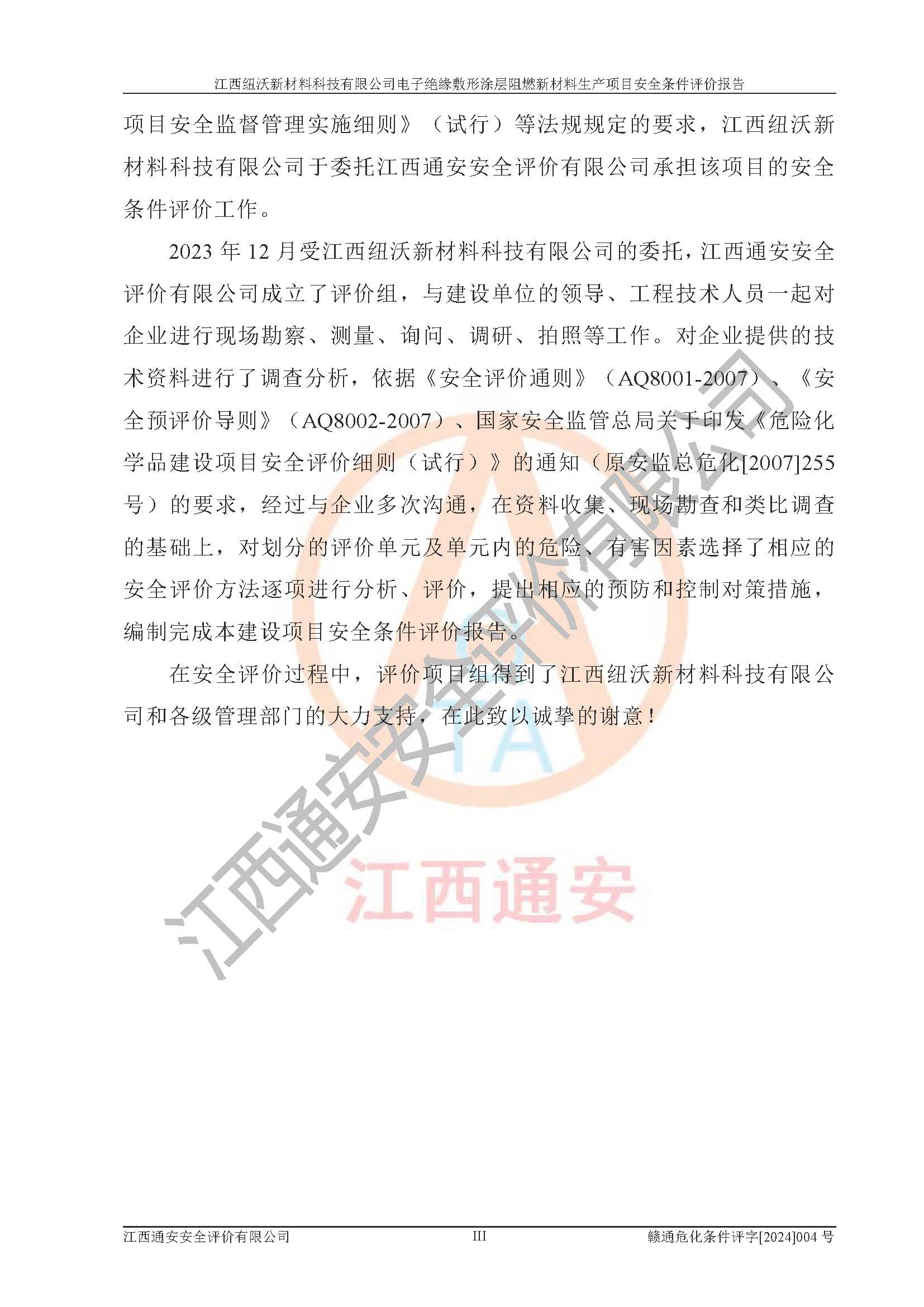 1)本項(xiàng)目依法取得了《江西省企業(yè)投資項(xiàng)目備案通知書》、《建設(shè)用地規(guī)劃許可證》,符合地方產(chǎn)業(yè)發(fā)展規(guī)劃的要求。 2)根據(jù)《**安全監(jiān)管總局關(guān)于公布首批重點(diǎn)監(jiān)管的危險(xiǎn)化工工藝目錄的通知》(安監(jiān)總管三[2009]116號)和《**安全監(jiān)管總局關(guān)于公布第二批重點(diǎn)監(jiān)管危險(xiǎn)化工工藝目錄和調(diào)整首批重點(diǎn)監(jiān)管危險(xiǎn)化工工藝中部分典型工藝的通知》(安監(jiān)總管三[2013]3號),該項(xiàng)目未涉及重點(diǎn)監(jiān)管危險(xiǎn)化工工藝。 3)根據(jù)《危險(xiǎn)化學(xué)品重大危險(xiǎn)源辨識》(GB18218-2018),該項(xiàng)目未構(gòu)成危險(xiǎn)化學(xué)品重大危險(xiǎn)源。 4)項(xiàng)目存在的主要危險(xiǎn)因素有:火災(zāi)爆炸、容器爆炸、中毒窒息、灼燙、觸電、**傷害、機(jī)械傷害、高處墜落、物體打擊、淹溺等,存在的主要危害因素有:噪聲與振動、高溫、有害化學(xué)物質(zhì)等;引起事故的原因有人的不安全行為、物的不安全狀態(tài)、管理缺陷和環(huán)境不良。其中*主要的危險(xiǎn)有害因素是火災(zāi)爆炸。 5)采用預(yù)先危險(xiǎn)性分析法評價(jià),結(jié)果為: (1)通過預(yù)先危險(xiǎn)(PHA)分析可知,項(xiàng)目廠址及總體布局單元存在周邊環(huán)境相互影響,發(fā)生異常情況,可對周邊企業(yè)生產(chǎn)經(jīng)營活動、人員活動產(chǎn)生影響;存在自然條件影響,可因雷擊、暴雨等引起事故;存在**傷害、建筑物危害,其固有的危險(xiǎn)性等級為Ⅱ級,屬于“臨界的”,應(yīng)予以排除、采取控制措施因素。 (2)生產(chǎn)作業(yè)存在的危險(xiǎn)因素包括火災(zāi)爆炸、觸電、灼燙、中毒窒息固有的危險(xiǎn)等級為Ⅲ級,屬于“危險(xiǎn)的”,可能導(dǎo)致人員傷亡和系統(tǒng)損壞的因素,需要采取防范和對策措施的因素;其它危險(xiǎn)因素固有的危險(xiǎn)等級為Ⅱ級,屬于“臨界的”,應(yīng)予以排除、采取控制措施因素。 (3)生產(chǎn)作業(yè)存在的噪聲、粉塵、高溫、有害化學(xué)物質(zhì)的危險(xiǎn)有害因素等級為Ⅱ級,屬于“臨界的”,應(yīng)予以排除、采取控制措施因素。 6)危險(xiǎn)度評價(jià)分析,結(jié)果為: 生產(chǎn)裝置危險(xiǎn)度評價(jià)分析:101生產(chǎn)車間為**危險(xiǎn)(Ⅰ級)。 儲存單元危險(xiǎn)度評價(jià)分析:202甲類倉庫為**危險(xiǎn)(Ⅰ級),201丙類倉庫為低度危險(xiǎn)(Ⅲ級)。 7)作業(yè)條件危險(xiǎn)性評價(jià)結(jié)果:在選定的評價(jià)單元中,其危險(xiǎn)分值均在70以下,危險(xiǎn)程度基本屬于“可能危險(xiǎn)”、“稍有危險(xiǎn)”范圍,作業(yè)條件相對安全。企業(yè)經(jīng)營過程中首先應(yīng)重點(diǎn)加強(qiáng)對甲類車間、甲類倉庫的危險(xiǎn)因素的嚴(yán)格控制,注重日常安全管理;其次要建立健全完善的安全生產(chǎn)責(zé)任制、安全管理制度、安全技術(shù)操作規(guī)程并**其貫徹落實(shí);第三要認(rèn)真抓好操作人員、管理人員的安全知識和操作技能的培訓(xùn),**人員具有與工程技術(shù)水平相適應(yīng)的技術(shù)素質(zhì)和安全素質(zhì),**安全作業(yè)。 8)項(xiàng)目建設(shè)場地符合當(dāng)?shù)匾?guī)劃要求,建設(shè)場地通過合理規(guī)劃,其選址、周邊環(huán)境、總平面布置、交通運(yùn)輸?shù)饶芊稀吨腥A人民共和國安全生產(chǎn)法》、《危險(xiǎn)化學(xué)品安全管理?xiàng)l例》、《建筑設(shè)計(jì)防火規(guī)范》、《精細(xì)化工企業(yè)工程設(shè)計(jì)防火標(biāo)準(zhǔn)》等法規(guī)、標(biāo)準(zhǔn)、規(guī)范要求。 廠址地區(qū)地震活動相對較弱,災(zāi)害性天氣出現(xiàn)頻率稍高,自然災(zāi)害對項(xiàng)目建設(shè)具有**影響,通過采取相應(yīng)的防護(hù)措施,自然條件適宜建設(shè)。 9)建設(shè)項(xiàng)目符合**產(chǎn)業(yè)政策的要求;選擇工藝為現(xiàn)行成熟工藝,其安全可靠性可得到**。 10)本報(bào)告已根據(jù)有關(guān)安全生產(chǎn)法律、法規(guī)、規(guī)章和**標(biāo)準(zhǔn)、行業(yè)標(biāo)準(zhǔn),并嚴(yán)格執(zhí)行省委辦公廳省**辦公廳《關(guān)于全面加強(qiáng)危險(xiǎn)化學(xué)品安全生產(chǎn)工作的實(shí)施意見》(贛辦發(fā)[2020]32號)及鄱陽湖生態(tài)經(jīng)濟(jì)區(qū)、長江經(jīng)濟(jì)帶、“五河一湖”相關(guān)政策規(guī)定,客觀、公正、科學(xué)地進(jìn)行安全評價(jià),項(xiàng)目符合《江西省應(yīng)急管理廳關(guān)于印發(fā)《江西省危險(xiǎn)化學(xué)品建設(shè)項(xiàng)目安全監(jiān)督管理實(shí)施細(xì)則》(試行)的通知》(贛應(yīng)急字[2021]100號)的要求。 11)本報(bào)告結(jié)合工藝特征,提出應(yīng)采取的對應(yīng)的自動化控制系統(tǒng)及自動化實(shí)施方案,滿足《江西省應(yīng)急管理廳關(guān)于印發(fā)《江西省化工企業(yè)自動化提升實(shí)施方案》(試行)的通知》(贛應(yīng)急字[2021]190號)的要求。 綜上所述:江西紐沃新材料科技有限公司電子*緣敷形涂層阻燃新材料生產(chǎn)項(xiàng)目的產(chǎn)業(yè)政策、安全條件、廠址、總體布局、主要技術(shù)和工藝、裝置、設(shè)施、配套和輔助工程、安全管理等均滿足安全生產(chǎn)相關(guān)法