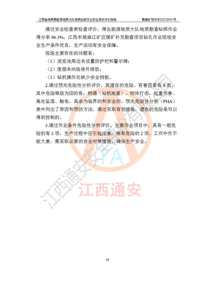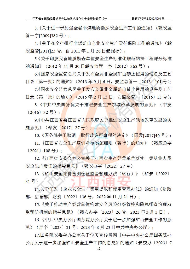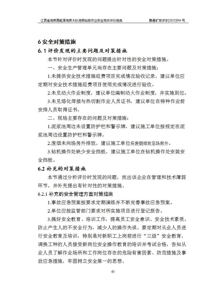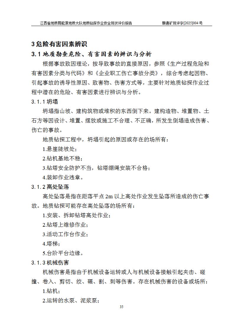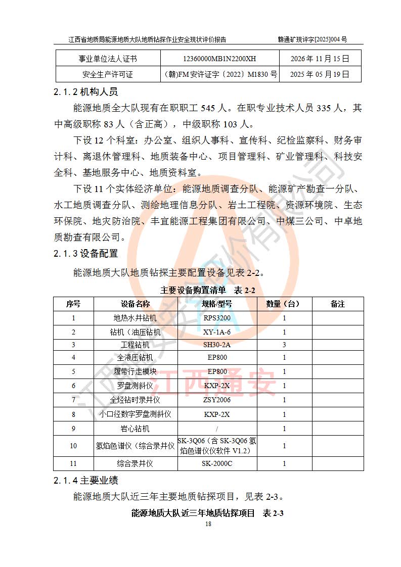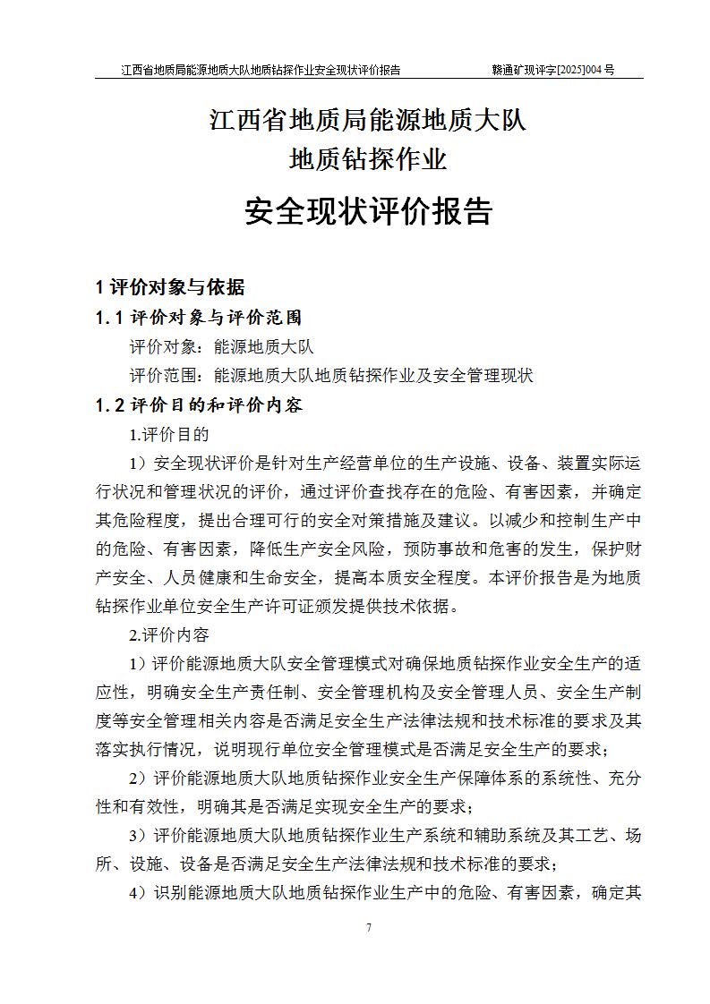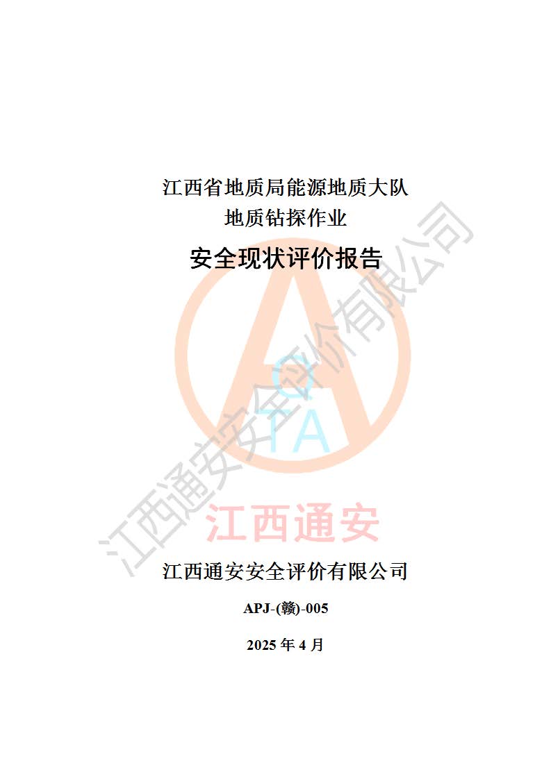 報告名稱 | 江西省地質(zhì)局能源地質(zhì)大隊(duì)地質(zhì)鉆探作業(yè)安全現(xiàn)狀評價報告 | |||||