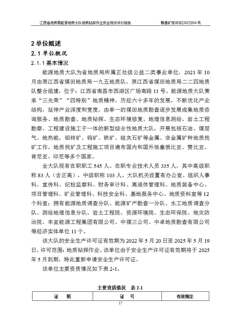 項(xiàng)目簡介 | 江西省地質(zhì)局能源地質(zhì)大隊(duì)(以下簡稱“能源地質(zhì)大隊(duì)”)為省地質(zhì)局所屬正處級公益二類事業(yè)單位,2021年10月由原江西省煤田地質(zhì)局一九五地質(zhì)隊(duì)、原江西省煤田地質(zhì)局二二四地質(zhì)隊(duì)整合組建,位于:江西省南昌市西湖區(qū)廣場南路11號。能源地質(zhì)大隊(duì)秉承“三光榮”“四特別”地質(zhì)精神,歷經(jīng)六十多年的發(fā)展,不斷優(yōu)化產(chǎn)業(yè)結(jié)構(gòu),延伸產(chǎn)業(yè)深度和寬度,由單一的煤田地質(zhì)勘查逐步發(fā)展成集地質(zhì)咨詢服務(wù)、地質(zhì)勘查、地質(zhì)鉆探、生態(tài)環(huán)境修復(fù)、地理信息測繪、巖土工程勘察、工程建設(shè)施工于一體的新型綜合性地質(zhì)大隊(duì),開展包括石油、煤層氣、地?zé)崮?,鉛鋅礦、鎢礦、鐵礦、硅灰石礦等金屬、非金屬礦種地質(zhì)找礦工作。 能源地質(zhì)大隊(duì)現(xiàn)有在職職工545人。在職專業(yè)技術(shù)人員335人,其中高級職稱83人(含正高),中級職稱103人。大隊(duì)機(jī)關(guān)設(shè)置有辦公室、組織人事科、宣傳科、紀(jì)檢監(jiān)察科、財(cái)務(wù)審計(jì)科、離退休管理科、地質(zhì)裝備中心、項(xiàng)目管理科、礦業(yè)管理科、科技安全科、基地服務(wù)中心、地質(zhì)資料室等12個科室;擁有能源地質(zhì)調(diào)查分隊(duì)、能源礦產(chǎn)勘查一分隊(duì)、水工地質(zhì)調(diào)查分隊(duì)、測繪地理信息分隊(duì)、巖土工程院、資源環(huán)境院、生態(tài)**院、地災(zāi)防治院、豐宜能源工程集團(tuán)有限公司、中煤三公司、中卓地質(zhì)勘查有限公司等經(jīng)濟(jì)實(shí)體單位11個。 該大隊(duì)上一輪安全生產(chǎn)許可證**期為2022年5月20日至2025年5月19日,許可范圍:地質(zhì)鉆探作業(yè)。該單位由于安全生產(chǎn)許可證**期將于2025年5月到期,特此重新申請安全生產(chǎn)許可證。按照《安全生產(chǎn)法》、《礦山安全法》和《關(guān)于做好非煤礦山企業(yè)安全生產(chǎn)許可證延期換證工作的通知》等有關(guān)規(guī)定,該單位在申請安全生產(chǎn)許可證前應(yīng)進(jìn)行安全現(xiàn)狀評價。 | |||||