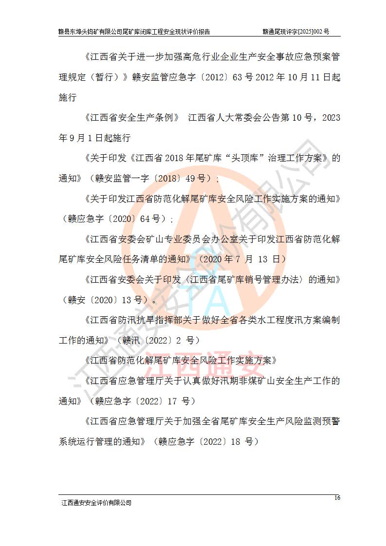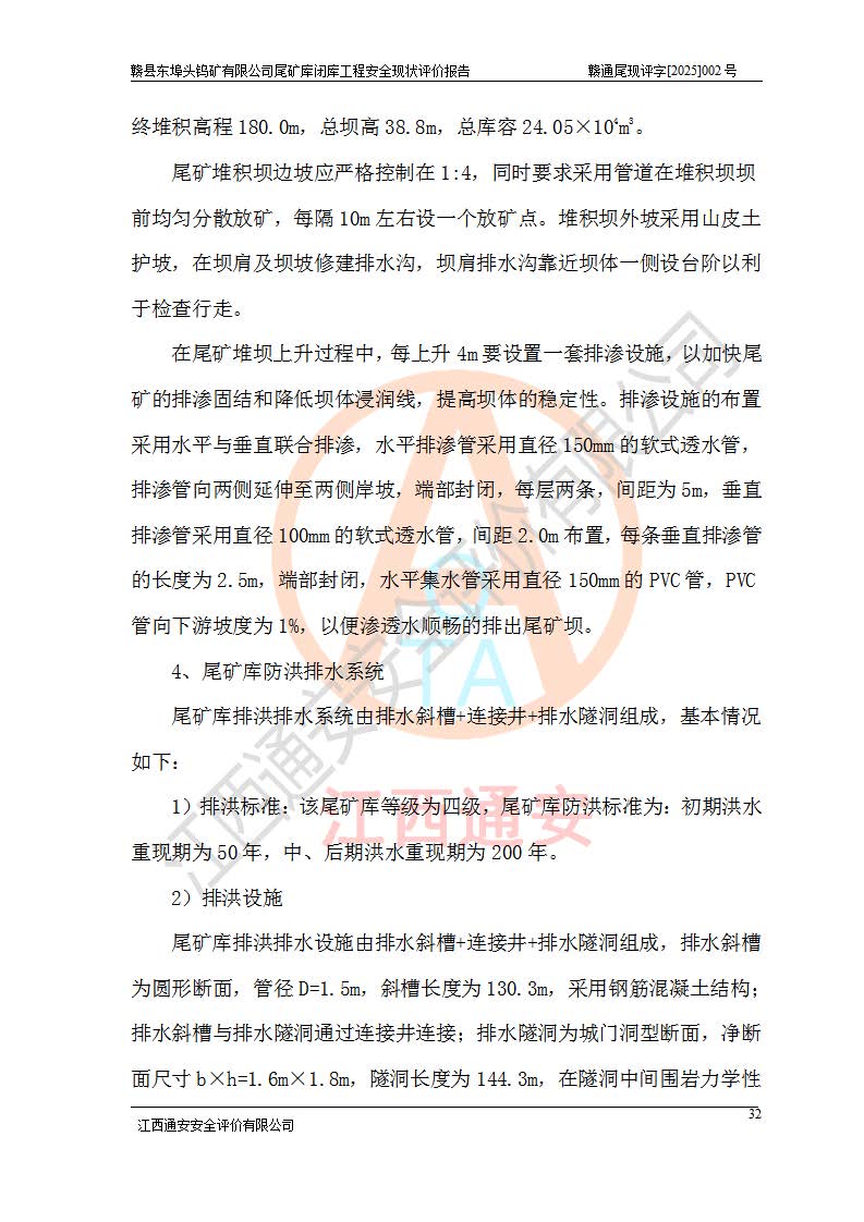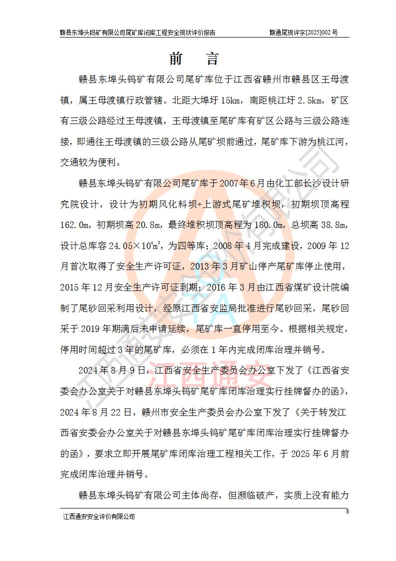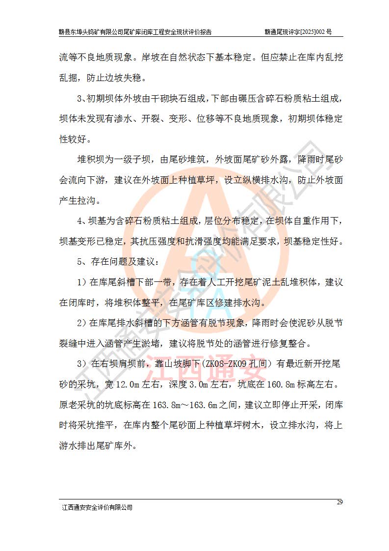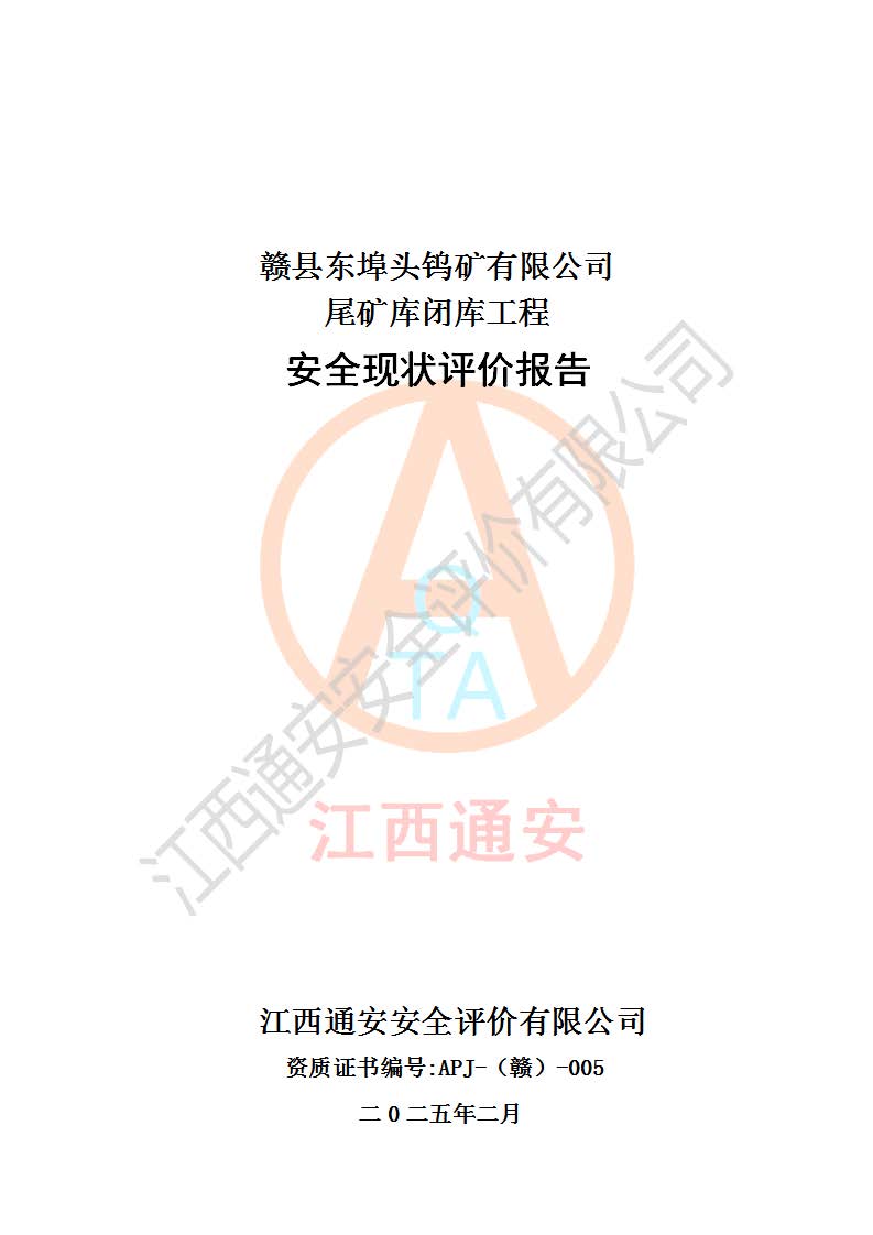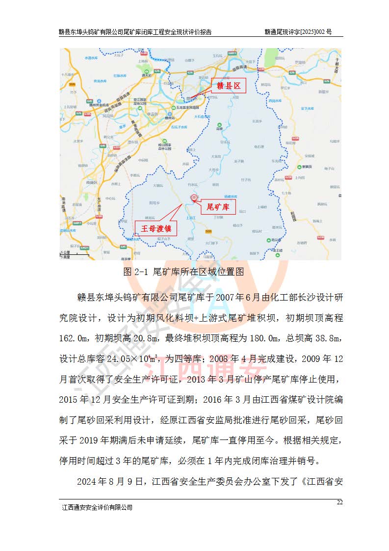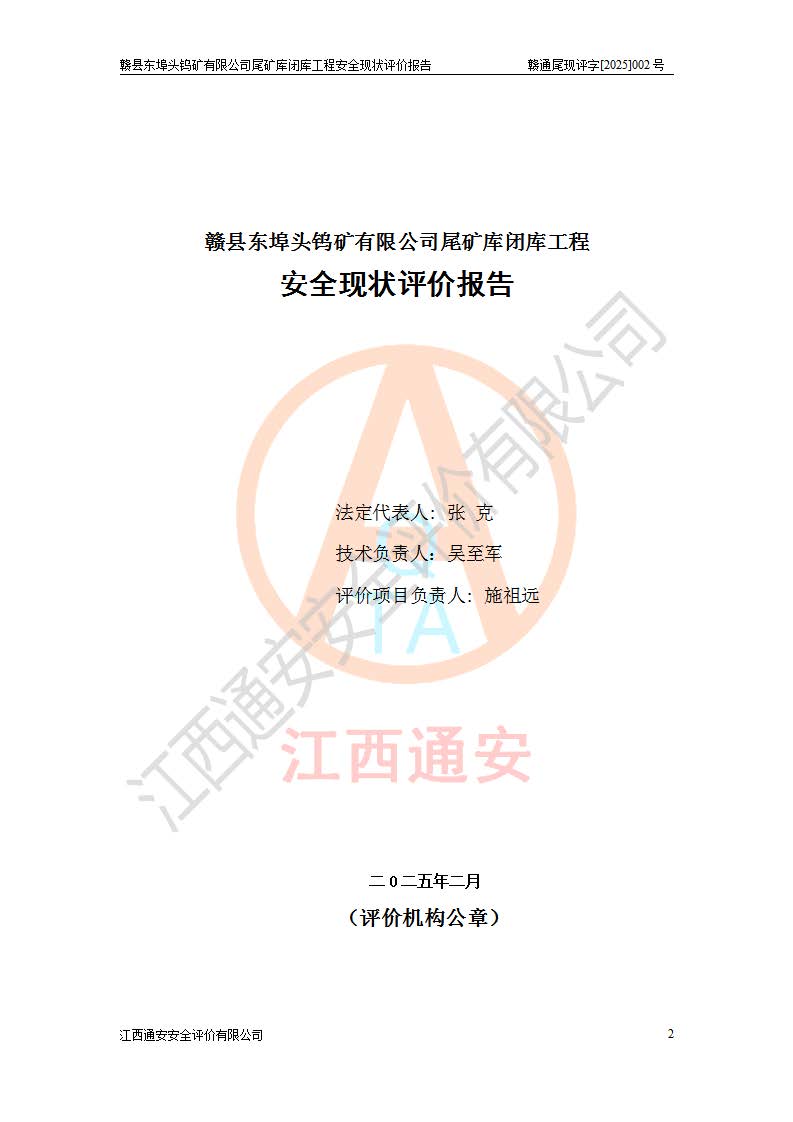 評價報告名稱 | 贛縣東埠頭鎢礦有限公司尾礦庫閉庫工程安全現(xiàn)狀評價報告 | |||