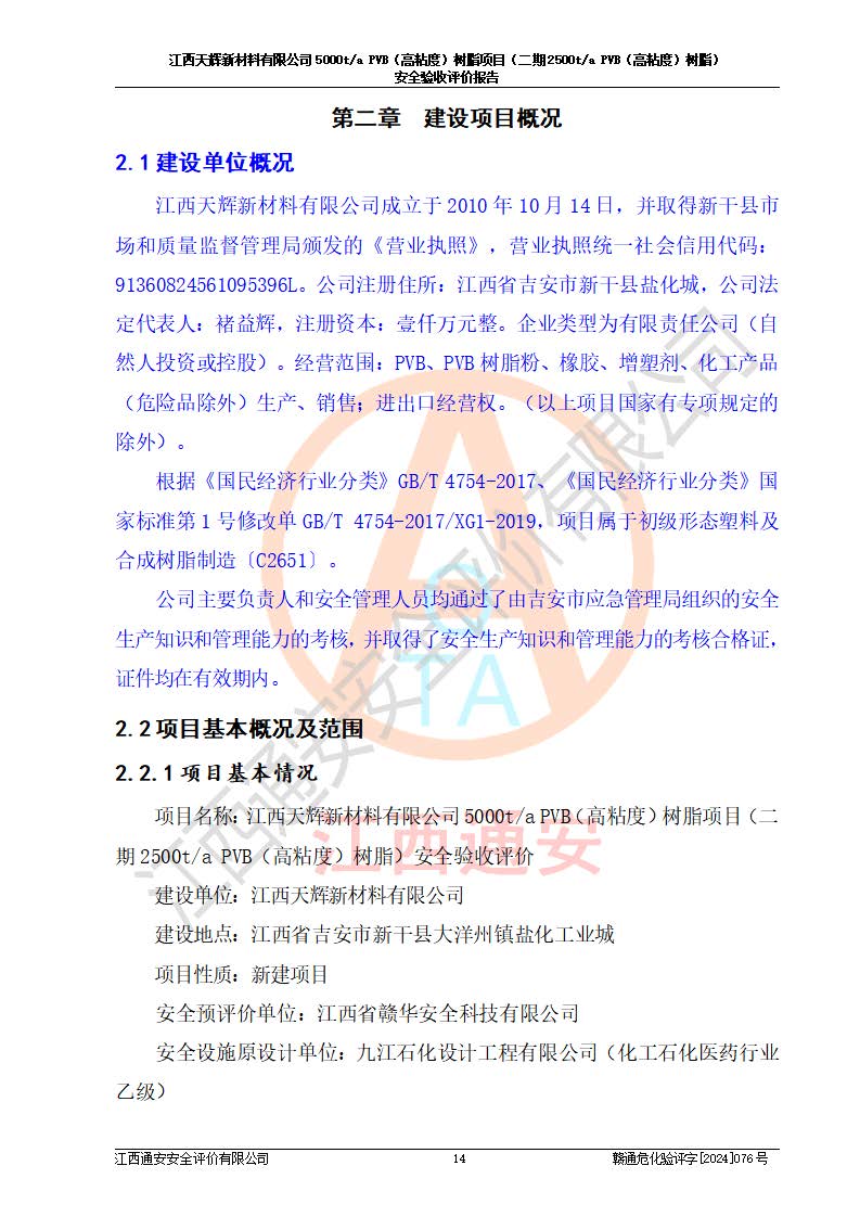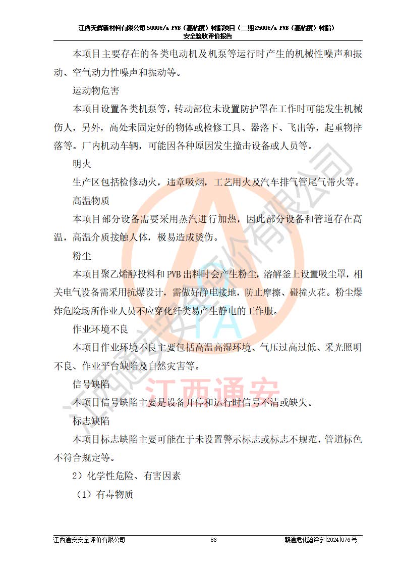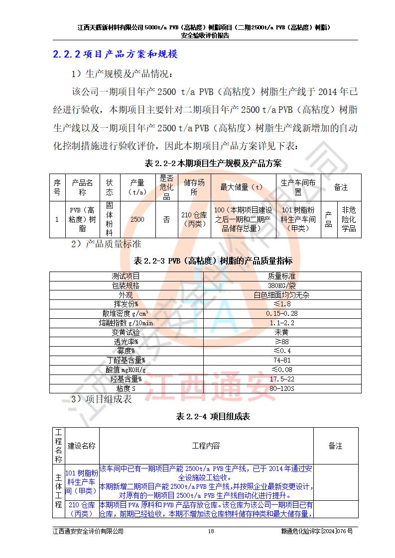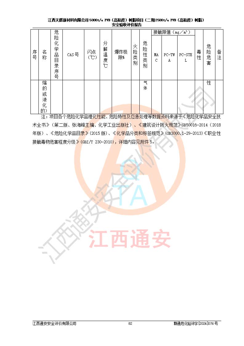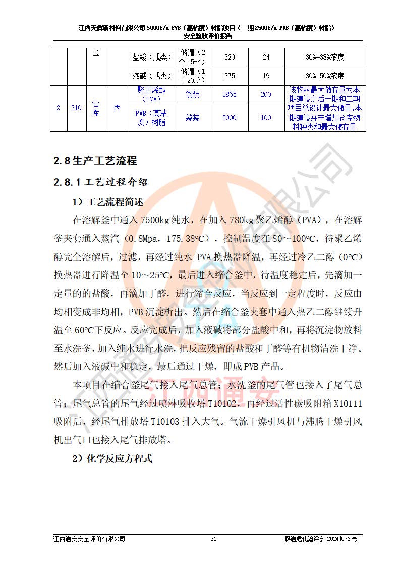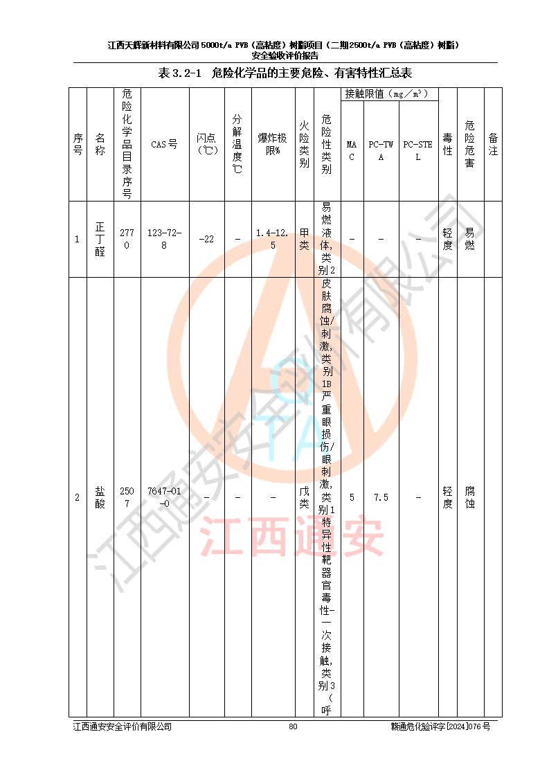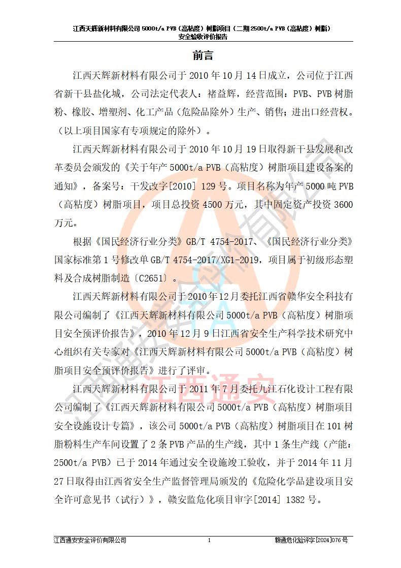 評價報告名稱 | 江西天輝新材料有限公司5000t/a PVB(高粘度)樹脂項目(二期2500t/a PVB(高粘度)樹脂)安全驗收評價報告 | |||