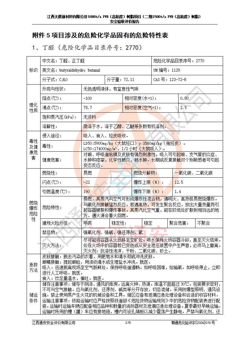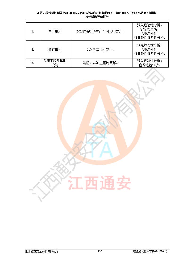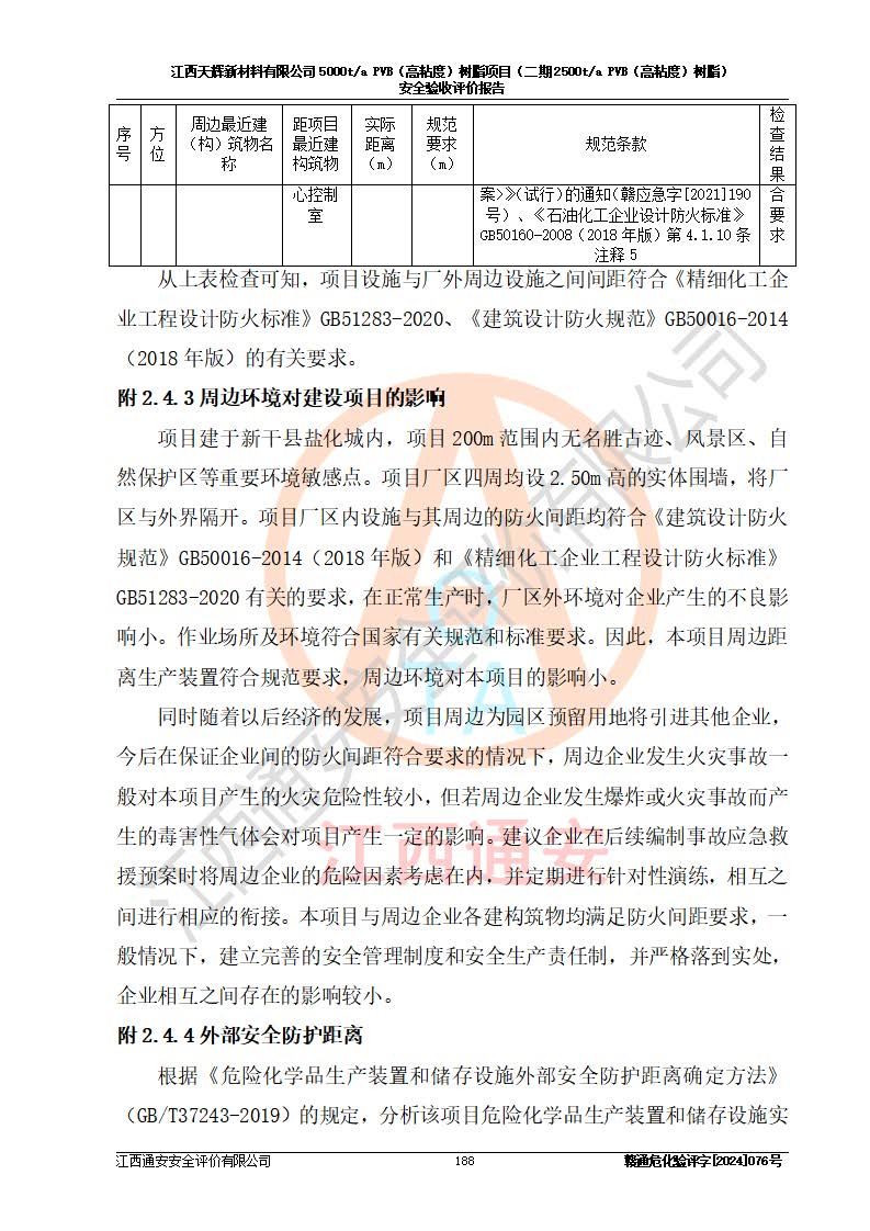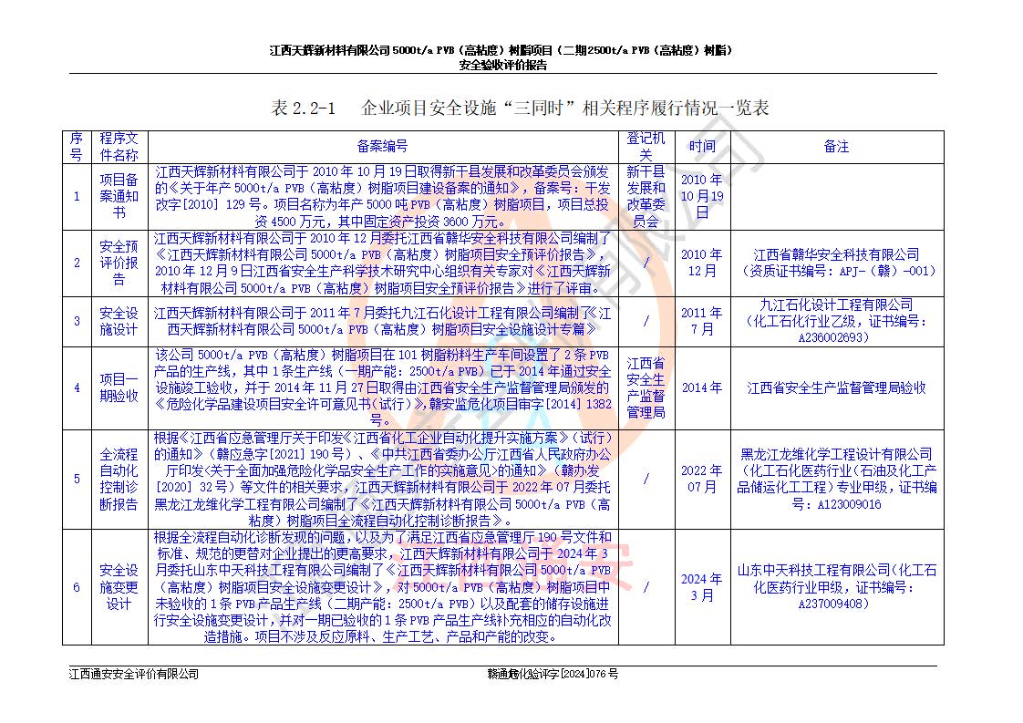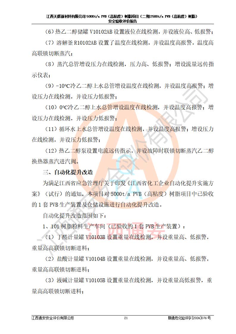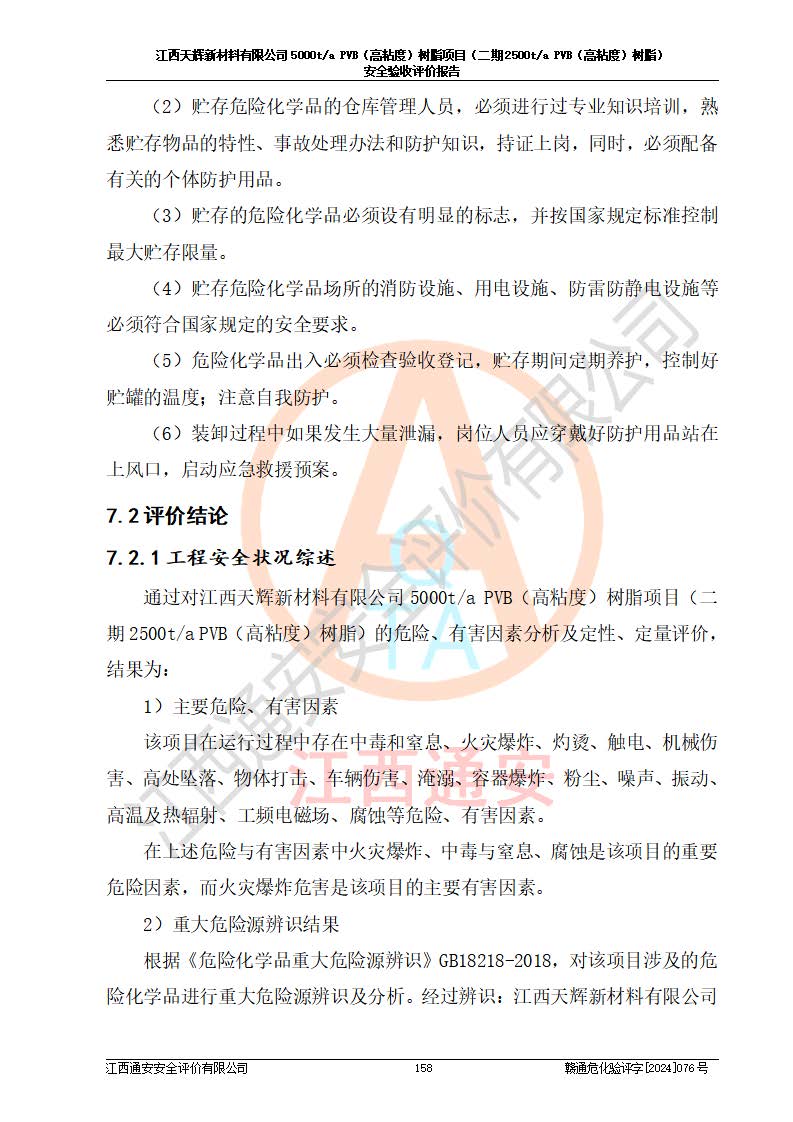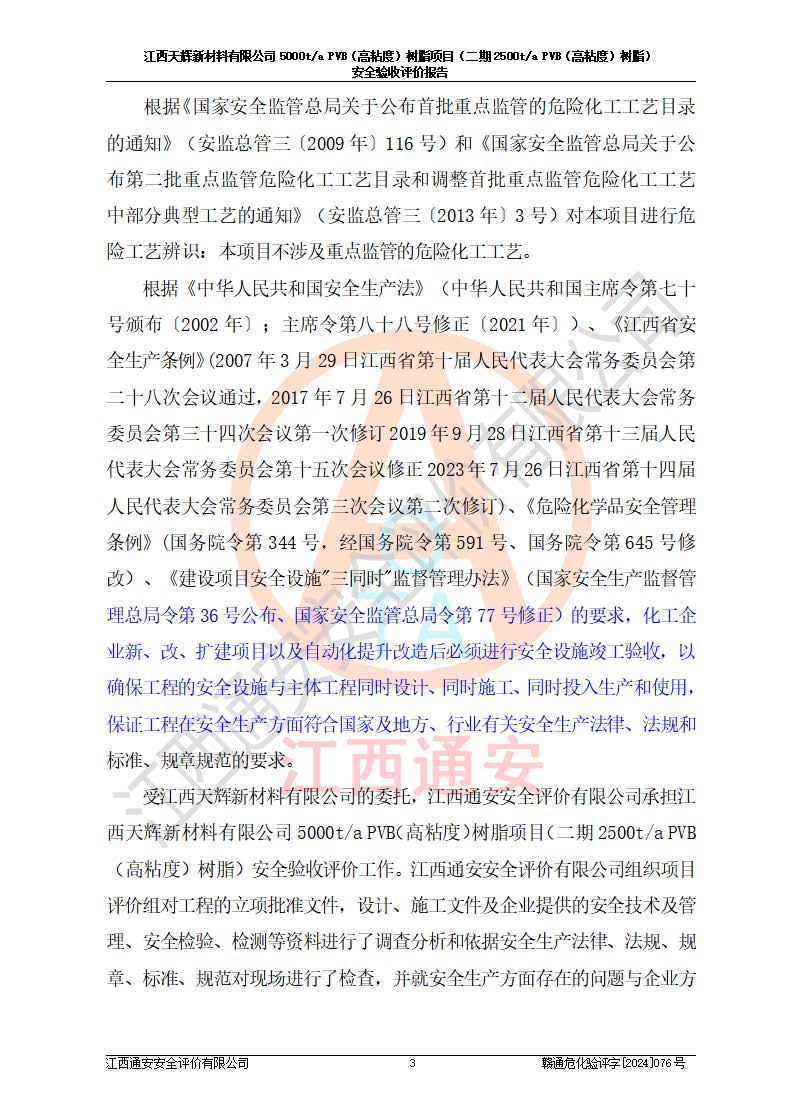 評價報告名稱 | 江西天輝新材料有限公司5000t/a PVB(高粘度)樹脂項目(二期2500t/a PVB(高粘度)樹脂)安全驗收評價報告 | |||