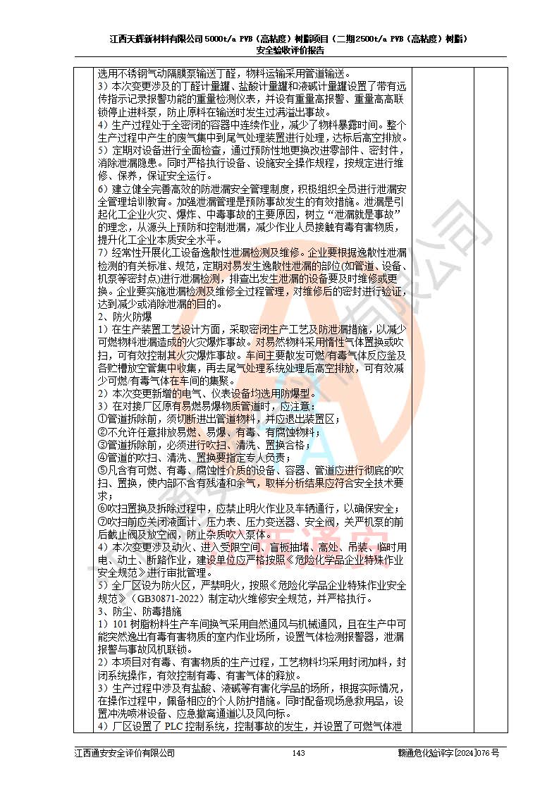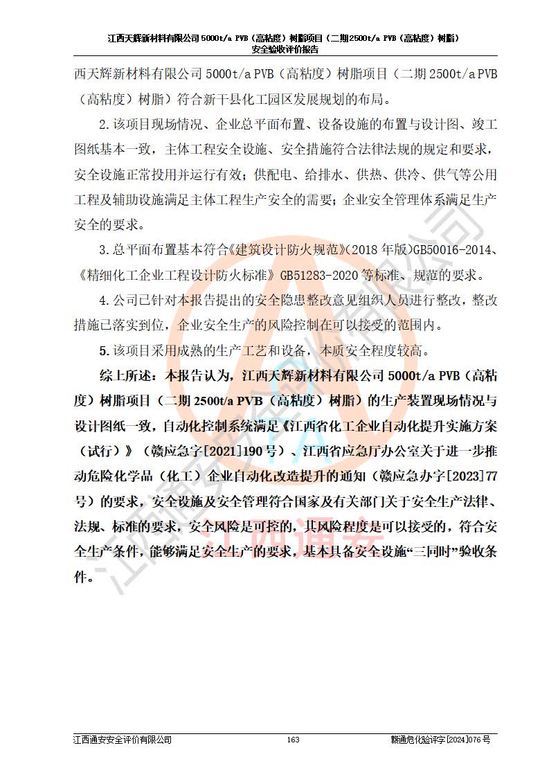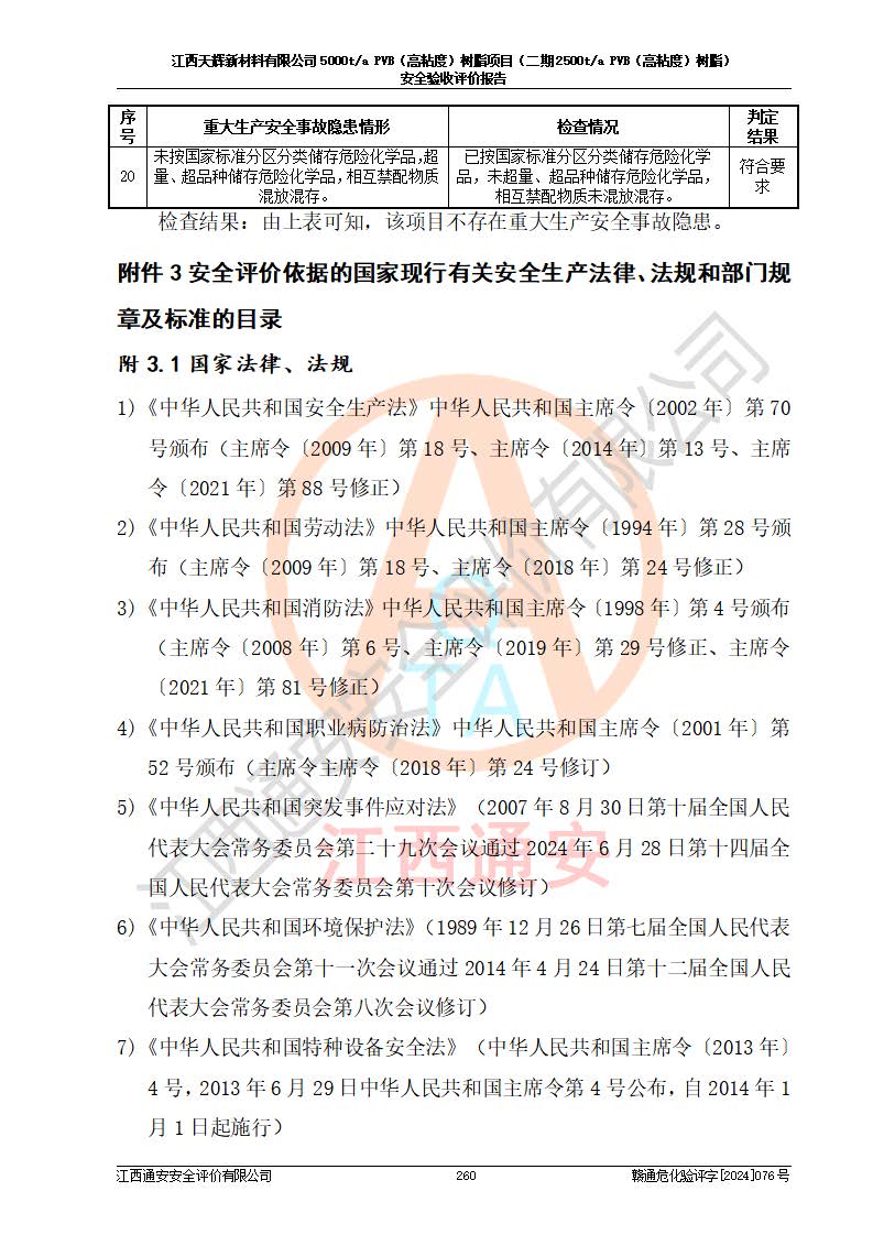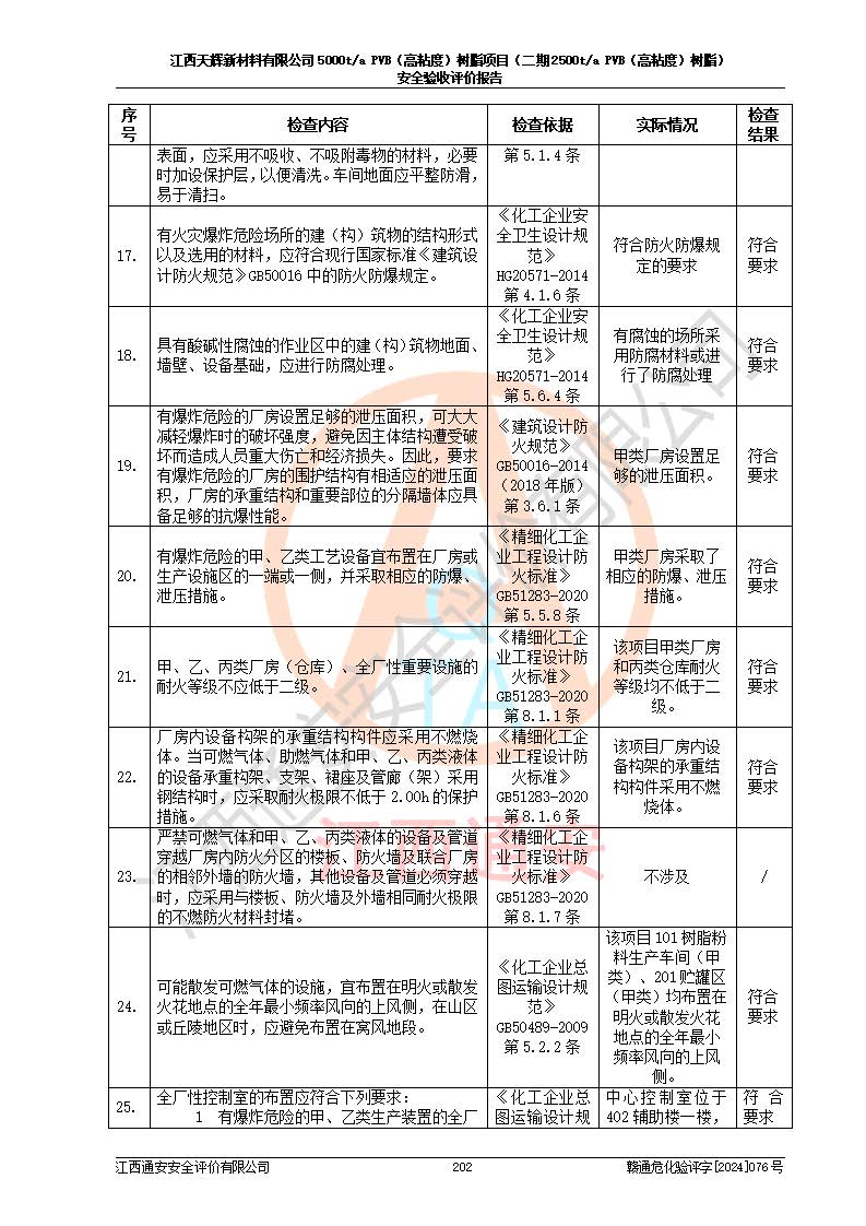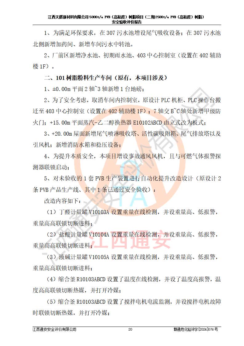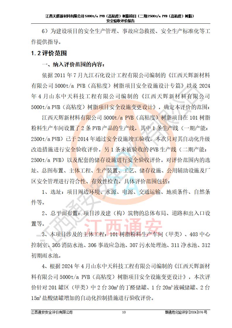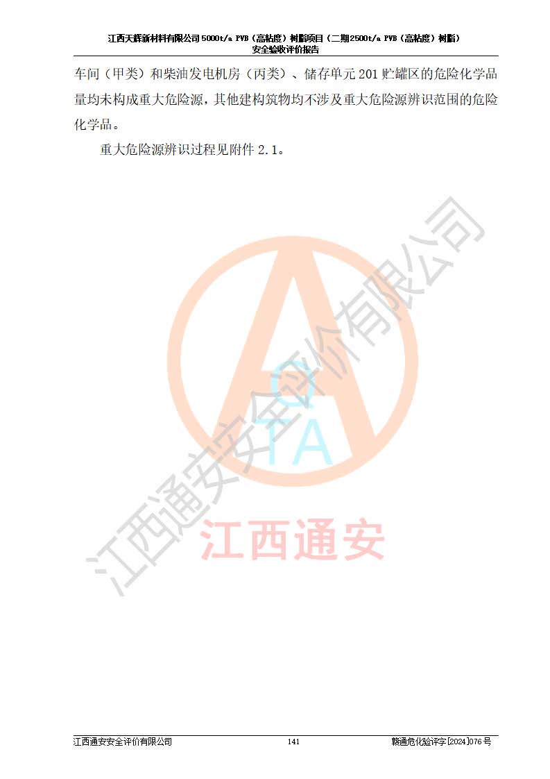 評價報告名稱 | 江西天輝新材料有限公司5000t/a PVB(高粘度)樹脂項目(二期2500t/a PVB(高粘度)樹脂)安全驗收評價報告 | |||