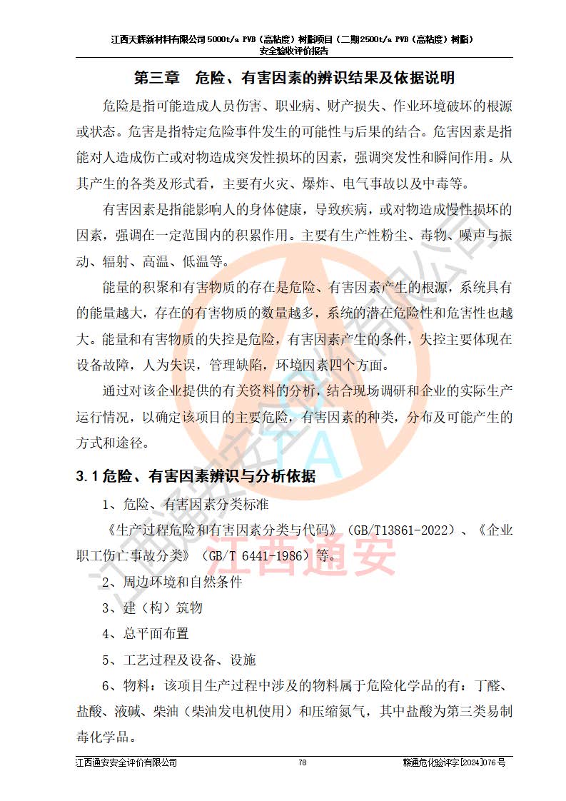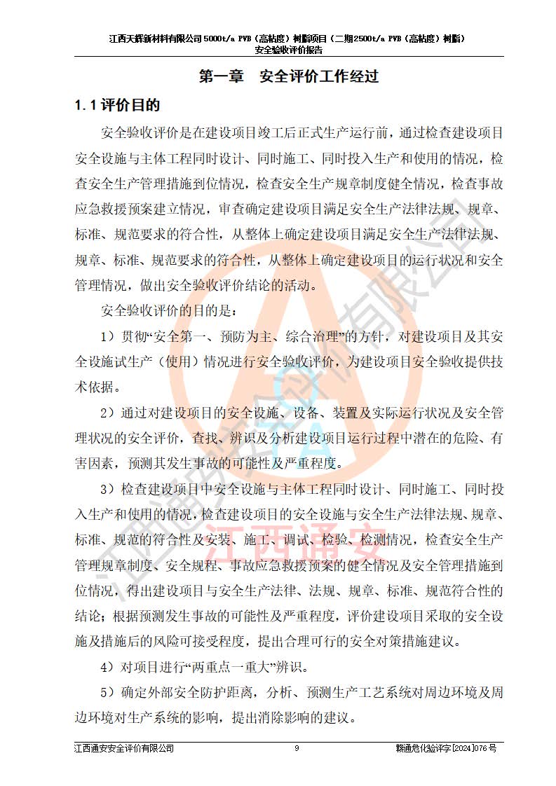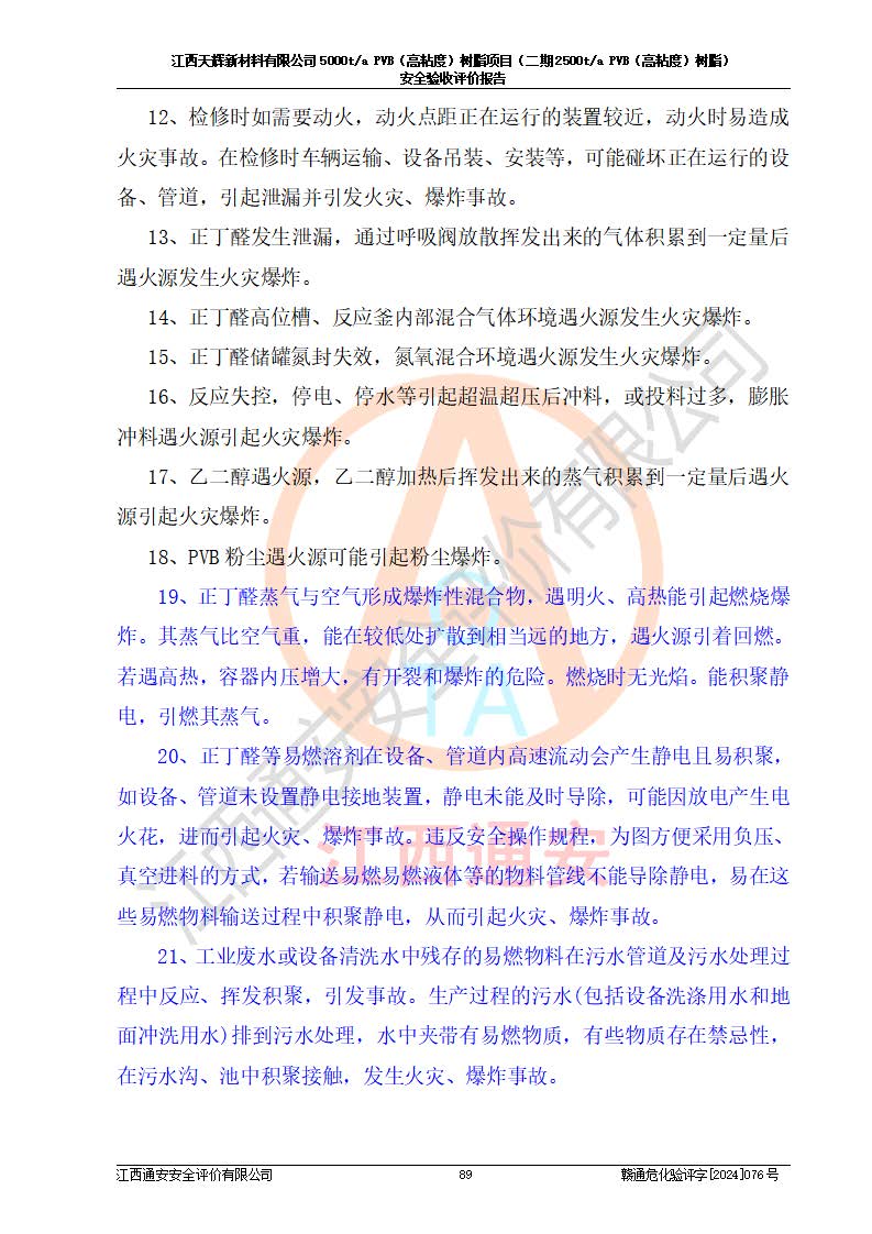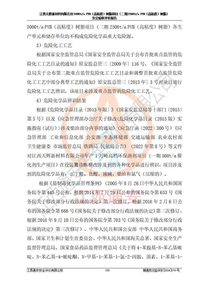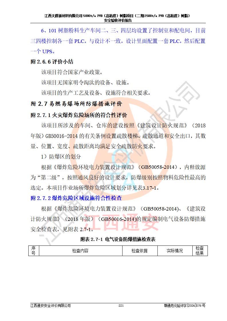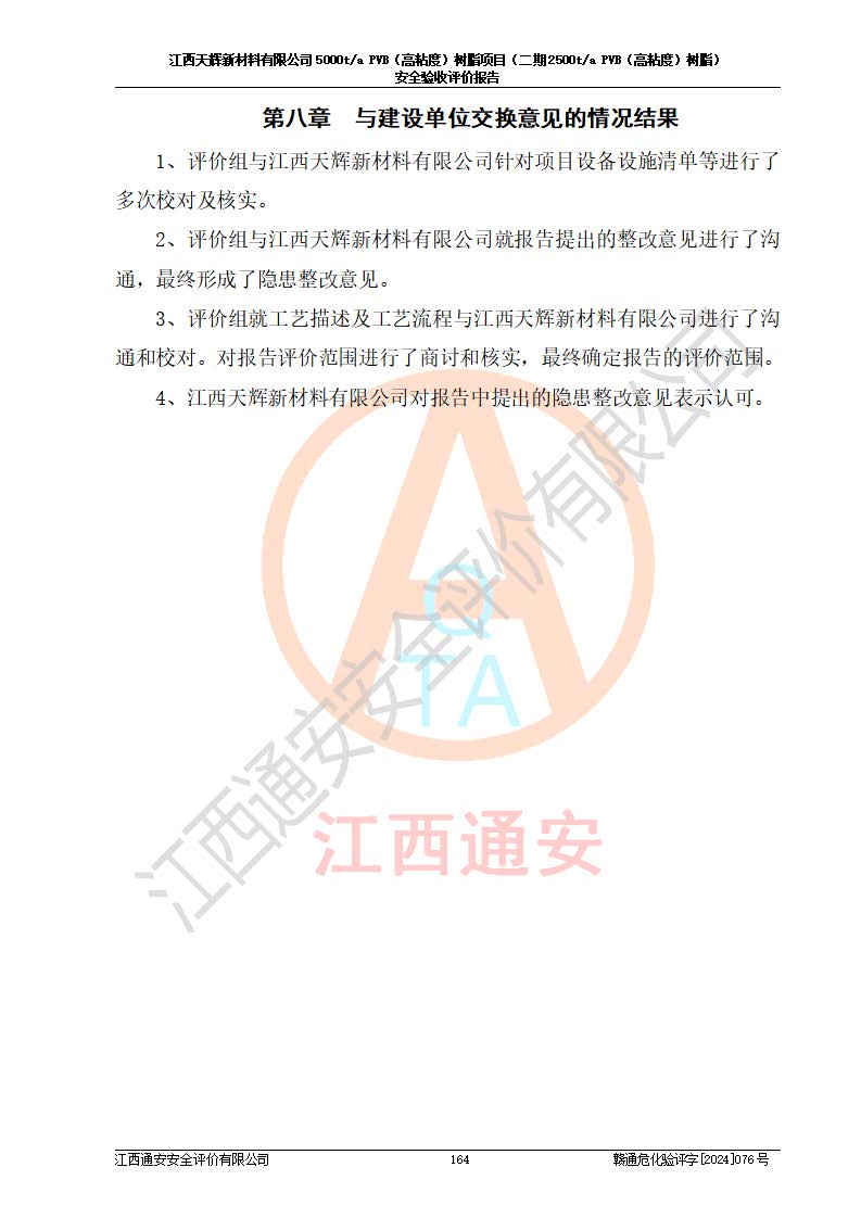 評價報告名稱 | 江西天輝新材料有限公司5000t/a PVB(高粘度)樹脂項目(二期2500t/a PVB(高粘度)樹脂)安全驗收評價報告 | |||