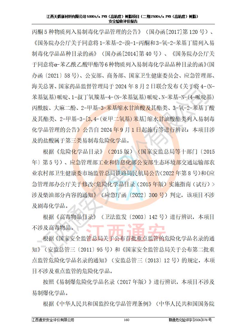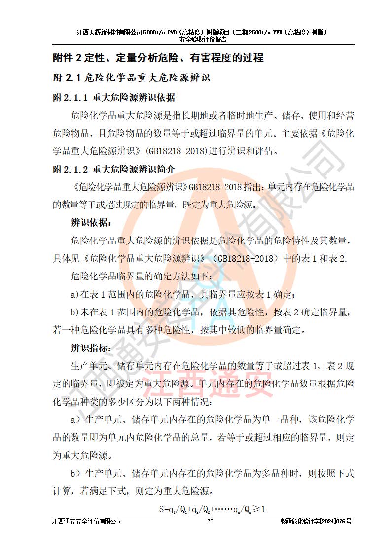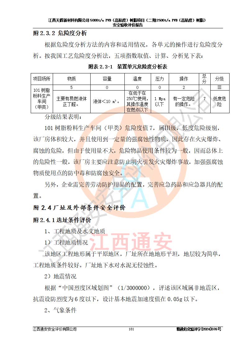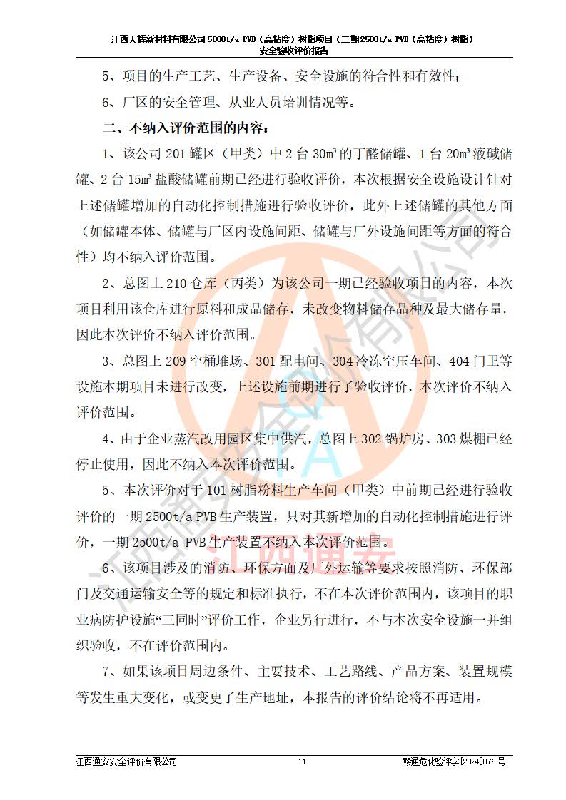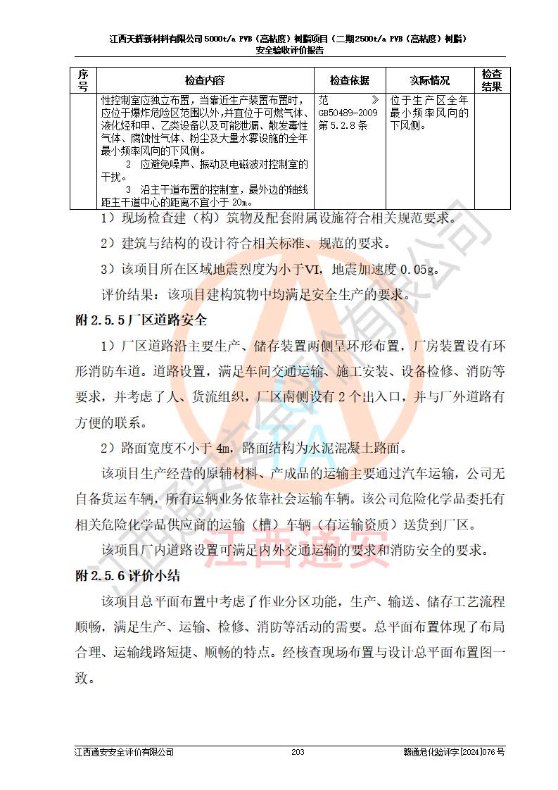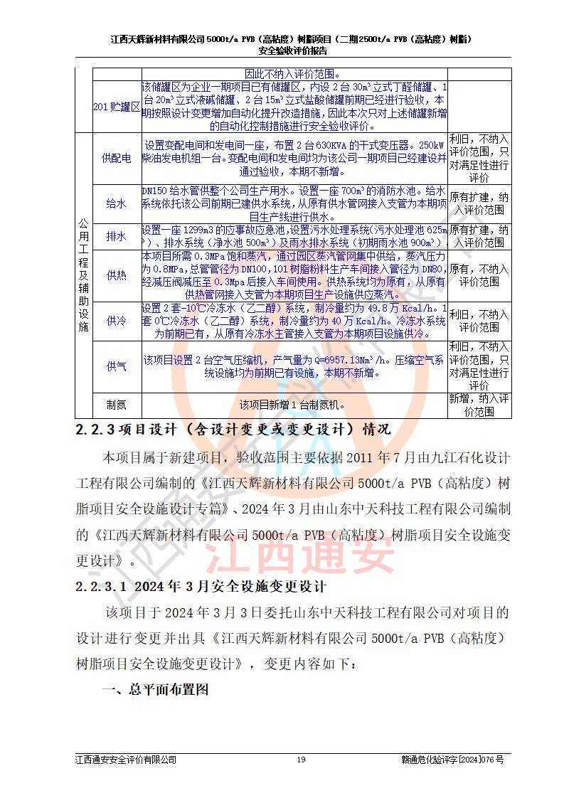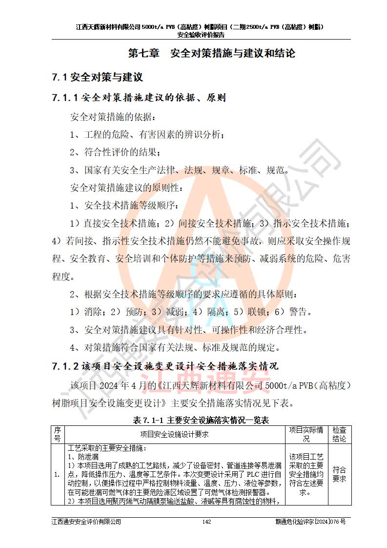 評價報告名稱 | 江西天輝新材料有限公司5000t/a PVB(高粘度)樹脂項目(二期2500t/a PVB(高粘度)樹脂)安全驗收評價報告 | |||