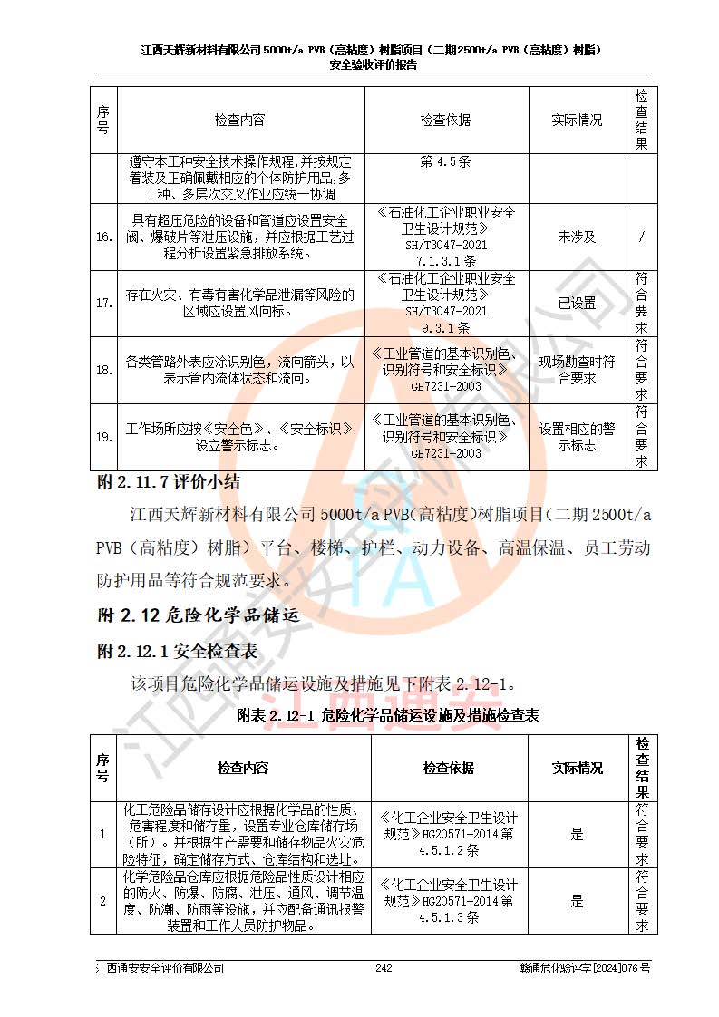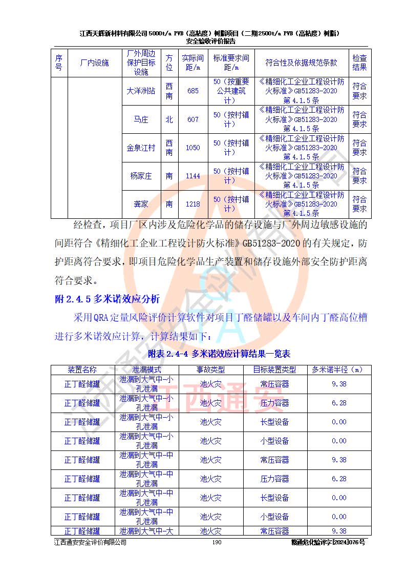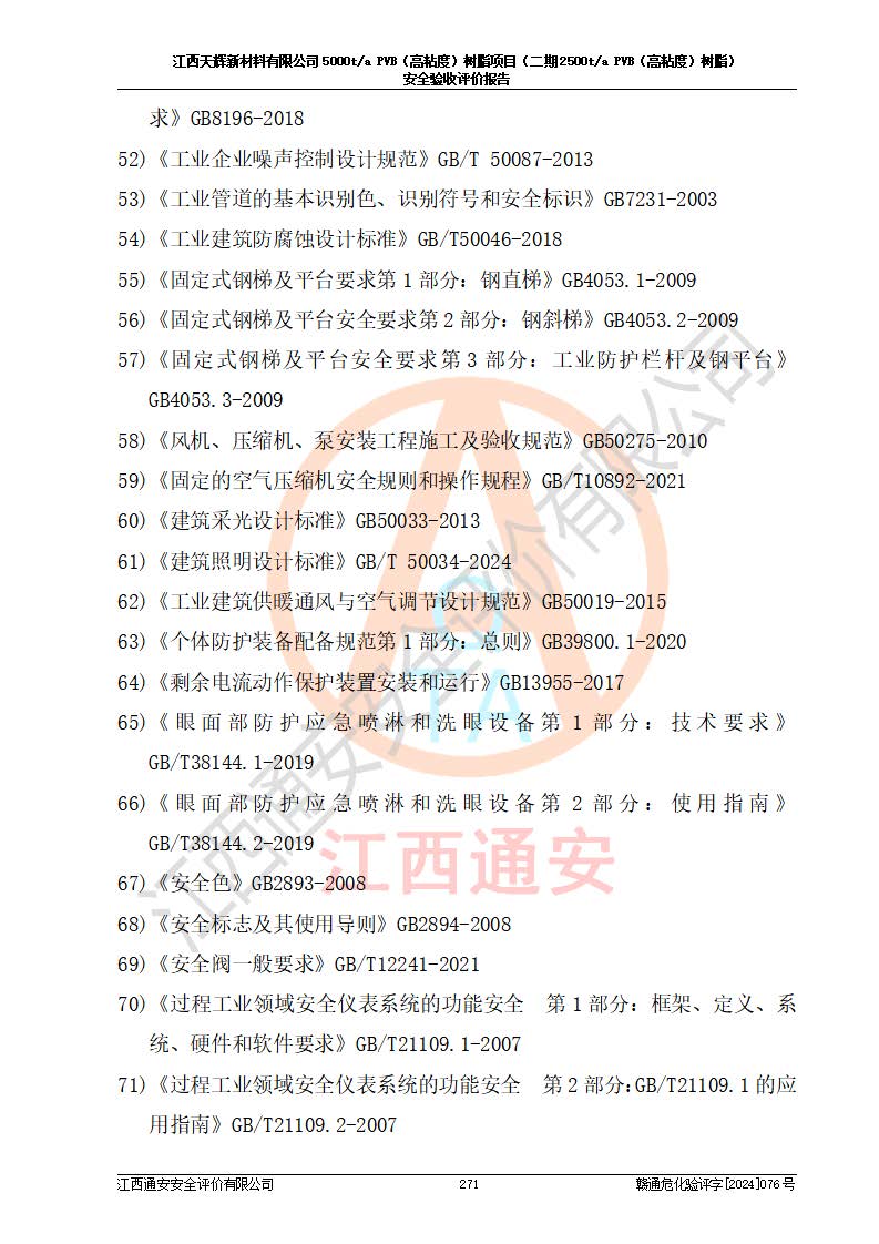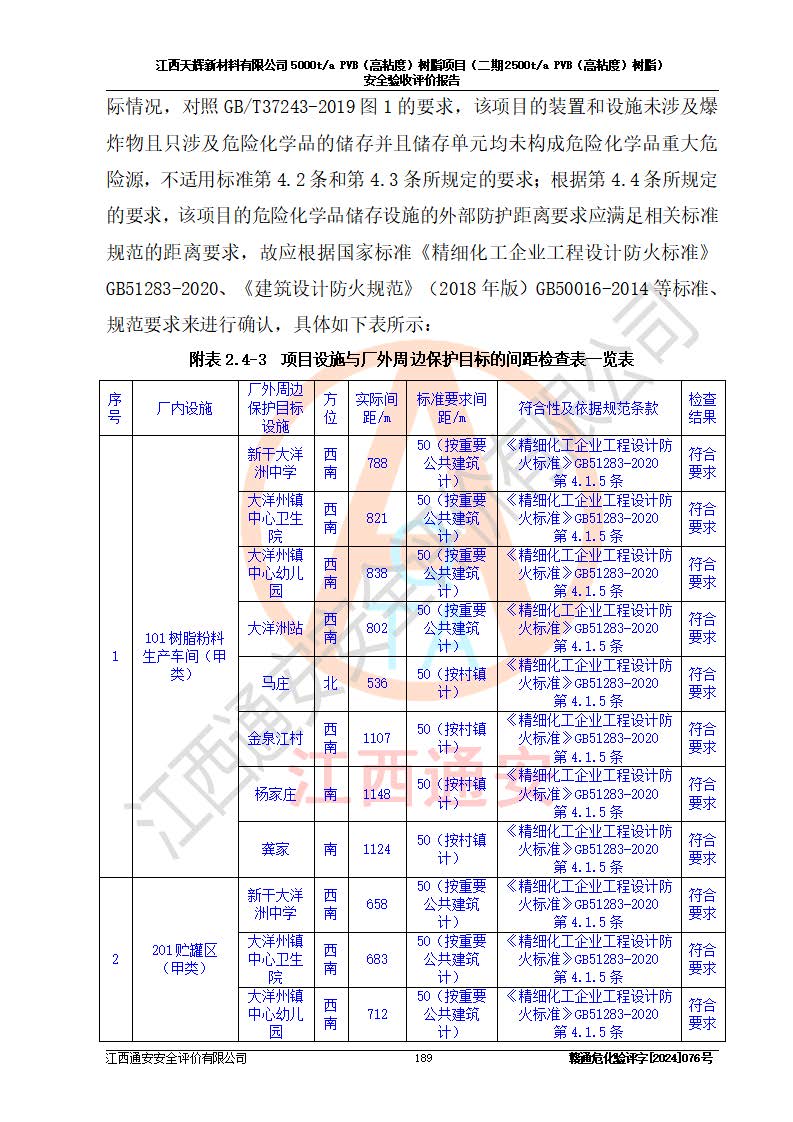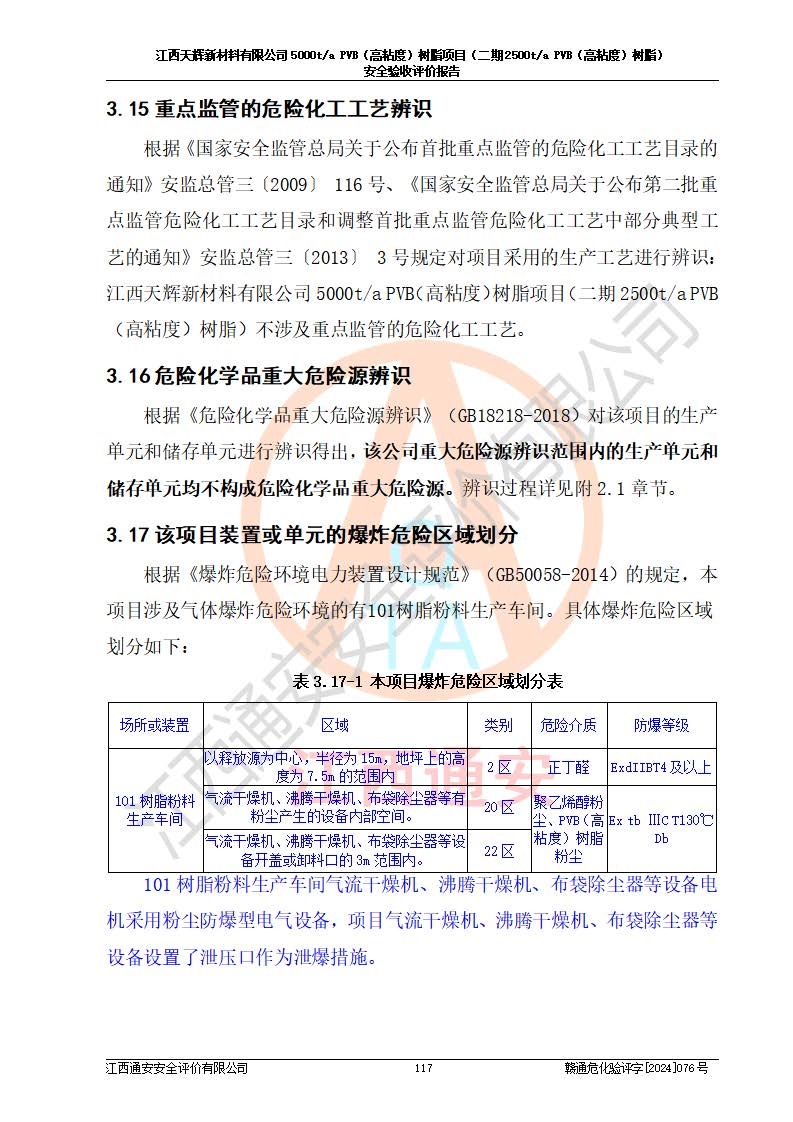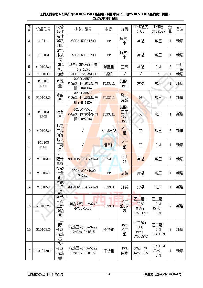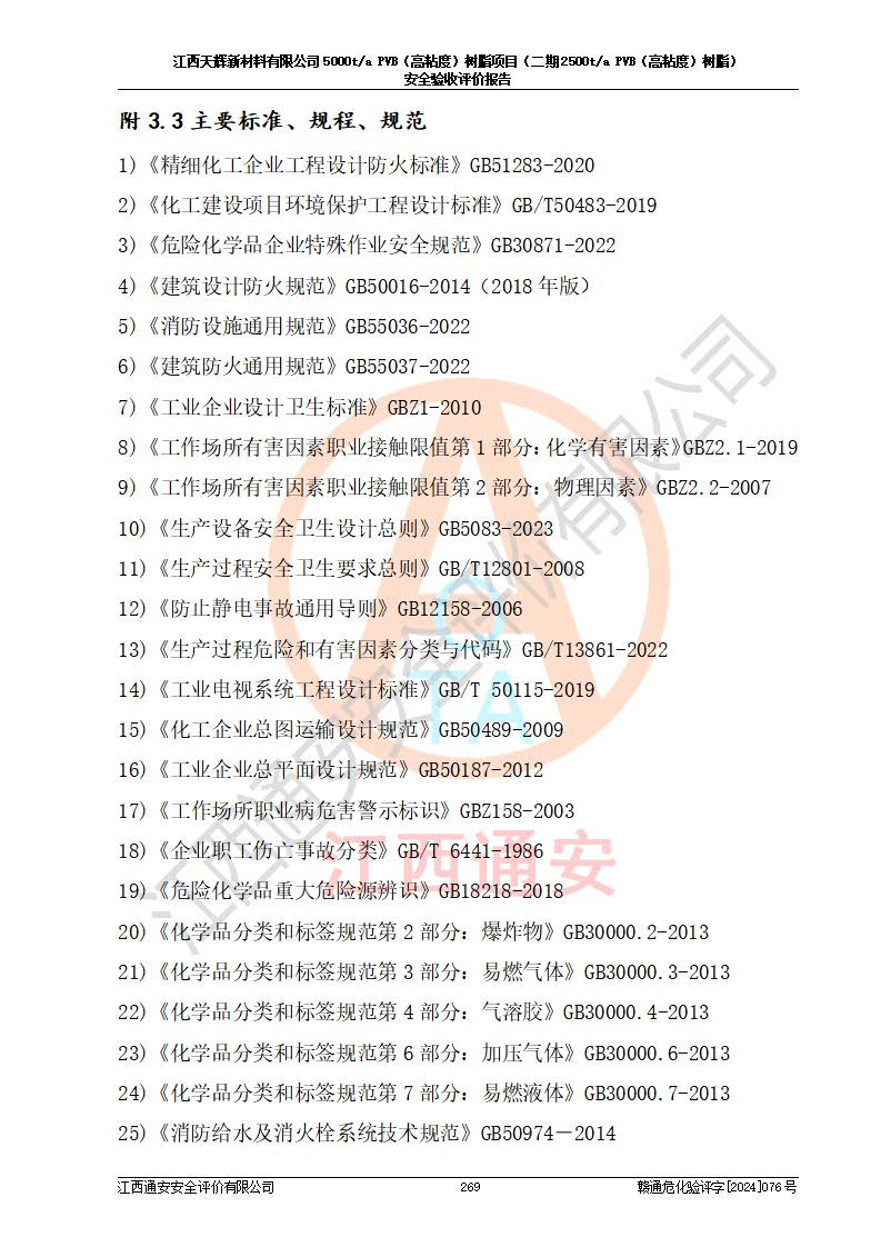 評價報告名稱 | 江西天輝新材料有限公司5000t/a PVB(高粘度)樹脂項目(二期2500t/a PVB(高粘度)樹脂)安全驗收評價報告 | |||
