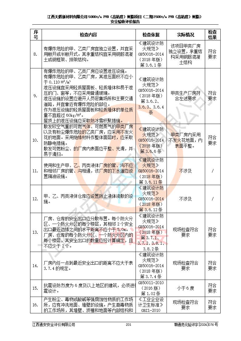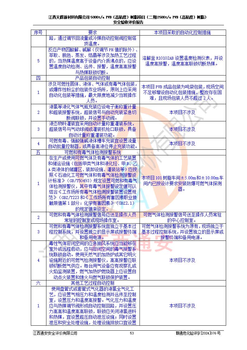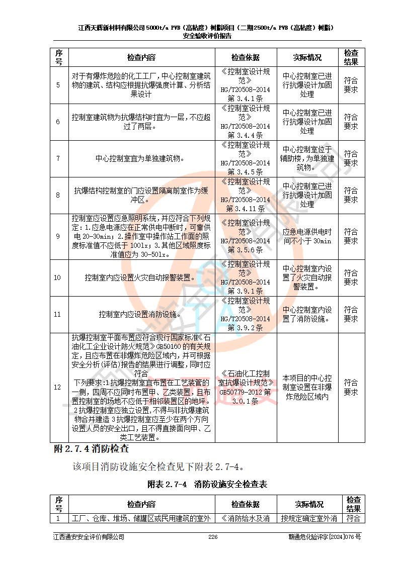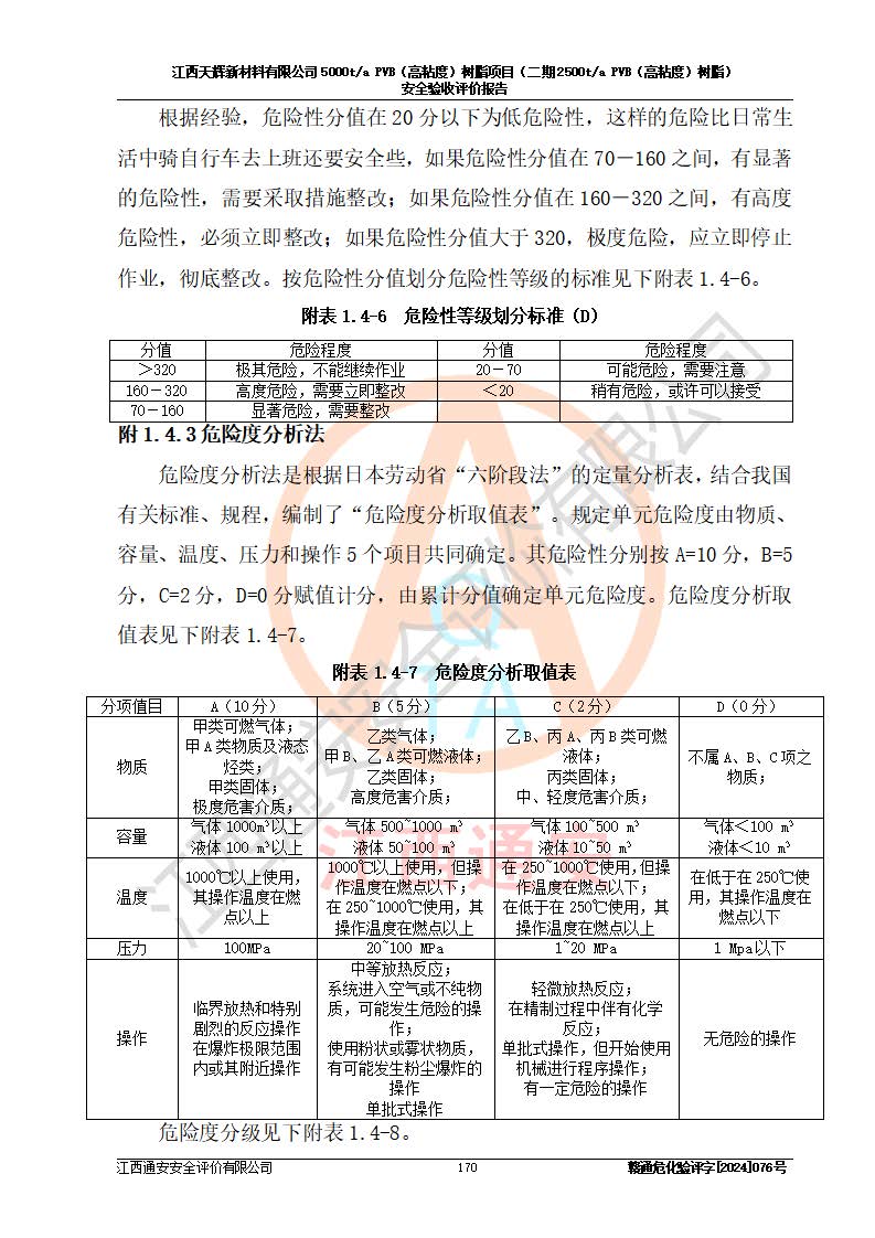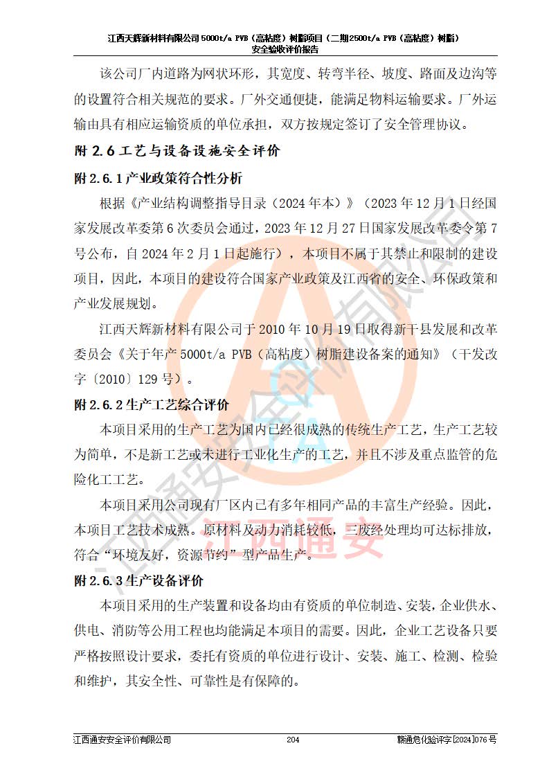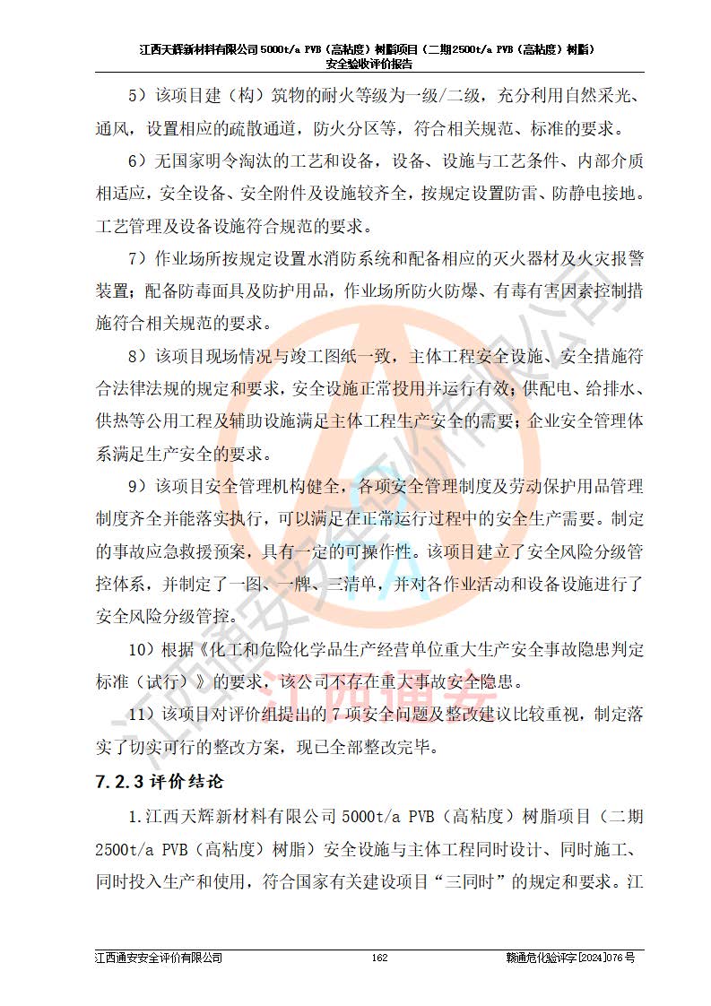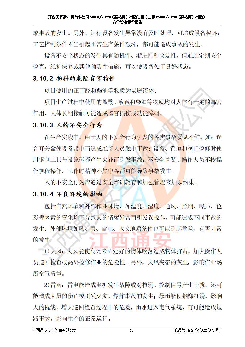 評價報告名稱 | 江西天輝新材料有限公司5000t/a PVB(高粘度)樹脂項目(二期2500t/a PVB(高粘度)樹脂)安全驗收評價報告 | |||