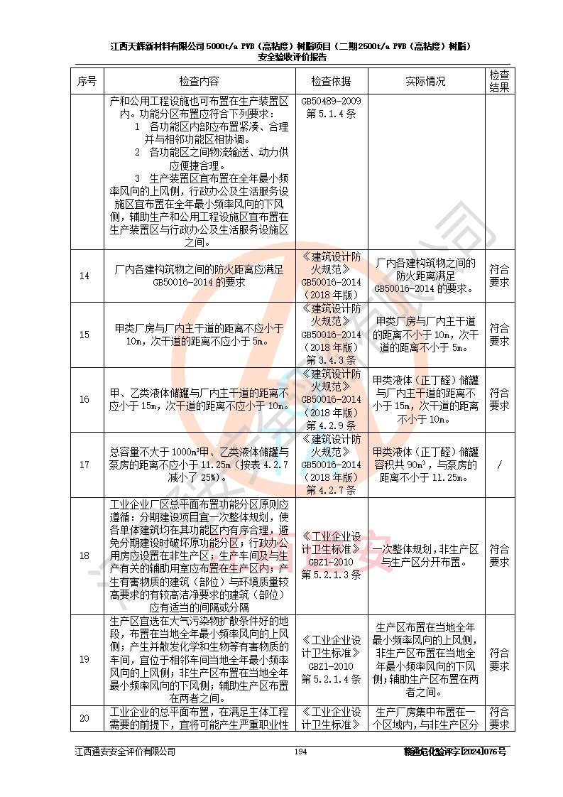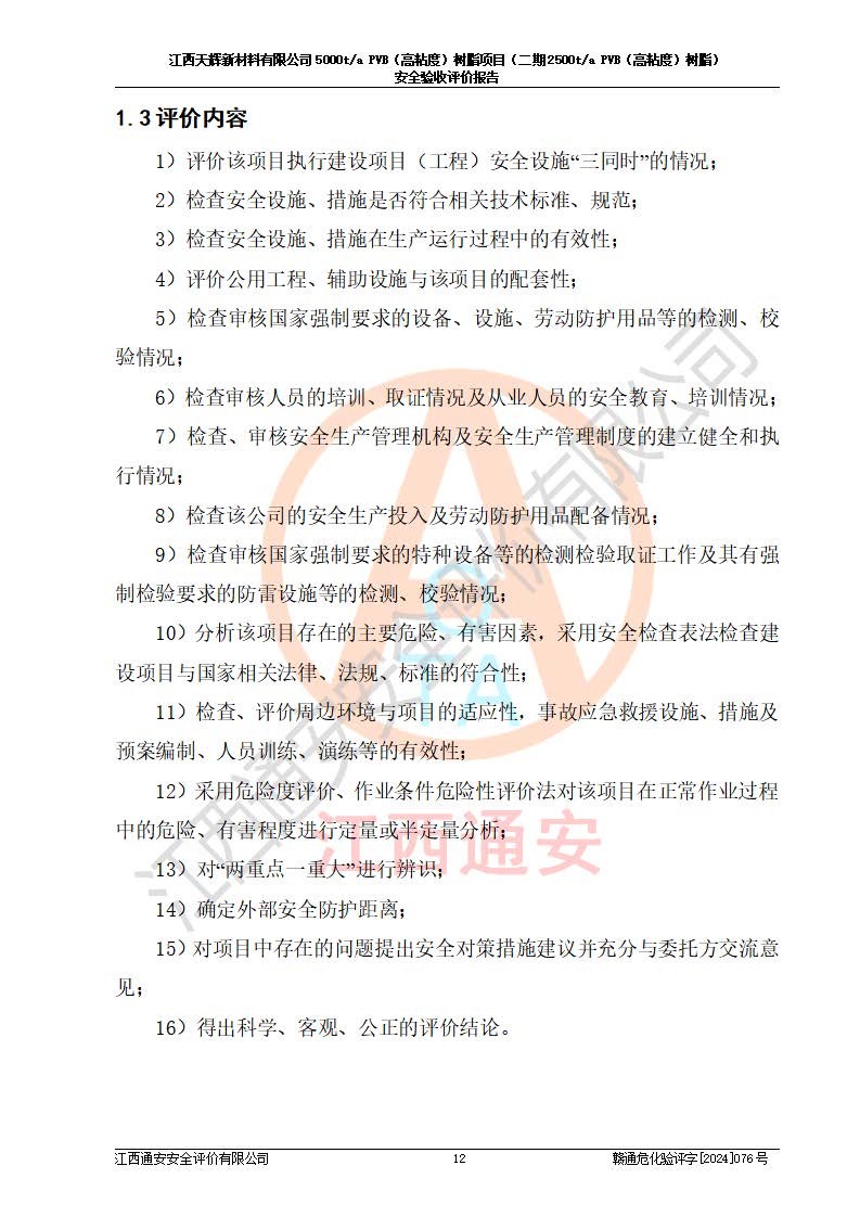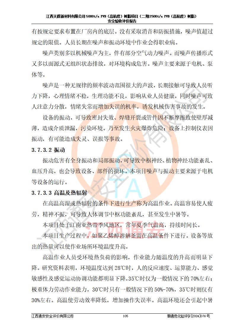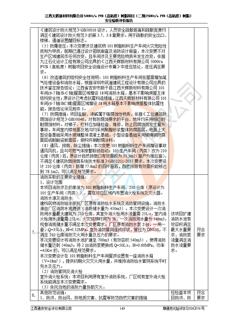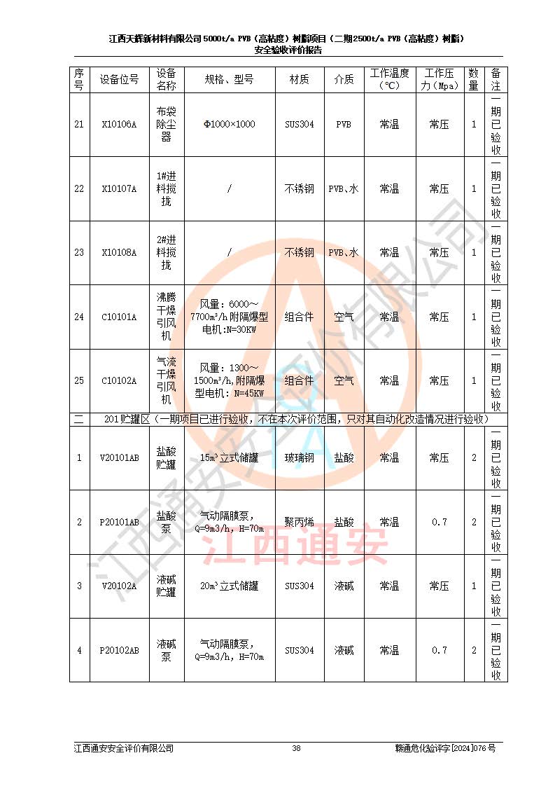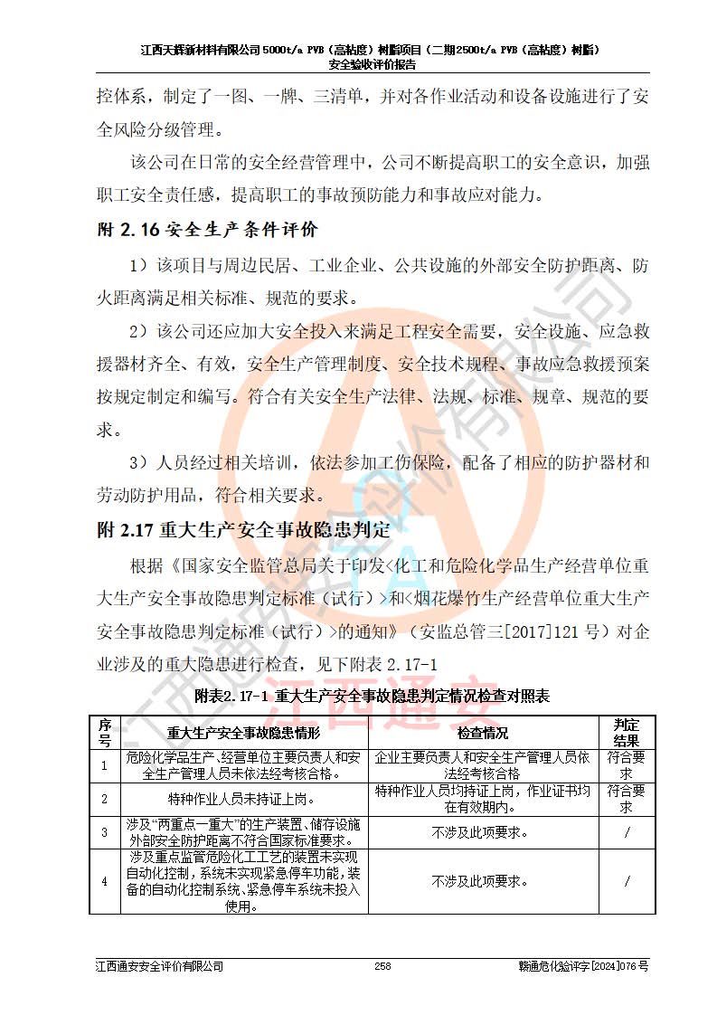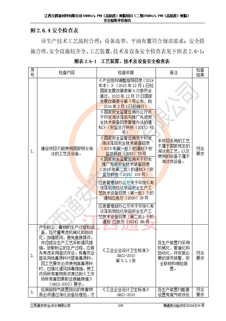 評價報告名稱 | 江西天輝新材料有限公司5000t/a PVB(高粘度)樹脂項目(二期2500t/a PVB(高粘度)樹脂)安全驗收評價報告 | |||