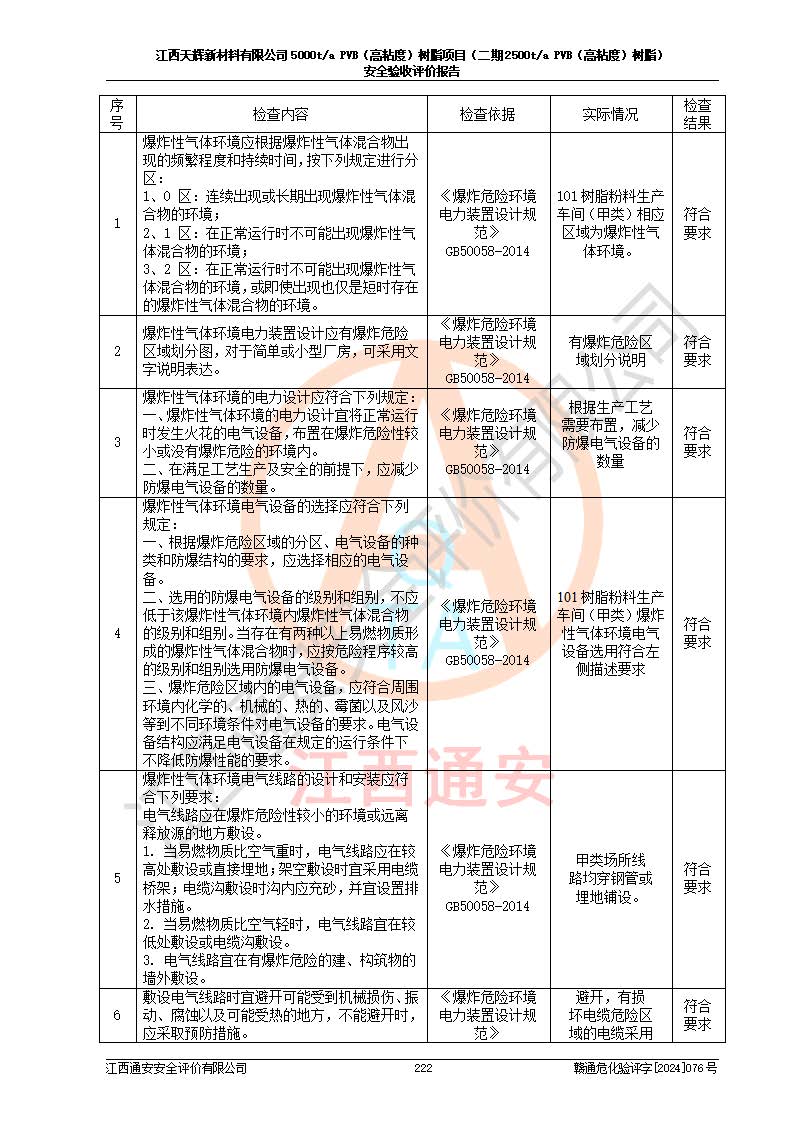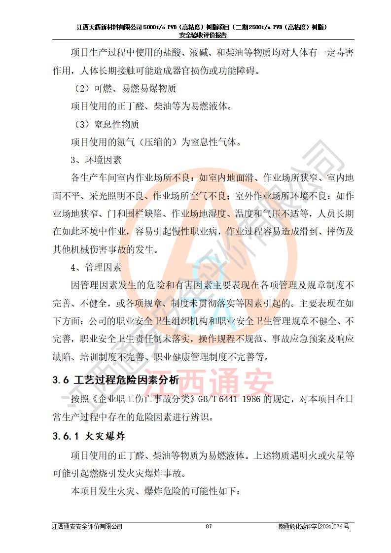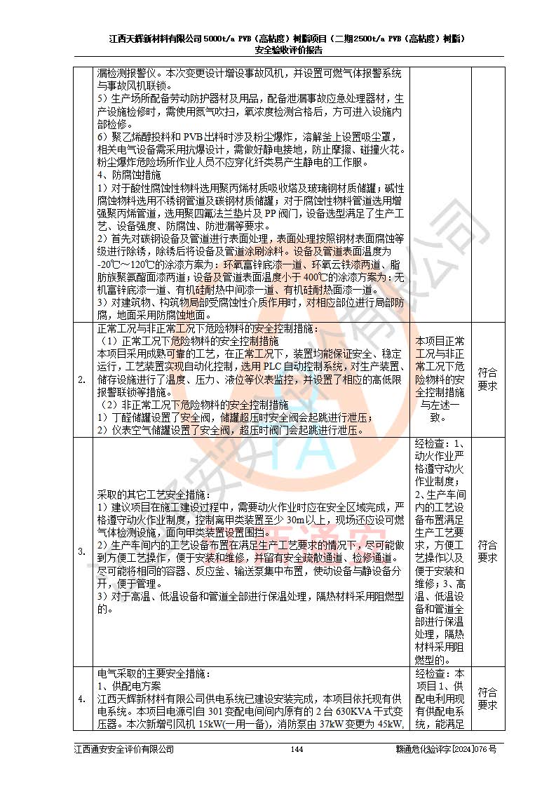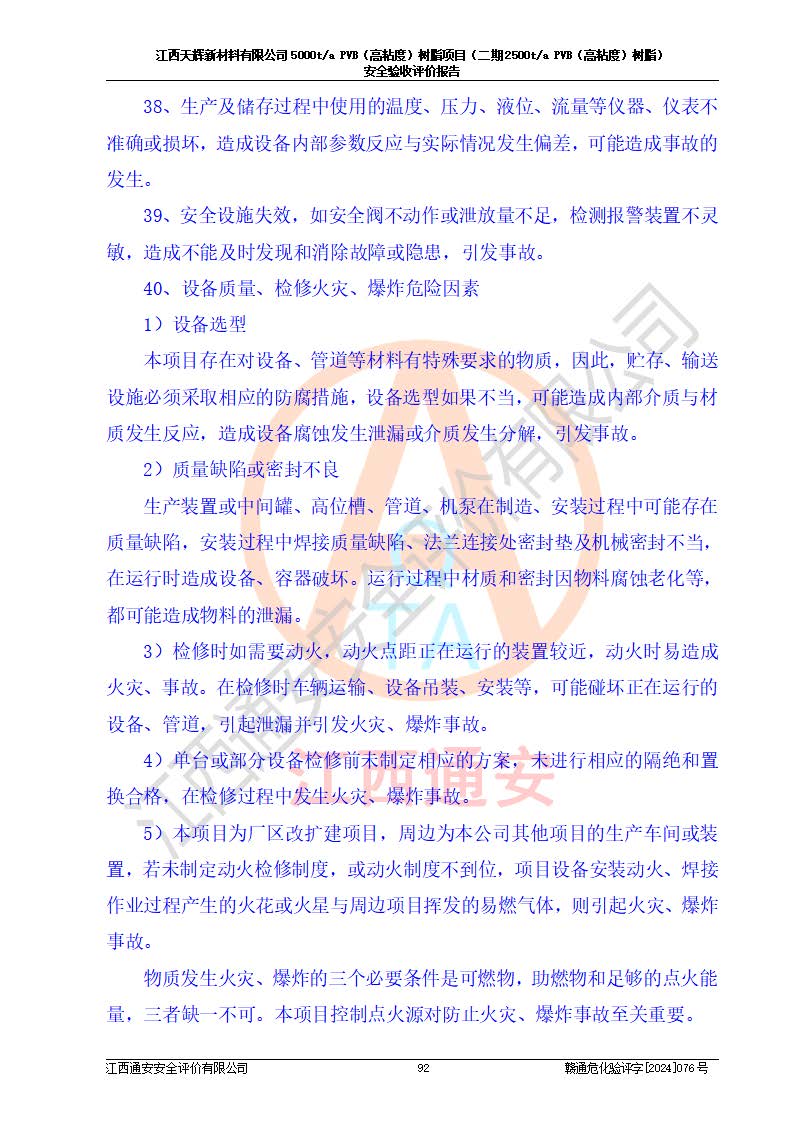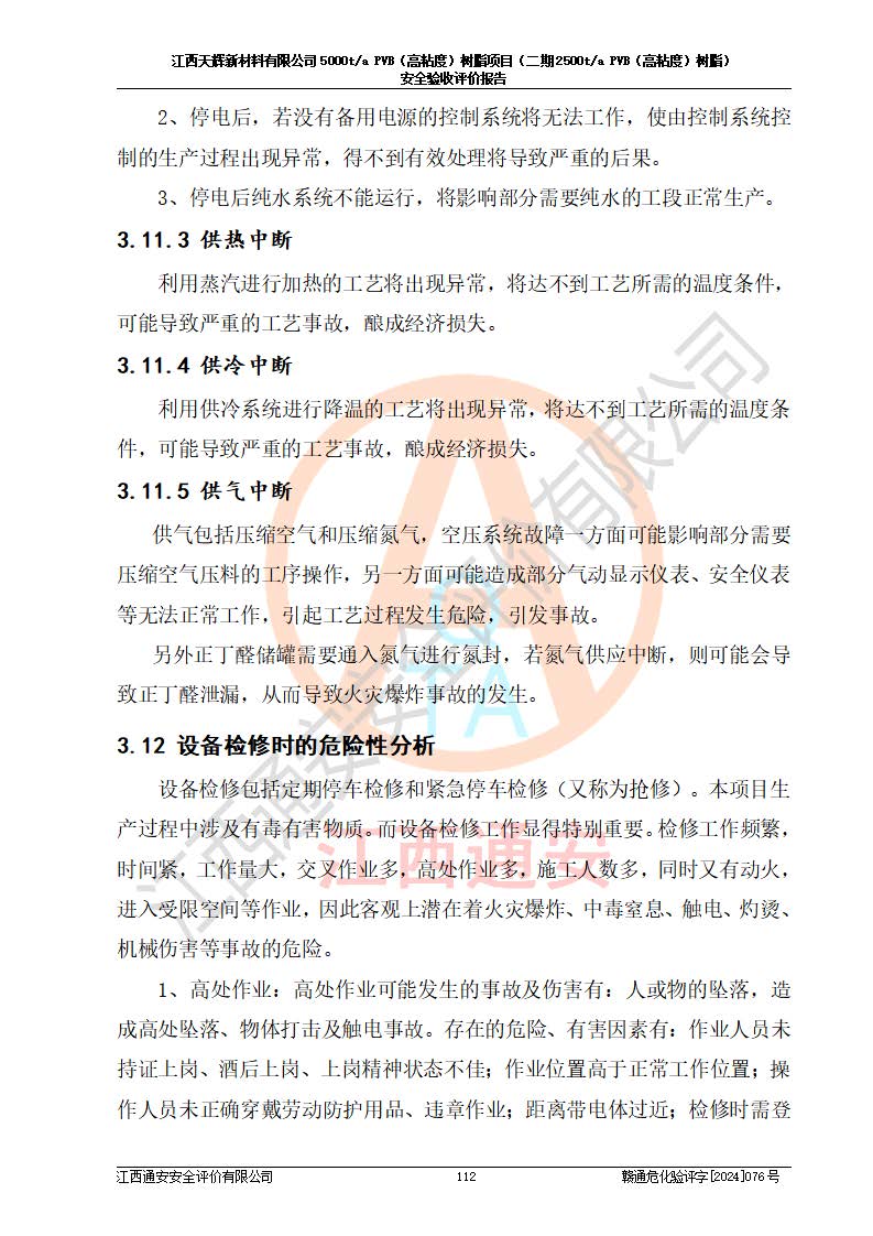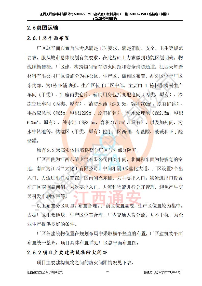 評價報告名稱 | 江西天輝新材料有限公司5000t/a PVB(高粘度)樹脂項目(二期2500t/a PVB(高粘度)樹脂)安全驗收評價報告 | |||