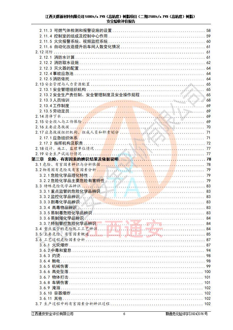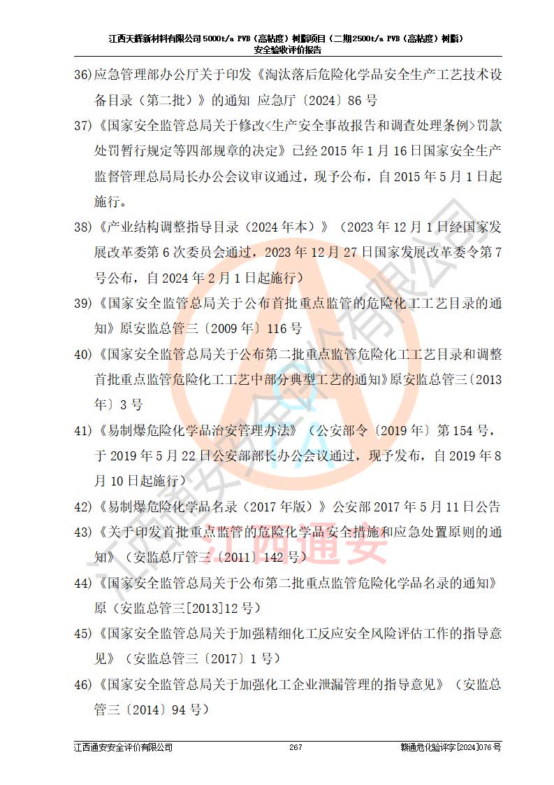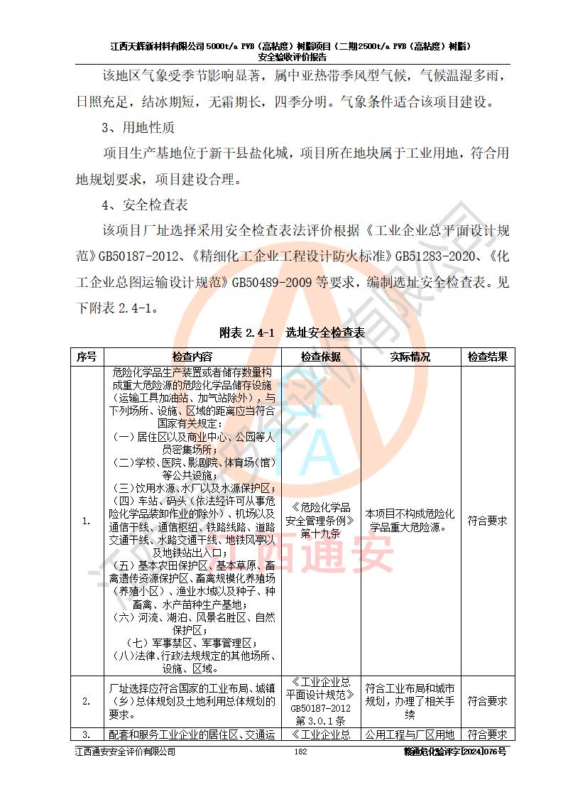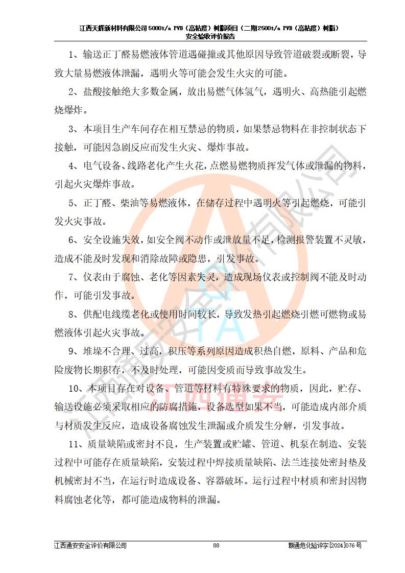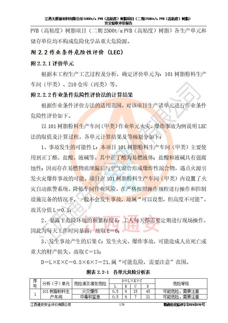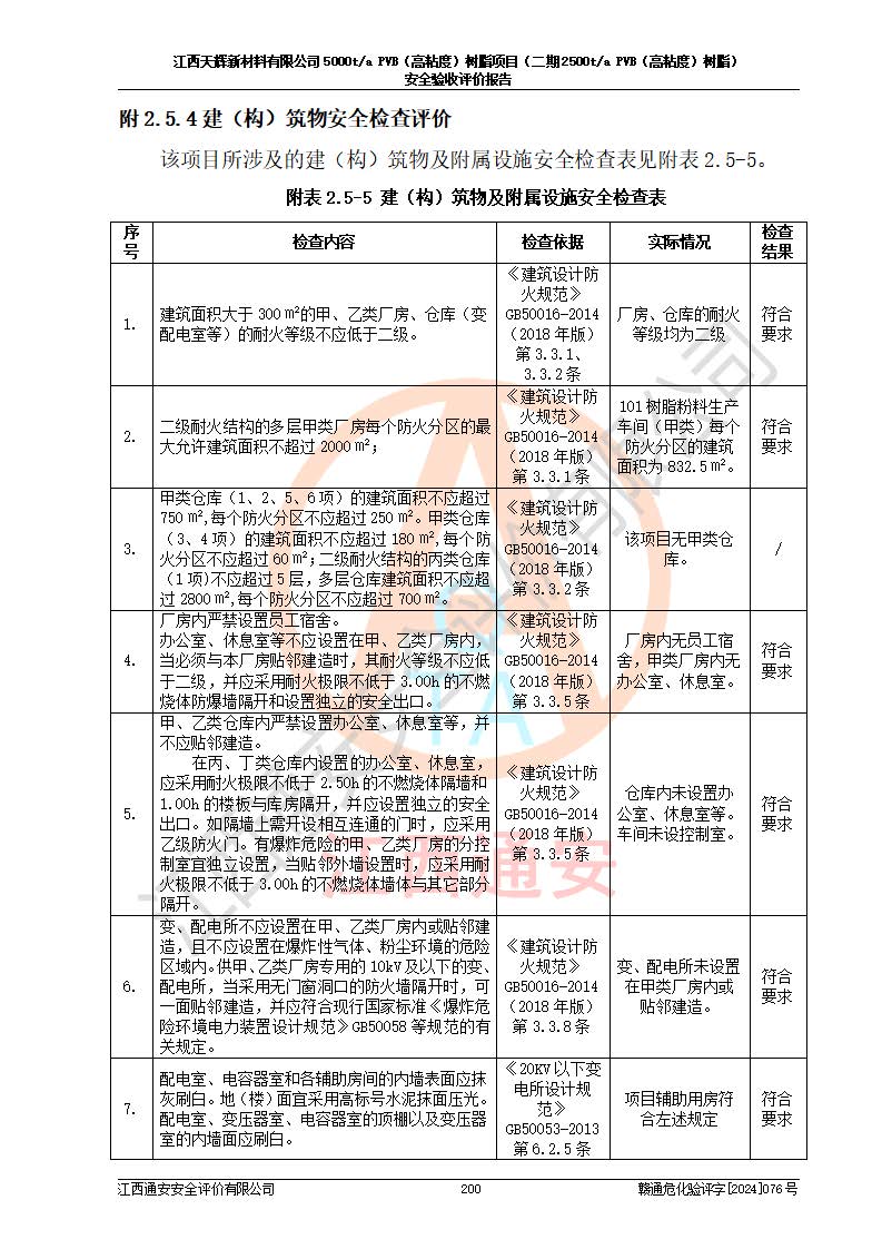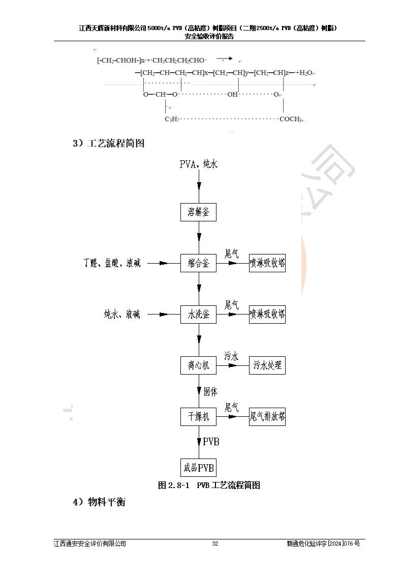 評價報告名稱 | 江西天輝新材料有限公司5000t/a PVB(高粘度)樹脂項目(二期2500t/a PVB(高粘度)樹脂)安全驗收評價報告 | |||