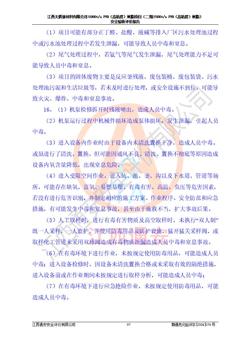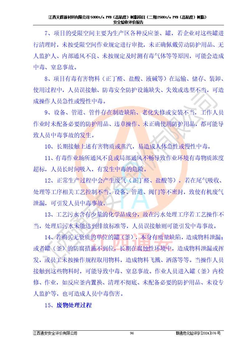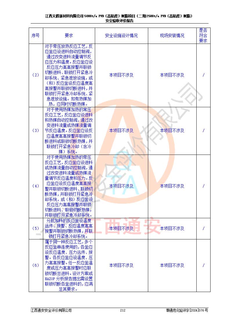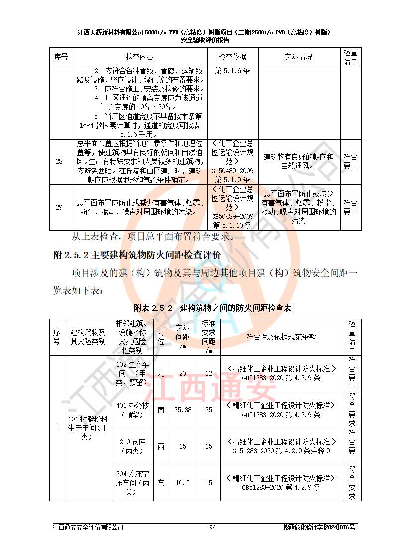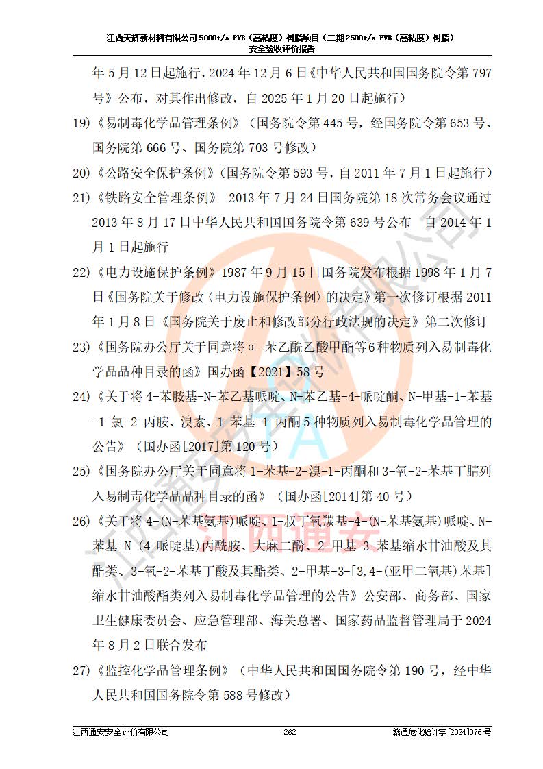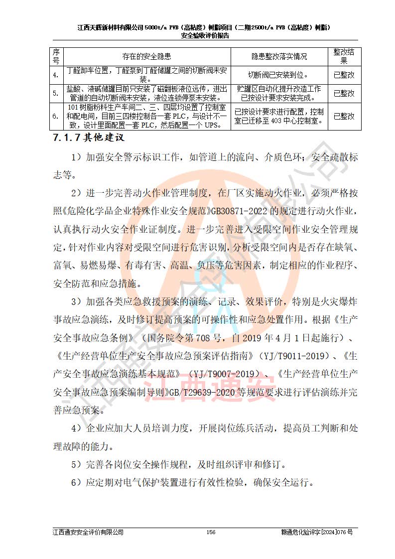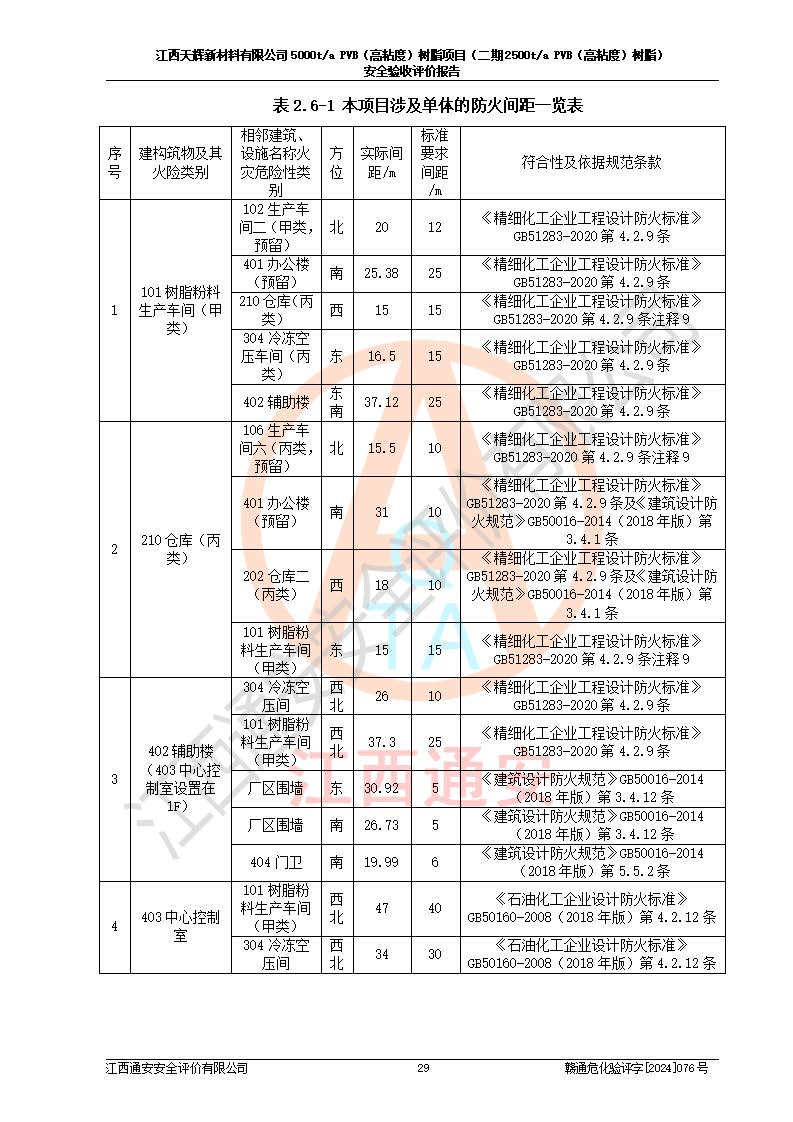 評價報告名稱 | 江西天輝新材料有限公司5000t/a PVB(高粘度)樹脂項目(二期2500t/a PVB(高粘度)樹脂)安全驗收評價報告 | |||