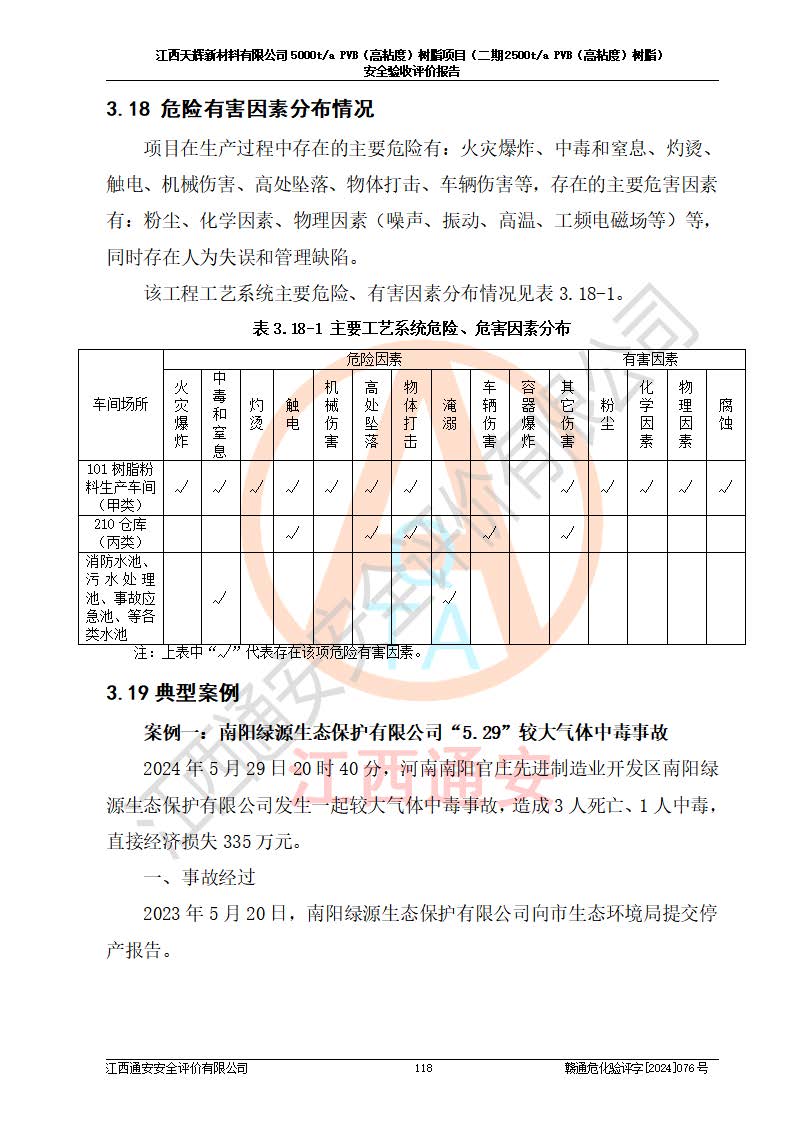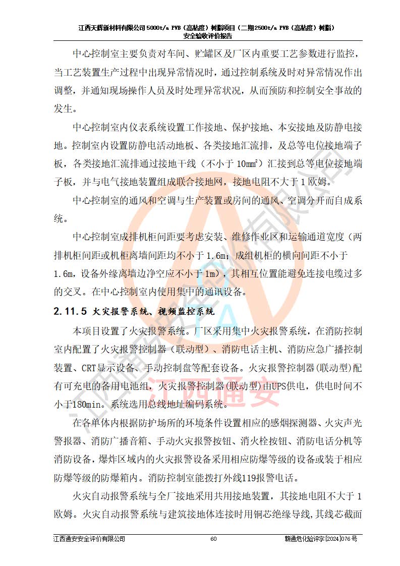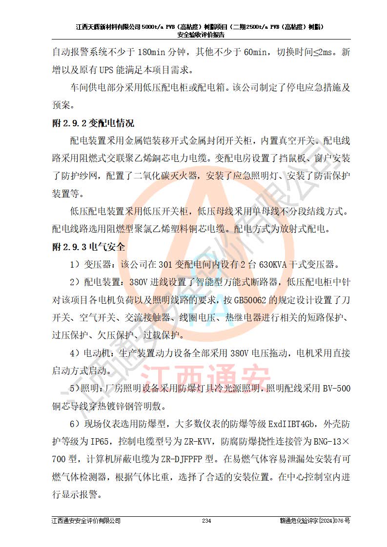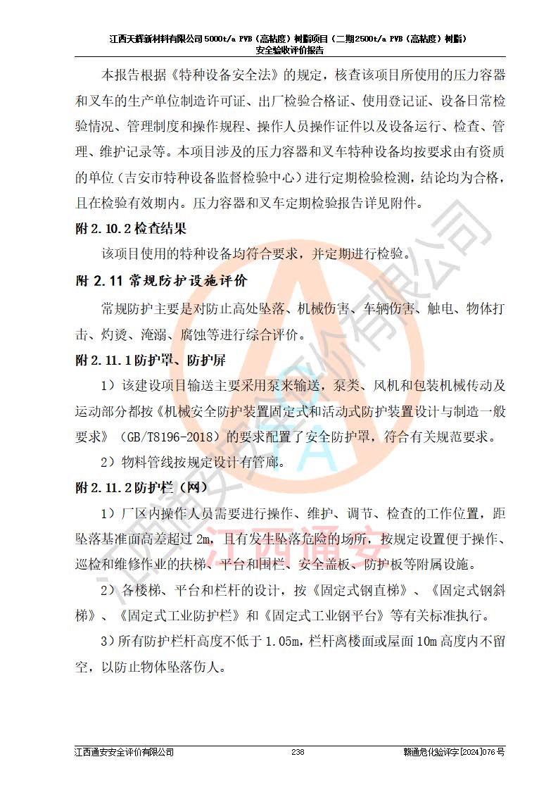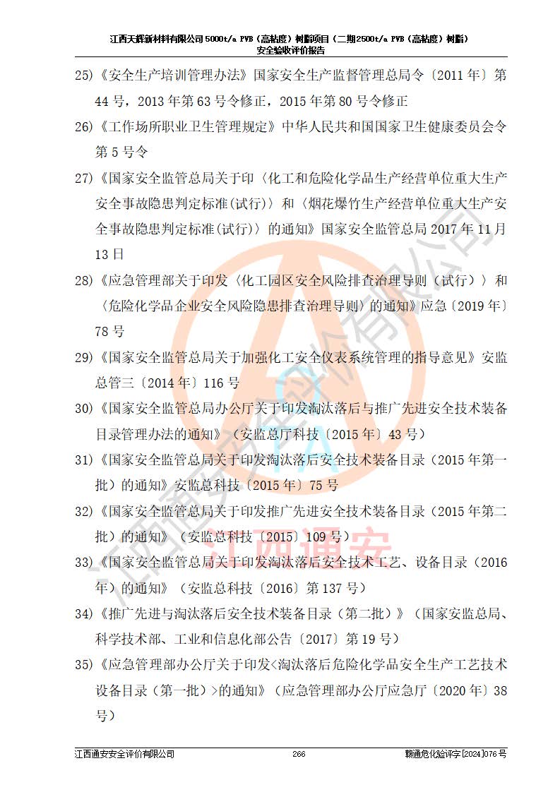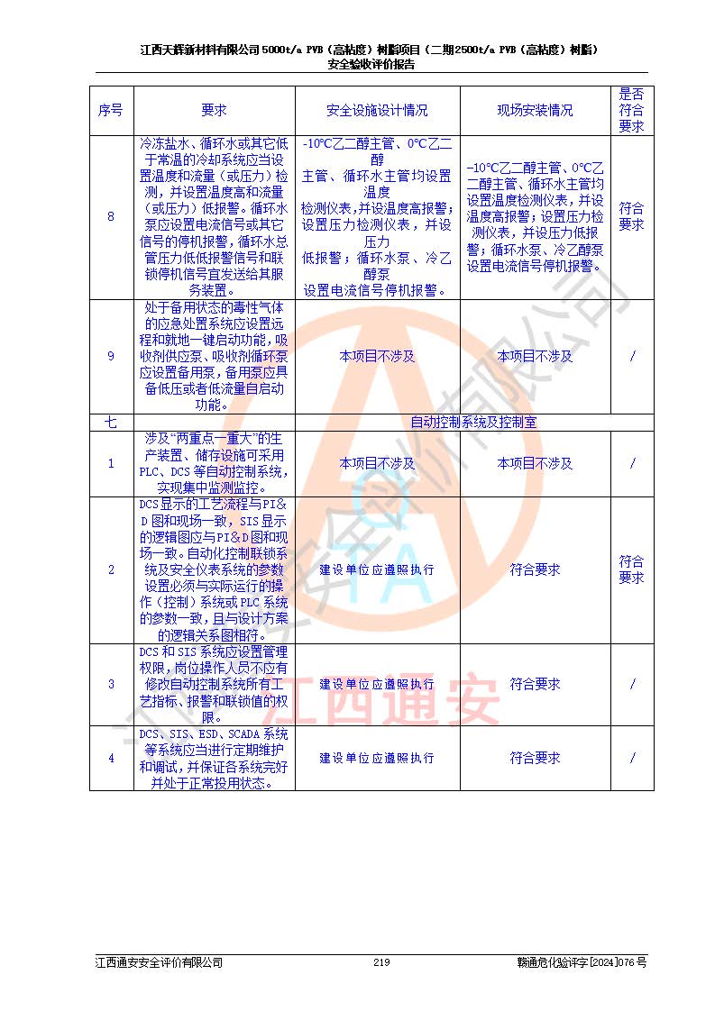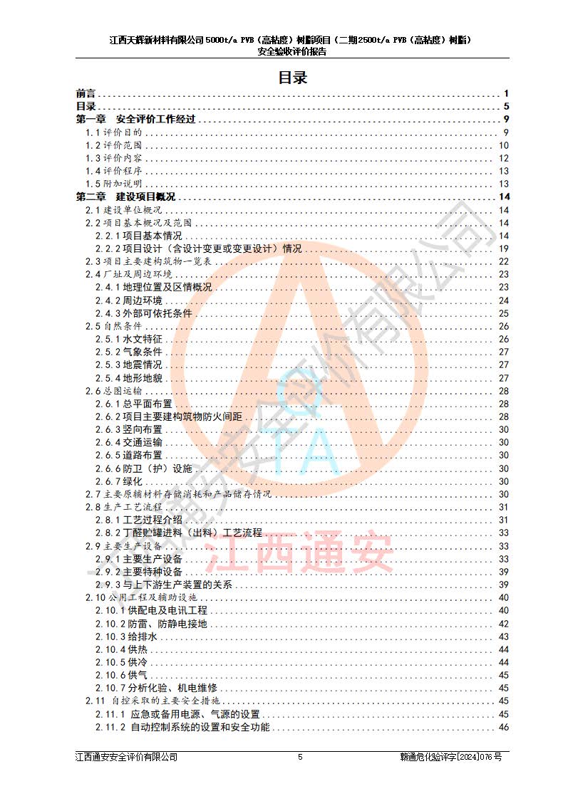 評價報告名稱 | 江西天輝新材料有限公司5000t/a PVB(高粘度)樹脂項目(二期2500t/a PVB(高粘度)樹脂)安全驗收評價報告 | |||
