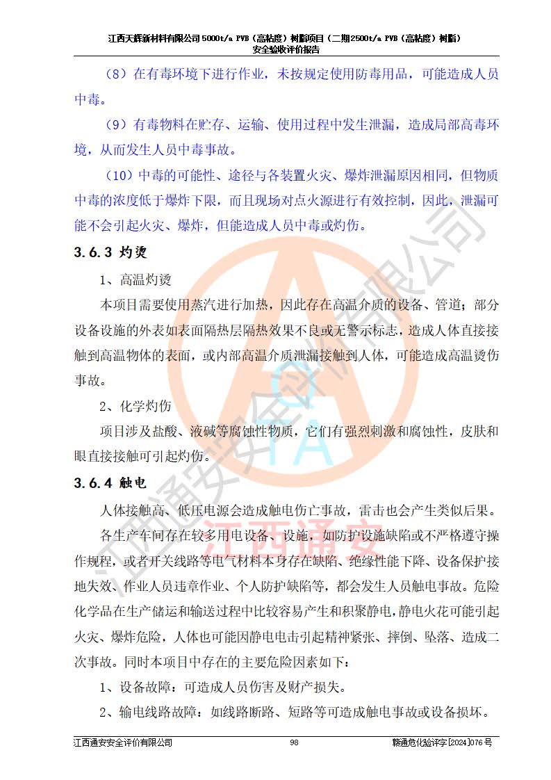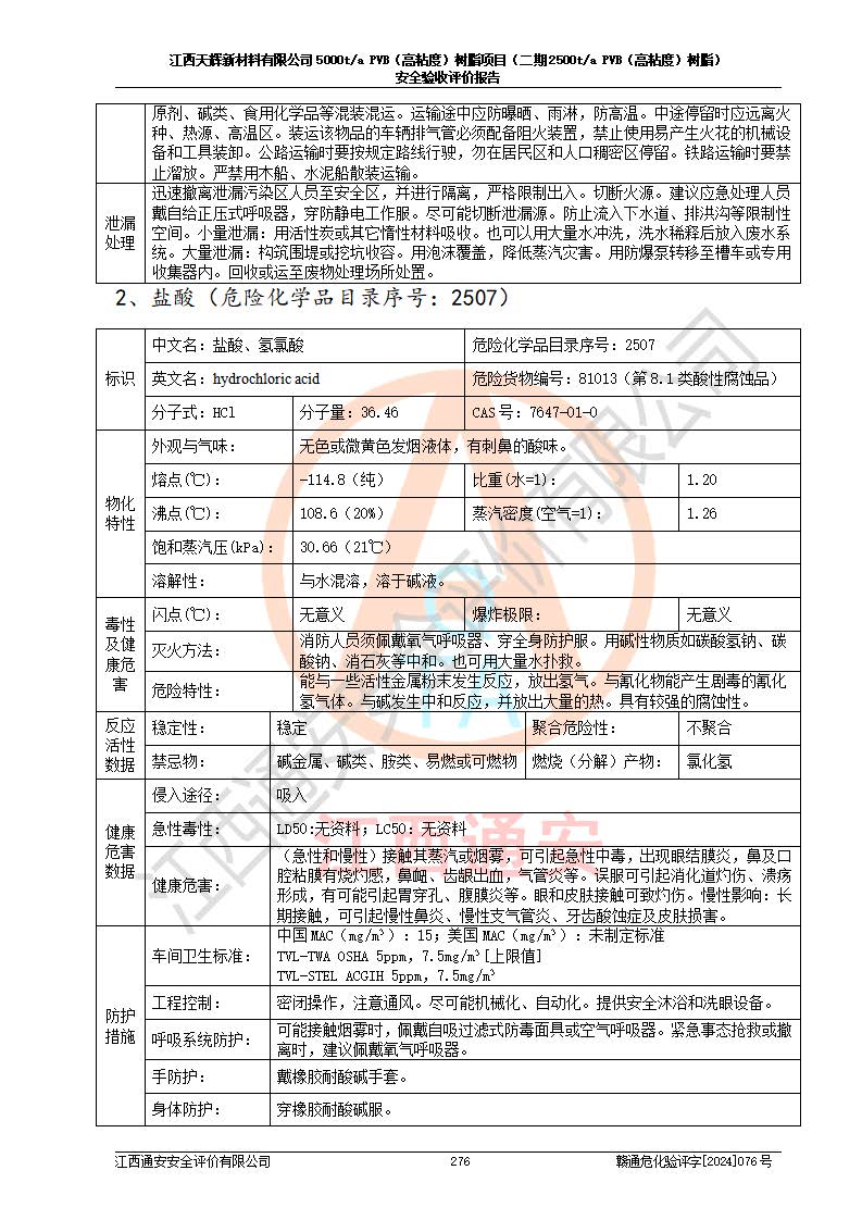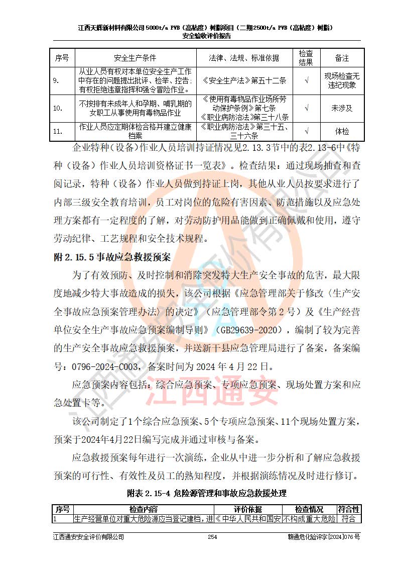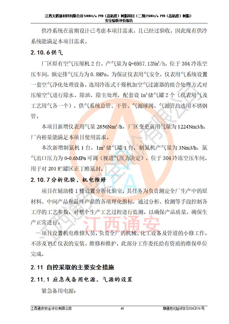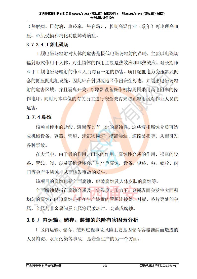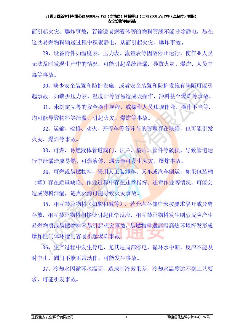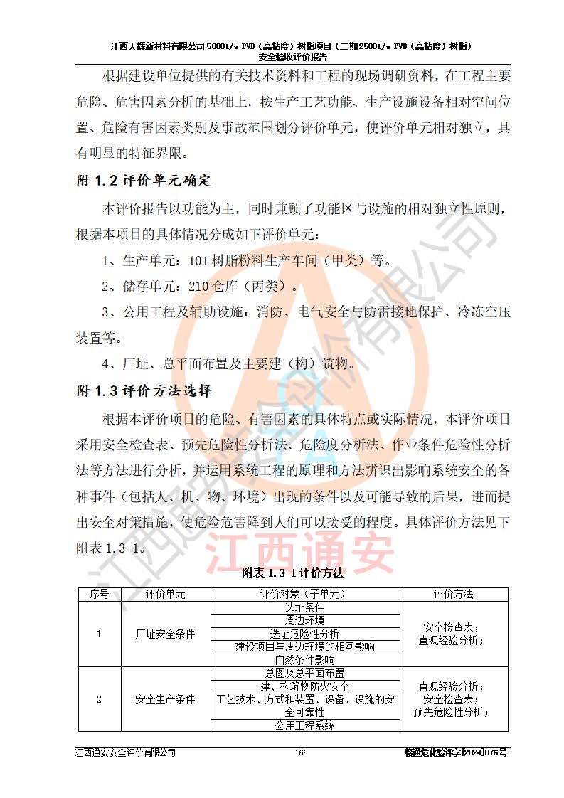 評價報告名稱 | 江西天輝新材料有限公司5000t/a PVB(高粘度)樹脂項目(二期2500t/a PVB(高粘度)樹脂)安全驗收評價報告 | |||