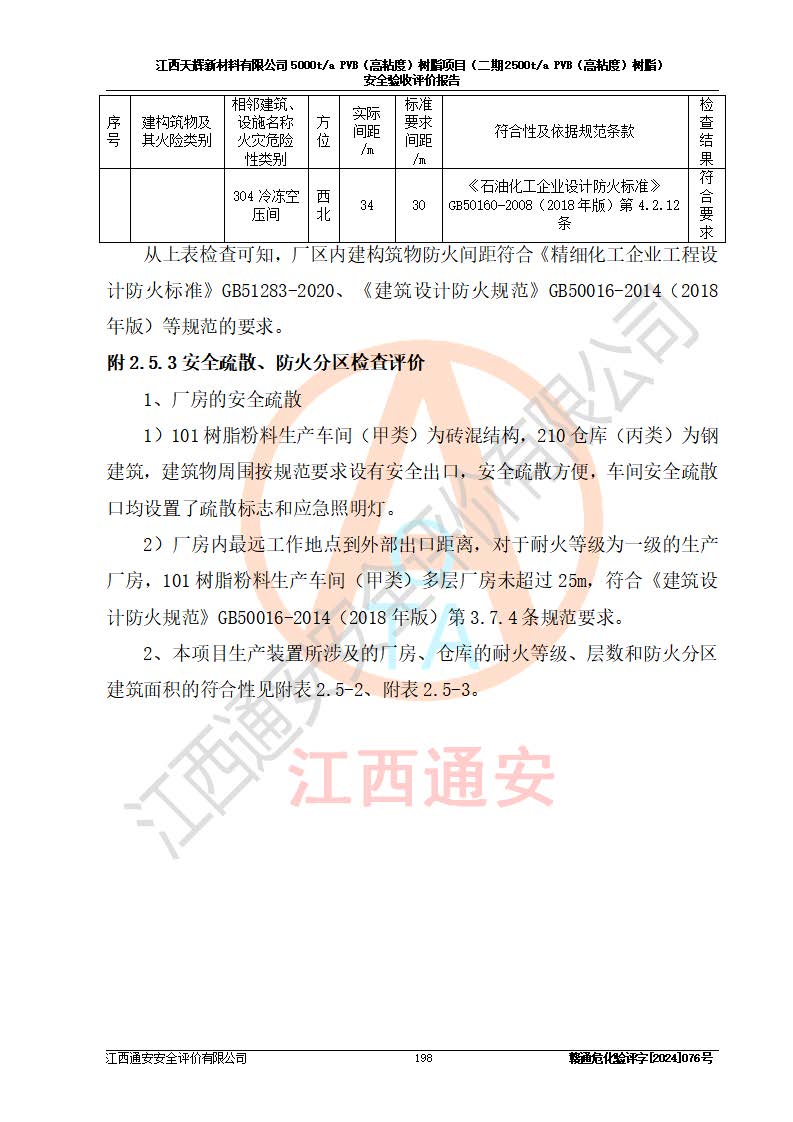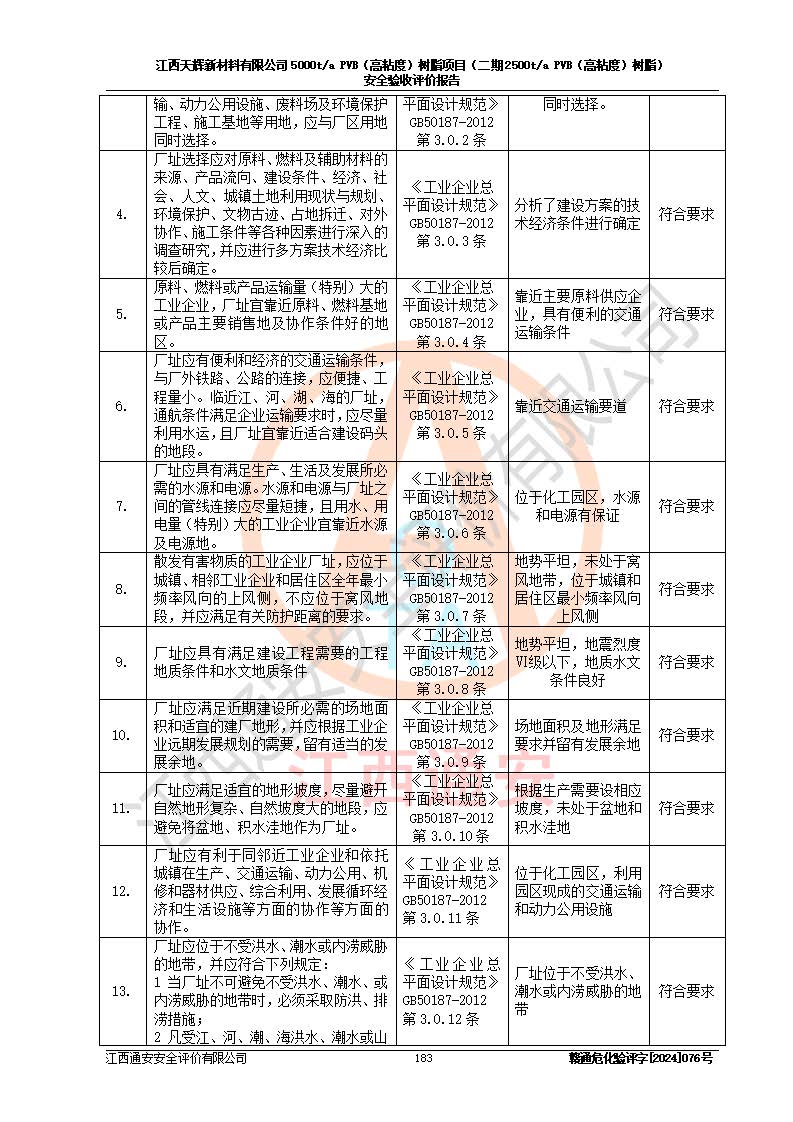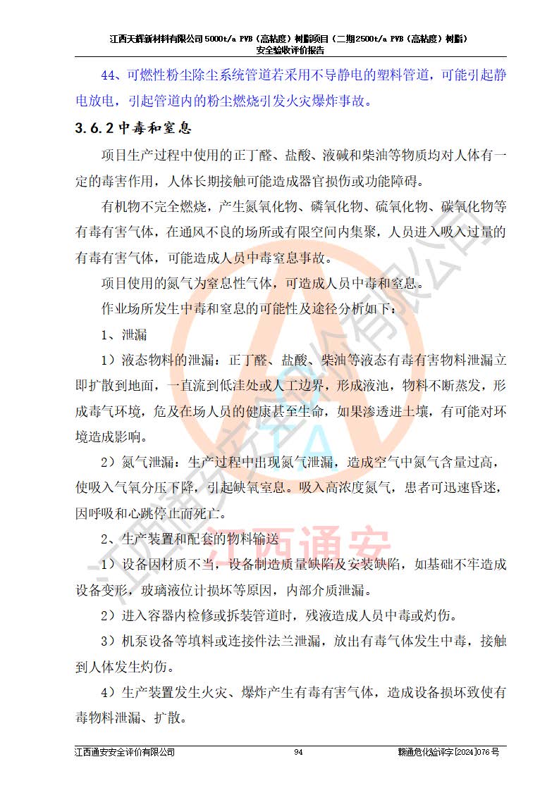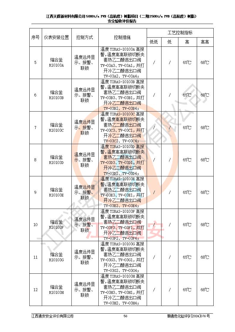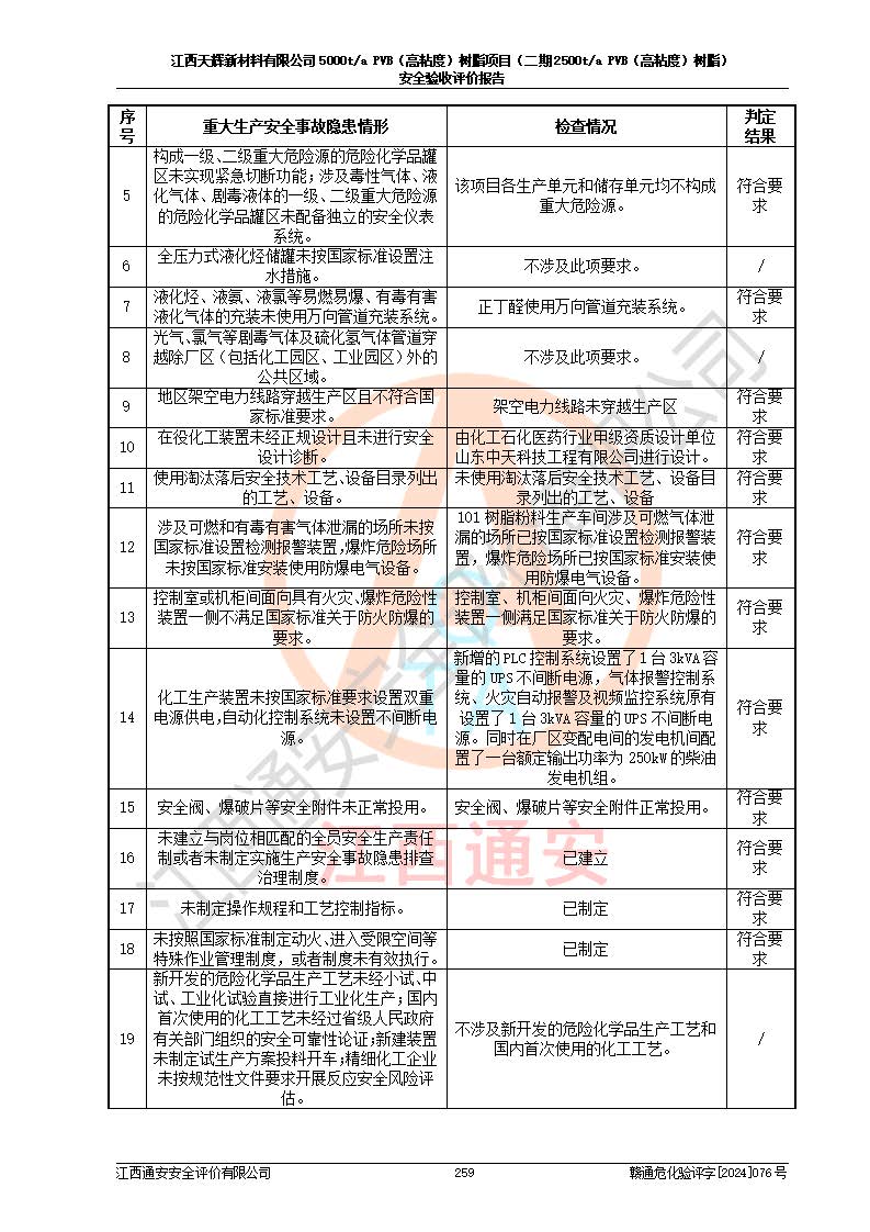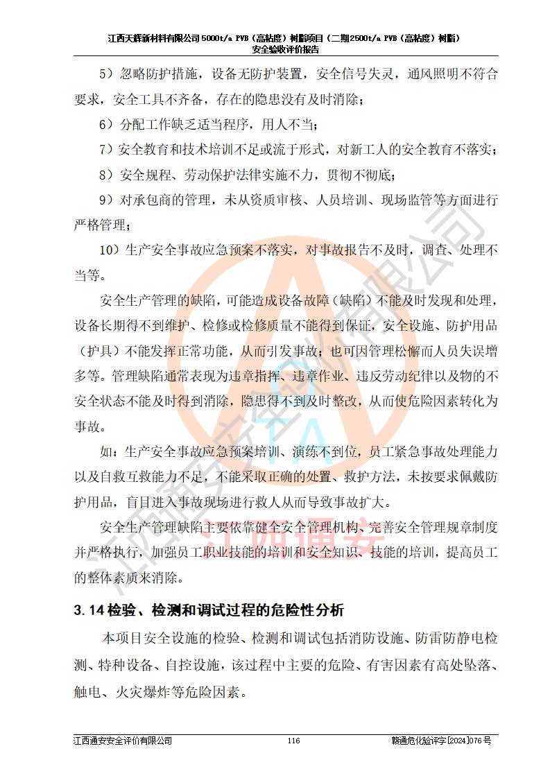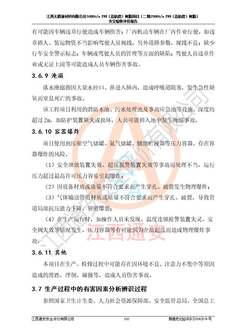 評價報告名稱 | 江西天輝新材料有限公司5000t/a PVB(高粘度)樹脂項目(二期2500t/a PVB(高粘度)樹脂)安全驗收評價報告 | |||