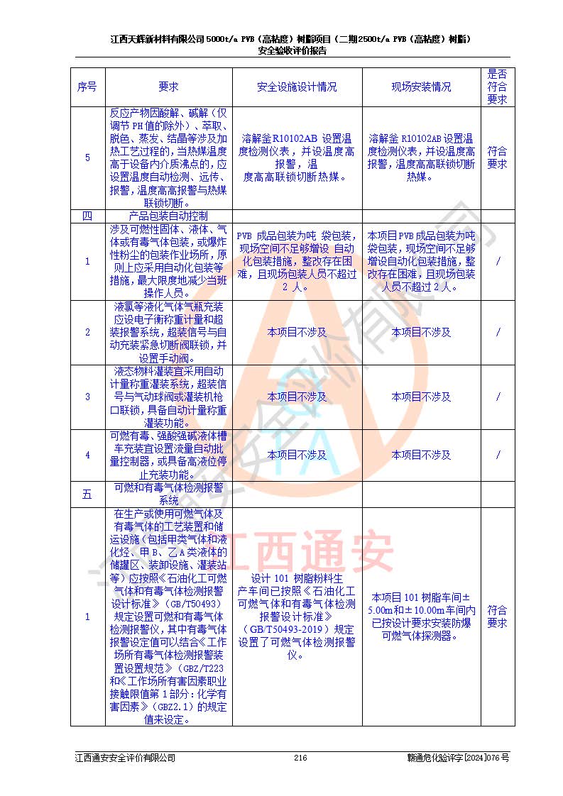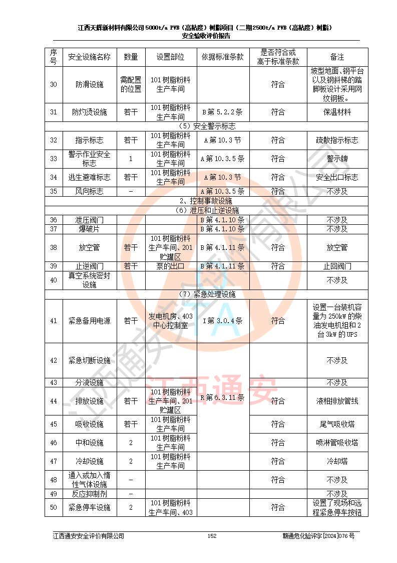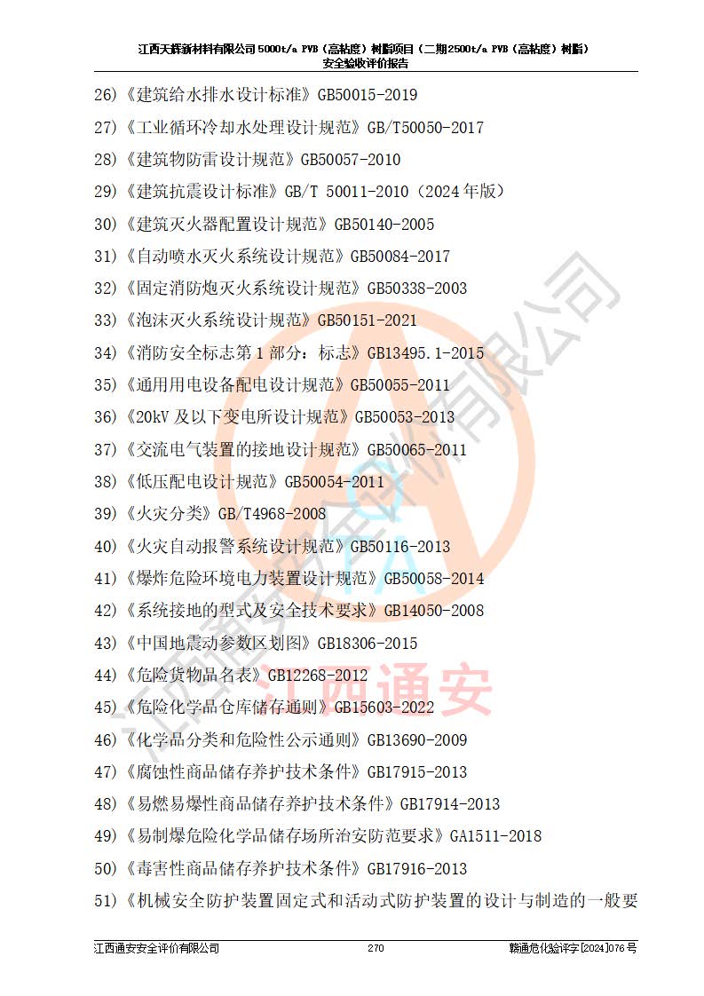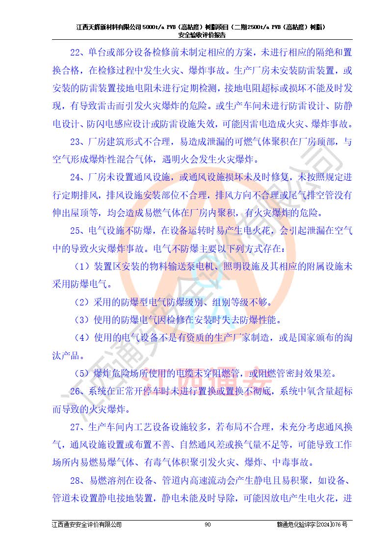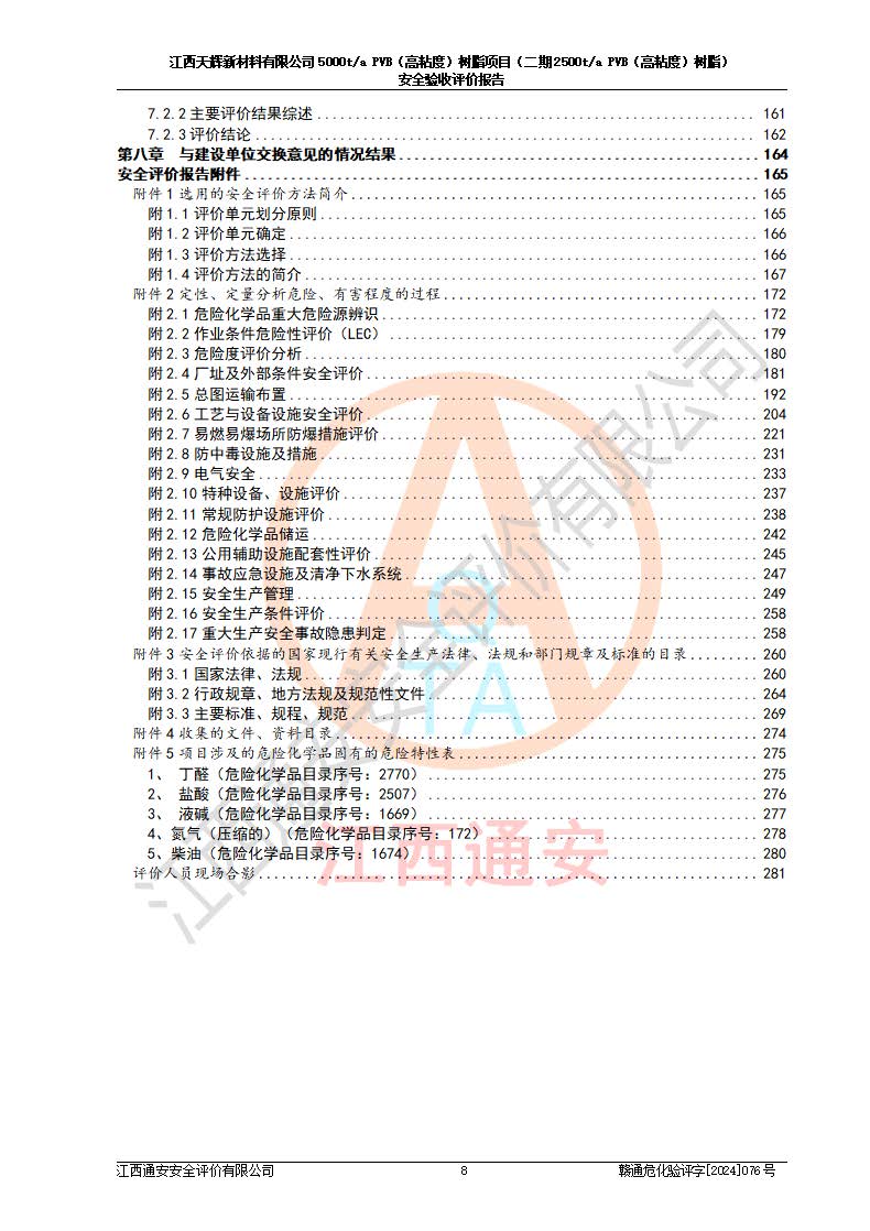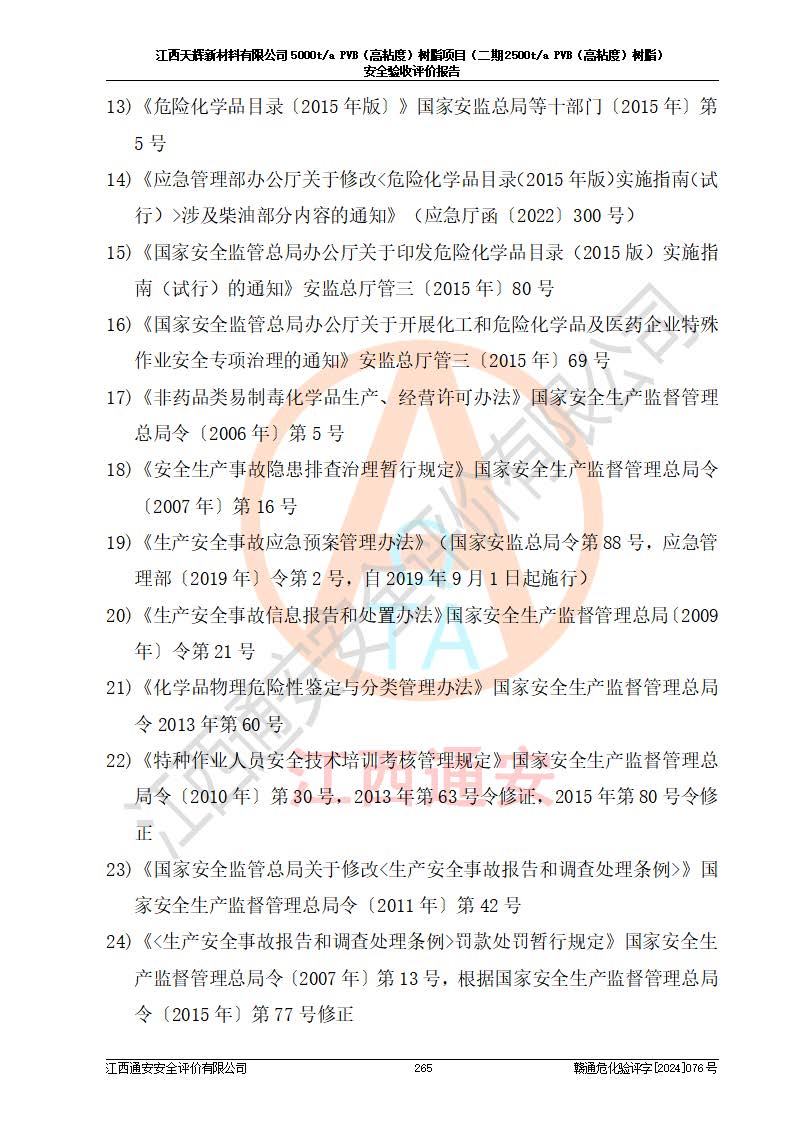 評價報告名稱 | 江西天輝新材料有限公司5000t/a PVB(高粘度)樹脂項目(二期2500t/a PVB(高粘度)樹脂)安全驗收評價報告 | |||
