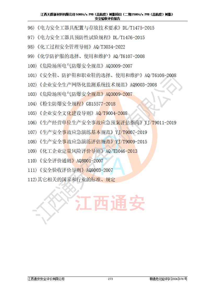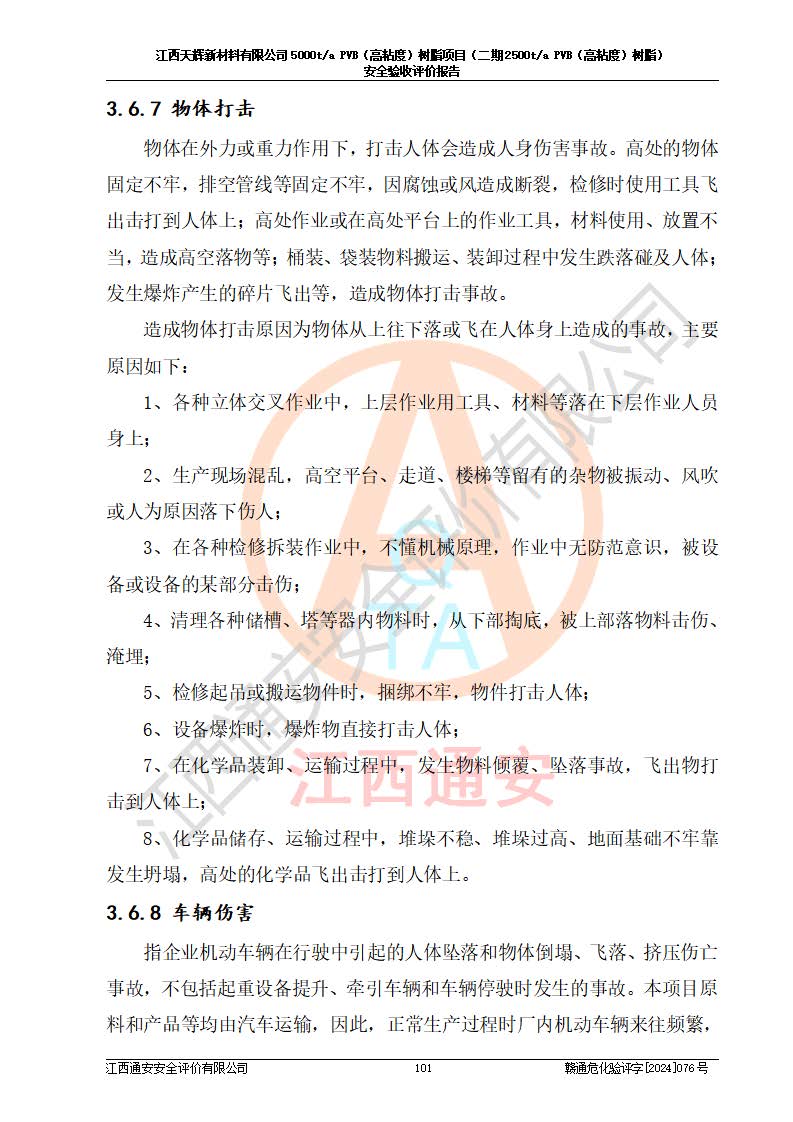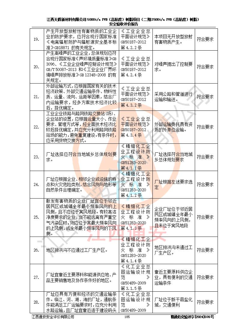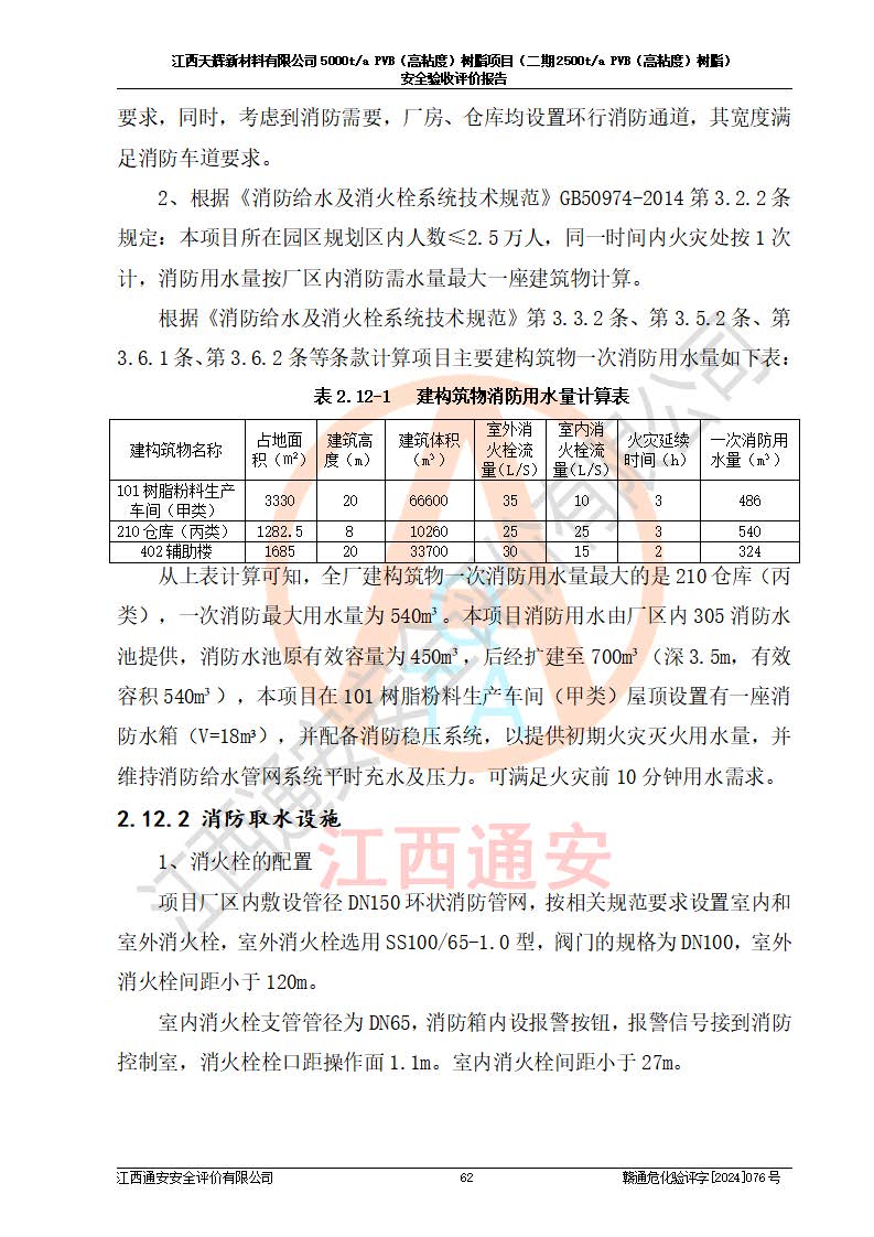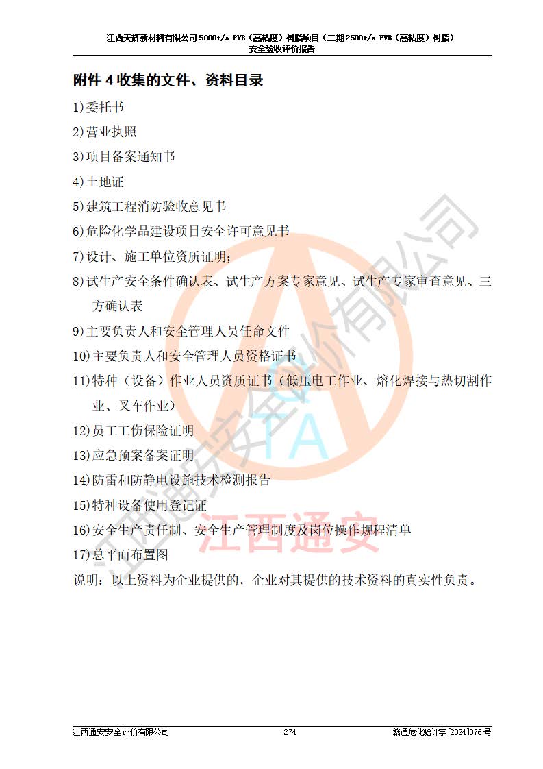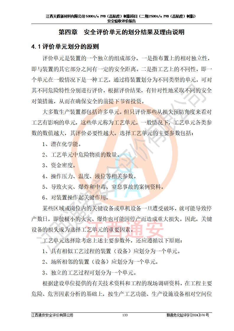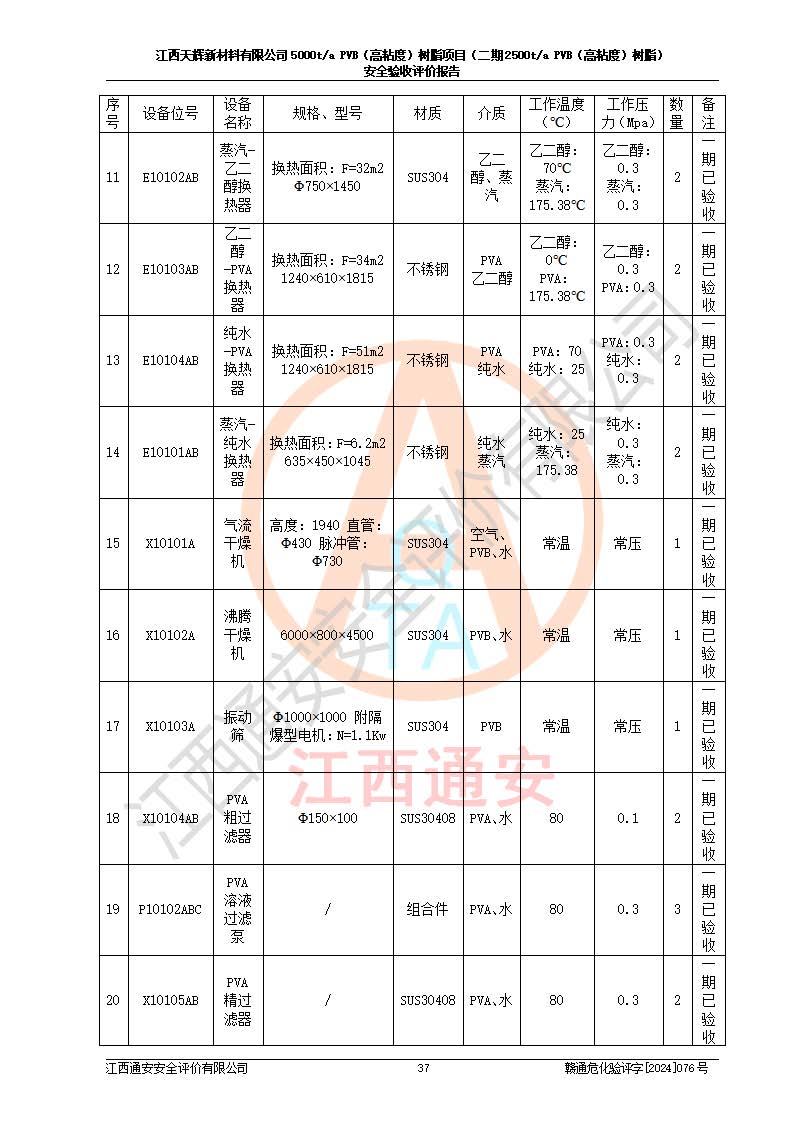 評價報告名稱 | 江西天輝新材料有限公司5000t/a PVB(高粘度)樹脂項目(二期2500t/a PVB(高粘度)樹脂)安全驗收評價報告 | |||