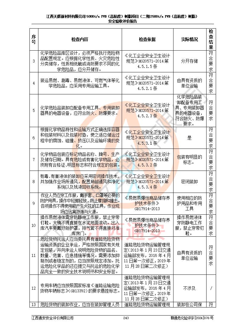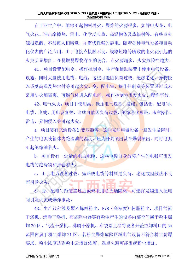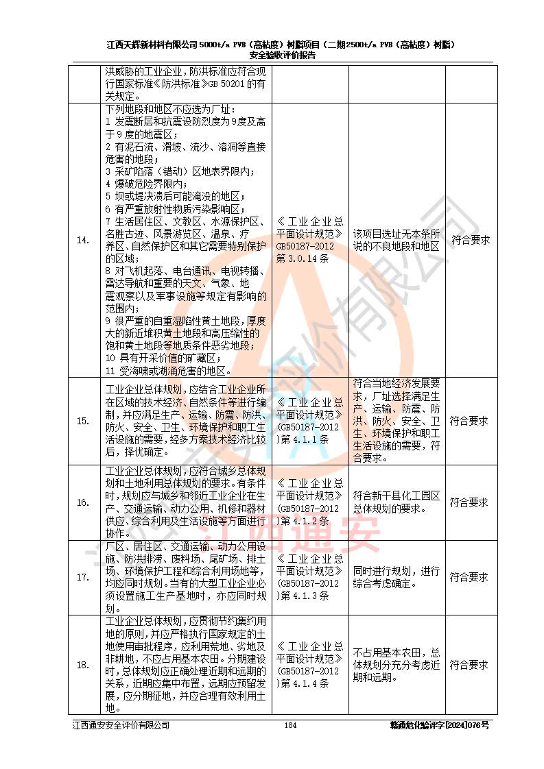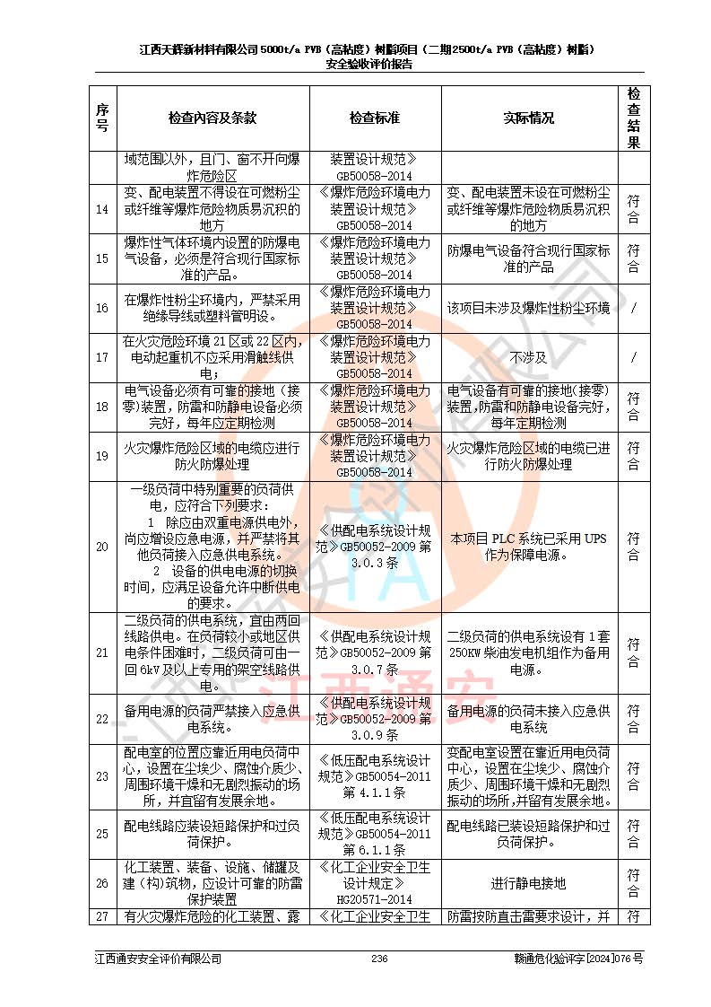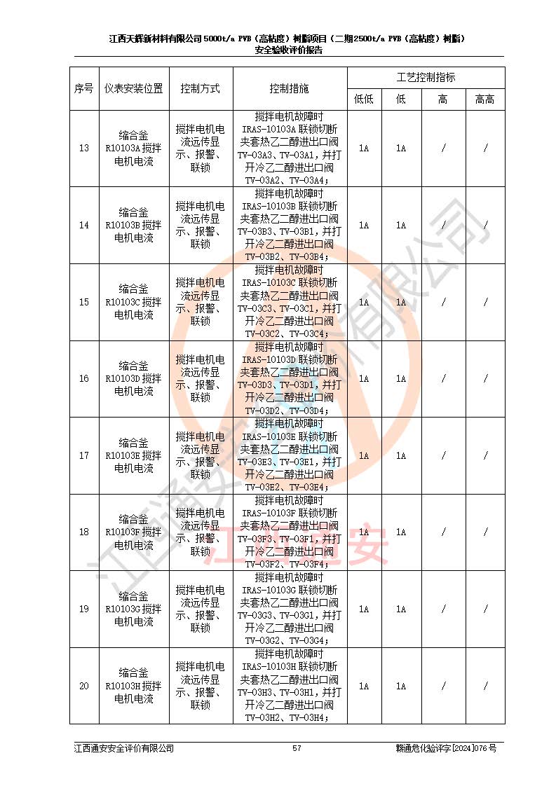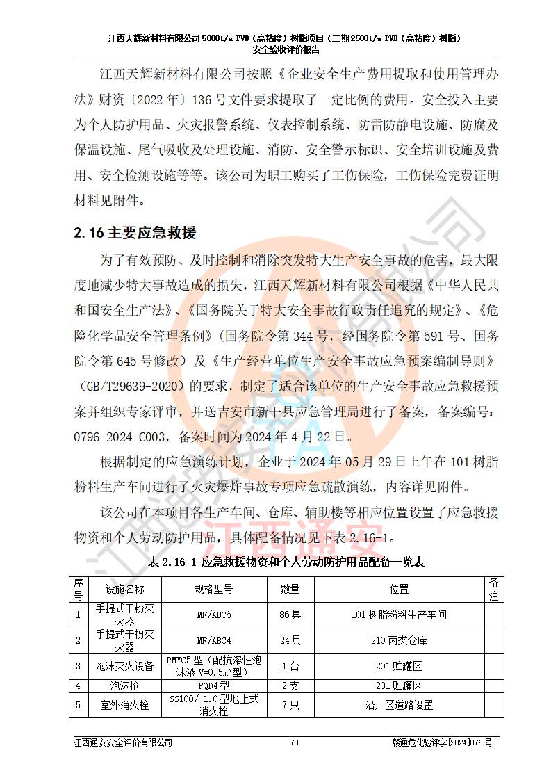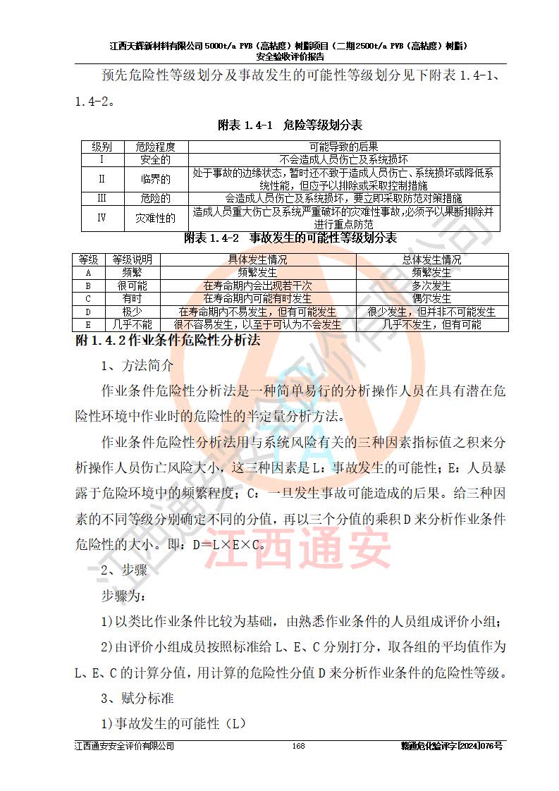 評價報告名稱 | 江西天輝新材料有限公司5000t/a PVB(高粘度)樹脂項目(二期2500t/a PVB(高粘度)樹脂)安全驗收評價報告 | |||