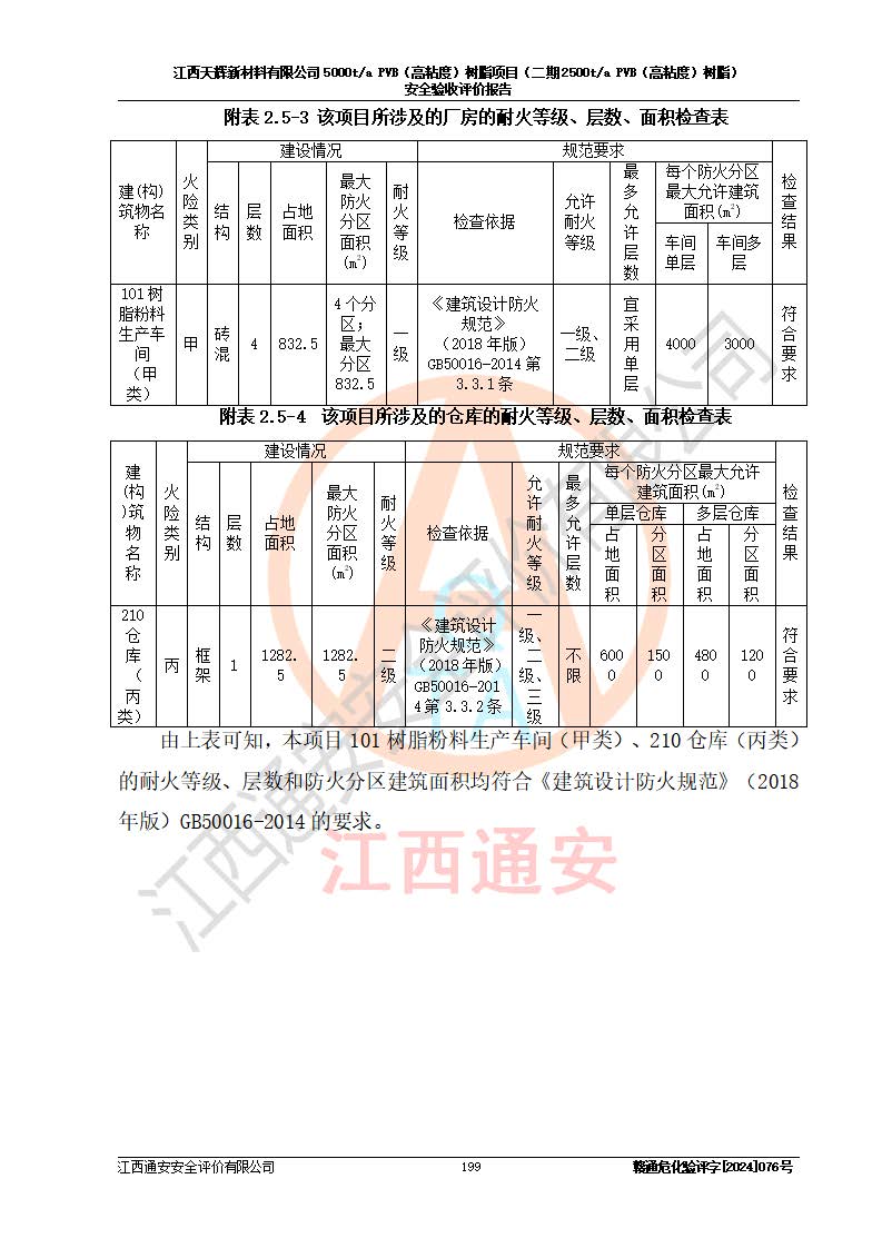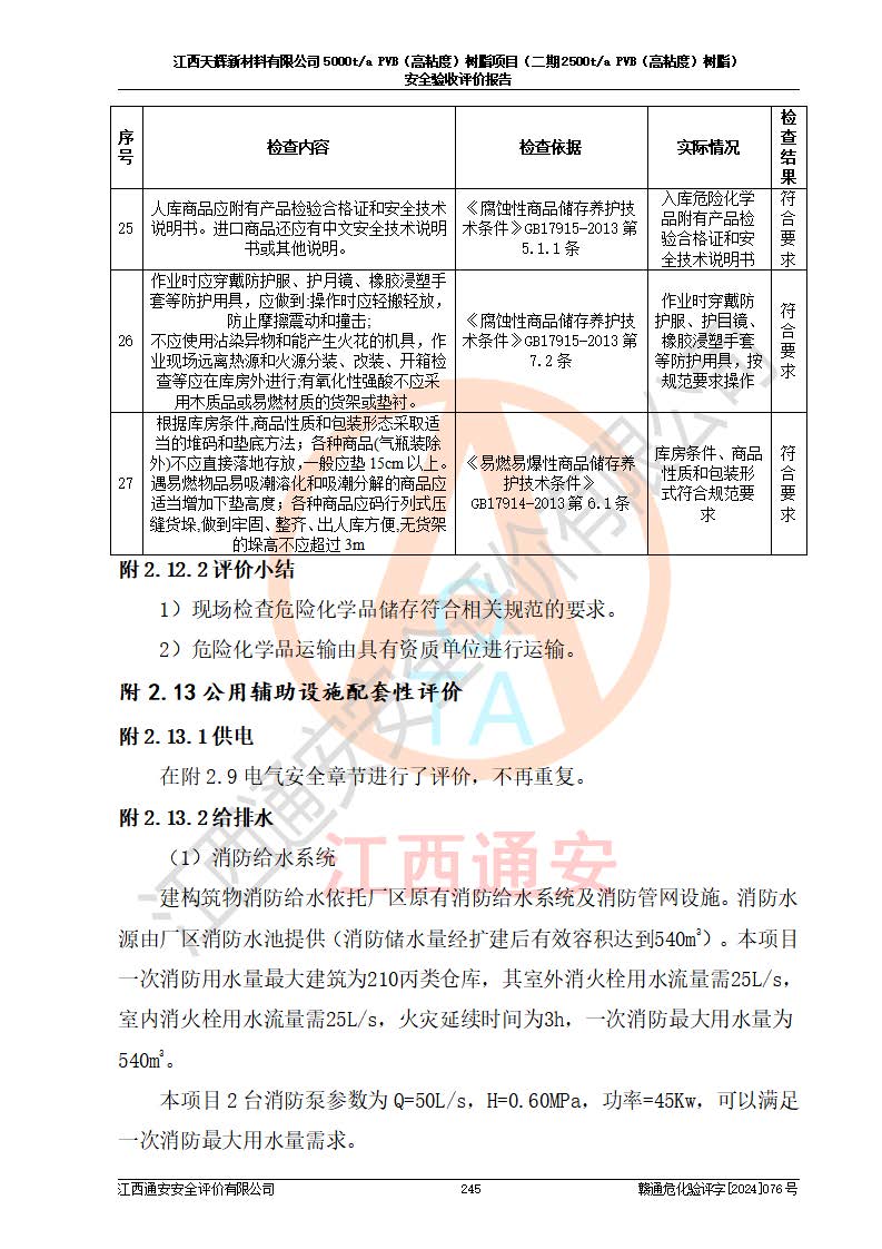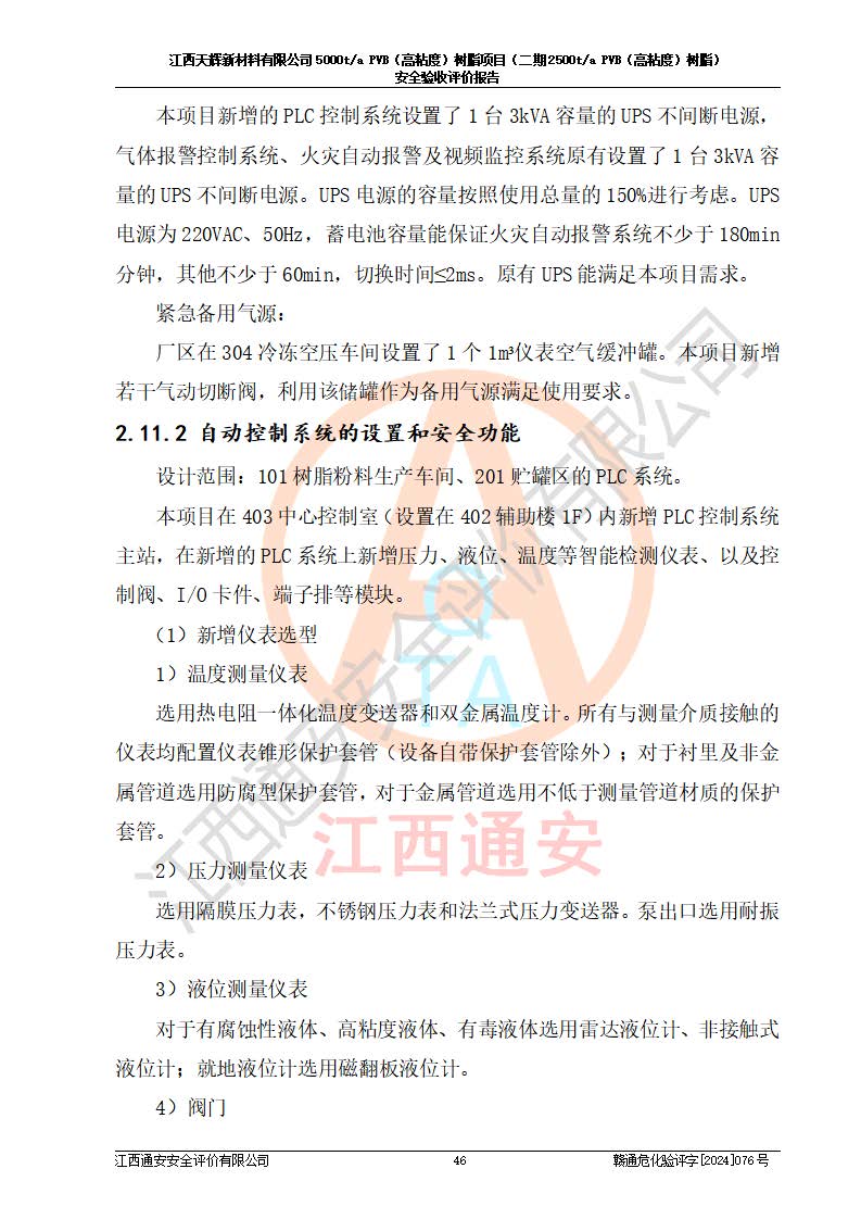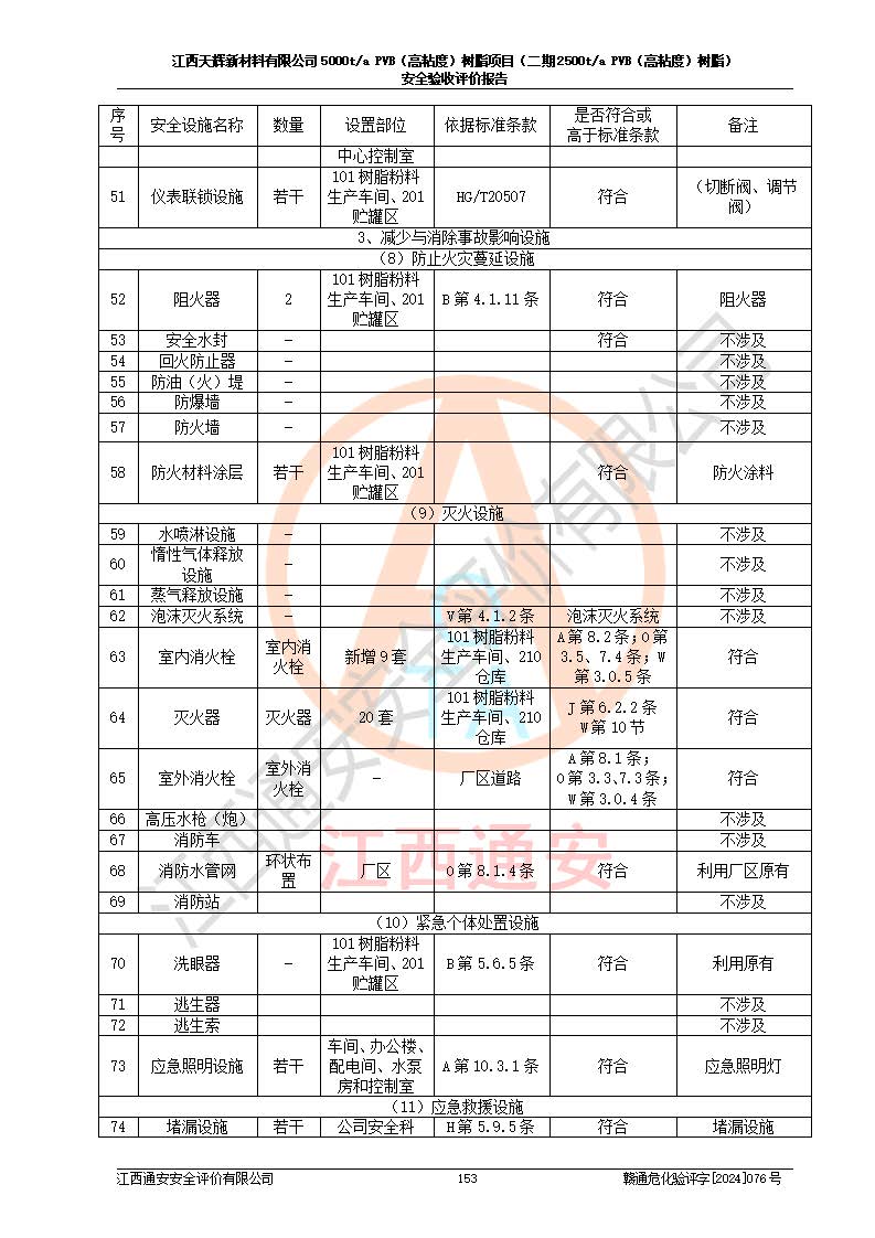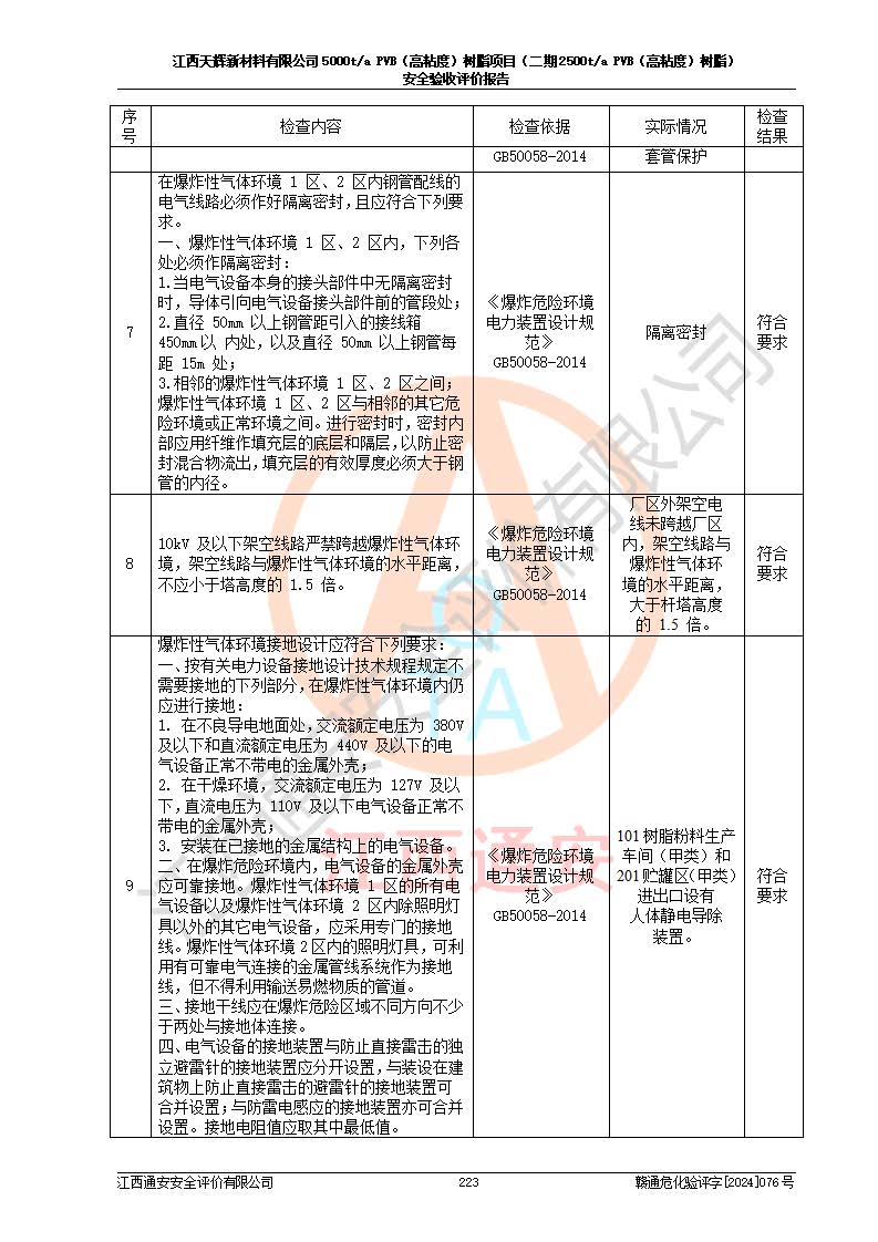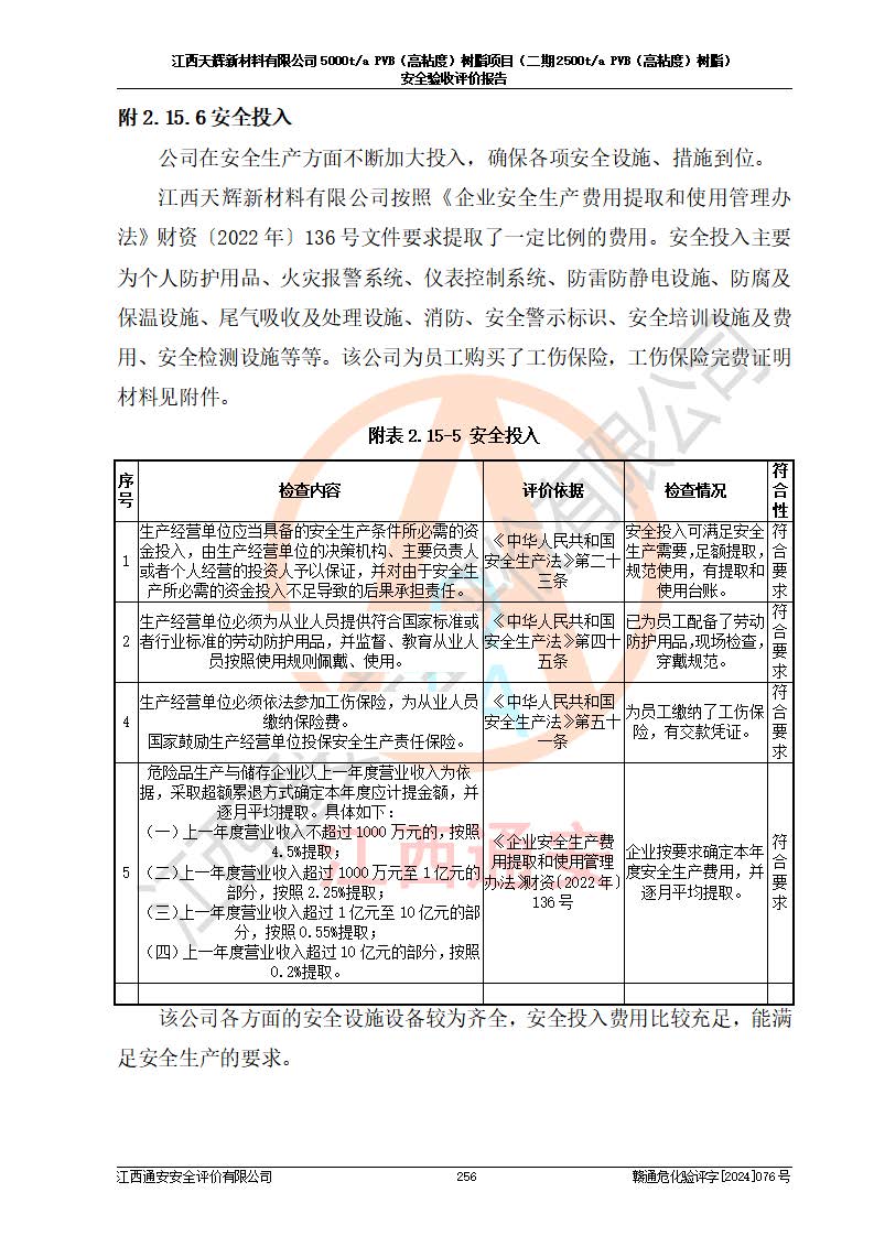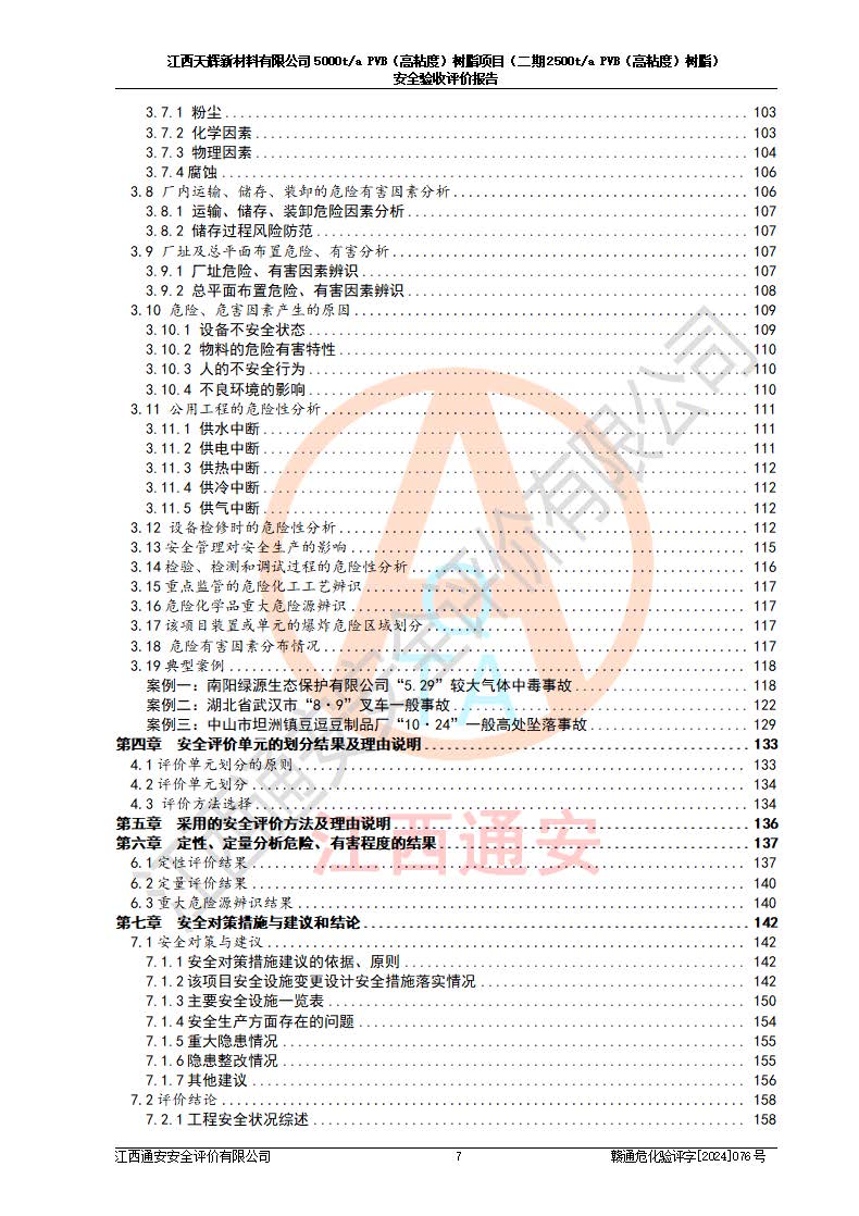 評價報告名稱 | 江西天輝新材料有限公司5000t/a PVB(高粘度)樹脂項目(二期2500t/a PVB(高粘度)樹脂)安全驗收評價報告 | |||