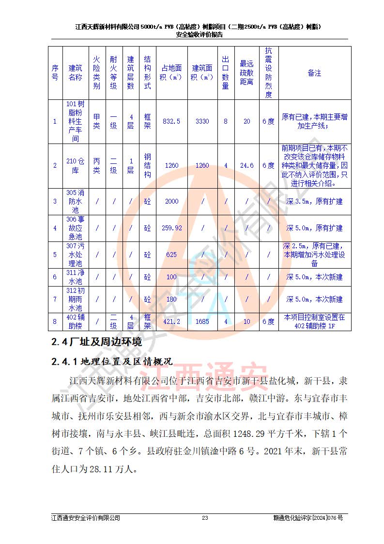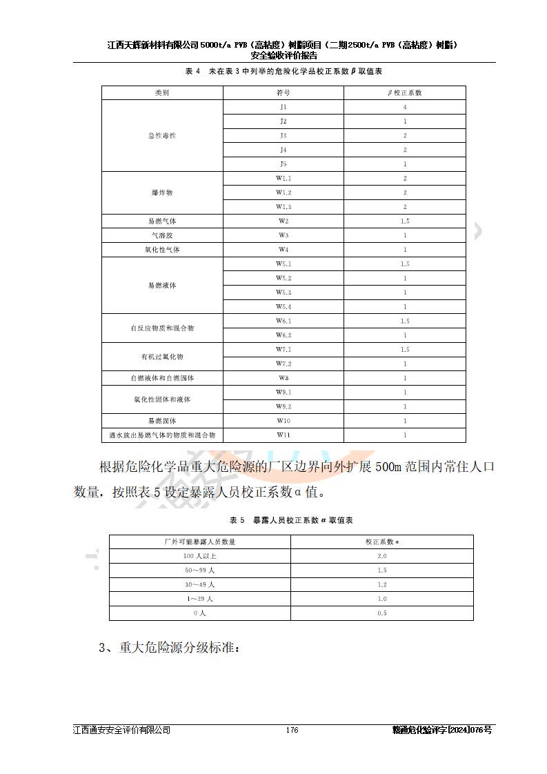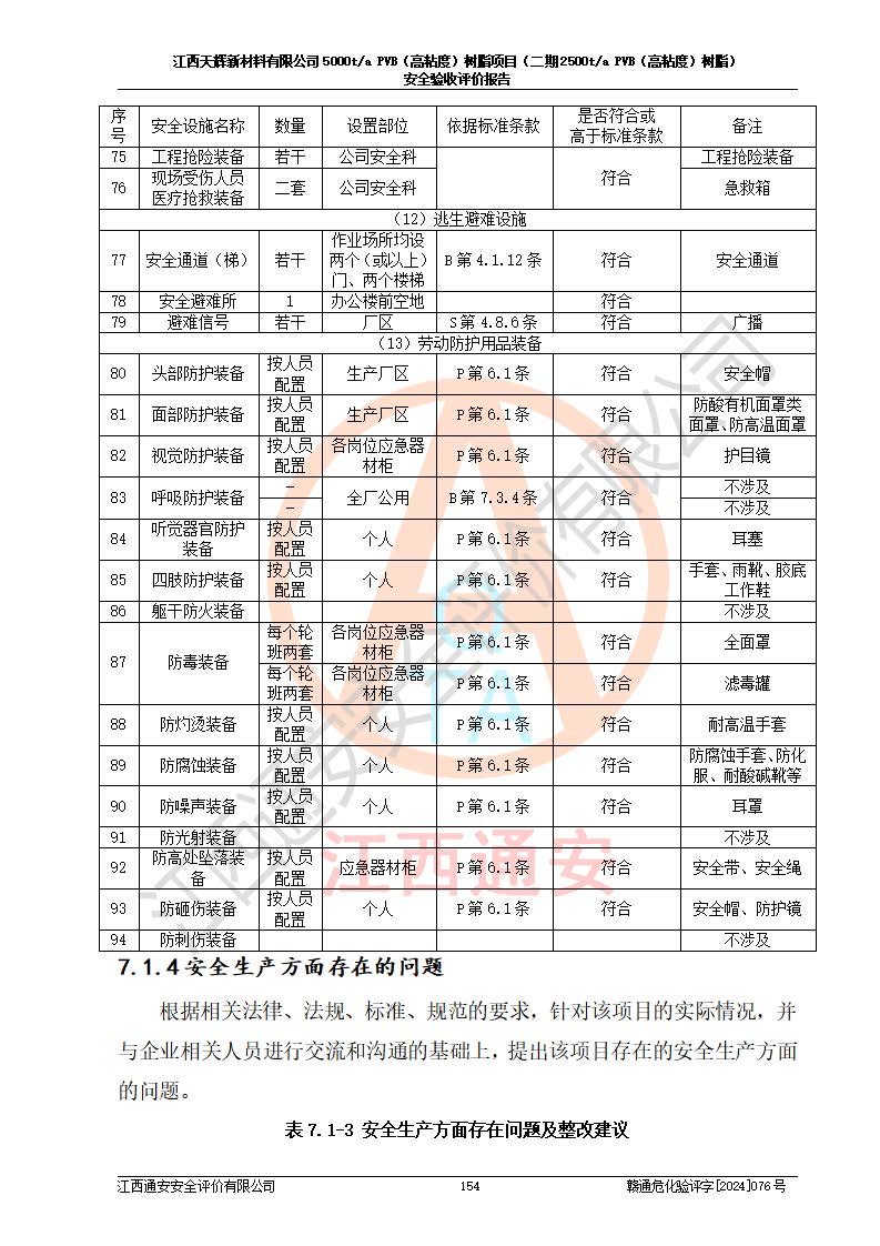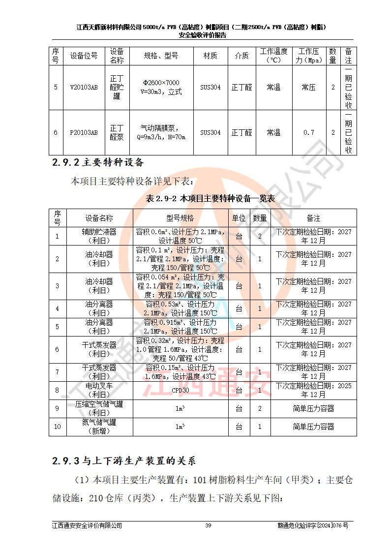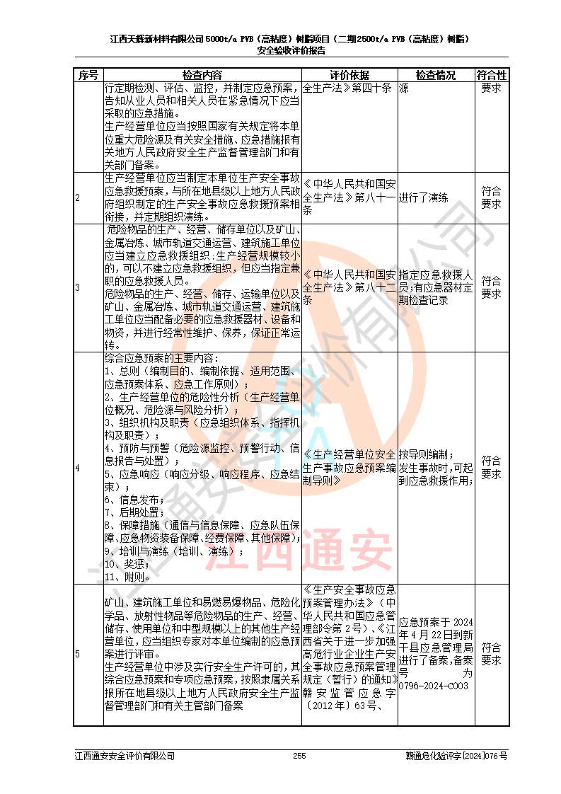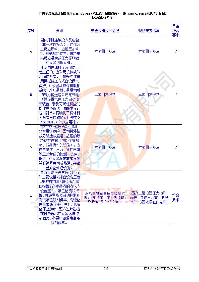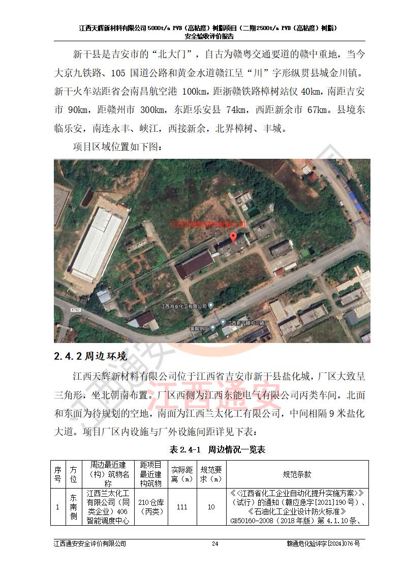 評價報告名稱 | 江西天輝新材料有限公司5000t/a PVB(高粘度)樹脂項目(二期2500t/a PVB(高粘度)樹脂)安全驗收評價報告 | |||