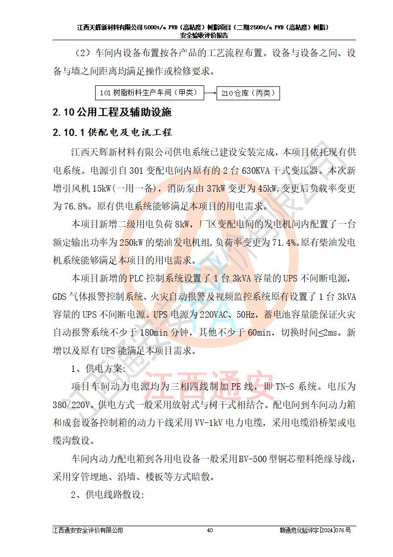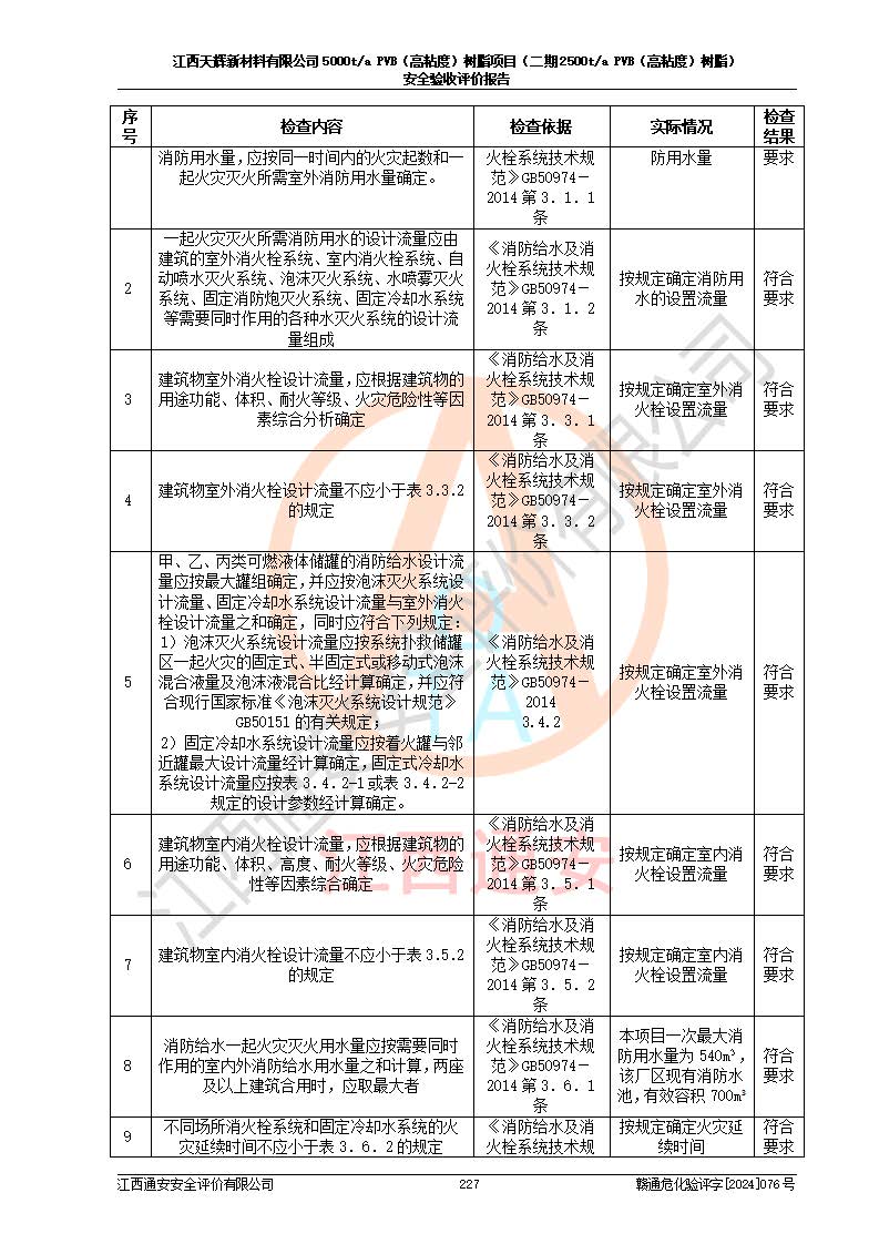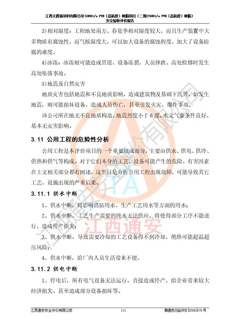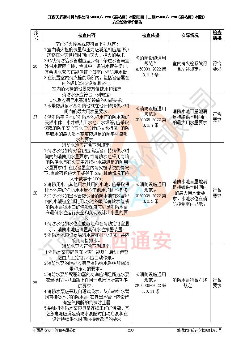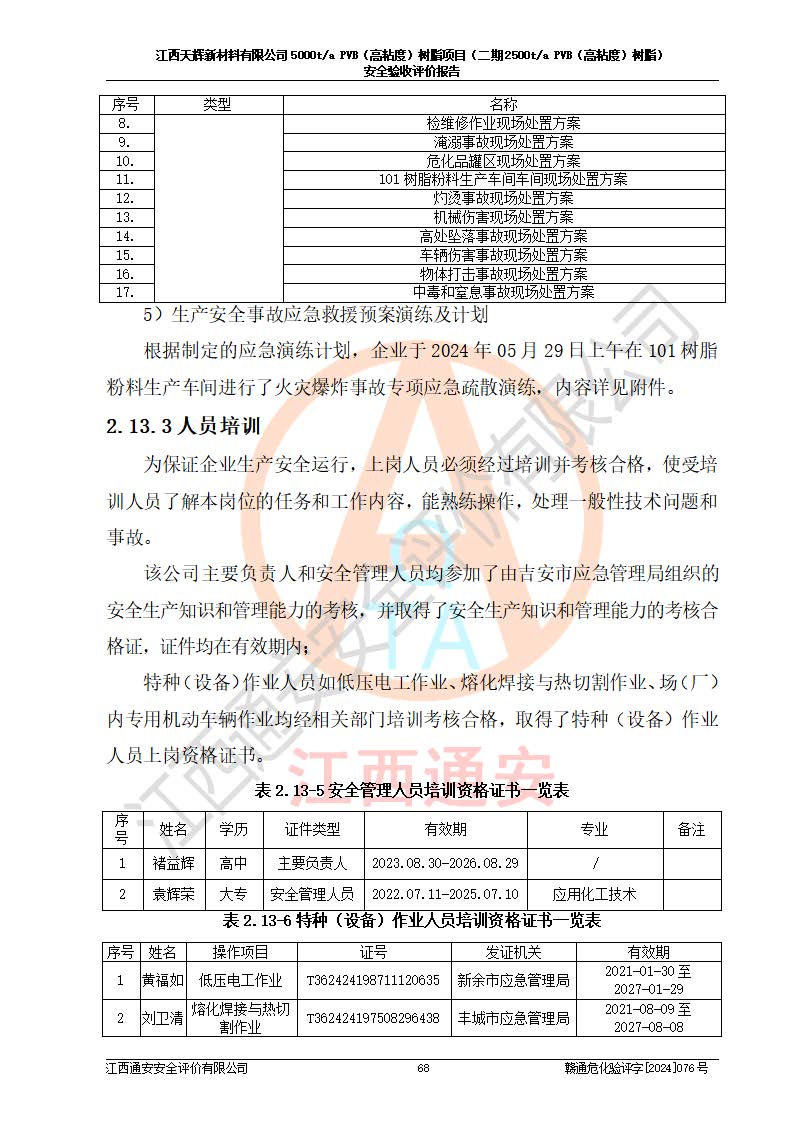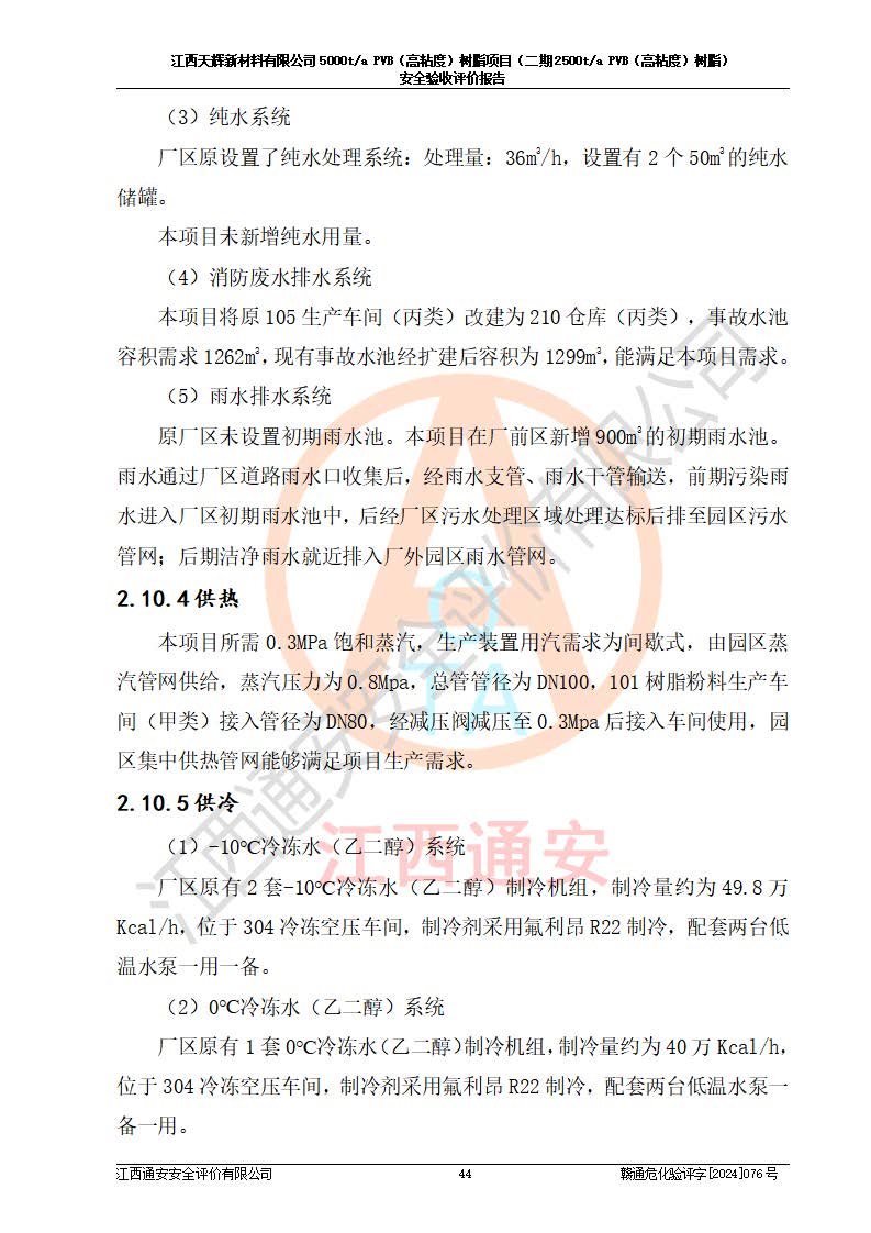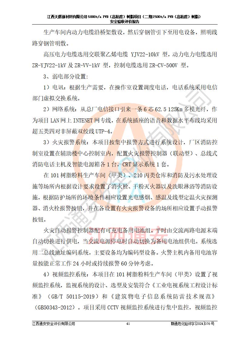 評價報告名稱 | 江西天輝新材料有限公司5000t/a PVB(高粘度)樹脂項目(二期2500t/a PVB(高粘度)樹脂)安全驗收評價報告 | |||