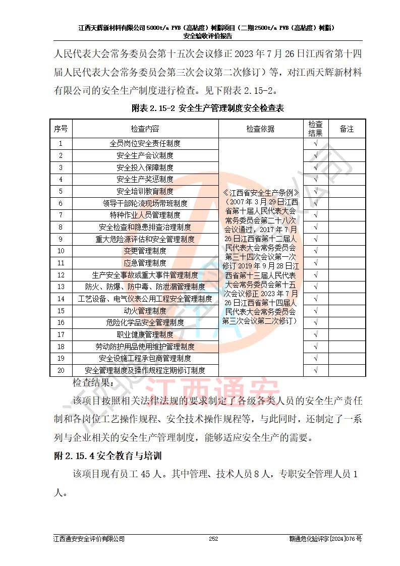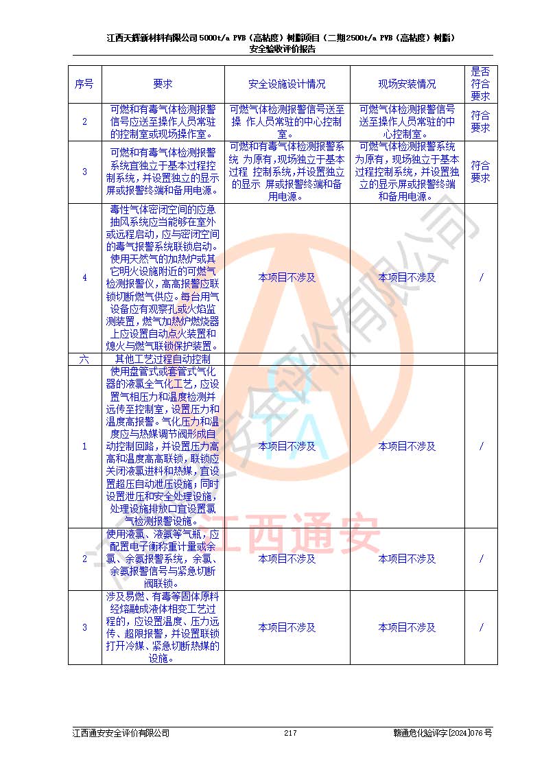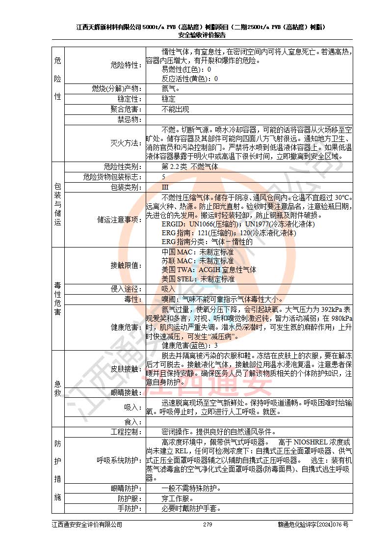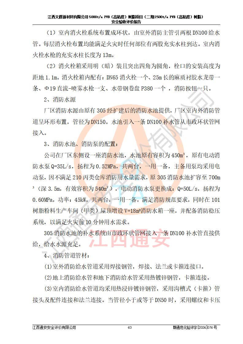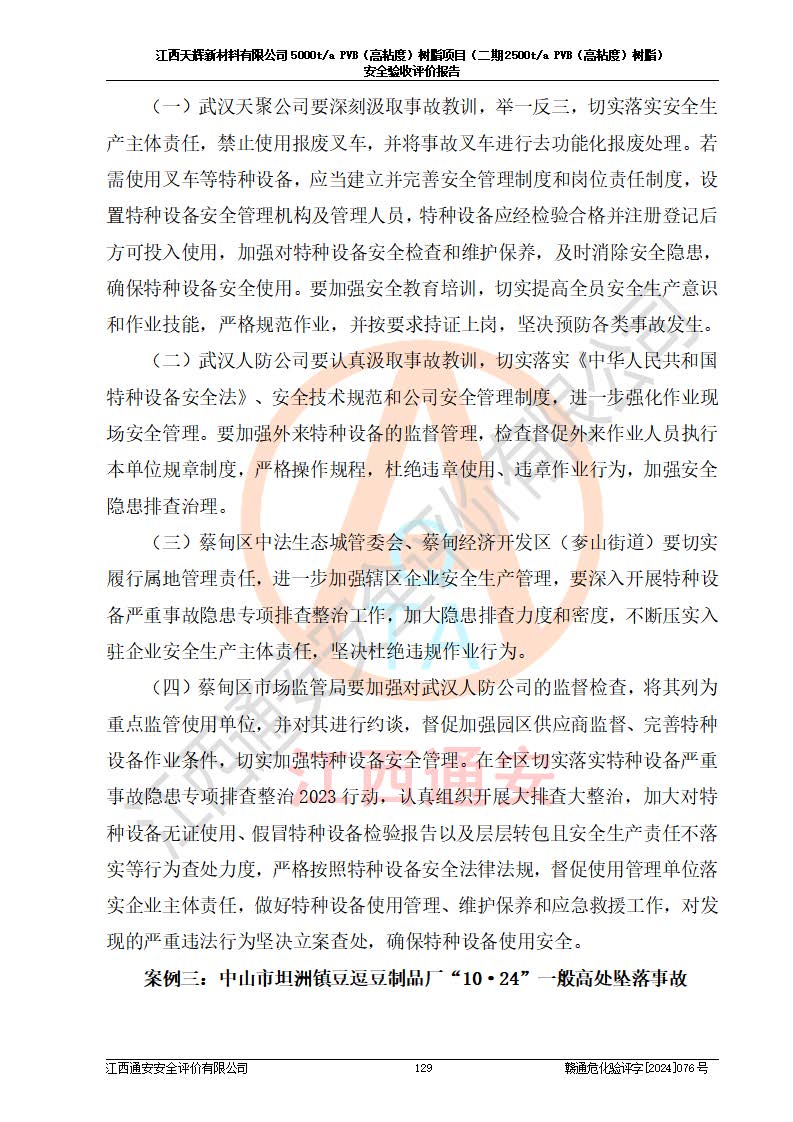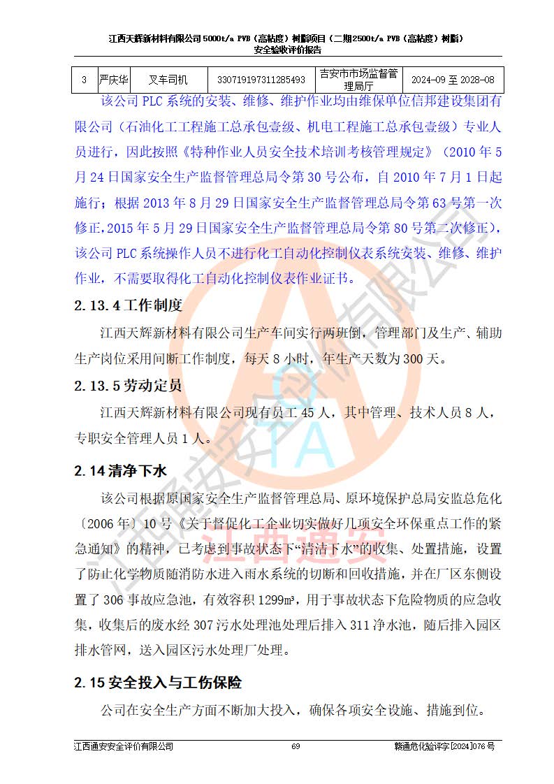 評價報告名稱 | 江西天輝新材料有限公司5000t/a PVB(高粘度)樹脂項目(二期2500t/a PVB(高粘度)樹脂)安全驗收評價報告 | |||